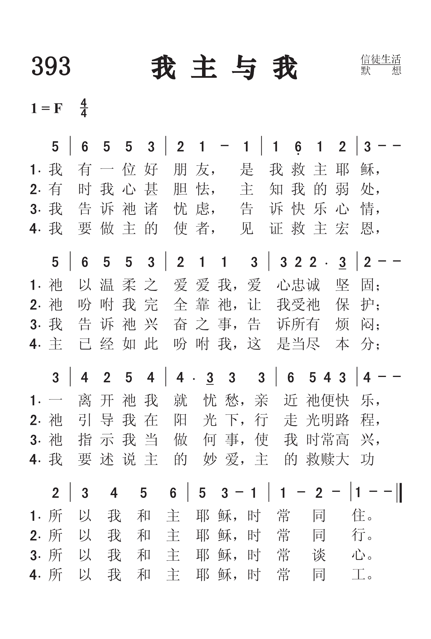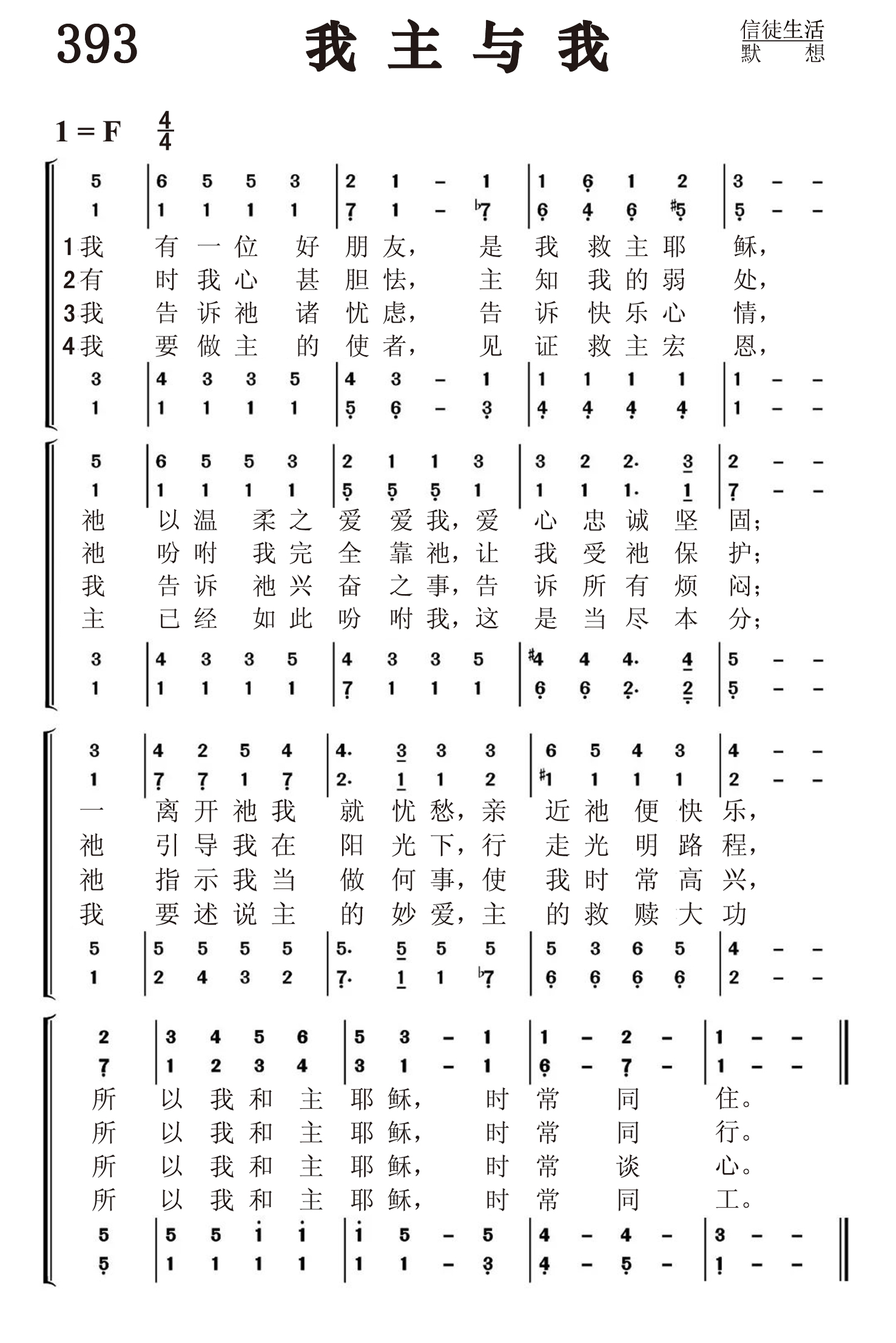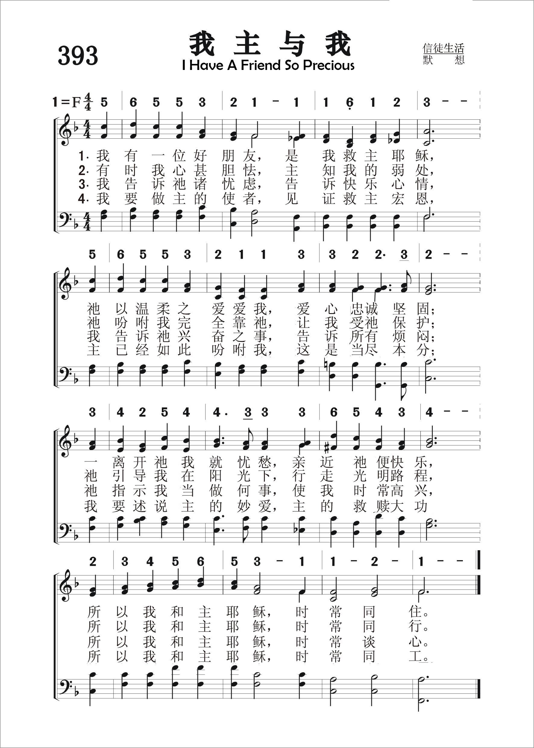 第393首 我主与我I Have a Friend So Precious 玛丽.肖里( Mary Shorey,1851,1,27-?)作词(1890年) 梅因(Hubert Platt Main, 1839,8,17-1925,10,9)作曲 我有一位好朋友,是我救主耶稣, 祂以温柔之爱爱我,爱心忠诚坚固; 一离开祂我就忧愁,亲近祂便快乐, 所以我和主耶稣,时常同住。 有时我心甚胆怯,主知我的弱处, 祂吩咐我全依靠祂,让我受祂保护, 祂引导我在阳光下,行走光明路程, 所以我和主耶稣,时常同走。 我告诉祂诸忧虑,告诉快乐心情, 我告诉祂兴奋之事,告诉所有烦恼, 祂指示我当做何事,使我时常高兴. 所以我和主耶稣.时常同行。 我要做主的使者,见证救主宏恩, 主已经如此吩咐我,这是当尽本分, 我要述说主的妙爱,主的救赎大功, 所以我和主耶稣.时常同工。 词作者玛丽.肖里出生于英国伦敦。作为一个国教的虔诚信徒,她曾以兰切斯特. 肖里的笔名发表了这首《我有一好友》,以及《清晨默想耶稣》和《天天与主同行》等诗作。 曲作者梅因出生于美国康涅狄格州。其父原为一音乐学校老师,音乐造诣甚高,声音洪亮。梅因11岁就开始在他父亲的学校读书,直到1854年前往纽约市工作,协助已成为乐谱出版商的父亲。他的好友中有当时著名的作曲家布里斯托。他喜爱音乐,16岁就开始作曲。他精通和声学,写过一千首以上的音乐作品,包括福音歌曲,圣歌和一般歌曲,编辑过赞美诗。他是纽约几个重要音乐团体的会员,多年担任圣诗班指挥和司琴。 他收藏甚广,强记博闻。无数的调名,作者姓名,生卒年月,版权期限他都记得一清二楚。在美国,几乎没有一个人像他那样对教会音乐如此熟悉,尤其是美国出版的教会音乐。这对出版界是个极大的帮助。 梅因作曲或改编的还有441首《背十字架》(1873年)和575首《在恩主的面前》等。