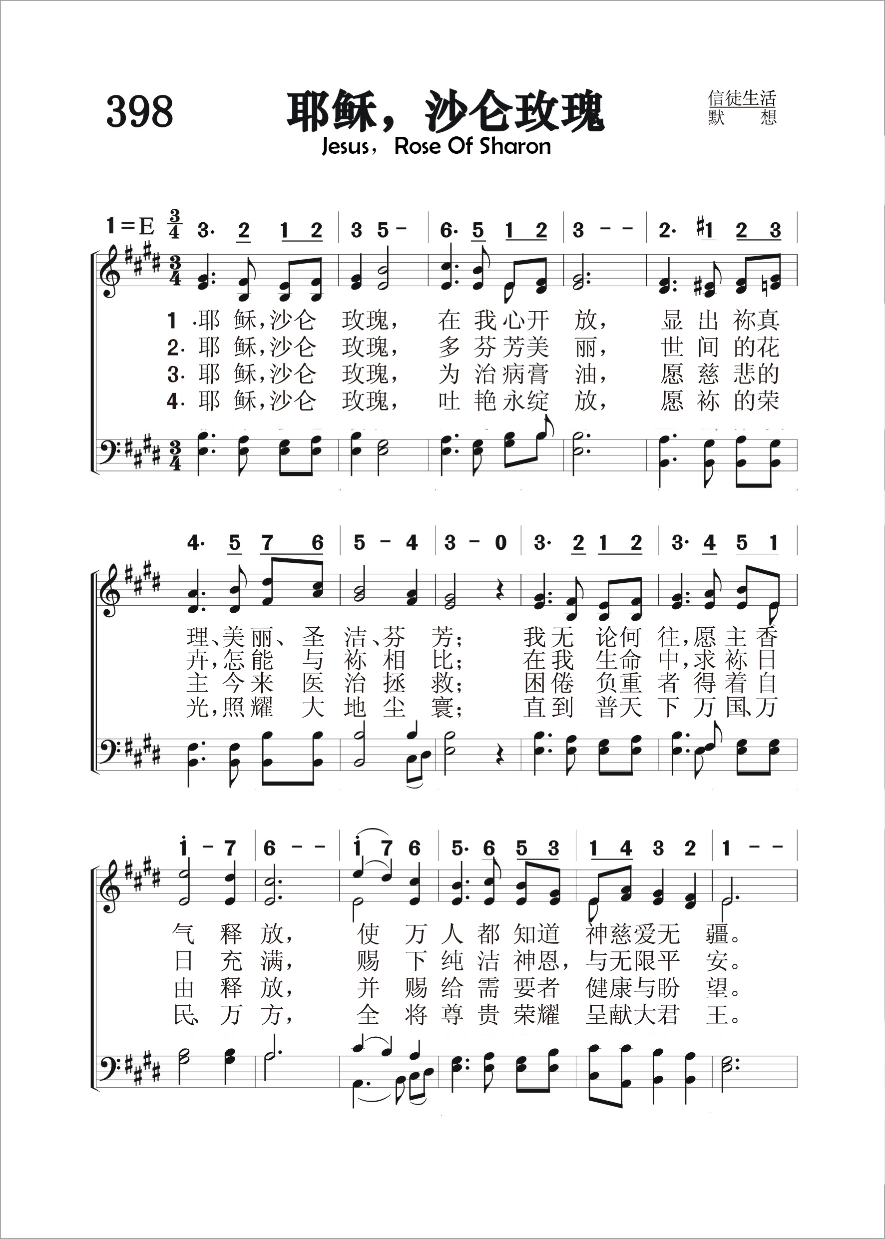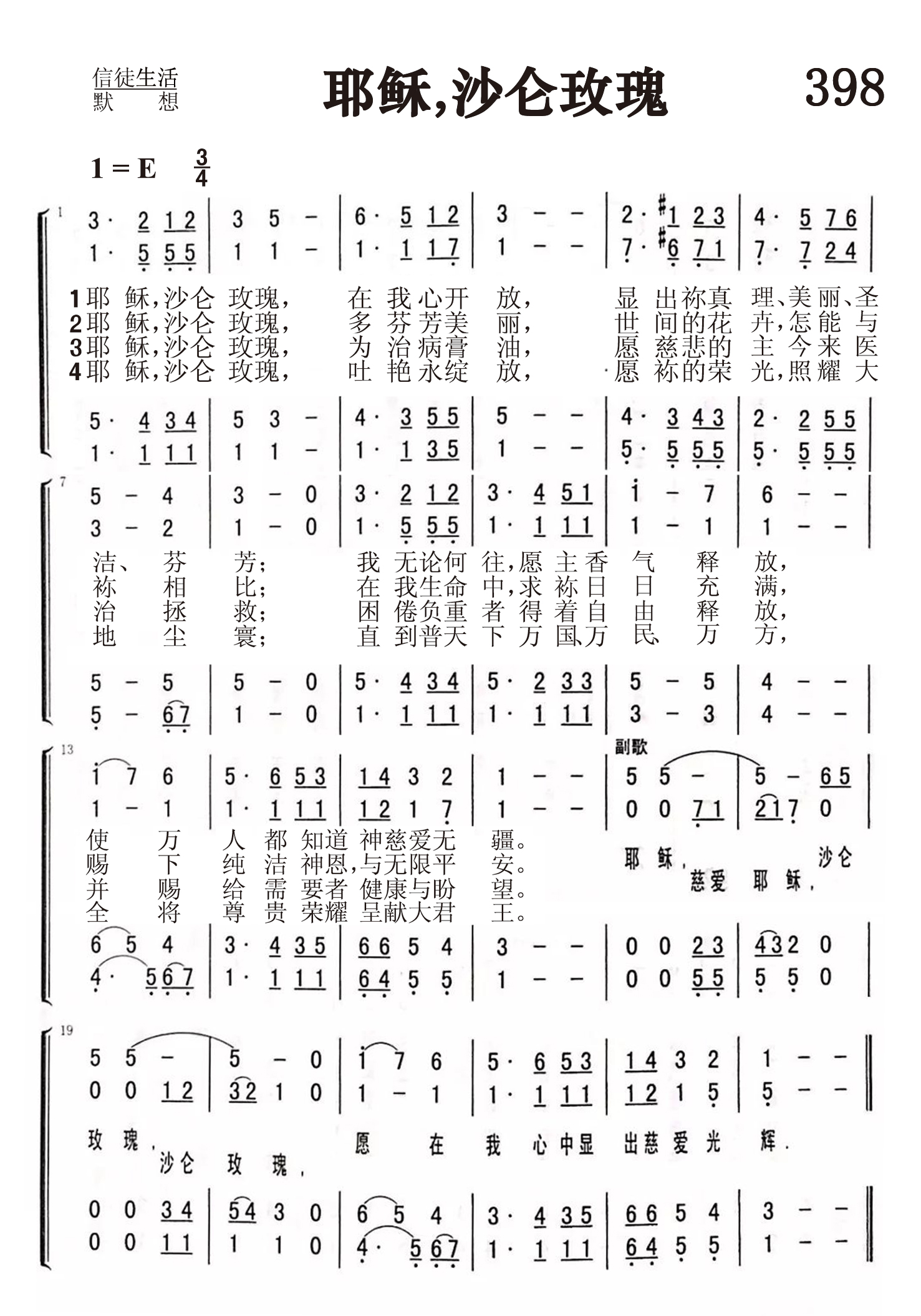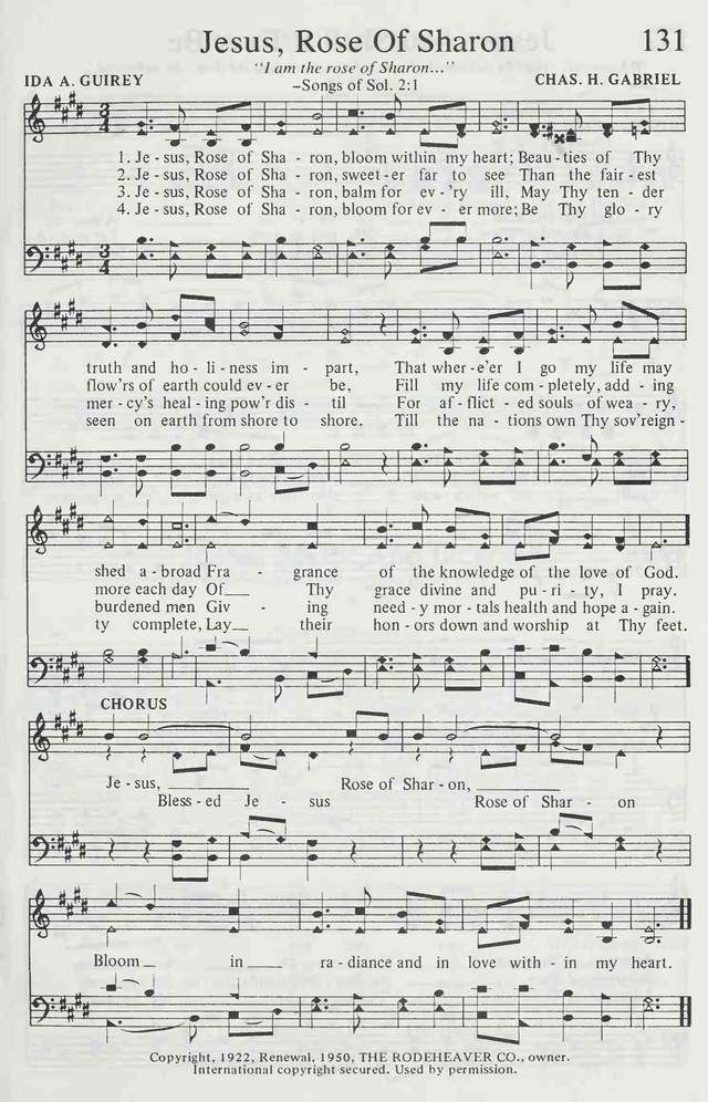 第398首 耶稣,沙仑玫瑰Jesus,Rose of Sharon 二十世纪初的诗人艾达.吉利(IDA A. GUIREY)作词,加布里埃尔(C.H.GABRIEL,1856,8,18-1932,9,15)作曲 耶稣,沙仑玫瑰,在我心开放,显出祢真理、美丽、圣洁、芬芳; 我无论何往愿主香气释放,使万人都知道祢慈爱无疆。 耶 稣,沙仑玫瑰, 多芬芳美丽, 世间的花卉,怎能与袮相比; 在我生命中,求袮日日充满, 赐下纯洁神恩,与无限平安。 耶稣,沙仑玫瑰,为治病膏油.愿慈悲的主今来医治拯救; 困倦负重者得着自由释放,并赐给需要者喜乐与盼望。 耶 稣,沙仑玫瑰, 吐艳永绽放, 愿袮的荣光,照耀大地尘寰; 直到普天下万国 万民、万方,全将尊贵荣耀呈献大君王。 耶稣,沙仑玫瑰,愿在我心中显出慈爱光辉。 加布里埃尔是20世纪20年代美国布道团中最受欢迎的歌唱家和作曲家。这首诗和曲都是他的得意之作。 1900年有一天,加布里埃尔在密苏里州圣路易市遇见一位信徒,名叫卡德。这个人有个特点,就是从不发愁,他见人总是满脸笑容,听道时常喊着“荣耀”,祷告结束时总是说:“这是我的荣耀。”人们喊他“老荣耀”。加布里埃尔看到他后,很受感动和启发,就谱写出这首诗和曲,以后编入他自己出版的小集子中,起名为“赞美主的荣耀”。上世纪20年代初,在奋兴布道会上,人们总是称这首诗为“荣耀之歌”,流传至今。 加布里埃尔是自学成才的宗教音乐家。他在美国南方衣阿华州农场中长大,平生爱音乐,好唱歌,自己在家里学习,在一架破旧的小风琴上弹奏。16岁时就自告奋勇到附近音乐学校教唱,成绩显著,不久被正式聘为教员。从此,他更努力学习,精益求精,终于成为一个有名的作曲家,业余时间还兼任旧金山一个卫理公会礼拜堂的音乐指导。1895年迁居芝加哥,继续写作、编曲,曾编印出版过好几本乐谱。