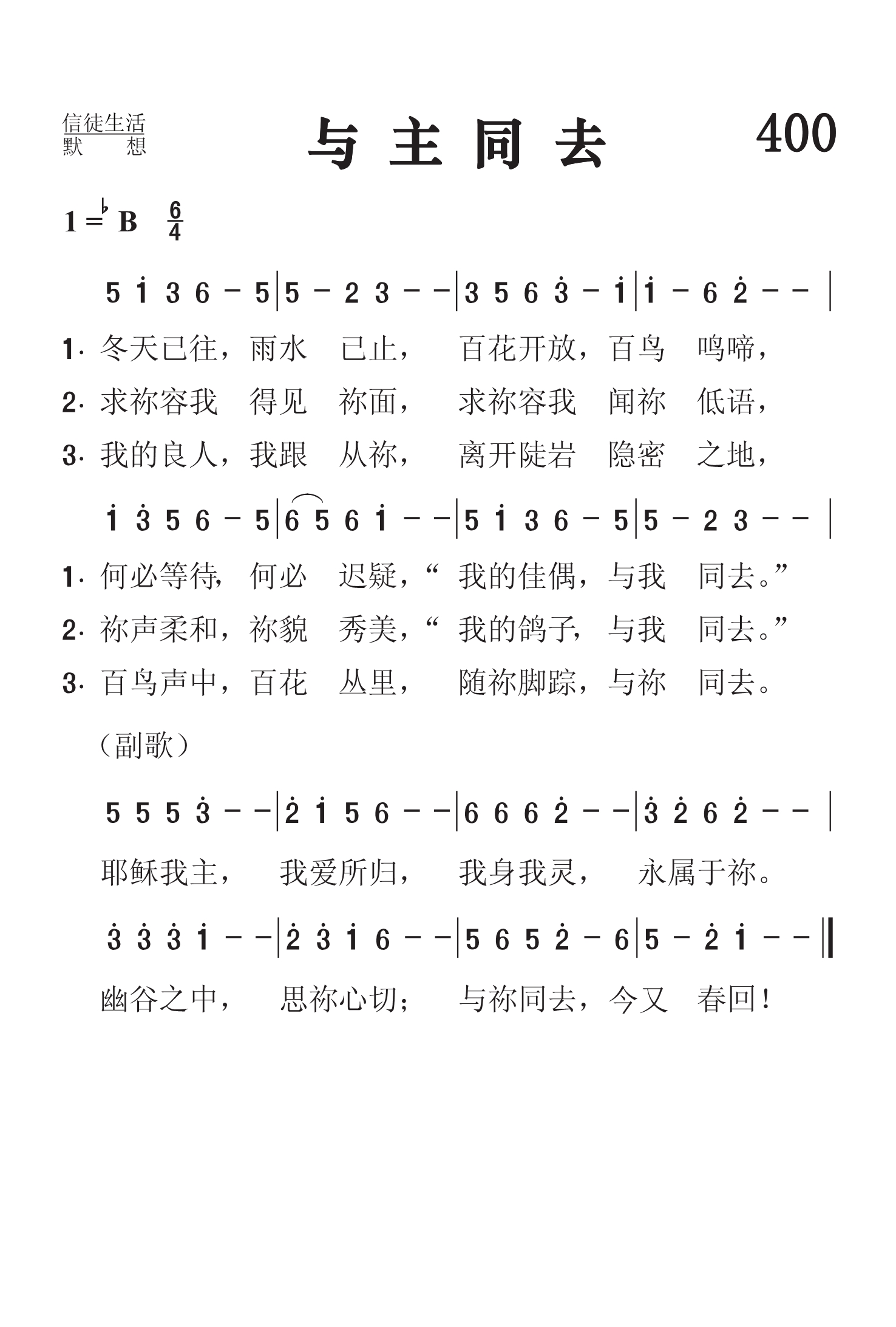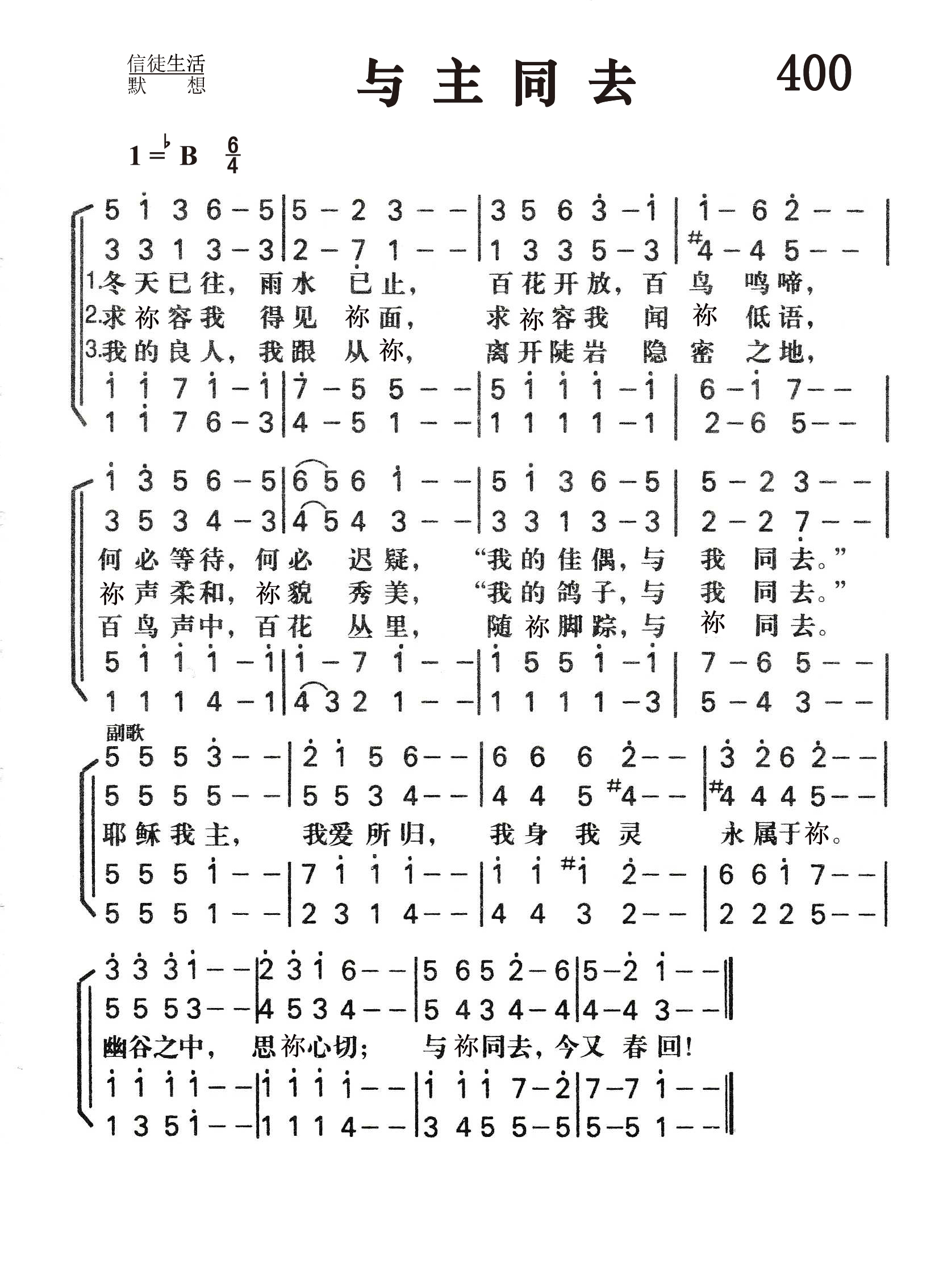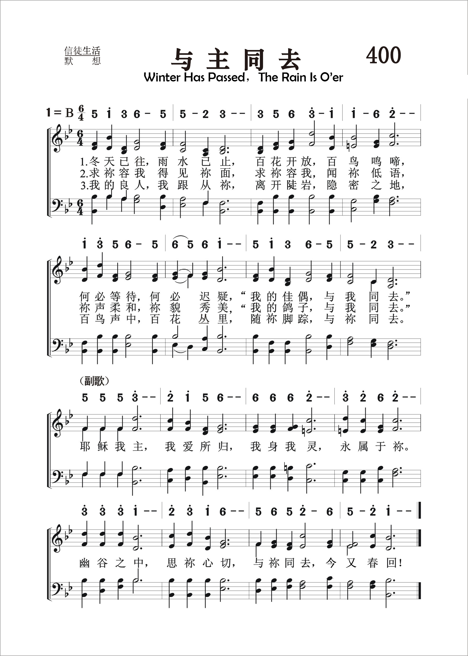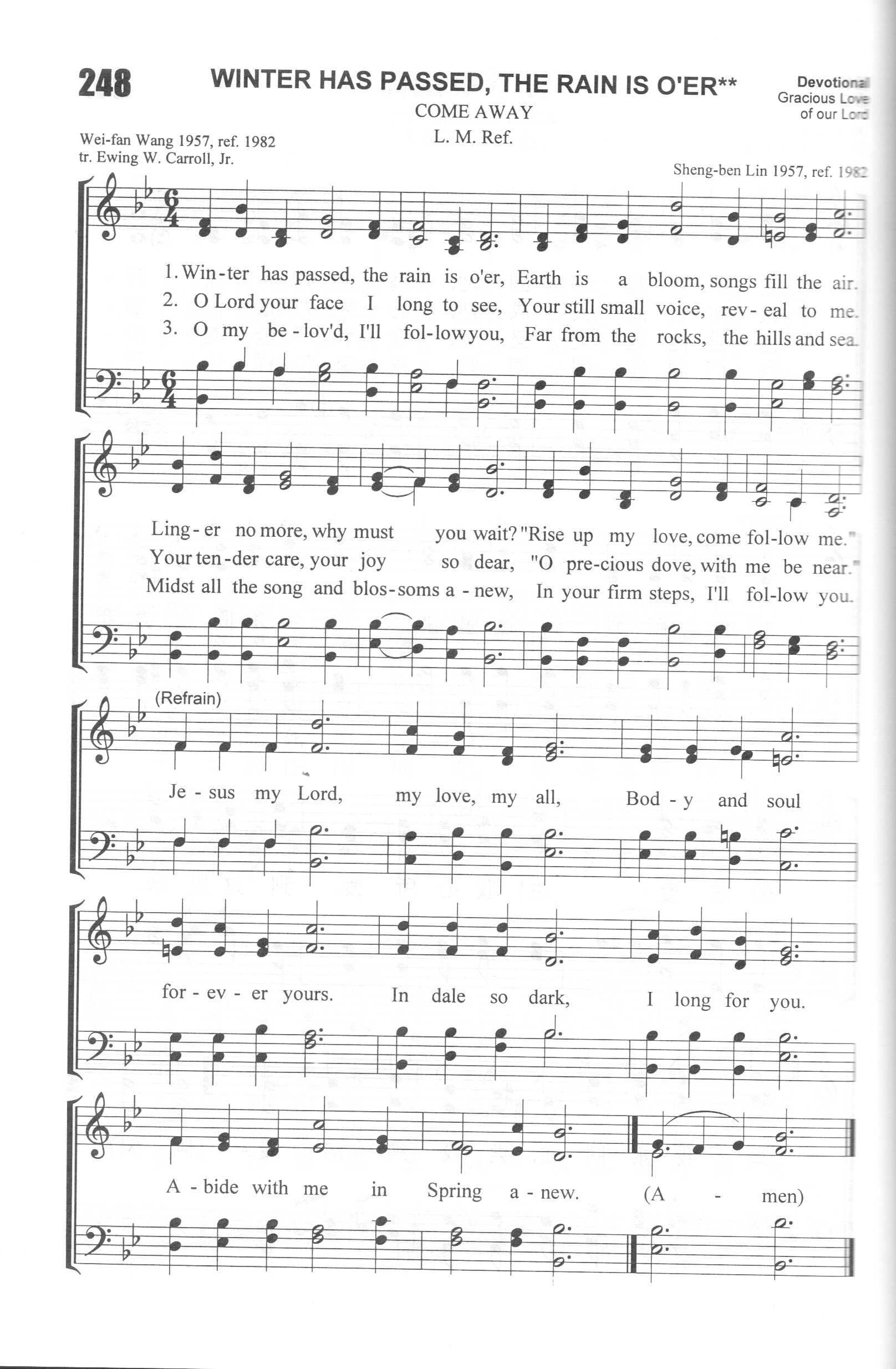 第400首与主同去Winter Has Passed,the Rain Is O’er 汪维藩(1927-2015.9.15)作词(1957年),林声本作曲(1957年),配和声(1982年) “冬天已往,雨水止住过去了”(歌2:11)。 冬天已往,雨水已止,百花开放,百鸟鸣啼, 何必等待,何必迟疑,“我的佳偶,与我同去”。 求祢容我得见祢面。求祢窖我闻祢低语, 祢声柔和,祢貌秀美:“ 我的鸽子与我同去。” 我的良人,我跟从祢,离开悬岩,隐密之地, 百鸟声中,百花丛里,随祢脚踪,与祢同去。 耶稣我主,我爱所归,我身我灵.永属于祢。 幽谷之中,思祢心切,与祢同去,今又春回! 词作者汪维藩,江苏省泰州市人。1947年信主。先后就读于南京中央大学、南京大学(1948-1951,肄业),杭州中国神学院、金陵协和神学院(1951-1955,毕业)。一九五五至一九五六年镇江浸会传道,一九五七至五八年南京《圣光》编辑。一九五八至七九年,于“反右”、“文革”运动中受冲击,后期在工厂中劳动八年。一九七九年,调至南京大学宗教研究所。一九八一年南京金陵协和神学院复校后,任教学、文字出版等工作。一九八八年被按立为牧师,长期从事神学教育工作,任金陵协和神学院教务长、中国基督教两会常委会等丰职。一九九九年退休。 汪维藩牧师是中国基督教“生生神学”理论的发明者、倡导者(参:《生生神学:汪维藩神学思想研究(民族宗教学研究博士文库)》,袁益娟,金城出版社,2010年04月。)。他著有《中国大百科全书宗教卷》基督教部分若干词条。《圣书简释本》之以赛亚书、哥林多前、后书简注。以及新近在香港“基督教中国宗教文化研究社”刚刚出版的《十年踽踽——汪维藩文集(一九九七至二零零七)》。有关中国神学探索、当代中国宗教研究、圣书诠释的散文及讲章等文章二百余篇。诗歌二十余首,其中《与主同去歌》被翻译为英、德、日、丹麦、挪威等国文字,《圣灵运行歌》被翻译为英文、德文,并收进《普天颂赞(新修订版)》。 汪维藩牧师的专著多达二十余种,特列如下: 教义类,《基本要道》(上海:中国基督教协会,1983;至今已发行五百万册);圣书诠释类,《圣言的诠释》(同上)、《普通书信释义》(南京:江苏省基督教两会)、《利未记注释》(香港:基督教文艺)等; 灵修默想类,《野地里的百合花》(上海:中国基督教协会;已被翻译为英文,由美国Upper Room 出版)、《十架路旁的溪水》(香港:国际福音证主协会)、《默想集》(南京:金陵协和神学院;其中若干篇已被翻译为德文,即将出版)等; 讲章类,《归途集》(福州:福建省基督教两会)、《我们有一祭坛》(浙江省基督教协会)、《保罗的异象人生》(广西省基督教协会、国际福音证主协会)、《人啊,你算什么》(国际证主协会); 神学类,《中国神学及其文化渊源》(南京:金陵协和神学院); 译作,《非洲祷文集》(与杨佳智合作,上海:中国基督教协会)。 这首诗歌以《雅歌》2:10-14为主题,把良人比作基督,把“佳偶”,“美人”,“鸽子”比做寻求主的人,表达了信徒对主基督的思念,归依之情。诗歌原名《雅歌》,作于1957年,共三节,没有副歌,由同学好友林声本配上曲调,发表在《灵光》1957年第3期上。副歌是他们在1982年补写的,把全诗推向高潮,使之更加委婉动人。 《颂赞诗歌》405首《主爱深沉》是汪维藩作词,史奇圭作曲的。《赞美诗》新编62首《圣灵运行》是汪维藩作词作曲的。 曲作者林声本1947年进广州浸信会神学院学习。毕业后进上海中华浸信会神学院教会音乐系深造,从师马革顺教授专攻音乐。1954年从南京金陵神学院毕业以后,在上海旅沪广东浸信会传道。1980年被按立为牧师,后在上海景灵堂工作。林声本擅长钢琴,年轻时就担任唱诗班指挥,为赞美诗谱曲。他是中国基督教圣诗委员会委员,《圣歌选集》的责任编辑。