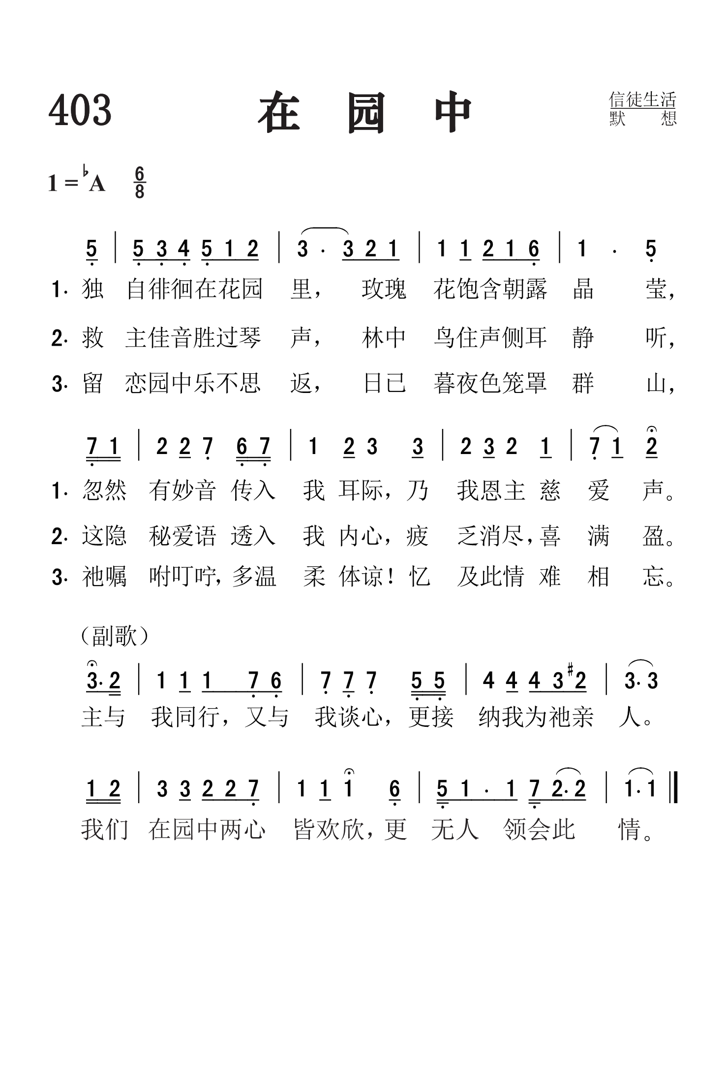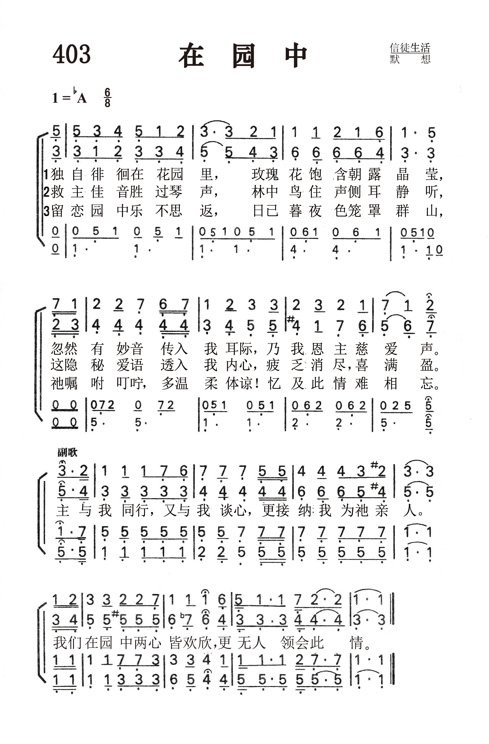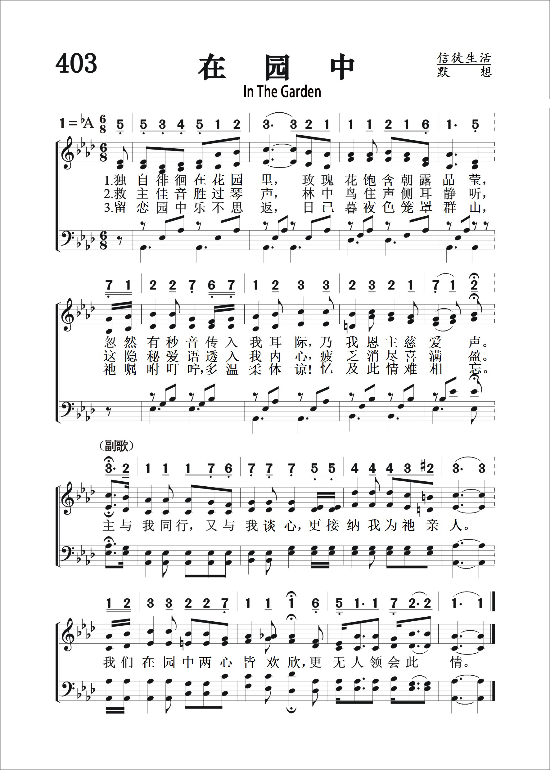 第403首 在园中In the Garden 迈尔斯(C.A.Miles,1868,1,7-1946)作词作曲(1912年) 独自徘徊在花园里,玫瑰花饱含朝露晶莹, 忽然有妙音传入我耳际,乃我恩主慈爱声。 救主佳音胜过琴声,林中鸟住声侧耳静听, 这隐秘爱语透入我内心,疲乏消尽, 喜满盈。 留恋园中乐不思返,日已暮夜色笼罩群山, 祂嘱咐叮咛\\, 多温柔体谅!忆及此情难相忘。 主与我同行,又与我谈心,更接纳我为祂亲人。 我们在园中两心皆欢欣,更无人领会此情。 迈尔斯出生于美国新泽西州,毕业于宾夕法尼亚州大学制药专业,曾任药剂师多年。1898年他弃医从文,在一家出版公司任编辑和经理。 1912年3月的一天,他坐在安放摄影设备和风琴的暗室里,顺手拿起圣书,翻开他素来爱读的《约翰福音》第二十章,阅读耶稣和抹大拉的马利亚那段令人心驰神往的交谈。他觉得自己仿佛身临其境,说:“马利亚跪在主面前喊着‘拉波尼’时,乃是她一生发生重大变化的时刻。我成了这件事默默无声的见证人。在这个异象的感动之下,我挥笔疾书,写下了《在园中》一诗,并于当晚配上曲调。一经发表,从未改动。” 诗中写的是“七日的第一日清早,”马利亚前往那个花园,探望埋着耶稣的坟墓,那知坟墓是空的,耶稣已经复活了。耶稣向她显现,她却误把祂当成看墓人。主叫唤她的名字,嘱咐她去传播那美好的佳音:“你往我弟兄那里去,告诉他们说,我要升上去见我的父,也是你们的父;见我的上帝,也是你们的上帝”(约20:17)。这首诗歌更表达了信徒与主之间那种亲密无间的情感与交流。 迈尔斯以每一节及副歌各一美元,共四美元的价格,把《在园中》的版权卖给了他所服务的公司。他写这首诗时44岁,到他78岁去世时的三十多年时间里,这首诗的印行在三百万次以上,录音达一百万次,使公司赢利累累。 这次意外的成功,使他认识到上帝要他发挥这方面的才能,以诗歌来为主做见证。于是他把圣诗创作和编辑作为自己毕生的事业。他还是著名的布道会圣乐指挥。 人们所熟悉的《荣美福地》(《颂赞圣诗》231首、《赞美诗》新编319首)也是迈尔斯作词作曲的。