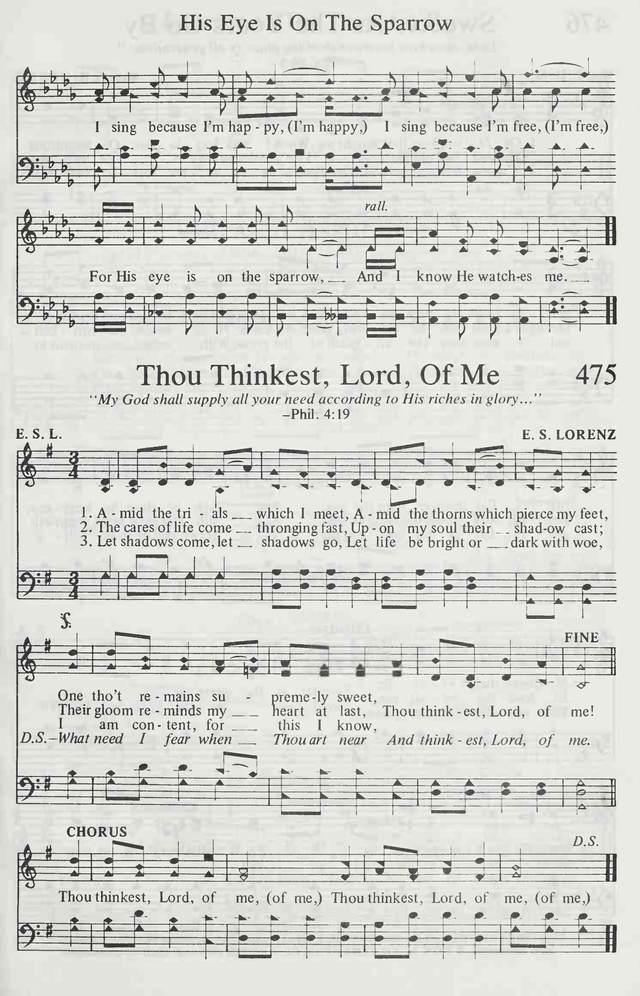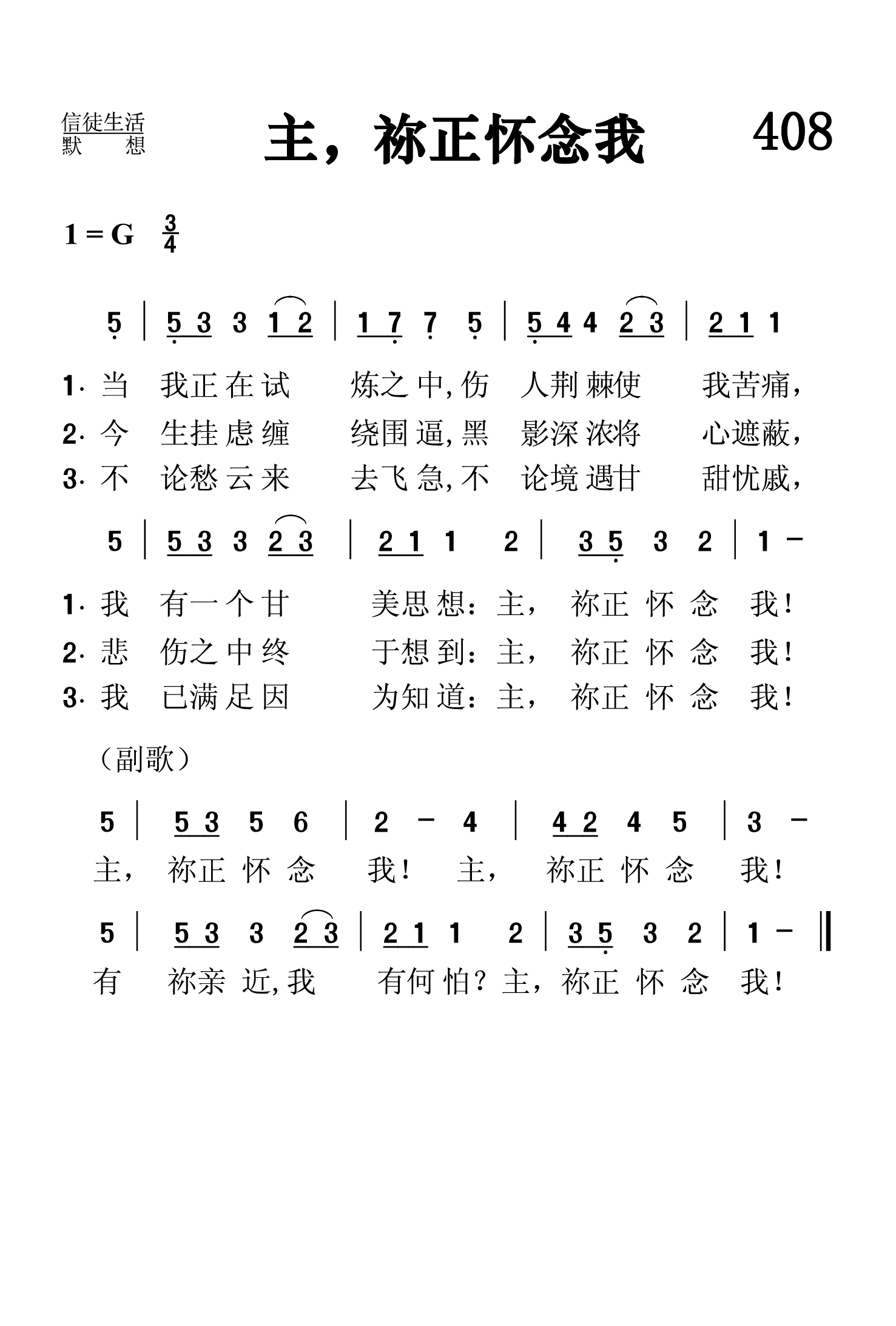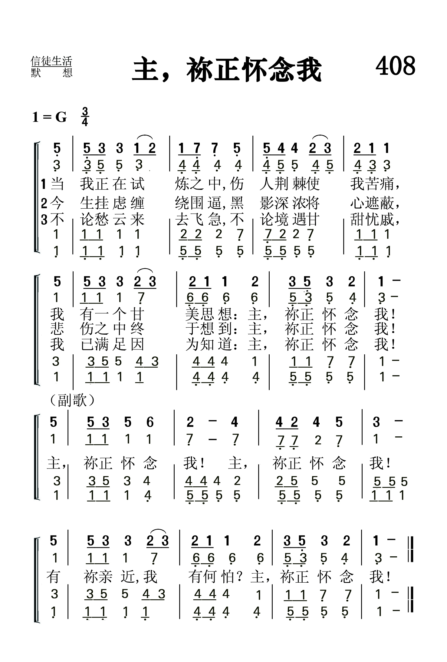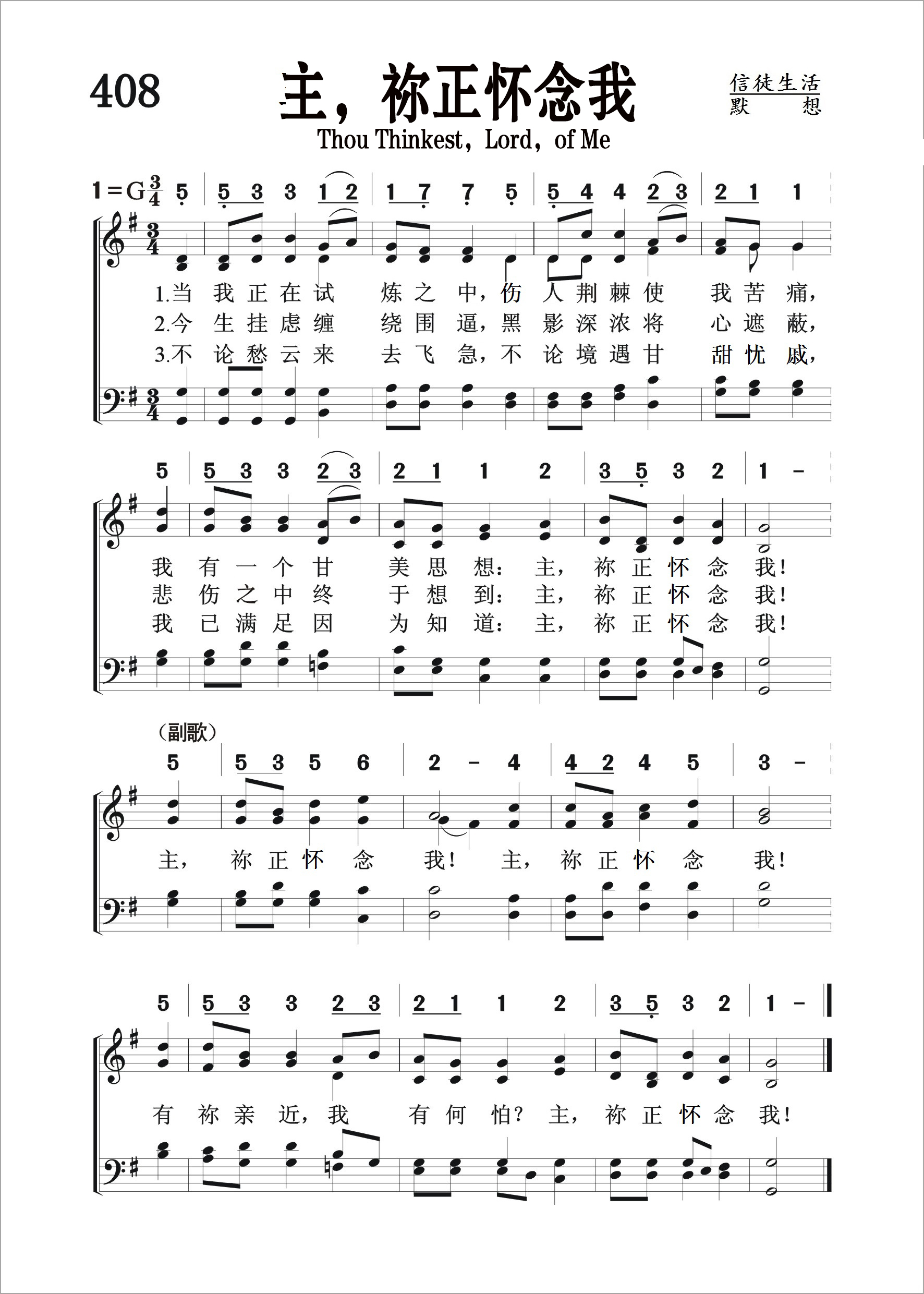 第408首 主,祢正怀念我Thou Thinkest,Lord,of Me 芒特(E.D.MUND)作词,洛伦茨(EDMUND SIMON LORENZ,1854,7,13-1942,7,10)作曲 当我正在试炼之中,扎人荆棘使我苦痛, 我有一个甘美思想;主,祢正怀念我! 今生挂虑缠绕围逼,黑影深浓将心遮蔽, 悲伤之中终于想到;主,祢正怀念我! 不论愁云来去飞急,不论境遇甘甜忧戚, 我已满足因为知道;主,祢正怀念我! 主,祢正怀念我! 主,祢正怀念我! 有祢亲近,我怕什么主,祢正顾念我! 词作者芒特其实就是曲作者洛伦茨的笔名。他出生于从俄罗斯移民美国的复临信徒的家庭,居住在俄亥俄州的代顿市,先后就读于奥特本大学,联合圣书神学院,耶鲁神学院和莱比锡大学,曾担任过代顿市高街联合兄弟会牧师(1884-1886年),宾夕法尼亚州黎巴嫩谷学院院长(1886-1888年)。后创建洛伦茨音乐出版公司,创作和出版了大量的赞美诗歌。 第73首《主名流芳》,347首《赐我圣书》,《赞美诗》 506版第450首《圣洁喜乐》也是洛伦茨作曲的。