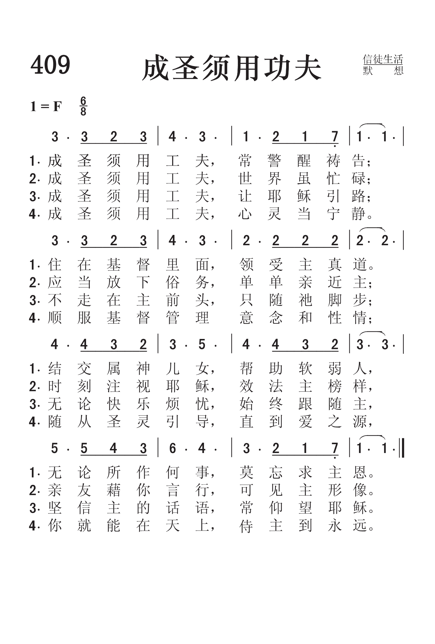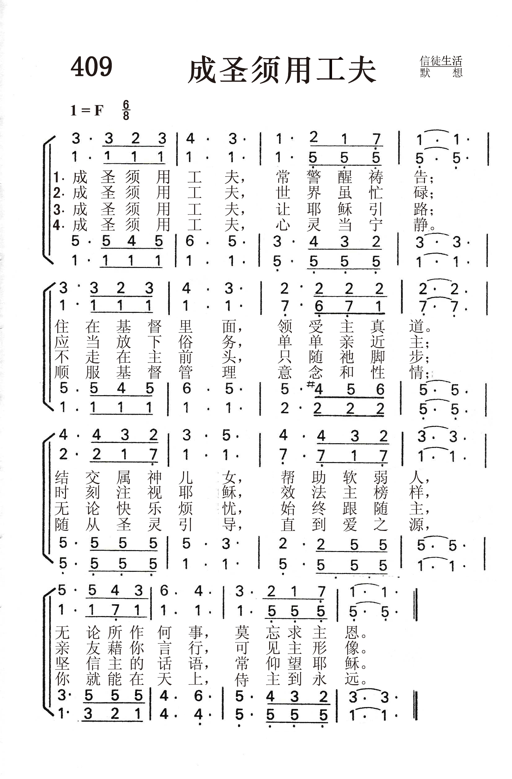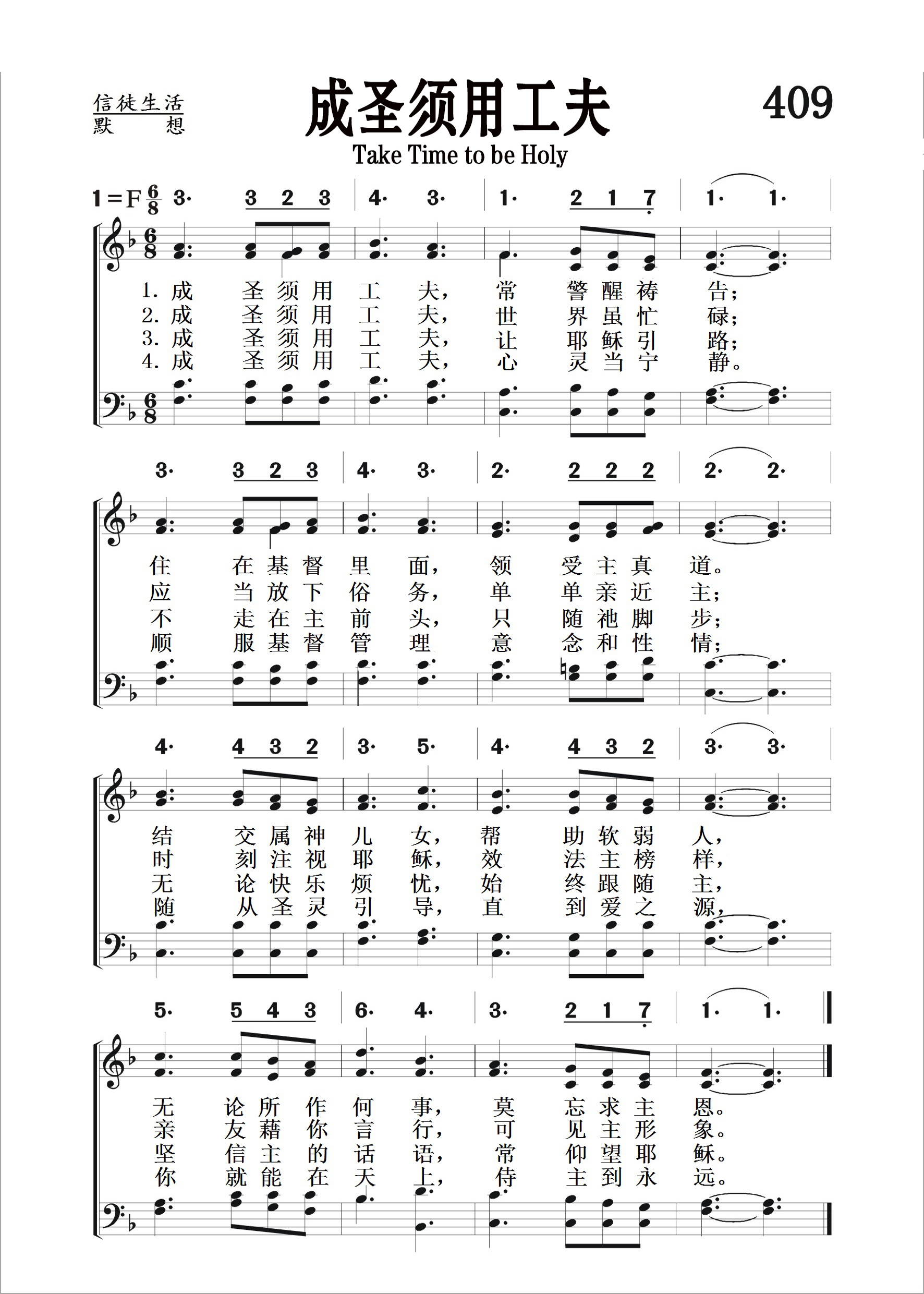 第409首 成圣须用工夫Take Time to be Holy 朗斯塔夫(W.D.Longstaff,1822-1894)作词;斯特斯宾(George C.Stebbins,1846,2,26-1945,10,6)作曲 成圣须用工夫,常警醒祷告; 住在基督里面,领受主真道。 结交属神儿女,帮助软弱人, 无论所作何事,莫忘求主恩。 成圣须用工夫,世界虽忙碌; 应当放下俗务,单单亲近主; 时刻注视耶稣,效法主榜样, 亲友藉你言行,可见主形像。 成圣须用工夫,让耶稣引路; 不走在主前头,只随祂脚步; 无论快乐烦忧,始终跟随主, 坚信主的话语,常仰望耶稣。 成圣须用工夫,心灵当宁静。 顺服基督管理意念和性情; 随从圣灵引导,直到爱之源, 你就能在天上,侍主到永远。 “所以你们要自洁成圣,因为我是耶和华你们的上帝”(利20:7)。 《成圣须用工夫》是一首以基督徒追求圣洁为主题的著名诗歌。一个人被主选召,蒙恩重生,只是他基督徒生命的开端。他有一个终身的目标,就是以基督的完美品德为楷模,追求成圣。他必须通过读经,祷告,为主作见证,与生命的源头保持活泼的联络,从中不断吸取养分,使自己的属灵生命日益成长。他要时刻注视为他的信心创始成终的耶稣,直到变成主的形象,结出成圣的丰硕果实,归入天仓。这首诗所表达的思想,乃是基督徒的生命实际和他们的心声。 据桑基介绍,《成圣须用工夫》出自朗斯塔夫的手笔,是他在英国纽布莱顿听了一次以《彼得前书》1:16“你们要圣洁,因为我是圣洁的”为主题的讲道以后,深受感动而写的。1891年,这首诗被收入桑基所编的《圣诗与独唱》中。 朗斯塔夫是一个英国航运公司的经理,殷实而富裕,但他愿意把自己的财富,光阴和才干都奉献给主使用,并向慈善事业捐赠大笔金钱。他与救世军的发起人布思威廉关系密切。是他最先倡议邀请慕迪和桑基到英国来布道。 本诗的曲调是斯特斯宾在印度协助布道时所写的。旋律和歌词配合得十分贴切。 曲作者斯特宾斯出生于美国纽约州的一个乡村,自幼喜爱音乐,13岁即进音乐学校学习,后到布法罗和纽约市继续深造。他23岁到芝加哥一个音乐商店工作,业余担任一个教堂唱诗班的指挥。1876年他随墓迪和桑基的布道团到过英国、印度、巴勒斯坦、埃及等地,以他的歌声为主作见证,并且多半是他自编自唱,收到了良好的效果。后来他将所谱的曲调和诗歌出版发行,使福音诗歌流传各地,备受欢迎。有人称他是福音诗歌的泰斗。他晚年所著《回忆录与福音圣诗的故事》,一方面作自传式的叙述,一方面收集其他福音诗歌作家的生平和故事,成为一部美好的见证。该书至今仍为研究圣诗的重要参考资料。