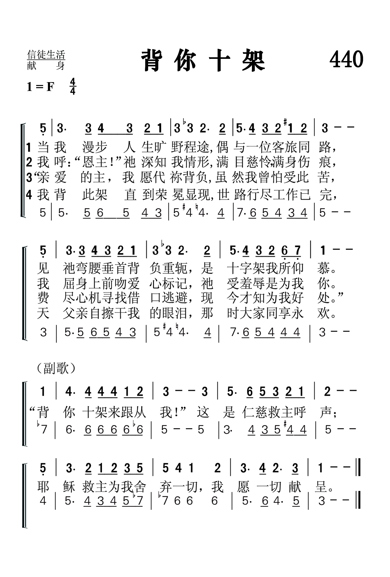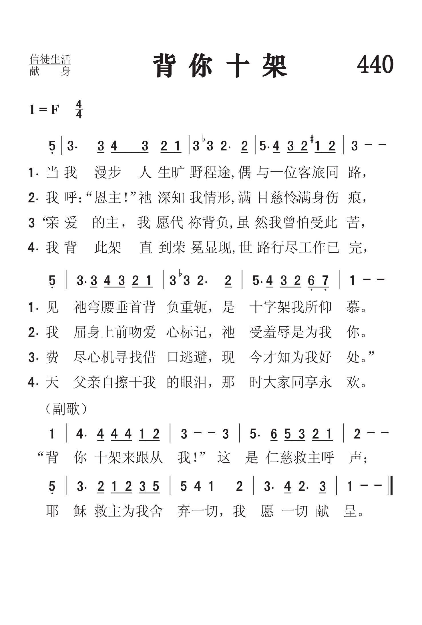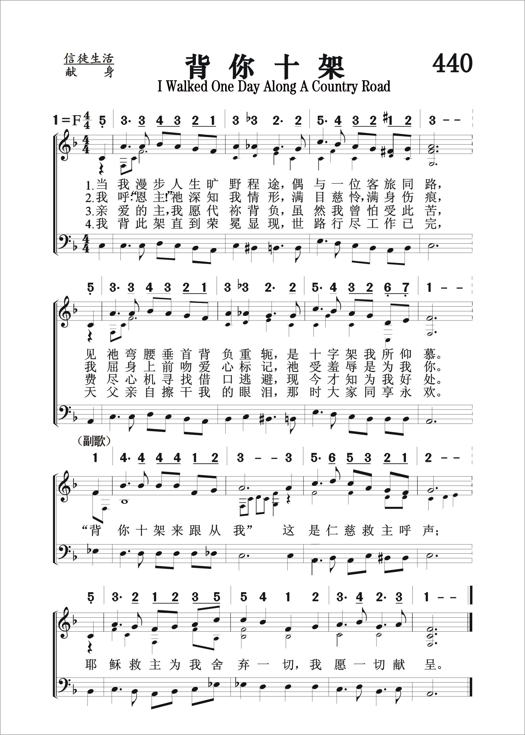 第440首 背你十架I Walked One Day Along a Country Road 阿克利(A.H.Ackley,1887,1,21-1960,7,3)作词作曲 当我漫步人生旷野程途.偶与一位客旅同路, 见祂弯腰垂首背负重轭,是十字架我所仰慕。 我呼恩主祂深知我情形,满目慈怜满身伤痕, 我屈身上前吻爱心标记,祂受羞辱是为我你。 亲爱的主我愿代祢背负,虽然我曾怕受此苦, 费尽心机寻找借口逃避,现今才知为我好处。 我背此架直到荣冕显现。世路行尽工作已完, 天父亲自擦干我的眼泪,那时大家同享永欢。 “背你十架来跟从我!” 这是仁慈救主呼声; 耶稣救主为我舍弃一切.我愿一切献呈。 本诗的作者阿尔福雷德.阿克利是美国.颇具盛名的音乐家。他出生于宾夕法尼亚州斯普林希尔市,自幼跟父亲学音乐,后到伦敦皇家音乐学院深造,成为出色是大提琴演奏家。他毕业于马里兰州威斯敏斯特神学院,1914年被按立为长老会牧师。他曾协助编写长老会赞美诗集,创作了1500余首诗歌。第64首《永活之主》也是阿克利作词作曲的。