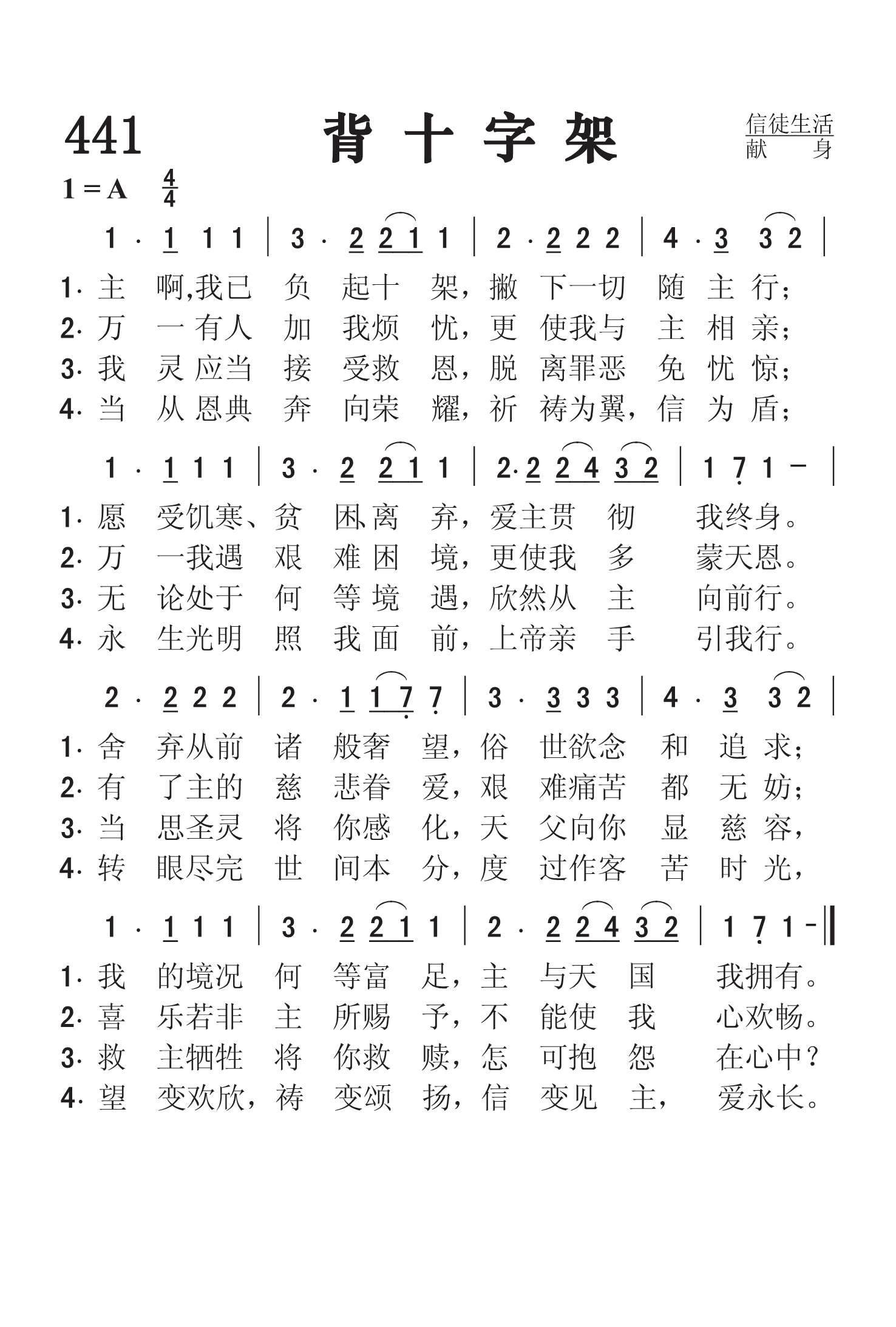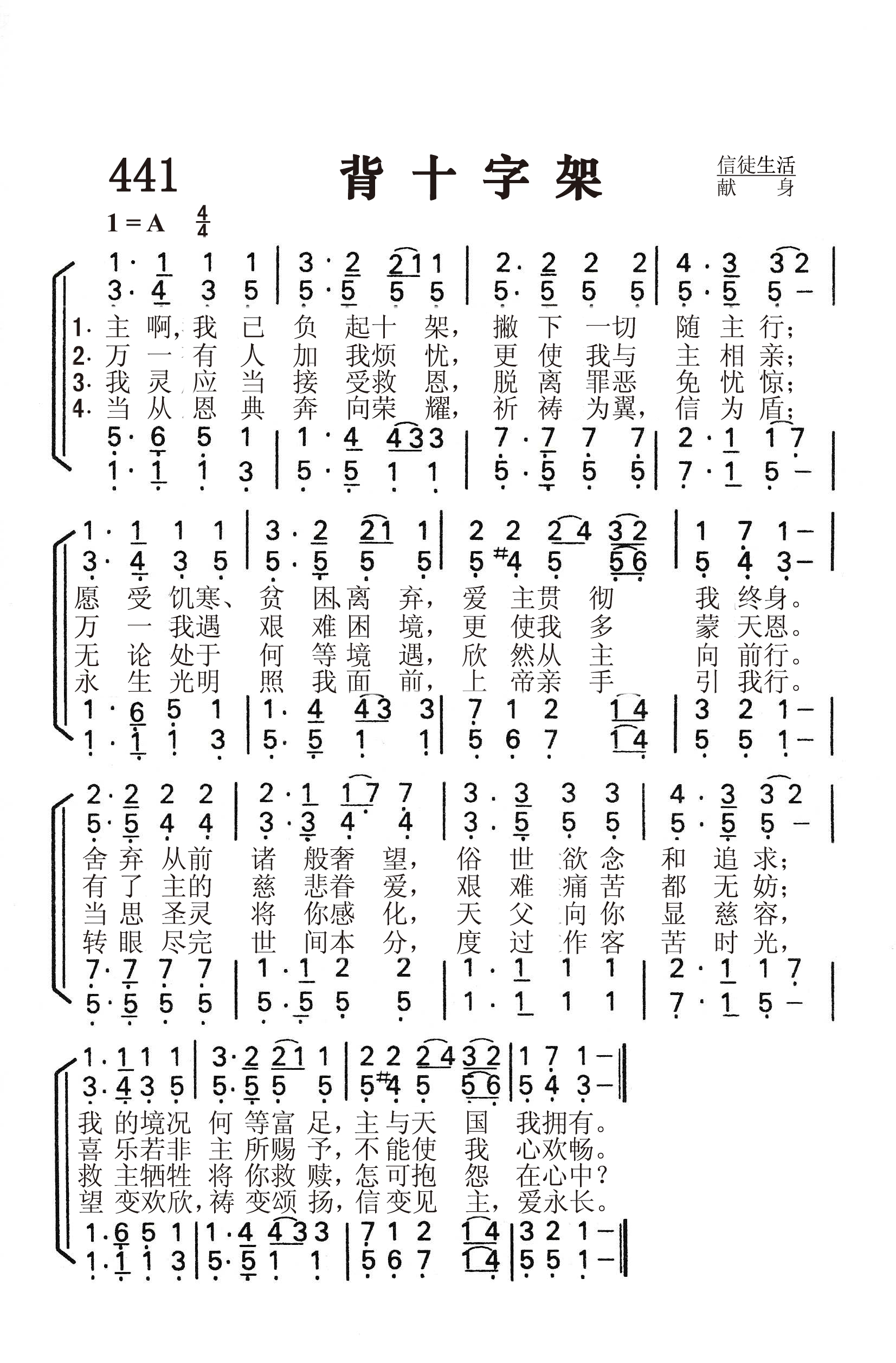 第441首 背十字架Jesus,I My Cross Have Taken 莱特(H .F .Lyte.1793,6,1-1847)作词(1824年),梅因(Hubert Platt Main, 1839,8,17-1925,10,9)根据莫扎特(Wolfgang Amadeus Mozart,1756,1,27-1791,12,15)原曲改编(1873年)。 主啊,我已负起十架,撇下一切随主行; 愿受饥寒、贫困\离弃,爱主贯彻我终身。 舍弃从前诸般奢望,世俗欲念和追求; 我的境况何等富足,主与天国我拥有。 万一有人加我烦忧,更使我与主相亲; 万一我遇艰难困境,更使我多蒙天恩。 有了主的慈悲眷爱,艰难痛苦都无妨; 喜乐若非主所赐予,不能使我心欢畅。 我灵应当接受救恩,脱离罪恶免忧惊; 无论处于何等境遇,欣然从主向前行。 当思圣灵将你感化,天父向你显慈容, 救主牺牲将你救赎,怎可抱怨在心中? 当从恩典奔向荣耀,祈祷为翼,信为盾; 永生光明照我面前,上帝亲手引我行。 转眼尽完世间本分,度过作客苦时光, 望变欢欣,祷变颂扬,信变见主,爱永长。 莱特是英国圣公会福音派牧师,敬虔博学,他克己牺牲,在布立克罕(Brixham)一个贫穷的渔村工作达24年之久。由于他的辛勤工作,来参加礼拜的人与日俱增,主日学的儿童猛增至八百余人。生活的坎坷以及他与渔民之间的文化差异,经常有不愉快的事发生。但莱特认为这是他所应当背负的十字架。他从亲爱的主那里得到鼓励和安慰。这首诗是莱特为纪念他的爱妻而写的,因为她不顾家庭的反对,毅然决然地跟随丈夫到渔村开辟圣工,同甘共苦,无怨无悔。原诗共有六段。根据的经文是可10:28:“看哪!我们已经撇下所有的跟从你了。”莱特牧师在弥留之际,指着上天说:“平安!快乐!”他知道在死亡冷河的彼岸,乃是“望变欢欣,祷变颂扬,信变见主,爱永长”的荣耀现实。 《背十字架》是十九世纪最流行的灵修圣诗,不但因为它含义深刻,而且因其感人的曲调是梅因根据莫扎特的名段改编的。 词作者莱特出生于苏格兰爱德纳姆,父母早逝,靠半工半读,才艰苦地读完爱尔兰都柏林三一大学的课程。他在校时成绩优秀,名列前茅,获得过奖学金。他原想学医,后又想在文学方面有所成就,但最后却献身为教会工作,到处于穷乡僻壤的困苦渔村为信徒服务和宣传福音。他22岁即担任牧师,两年后有一位同工病重垂危时,特请他到病塌前商谈灵性问题。莱特自愧无所贡献,乃与那位同工共读《罗马书》。从此,他自己也得到灵性奋兴的经验。 曲作者梅因出生于美国康涅狄格州。其父原为一音乐学校老师,音乐造诣甚高,声音洪亮。梅因11岁就开始在他父亲的学校读书,直到1854年前往纽约市工作,协助已成为乐谱出版商的父亲。他的好友中有当时著名的作曲家布里斯托。他喜爱音乐,16岁就开始作曲。他精通和声学,写过一千首以上的音乐作品,包括福音歌曲,圣歌和一般歌曲,编辑过赞美诗。他是纽约几个重要音乐团体的会员,多年担任圣诗班指挥和司琴。 他收藏甚广,强记博闻。无数的调名,作者姓名,生卒年月,版权期限他都记得一清二楚。在美国,几乎没有一个人像他那样对教会音乐如此熟悉,尤其是美国出版的教会音乐。这对出版界是个极大的帮助。 莫扎特是奥地利著名作曲家,素有神童之称。他的人生道路坎坷不平,常常贫困潦倒,但他从未放弃对音乐的追求和虔诚的心。他在35年的短暂生命里,共创作了各种音乐作品600多卷。《安魂曲》是他最著名的圣乐作品。