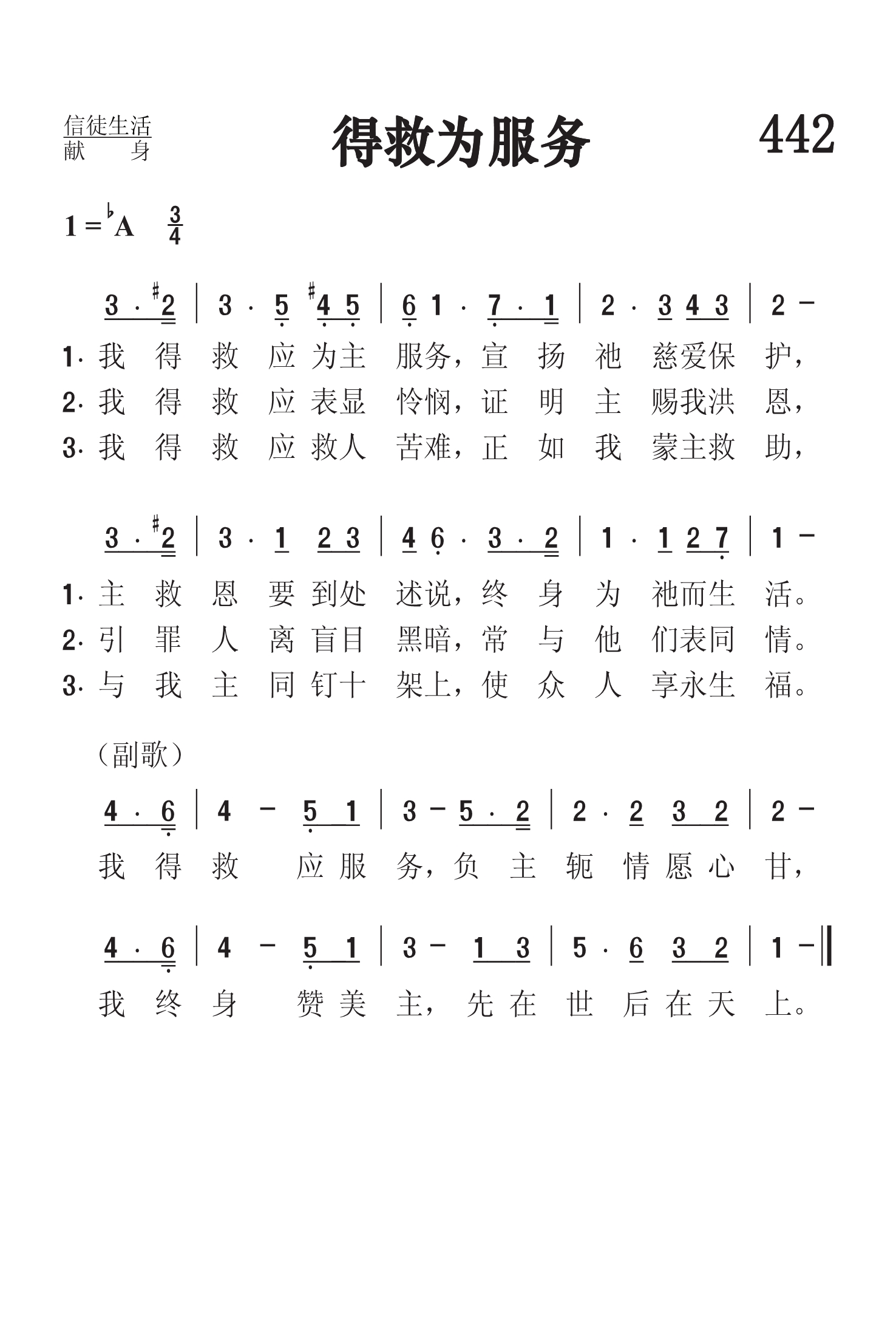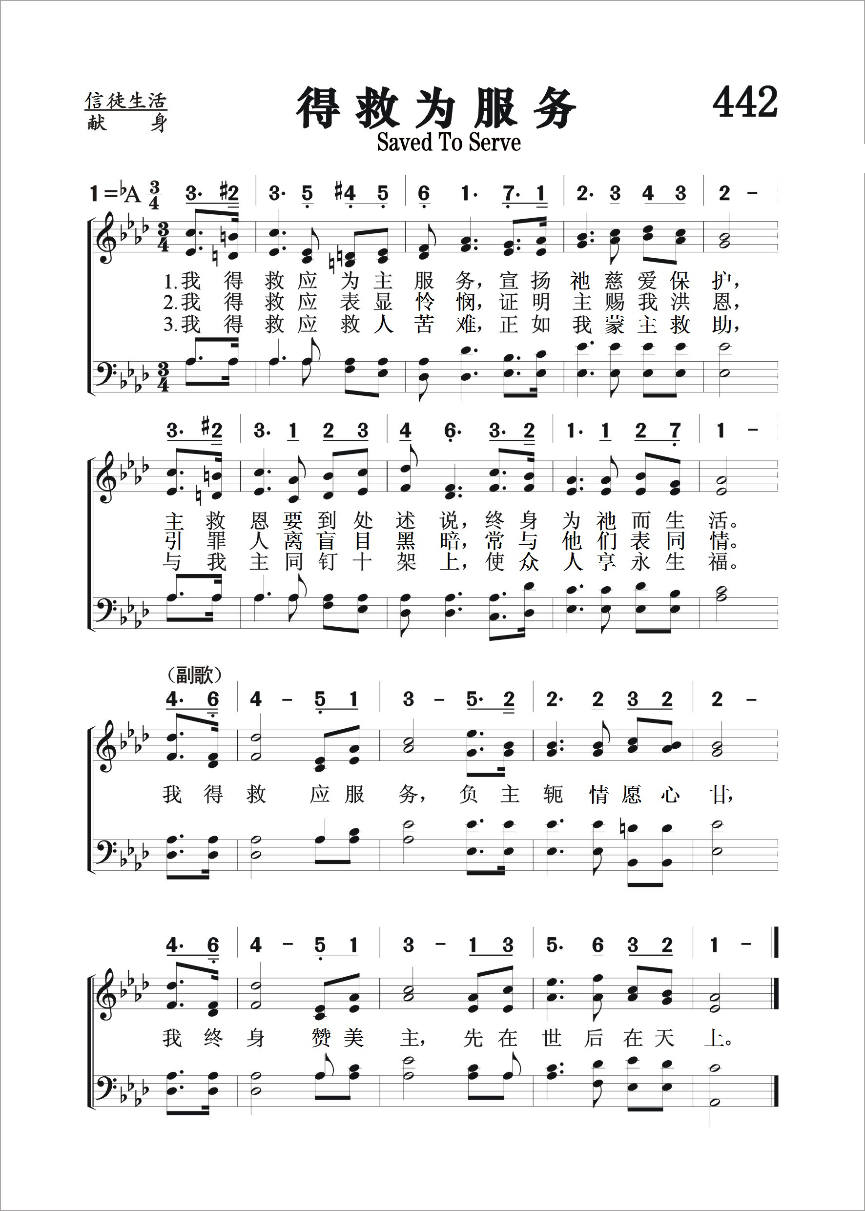 第442首 得救为服务Saved to Serve 贝尔登(Franklin.B.Belden,1858-1945)作词作曲 我得救应为主服务,宣扬祂慈爱保护, 主救恩要到处述说,终身为祂而生活。 我得救应表显怜悯,证明主赐我洪思, 引罪人离盲目黑暗,常与他们表同情。 我得救应救人苦难,正如我蒙主救助, 与我主同钉十架上,使众人享永生福。 我得救应服务,负主轭情愿心甘, 我终身赞美主,先在世然后天上。 贝尔登的这首诗歌,同样表达了得救与服务的主题。宣扬主的大爱,彰显那召我们出黑暗入奇妙光明者的美德,乃是每一位蒙恩得救的信徒义不容辞的责任和莫大的福份。他们背负救主服务的轭,效法主的榜样,用温柔和爱心把十字架的救恩介绍给沦丧于罪恶苦海之中的人。这样,他们的人生将更加多彩和辉煌。 贝尔登是基督复临安息日会的创始人之一怀爱伦女士的外甥,出生在密歇根州的巴特尔克里克,8岁时全家迁往加利福尼亚州,在那里他开始创作音乐。他后来因呼吸问题而迁往科罗拉多州,但在30岁左右回到巴特尔克里克,加入《评论与通讯》出版社。他是该安息日会第一本赞美诗集的音乐编辑之一,曾担任《评论与通讯》杂志的主管。他创作了数百首安息日学诗歌和其他赞美诗,并且大部分是由他自己谱曲的。1907年,他因在诗歌集的出版和经营上与教会领袖产生误解而离开教会。1910年开始他为布道家比利.森迪写歌。但他临终时把他的作品文稿全部捐献给基督复临安息日会神学院。