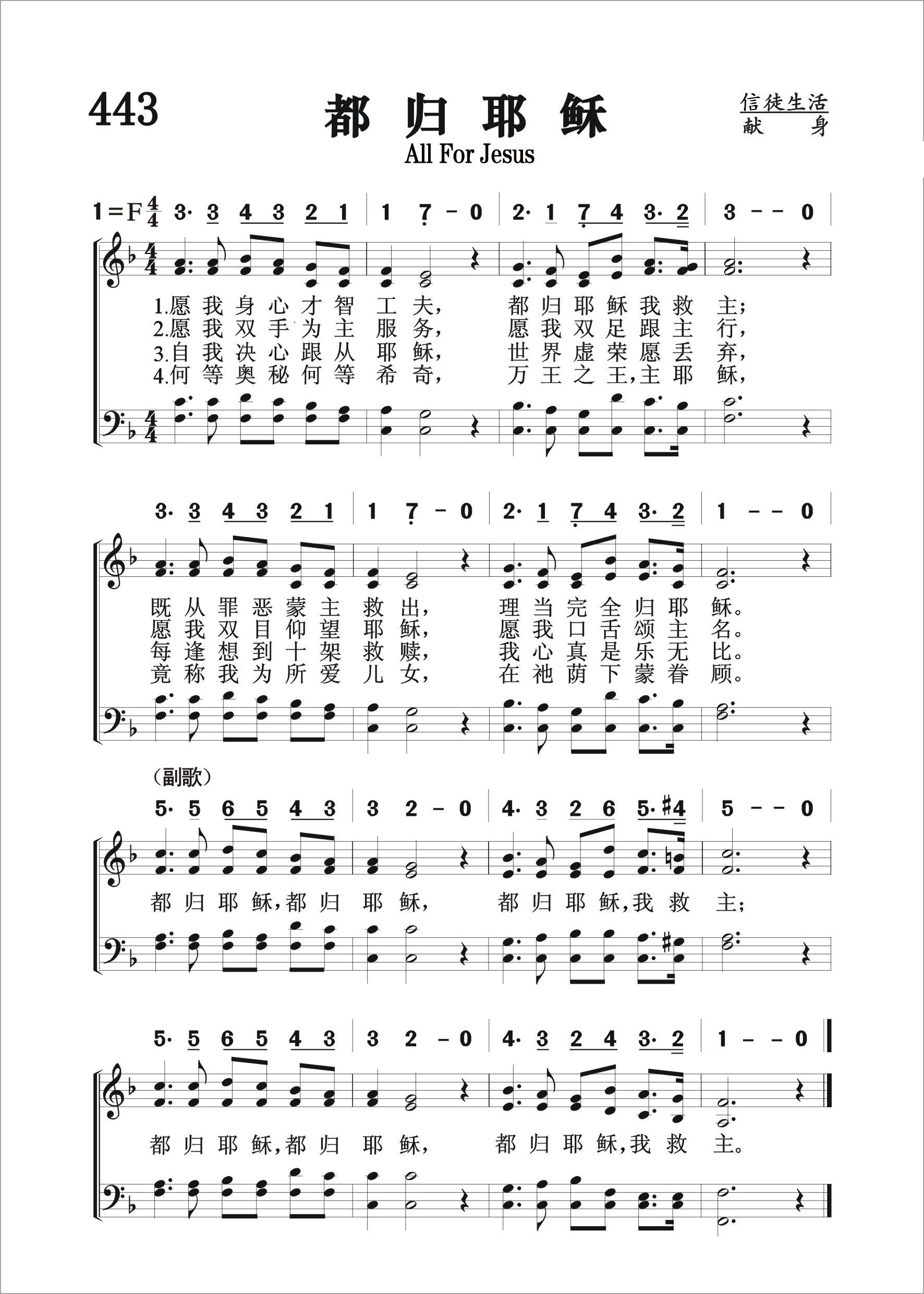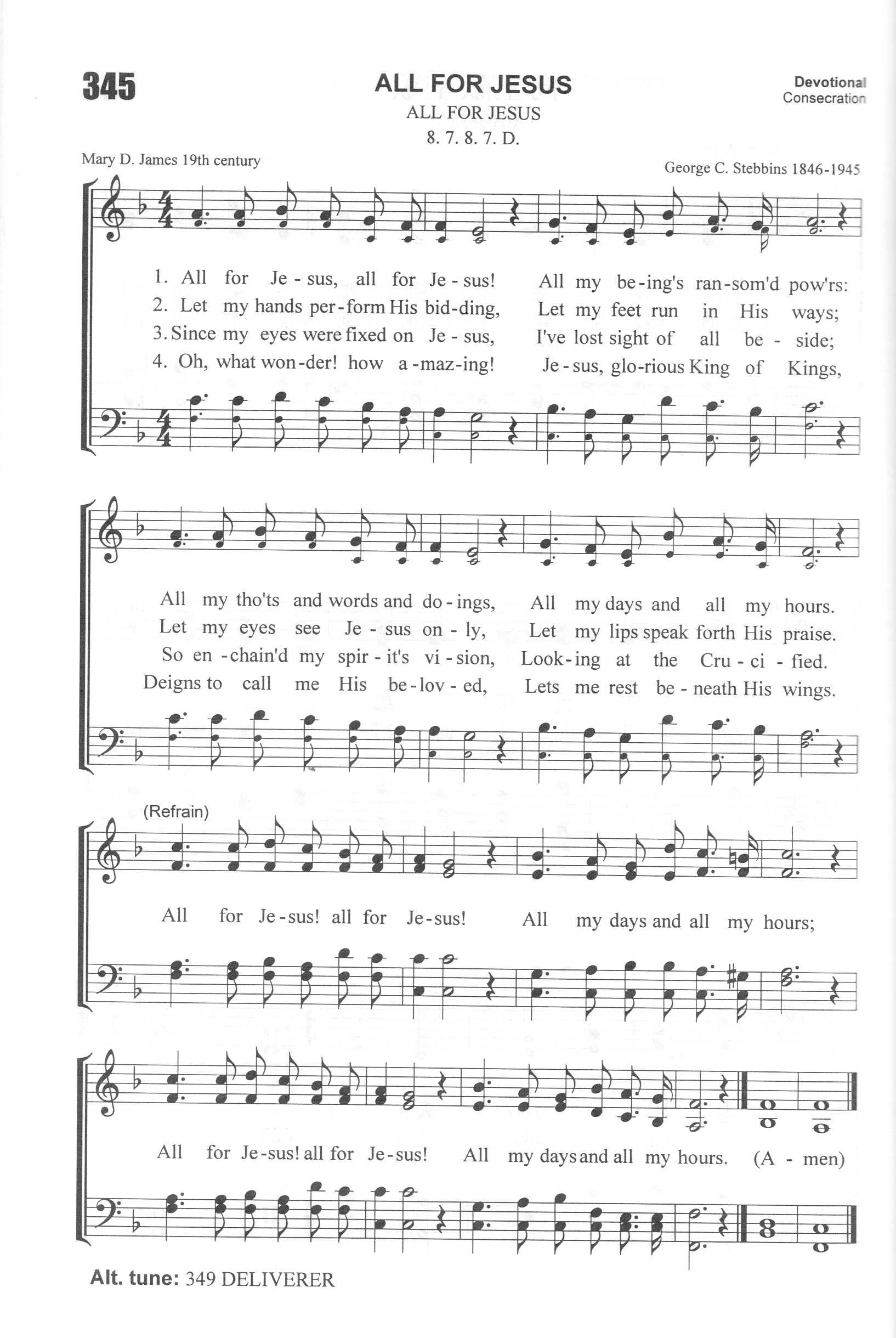 第443首都归耶稣All for Jesus 玛丽.詹姆斯(Mary D. James,1810 – 1883)作词,斯特宾斯(George C.Stebbins,1846,2,26-1945,10,6 )作曲 愿我身心才智工夫,都归耶稣我救主; 既从罪恶蒙主救出,理当完全归耶稣。 愿我双手为主服务,愿我双足跟主行, 愿我双目仰望耶稣,愿我口舌颂主名。 自我决心跟从耶稣,世界虚荣愿丢弃, 每逢想到十架救赎,我心真是乐无比。 何等奥秘何等希奇,万王之王主耶稣, 竟称我为所爱儿女,在祂荫下蒙眷顾。 都归耶稣,都归耶稣,都归耶稣我救主; 都归耶稣,都归耶稣,你当完全归救主。 玛丽.詹姆斯出生时,她的母亲想到《路加福音》10:42的经文,就祈求上帝让这小女孩能像马利亚一样,选择上好的福分,坐在耶稣的脚前。 这个祈祷应验在玛丽.詹姆斯身上。她终身敬爱她的救赎主,无论是出事教学,传福音或写圣诗都高举主圣名。 玛丽.詹姆斯十岁时参加一个奋兴会,被圣灵感动。传道士在呼召时,她无法挤入人潮。 有人看到了,就把她带到台前。她就在那里专注地向主祷告。 回家后,她的母亲鼓励她继续为自己的心灵祷告。 三天以后,她在一祷告会中立志归主。 二年以后,她在另一个祷告会中,经历了罪蒙洗净,内心得以清洁的经历。 她在十三岁时受主日学校长邀请带领六个6-9岁的小女孩。 当时她很惶恐。但在牧师和校长的鼓励下,她开始认真地上课,不久班级增至十二个学生。 她关心每一个学生,经常邀请她们到家中。 如果其中有人病了,她就带礼物前往探访。她更把握住每一个带领她们信主的机会。 在以后的六十年中,她一直关怀儿童,担任主日学教师及校长多年。 玛丽.詹姆斯与菲比.帕尔默(459首介绍)是好友。她们同为十九世纪美国圣洁运动(Holiness Movement)的拥护者。 她经常参加圣洁营的聚会,有时也领会。1870年年终,玛丽.詹姆斯回顾一年来上帝的特别恩赐和带领,深感要过得胜的生活,必需完全献身,因此她写了这首她最著名的圣诗,作为1871年的新年的立志。正如《罗马书》6:12-13所说:“所以不要容罪在你们必死的身上作王,使你们顺从身子的私欲。也不要将你们的肢体献给罪作不义的器具,倒要像从死里复活的人,将自己献给上帝,并将肢体作义的器具献给上帝。” 这首诗歌有三个曲调,其中有斯特宾斯所谱(《赞美诗新编》345首) 。 还有采用《赞美诗》505版452首的曲调,作者佚名。拿撒勒教会的创始人布雷西( Phineas Bresee) 认为这是当代最感人的圣诗,为基督徒生活的楷模。 曲作者斯特宾斯出生于美国纽约州的一个乡村,自幼喜爱音乐,13岁即进音乐学校学习,后到布法罗和纽约市继续深造。他23岁到芝加哥一个音乐商店工作,业余担任一个教堂唱诗班的指挥。1876年他随墓迪和桑基的布道团到过英国、印度、巴勒斯坦、埃及等地,以他的歌声为主作见证,并且多半是他自编自唱,收到了良好的效果。后来他将所谱的曲调和诗歌出版发行,使福音诗歌流传各地,备受欢迎。有人称他是福音诗歌的泰斗。他晚年所著《回忆录与福音圣诗的故事》,一方面作自传式的叙述,一方面收集其他福音诗歌作家的生平和故事,成为一部美好的见证。该书至今仍为研究圣诗的重要参考资料。