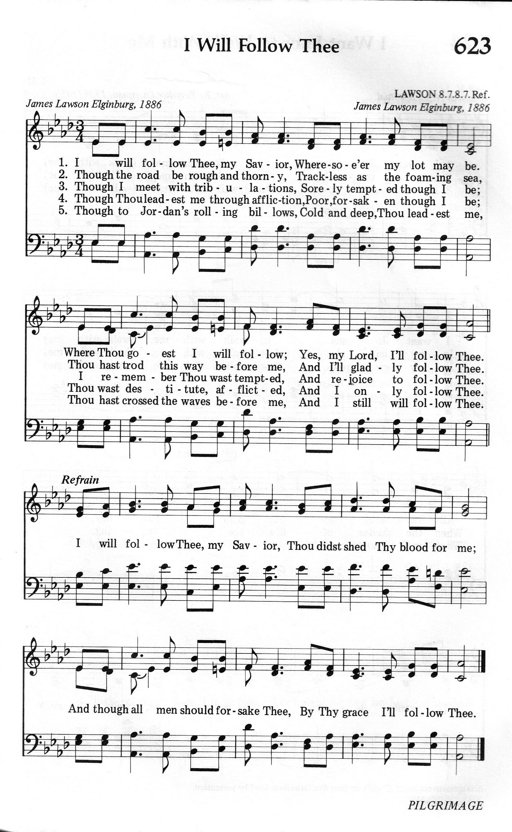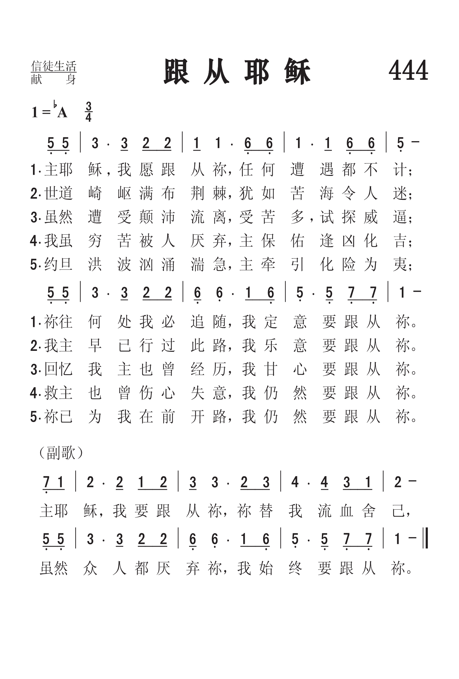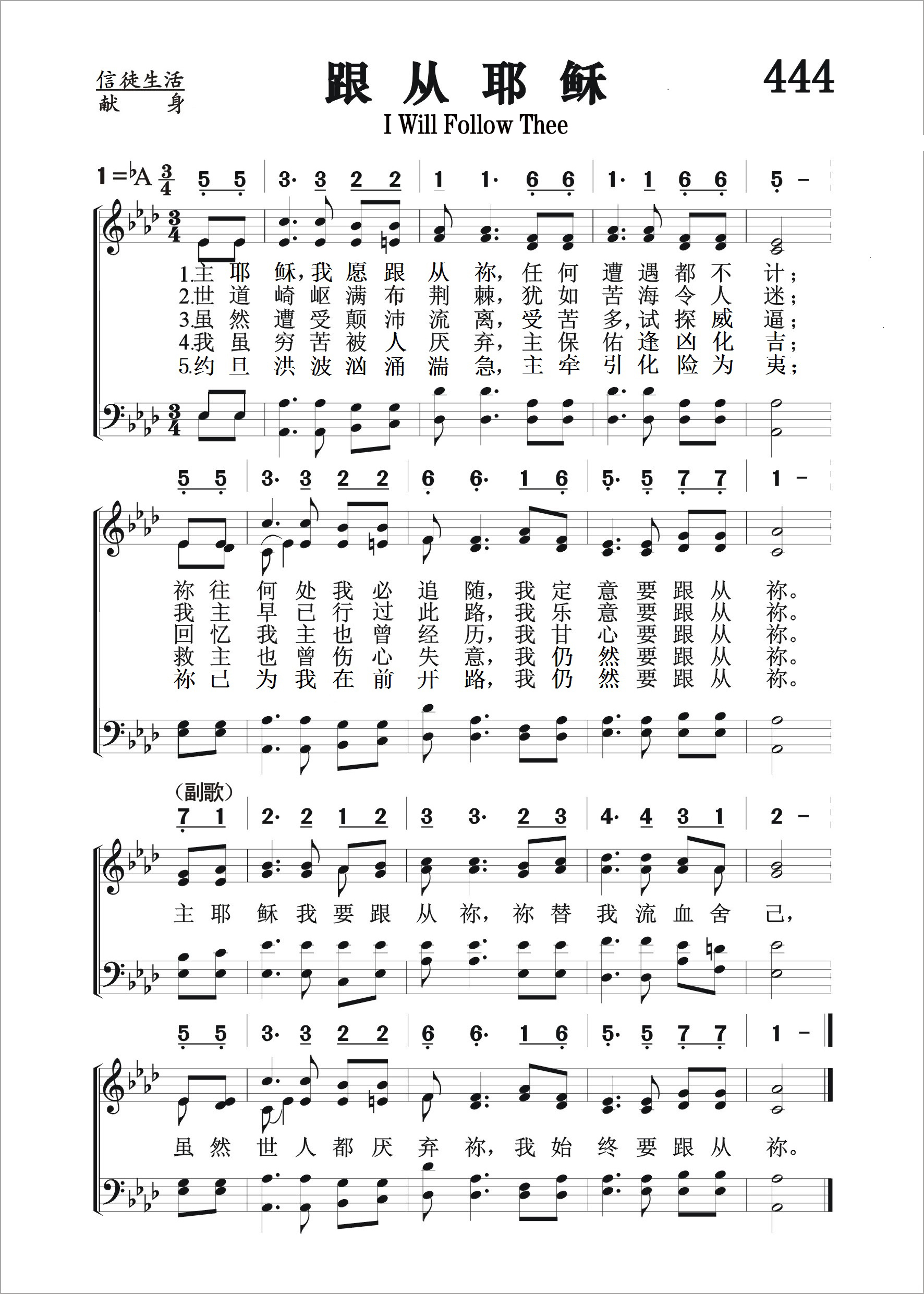 第444首 跟从耶稣I Will Follow Thee 劳森(James Lawson)作词作曲 主耶稣我愿跟从祢,任何遭遇都不计; 祢往何处我必追随,我定意要跟从祢。 世道崎岖满布荆棘,犹如苦海令人迷; 我主早已行过此路,我乐意要跟从祢。 虽然遭受颠沛流离,受苦多,试探威逼; 回忆我主也曾经历,我甘心要跟从祢。 我虽穷苦又被厌弃,主保佑逢凶化吉; 救主也曾伤心失意,我仍然要跟从祢。 约旦洪波汹涌湍急,主牵引化险为夷; 祢已为我在前开路,我仍然要跟从祢。 主耶稣我要跟从祢,祢替我流血舍己, 虽然世人都厌弃祢,我始终要跟从祢。 这首优美的诗歌表达了信徒愿意背负十架,跟随救主脚踪的坚强决心。主耶稣为救普世罪人,曾屈尊踏过血染的十架之路,作为主的门徒,也必然要经历种种艰难险阻。因为天国的门户并不宽敞,通天之路也是崎岖狭窄的。天国是努力的人才能进去的。这一点,信徒必须有清醒的认识。 本曲的作者是二十世纪的宗教作家,曾写过许多属灵的著作,大都与基督徒的生命历程有关,包括《著名基督徒的更深经验》(1911年),《圣书中最伟大的思想》(1918年),《最佳宗教诗歌》(1933年)和《著名布道士》(1941年)等