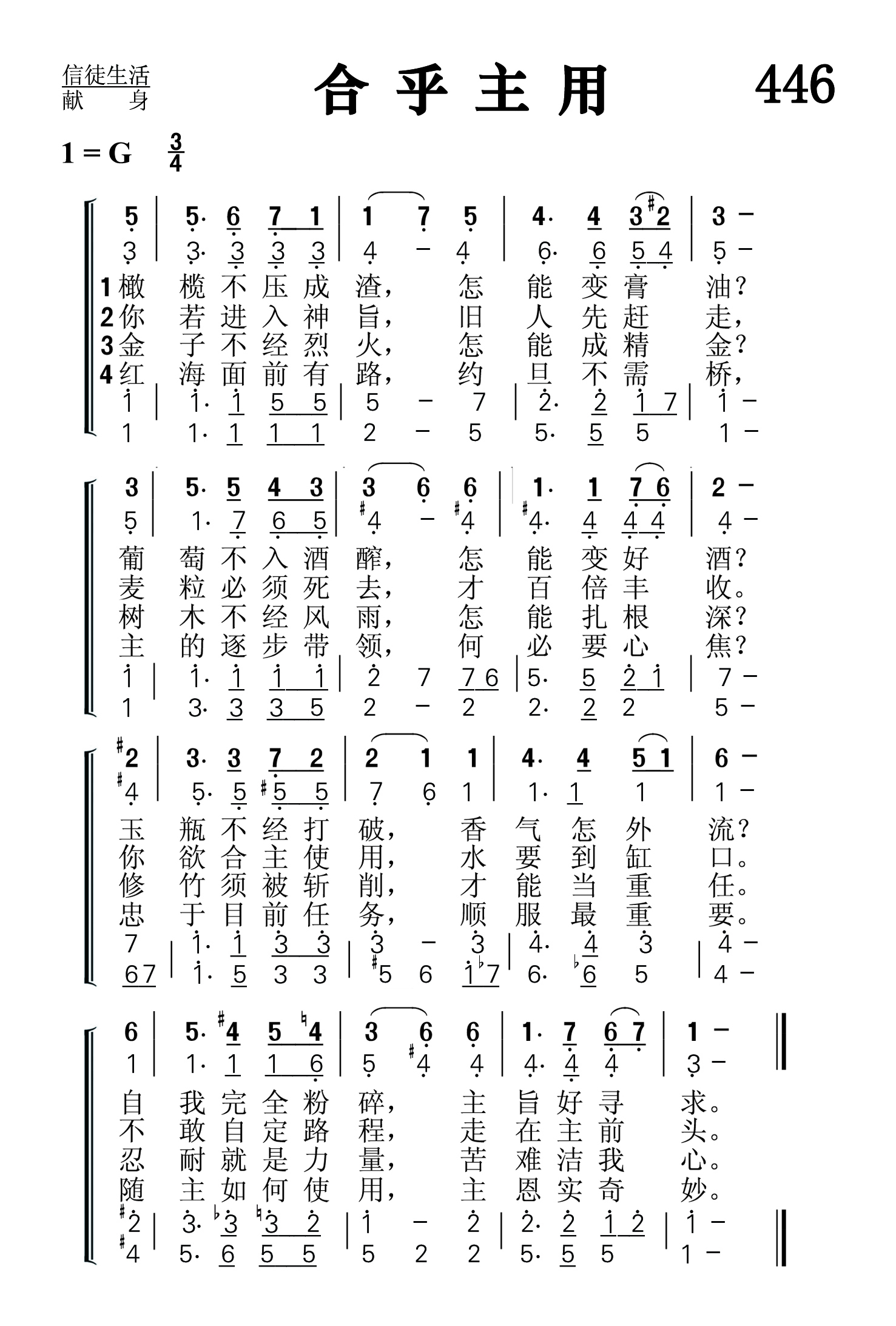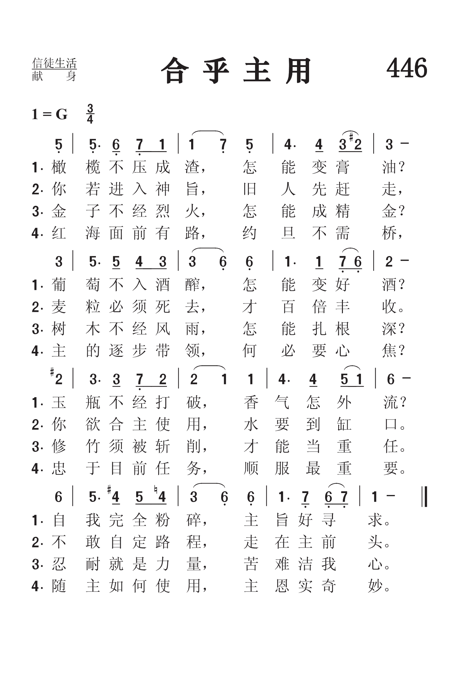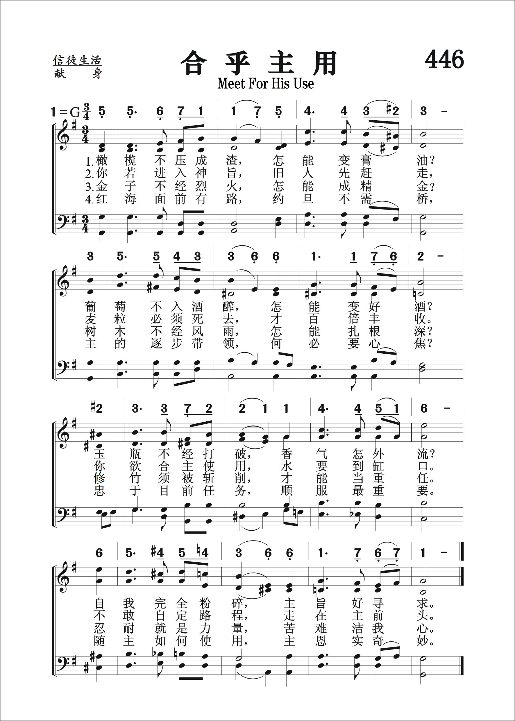 第446首合乎主用Meet for His Use 苏佐扬(1916-2007)作词作曲(1945年写于重庆) 橄榄不压成渣,怎能变膏油 葡萄不入酒醡,怎能变好酒 玉瓶不经打破,香气怎外流 自我完全粉碎,主旨好寻求。 你若进入神旨,旧人先赶走, 麦粒必须死去,才百倍丰收。 你欲合主使用,水要到缸口。 不敢自定路程,走在主前头。 金子不经烈火,怎能成精金 树木不经风雨,怎能扎根深 毛竹须被斩削,才能当重任。 忍耐就是力量,苦难洁我心。 红海面前有路,约旦不需桥, 主的逐步带领,何必要心焦 忠于目前任务,顺服最重要。 随主如何使用,主恩实奇妙。 苏佐扬牧师出生于香港的九龙,原藉广东。他11岁开始学口琴,12岁学弹风琴,两年之内熟背二百多首圣诗曲谱后,14岁开学作曲。其后又学会了十余种中西乐器。当年宋尚节、赵君影等名牧布道会时,常请他司琴或领唱。16岁,他在宋尚节博士初来香港布道时,决志献身。18岁进入山东华北神学院念神学。 苏佐扬于1937年毕业于山东华北神学院,毕业后,日本战事开始,自1937-1948年间在中国十九省奔驰为主作工,经历许多困难,但从不灰心。先在中国各省自由传道,30岁在甘肃被按立为牧师,1948年终返香港,先后在香港、澳门两地牧会、教学四年。 1953年春,他辞去了受薪的职务,开始过信心的生活,准备去海外为主作工,当时他亲友都为他担心“一家七口何以养生”?神赐给他两句话:“红海面前自有路,约但河边不需桥”,神的话永远有效。自1953-1961年间,他足迹遍日本、菲律宾、新几内亚、澳大利亚、新加坡、马来西亚、泰国、越南、印度尼西亚等地。1962-1976年间,他在欧美四十六国家及地区向华人布道。他有语言天份,能用英语、普通话、广东话,闽南语、潮州话、客语及上海话讲道。此外他也懂十多种欧亚语言。他的座右铭是“只对主忠心,不问人褒贬”。 苏牧师凭信心于1942年创办《天人之声季刊》及1963年开办“天人神学院”(现只办海外函授科)。至今他已出版了卅多种书籍,他用圣书经文谱写了许多短歌,约有五百首,他立志要将音乐的恩赐为主所用,除短歌外,尚作有天人圣诗二百二十首。