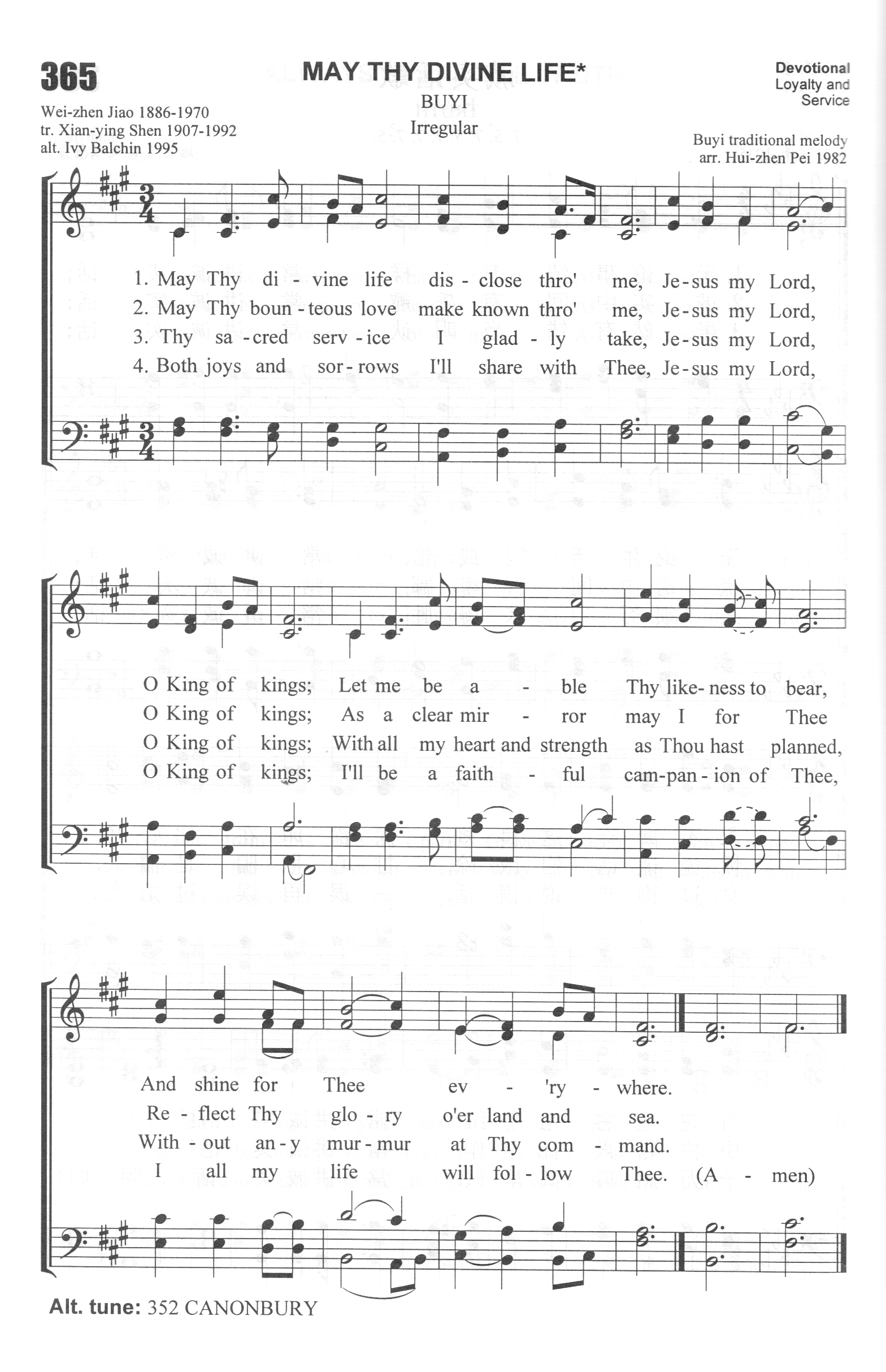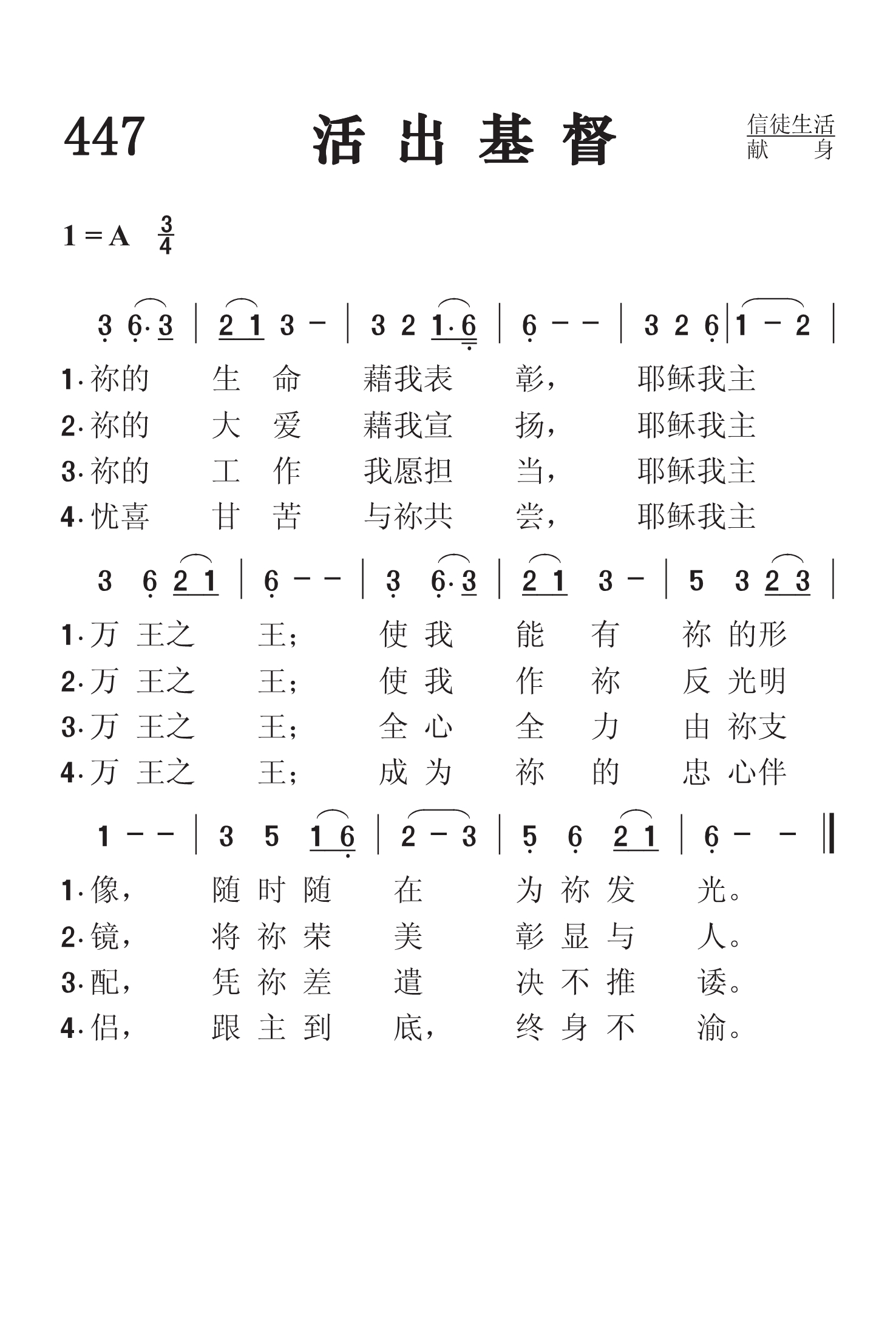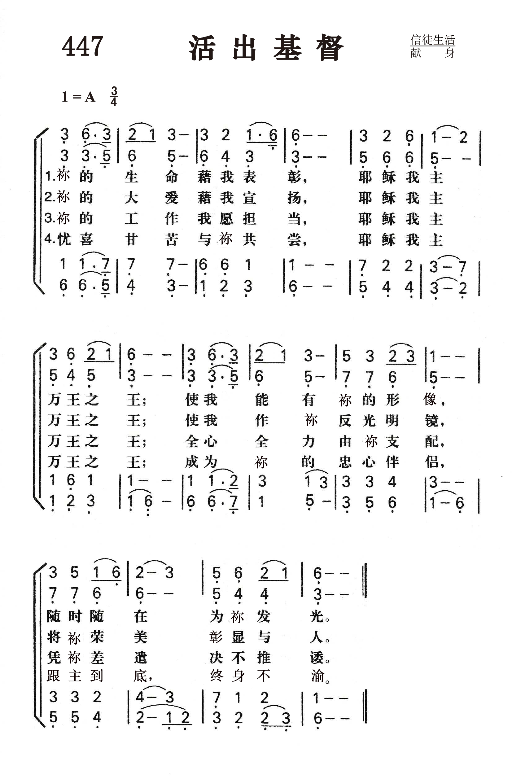 第447首活出基督May Thy Divine Life 焦维真(1886-1970)作词,布依族曲调,裴慧真改编(1982年) 祢的生命藉我表彰,耶稣我主万王之王; 使我能有祢的形像,随时随在为祢发光。 祢的大爱藉我宣扬,耶稣我主万王之王; 使我作祢反光明镜,将祢荣美彰显与人。 祢的工作我愿担当,耶稣我主万王之王; 全心全力由祢支配,照祢差遣决不推诿。 忧喜甘苦与祢共尝,耶稣我主万王之王: 成为祢的忠心伴侣,跟主到底,终身不渝。 词作者焦维真,山东即墨人,毕业于金陵女子神学院,曾在山东沂州,辽宁营口等地传道,并在营口创办了一所圣书学院。授课之余,赴国内及南洋各地主领培灵会。1941年去泰国领会时,因太平洋战争爆发而滞留,遂在泰国华侨中工作。1946年回国后,与毕路得等在上海江湾创办中华神学院。1947年又在上海创办中国基督教传道人修养院。焦维真在南京时,曾与贾玉铭合办《灵光报》,发表不少解经文章,并创作赞美诗多首。 曲调改编者裴慧真1941年出生于上海的一个基督教牧师家庭,从小学习钢琴,1956年受洗,1965年毕业于沈阳音乐学院,长期在贵州工作。现为贵州大学艺术学院钢琴教授,中国音乐家协会会员,高级考官。
