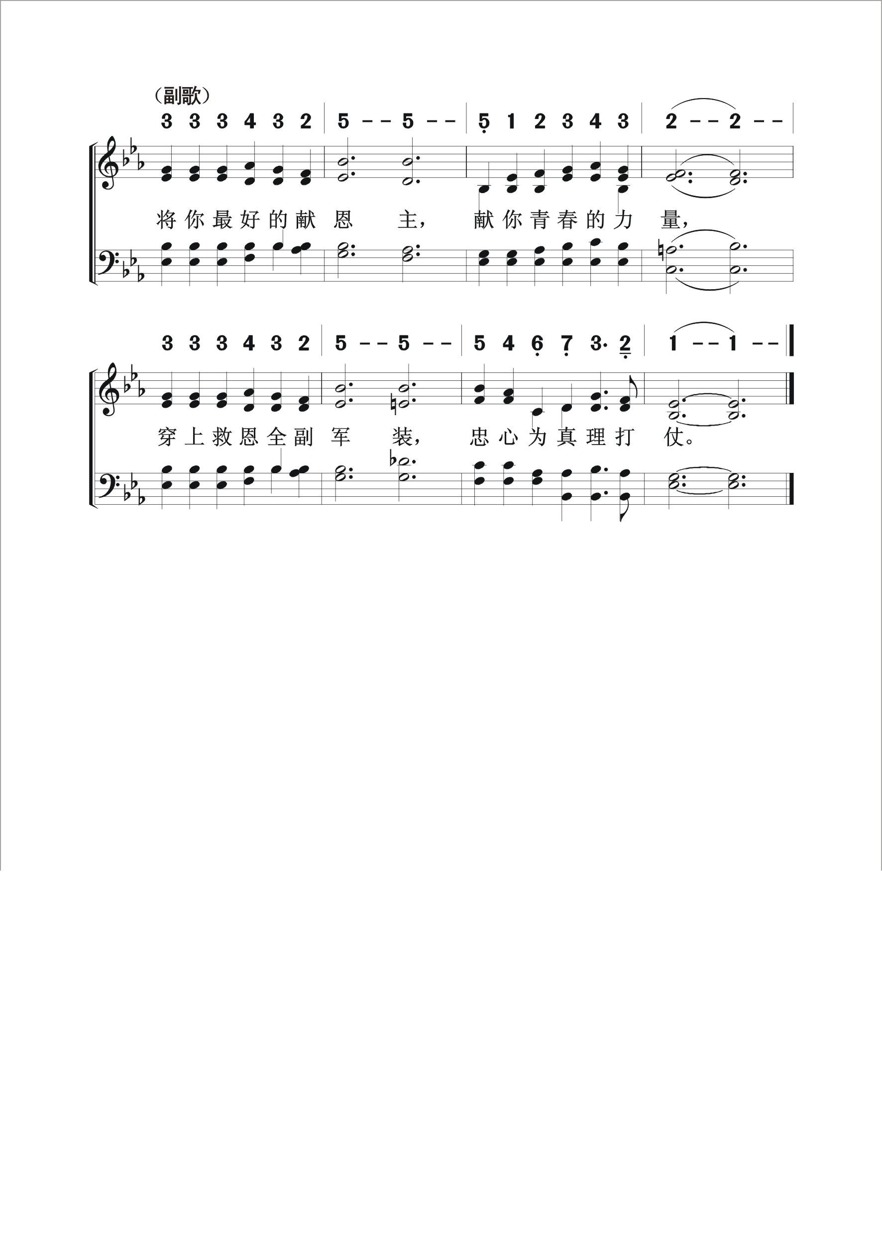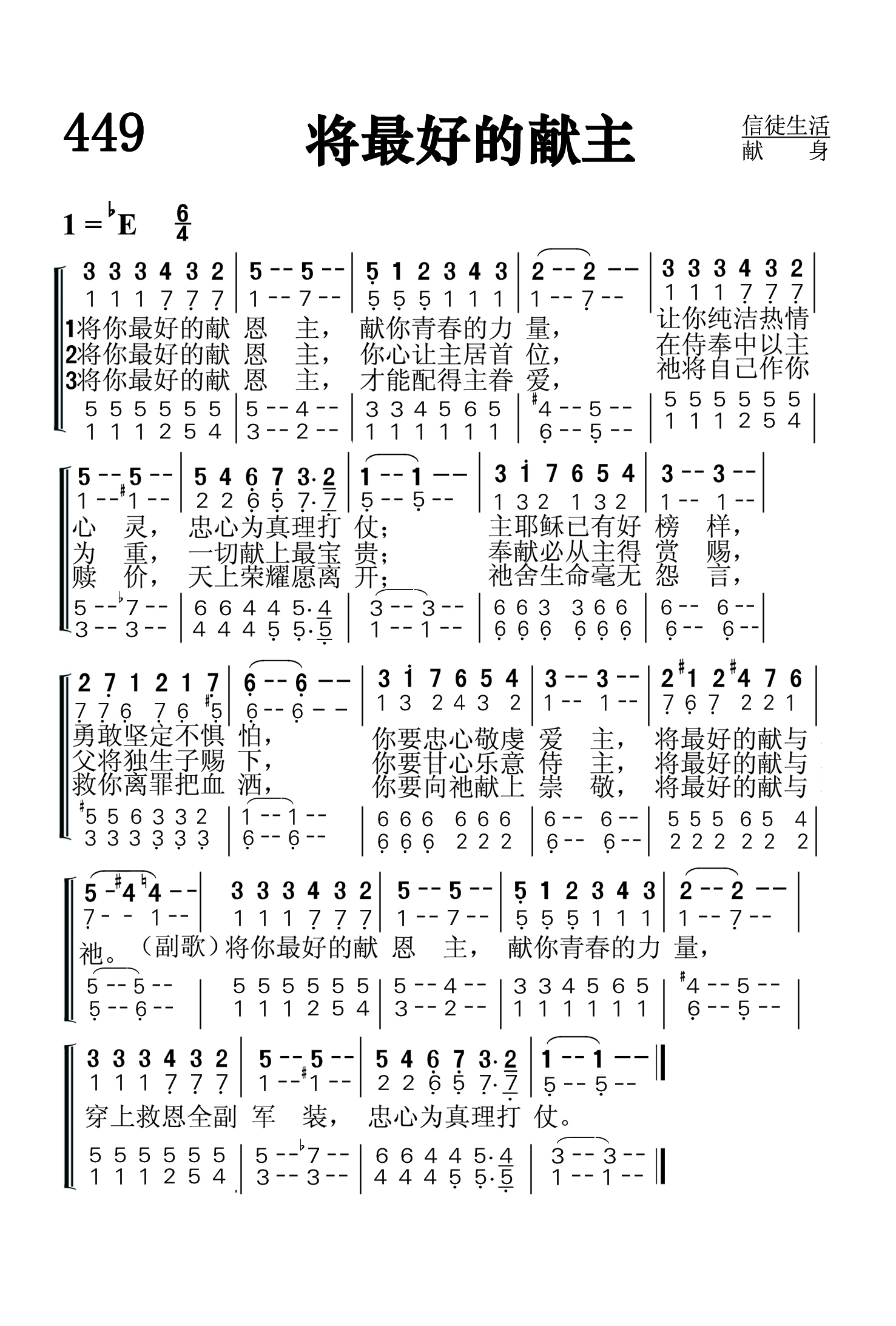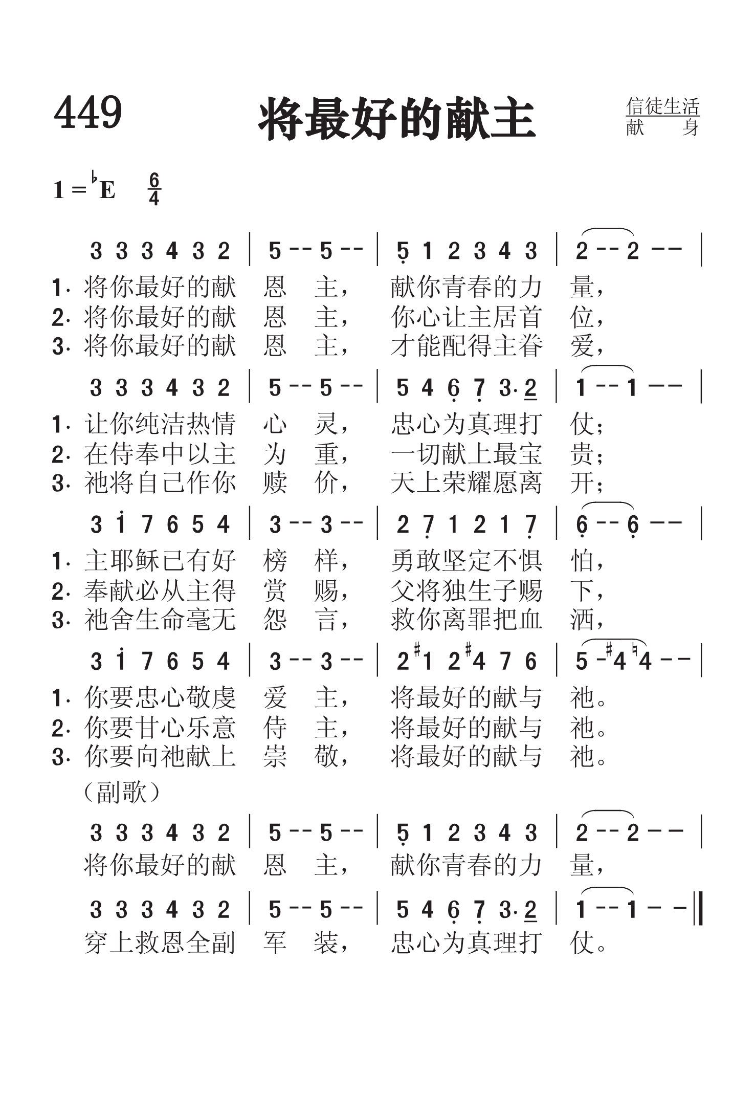 第449首 将最好的献主 Give of Your Best to the Master (《赞美诗》506版第542首) 霍华德.格罗斯(Howard B.Grose,1851.9.5-1939.5.19 )作词(1902年); 夏洛特.巴纳德(Charlotte A.Barnard,1830.12.23-1869.1.30)作曲(1864年) 将你最好的献恩主,献你青春的力量, 让你纯洁热情心灵,忠心为真理打仗; 主耶稣已有好榜样,勇敢坚定不惧怕, 你要忠心敬虔爱主,将最好的献与祂。 将你最好的献恩主,你心让主居首位, 在侍奉中以主为重,一切献上最宝贵; 奉献必从主得赏赐,父将独生子赐下, 你要甘心乐意侍主.将最好的献与祂。 将你最好的献恩主,才能配得主眷爱, 祂将自己作你赎价,天上荣耀愿离开; 祂舍生命毫无怨言,救你离罪把血洒, 你要向祂献上崇敬,将最好的献与祂。 词作者霍华德.格罗斯出生在美国纽约州米尔顿,先后就读于芝加哥大学和纽约州罗切斯特大学。1883年被按立为牧师,先后在纽约州波基普西第一浸信会(1883-1887),宾夕法尼亚州匹兹堡第一浸信会(1888-1890)侍奉。后任南达科塔大学校长(1890-1892),在芝加哥大学教历史(1892-1896),任波士顿《守望者》助理编辑(1896-1900)。编辑《使命》杂志计23年之久。他的人生最后在纽约州的弗农山度过。他的著作甚丰,包括一些赞美诗。 曲作者夏洛特.巴纳德出生于英国伦敦的一个律师家庭,是十九世纪最成功和多产的民歌女作曲家。本曲她原是为一首世俗诗歌《拿回你给的心》谱写的。