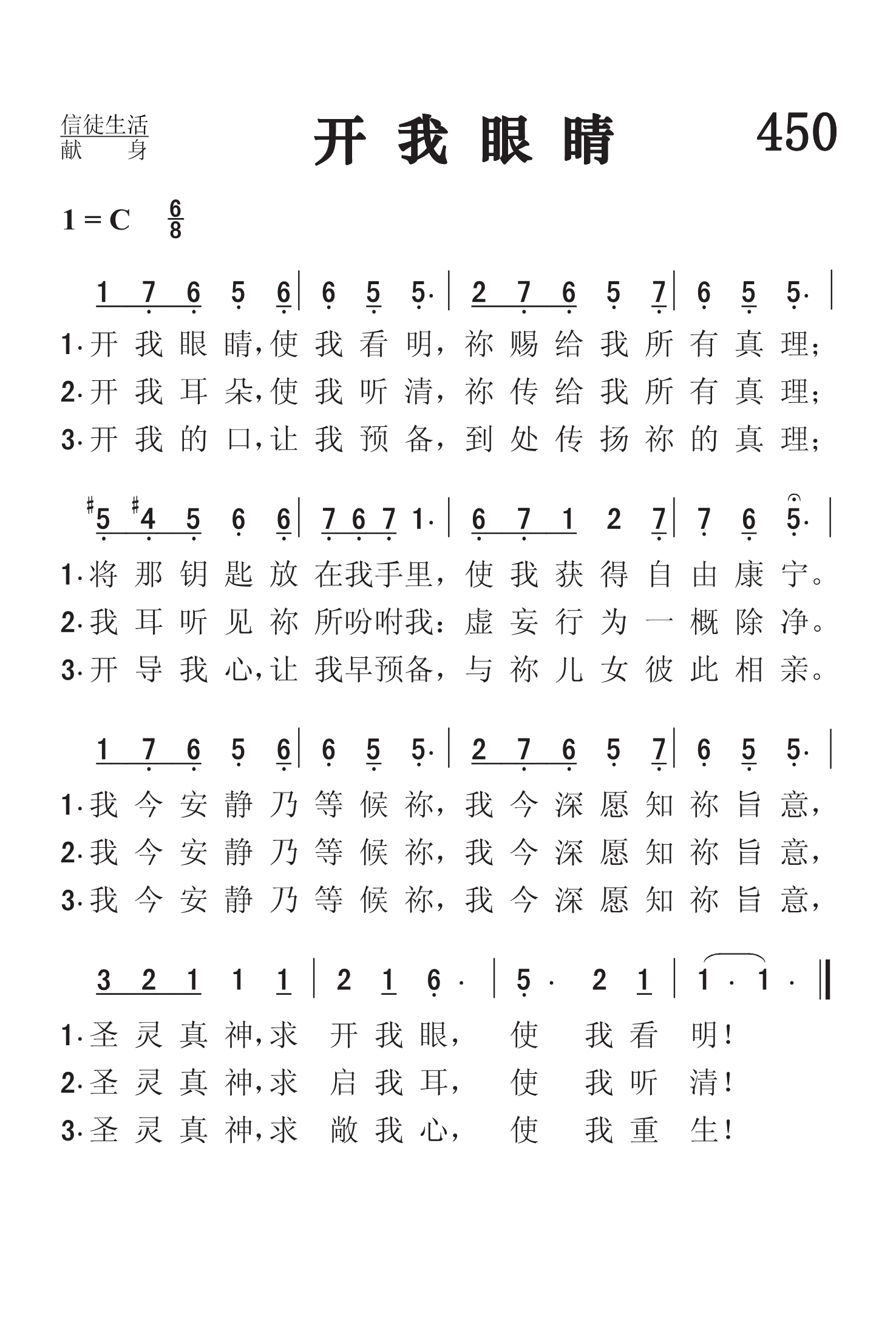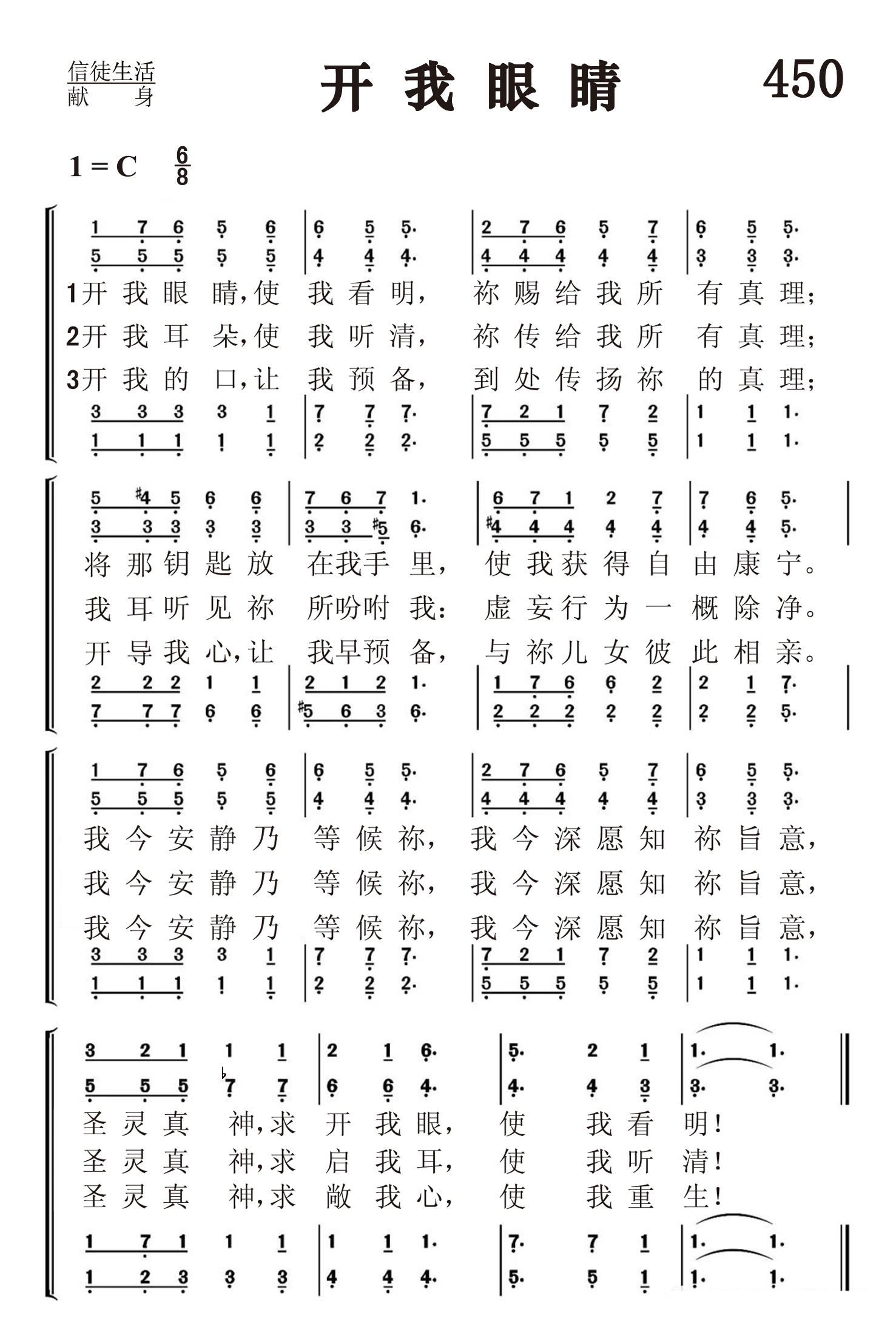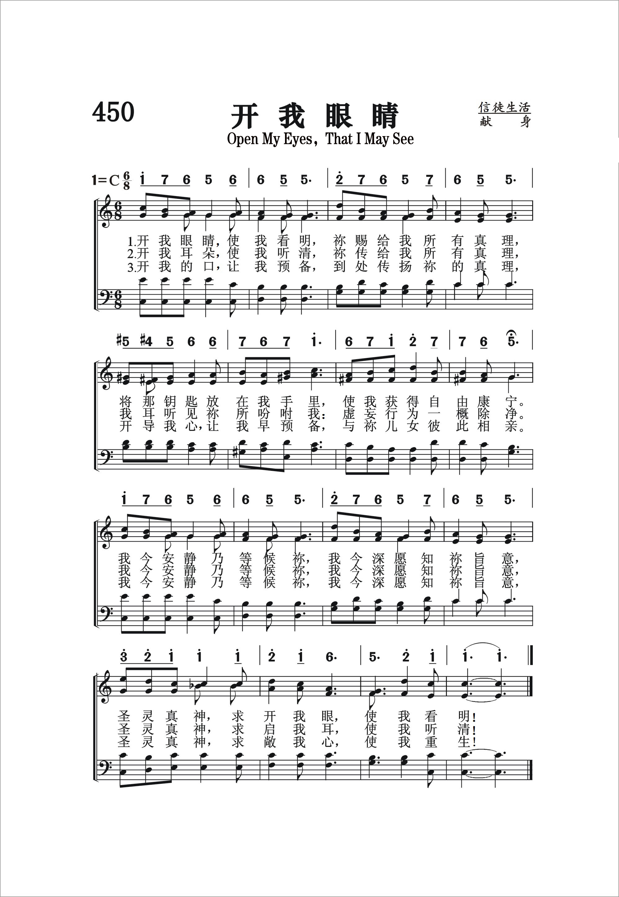 第450首 开我眼睛Open My Eyes,that I May See 斯科特(Clara .H .Scott,1841,12,3-1897,6,21)作词作曲(1885年) 开我眼睛使我看明,祢赐给我所有真理; 将那钥匙放在我手里,使我获得自由康宁, 我今安静乃等候祢,我今深愿知祢旨意, 圣灵真神,求开我眼,使我看明! 开我耳朵,使我听清,祢传给我所有真理, 我耳听见祢所吩咐我,虚妄行为一概除净, 我今安静乃等候祢,我今深愿知祢旨意, 圣灵真神,求启我耳,使我听清。 开我的口,让我预备.到处传扬祢的真理, 开导我心让我早预备,与祢儿女彼此相亲, 我今安静乃等候祢.我今深愿知祢旨意, 圣灵真神,求敞我心,使我重生。 克拉拉.斯科特出生于美国伊利诺斯州,曾就读于芝加哥的一所音乐学院,三年以后在莱昂斯女子神学院担任音乐教师。1861年她与亨利.结婚。在帕尔默(见《颂赞诗歌》第26首介绍)的鼓励之下,她创作了大量赞美诗和钢琴曲,出版了好几部圣诗集和专著。1897年,她在出访杜布克时遭遇一匹脱缰的马而意外身亡。 《开我眼睛》是斯科特所创作的一首最著名的诗歌,反映了一个虔诚爱主的人所吐露的心声。这也是一篇热情的祈祷,求主开启我们的眼睛,使我们能看见所有的真理;开启我们的耳朵,使我们能明白主的吩咐;开启我们的口,使我们能传播主的恩言。这首诗也表达了安静等待救主启示的信心。