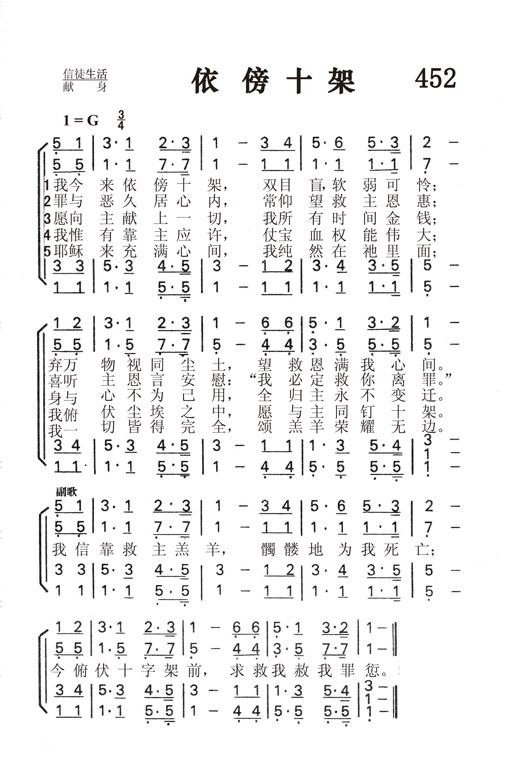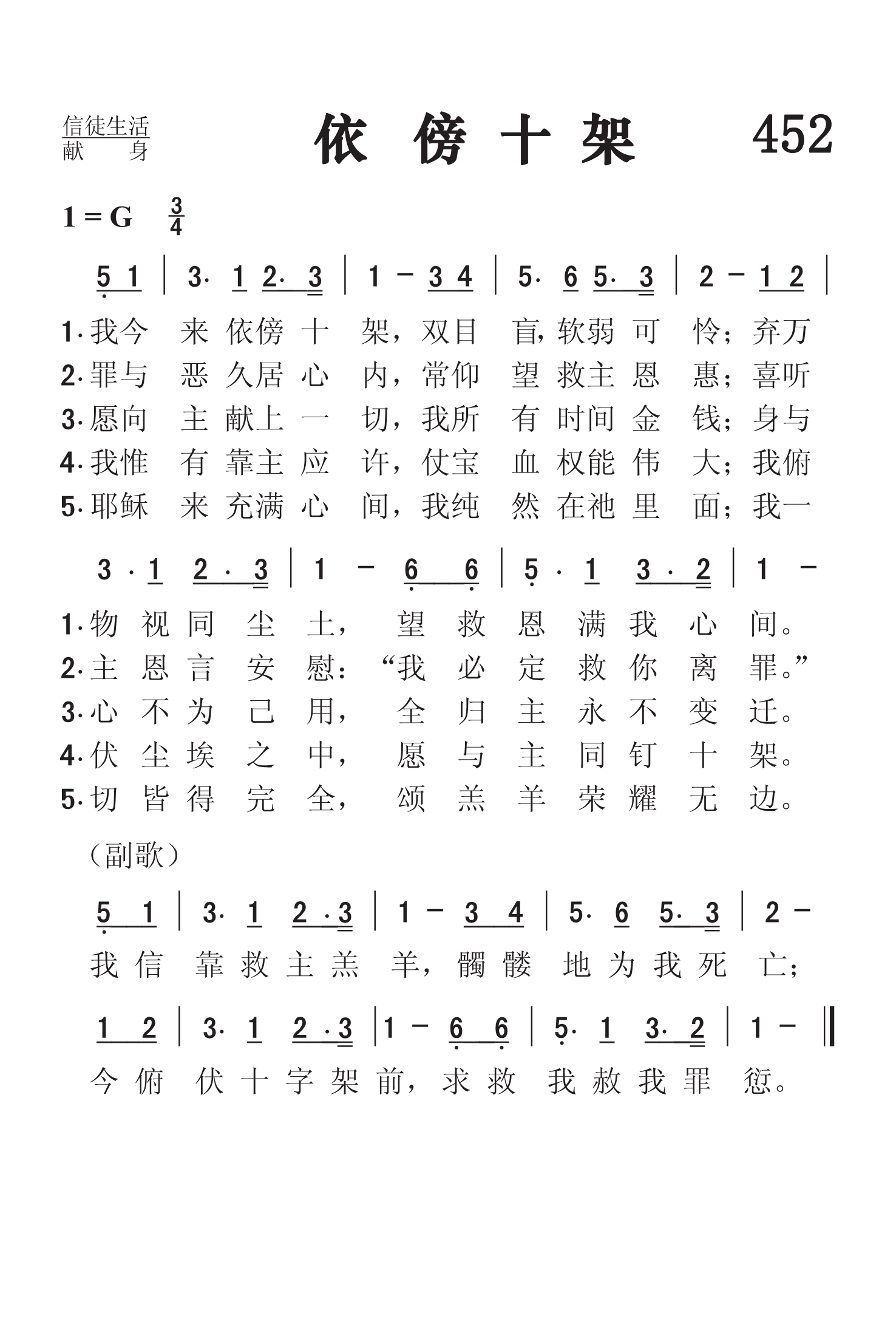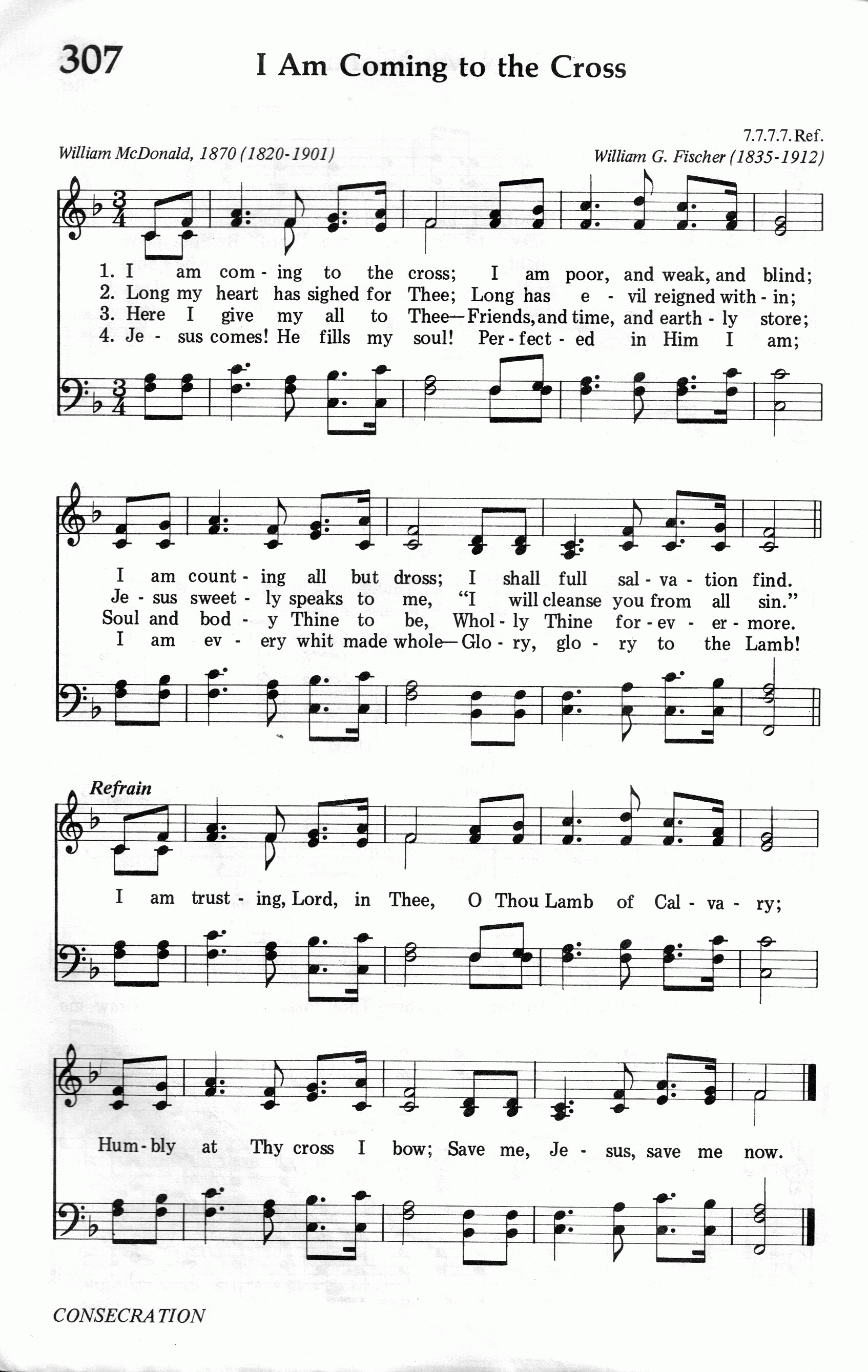第452首 依傍十架I Am Coming to the Cross 威廉.麦克唐纳(W.McDonald,1820,3,1-1901,9,)作词(1870年),费希尔(W.G.Fischer, 1835,10,14-1912,8,12)作曲 我今来依傍十架,双目盲,软弱可怜; 弃万物视同尘土,望救恩满我心间。 罪与恶久居心内,常仰望救主恩惠; 喜听主恩言安慰:我必定救你离罪。 愿向主献上一切,我所有时间金钱; 身与心不为己用,全归主永不变迁。 我惟有靠主应许,仗宝血权能伟大; 我俯伏尘埃之中,愿与主同钉十架。 耶稣来充满心间,我纯然在祂里面; 我一切皆得完全,颂羔羊荣耀无边。 我信靠救主羔羊,髑髅地为我死亡; 今俯伏十字架前,求救我,赦我罪愆。 这是一首有名的救恩呼召圣诗,是麦克唐纳于任布鲁克林区卫理公会牧师时写成的。他从实际牧养工作中,感到有必要写一首诗,来帮助到圣台前追求清心的人。这首诗以简洁的词句,柔和的呼声,感人的经历,号召所有来到主十字架前的人要认识自己的贫困、软弱、盲目而祈求主完全的救恩;要求信徒将自己与主同钉十字架,奉献身心永归于主。正因麦克唐纳如此深刻了解信徒的灵性光景,所以在几分钟内就将诗写好。自1870年这首诗流传于教会后,曾译成多国文字,成为世界上许多教会常唱的一首诗。麦克唐纳出生于美国缅因州,1839年起担任卫理公会的牧师。他还主编过《基督徒见证》刊物。晚年时感到卫理公会不能满足他的属灵生活,就组织一部分信徒,成立了通圣会,要求遵守圣书有关圣洁的要求,和更加严谨地按照卫斯理的规条,追求圣洁的生活。 他一生写过十本宗教书藉,七本教会使用的圣乐诗集。 曲作者费希尔是美国业余圣诗作曲家。他出生于美国马里兰州,原籍德过,从青年时代起就对音乐感兴趣,曾在美国费城说德语的一座教堂里学唱诗;一度从事装订图书工作,并继续在夜校学音乐。他钢琴弹的很好,也指挥合唱团,并任钢琴商店的推销员。许多堂会请他教唱诗和指挥唱诗班。他一生谱写了约200首福音圣诗曲调。