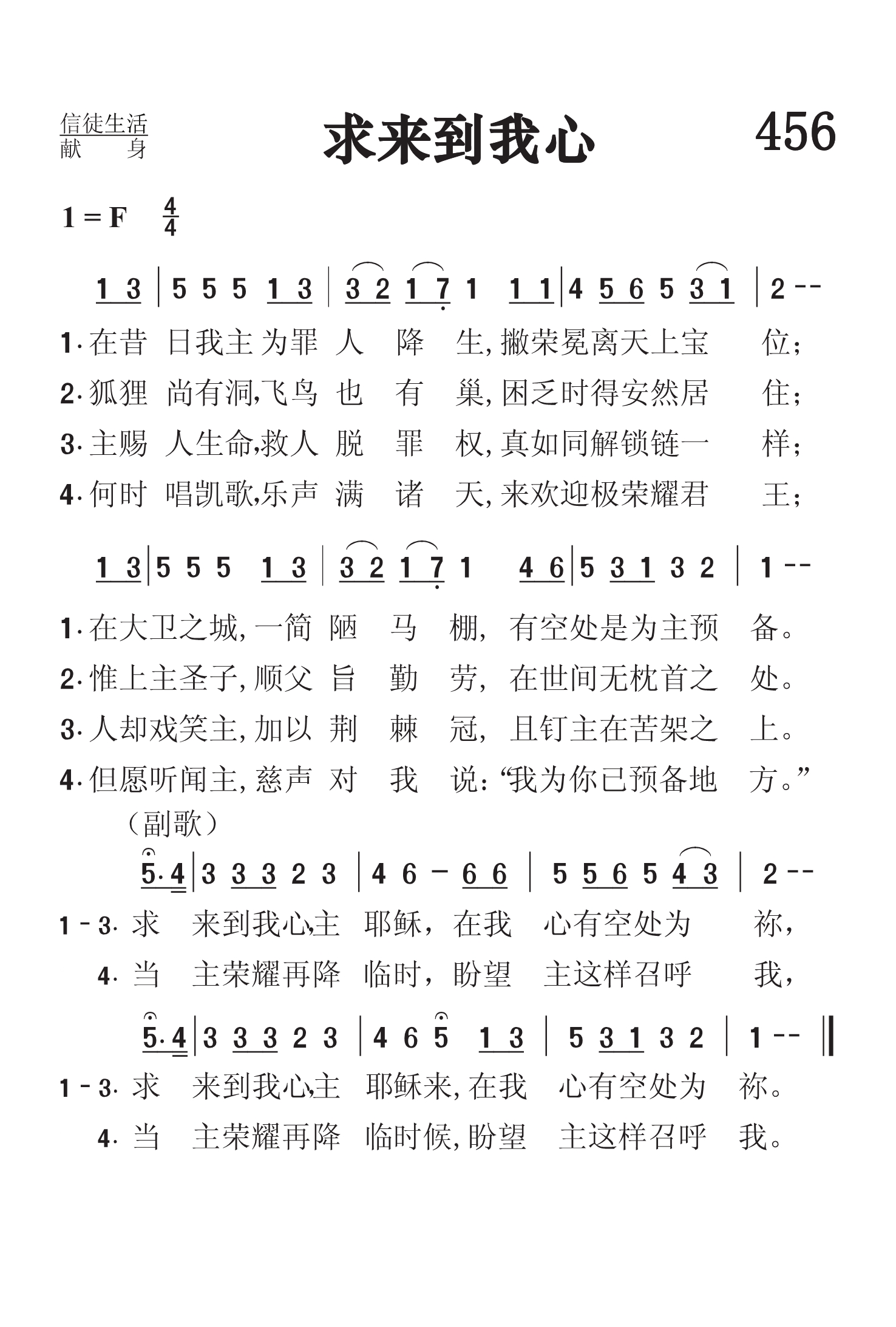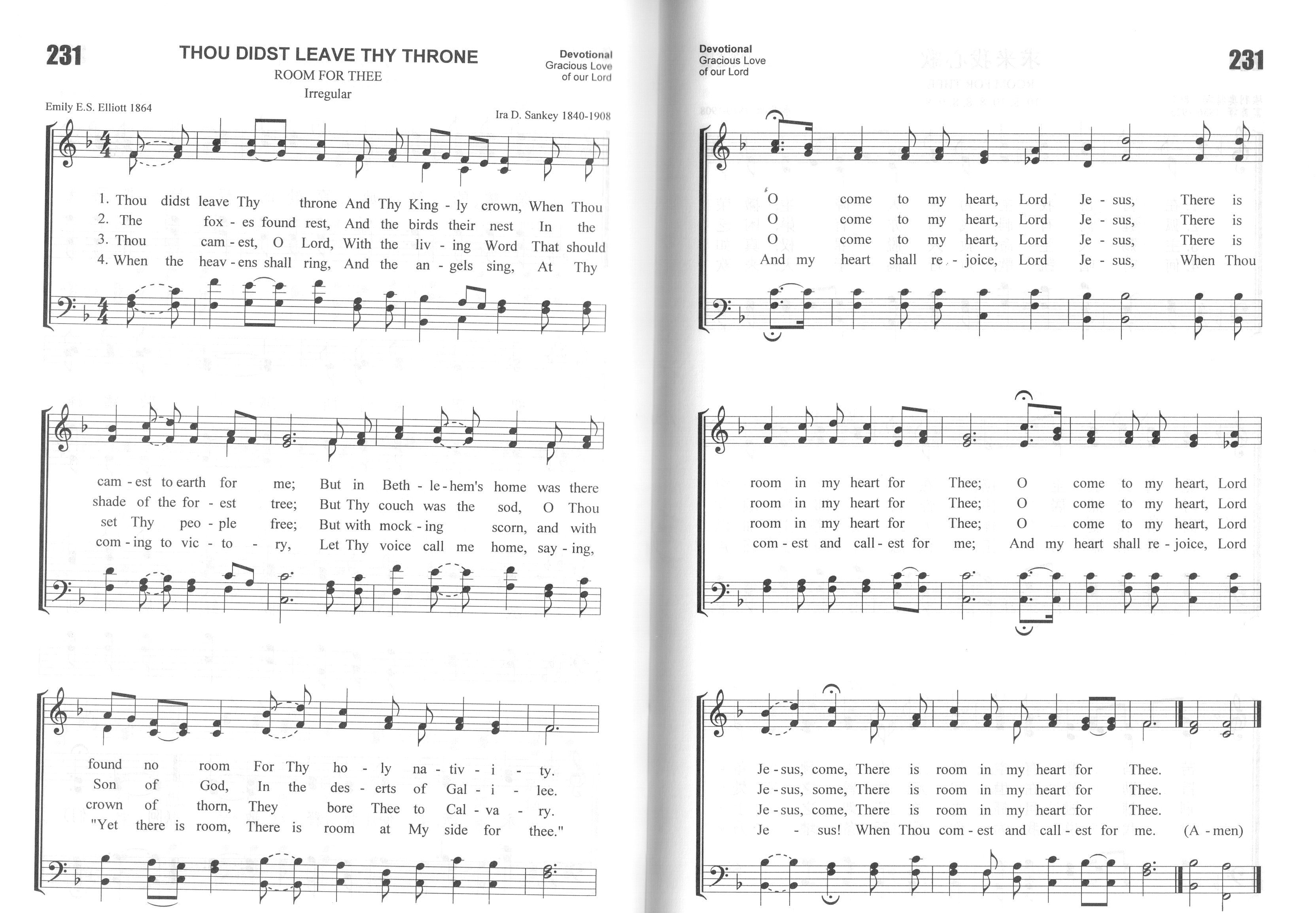 第456首求主来我心 Thou Didst Leave Thy Throne 埃利奥特(Emily E.S.Elliott,1836,7,22-1897,8,3)作词(1864年),桑基(Ira D.Sankey,1840-1908)作曲 在昔日我主为罪人降生,撇荣冕离天上宝位; 在大卫之城.一简陋马棚,有空处是为主预备。 狐狸尚有洞,飞鸟也有巢,困乏时得安然居住; 惟上主圣子.顺父旨奔劳,在世间无枕首之处。 3主赐人生命,救人脱罪权,真如同解锁链一样; 人却戏笑主.加以荆棘冠,且钉主在苦架之上。 求来到我心主耶稣,在我心有空处为祢, 求来到我心主耶稣来,在我心有空处为祢。 4何时唱凯歌,乐声满诸天,来欢迎极荣耀君王; 但愿听闻主,慈声对我说:我为你已预备地方。 当主荣耀再降临时,盼望主这样召呼我, 当主荣耀再降临时候.盼望主这样召呼我。 词作者埃伊莱沙伯.埃利奥特出生于英国一位圣公会的牧师家庭。《赞美诗》505版174首《来就耶稣》的作者夏洛蒂. 埃利奥特是她的姑姑。她曾为自己所在的牧区写了许多赞美诗,并专门为患病和残疾的人作诗48首,收集在诗集《枕头下》里。她还多年担任教会少年布道团杂志的编辑。 这首广为传唱的圣诞诗歌是她为她父亲供职的圣马可唱诗班而写的。先印成单张,后发表在她所编辑的《成圣与信仰之歌》中。桑基为其所配的曲调更为它增光生色。 桑基生于美国宾夕法尼亚州,自幼参加教会活动。17岁时,他的父亲说:“我看这孩子将来除了每天在腋下夹着一本赞美诗到处歌唱之外,不会找别的工作。”的确,他经常在教会的主日学中教唱赞美诗,后来果然成为一位世界著名的福音圣诗歌唱家。他曾担任宾夕法尼亚州青年会的总干事。为建造青年会会址,他募集了4万美元。后来他与慕迪(Moody)同工,在布道会上教唱福音诗歌,也曾编辑并创作过许多首赞美诗。他曾经将他的作品编辑好,准备出版,但一次失火将他的原稿烧毁。1906年他眼睛失明后,还出版了一本《我的生平及福音赞美诗的故事》。在书中说:“我不是一个音乐家,也不是一个歌唱家,我从来没有学过声乐,也没有受过艺术教育,但我对所唱诗歌的每一句和每一字都深有体验。我每唱一首诗都必须把它唱到每一个听众的心里。。我常感到好的旋律易找,但好的歌词却不易找。” 桑基一生创作了几十首福音赞美诗,其中三十首至今仍在教会的聚会中传唱。