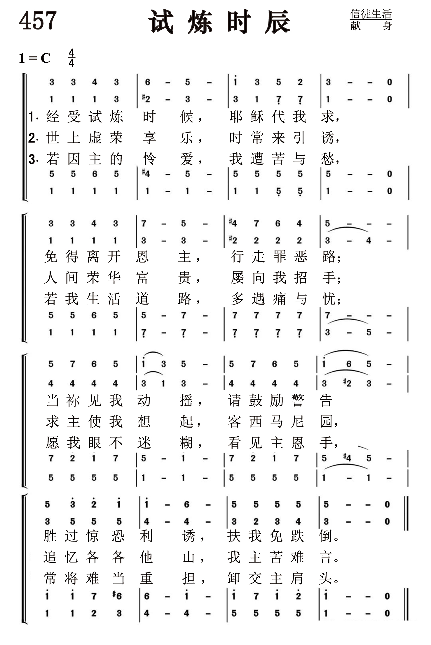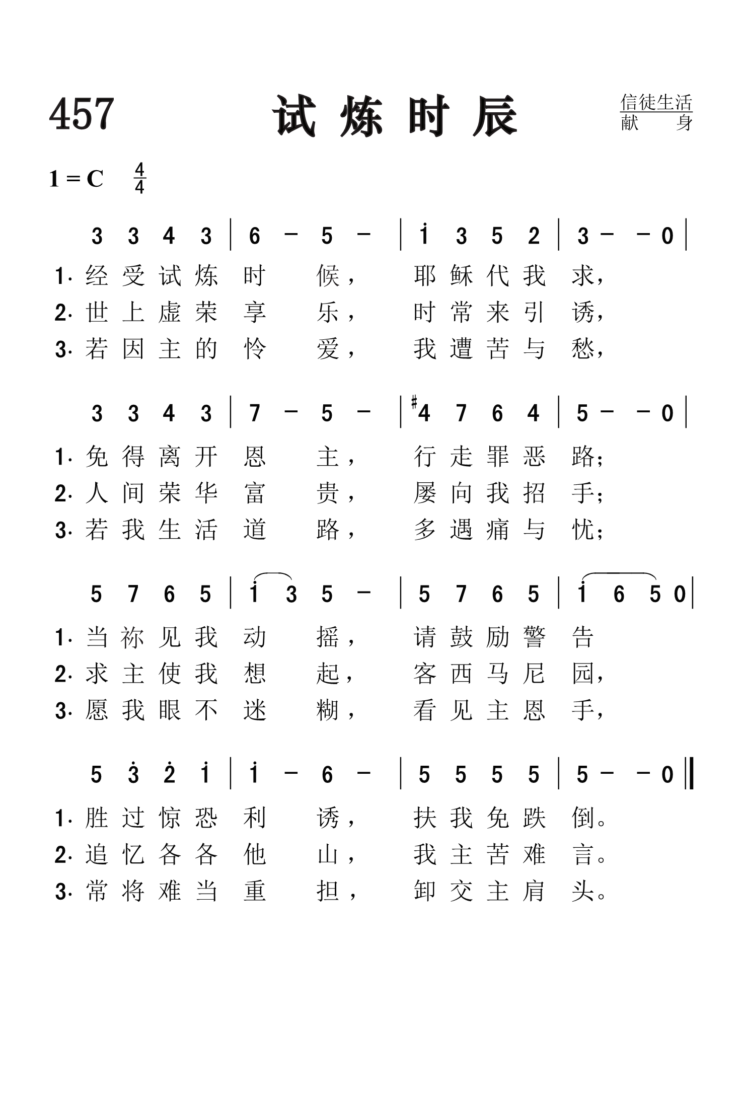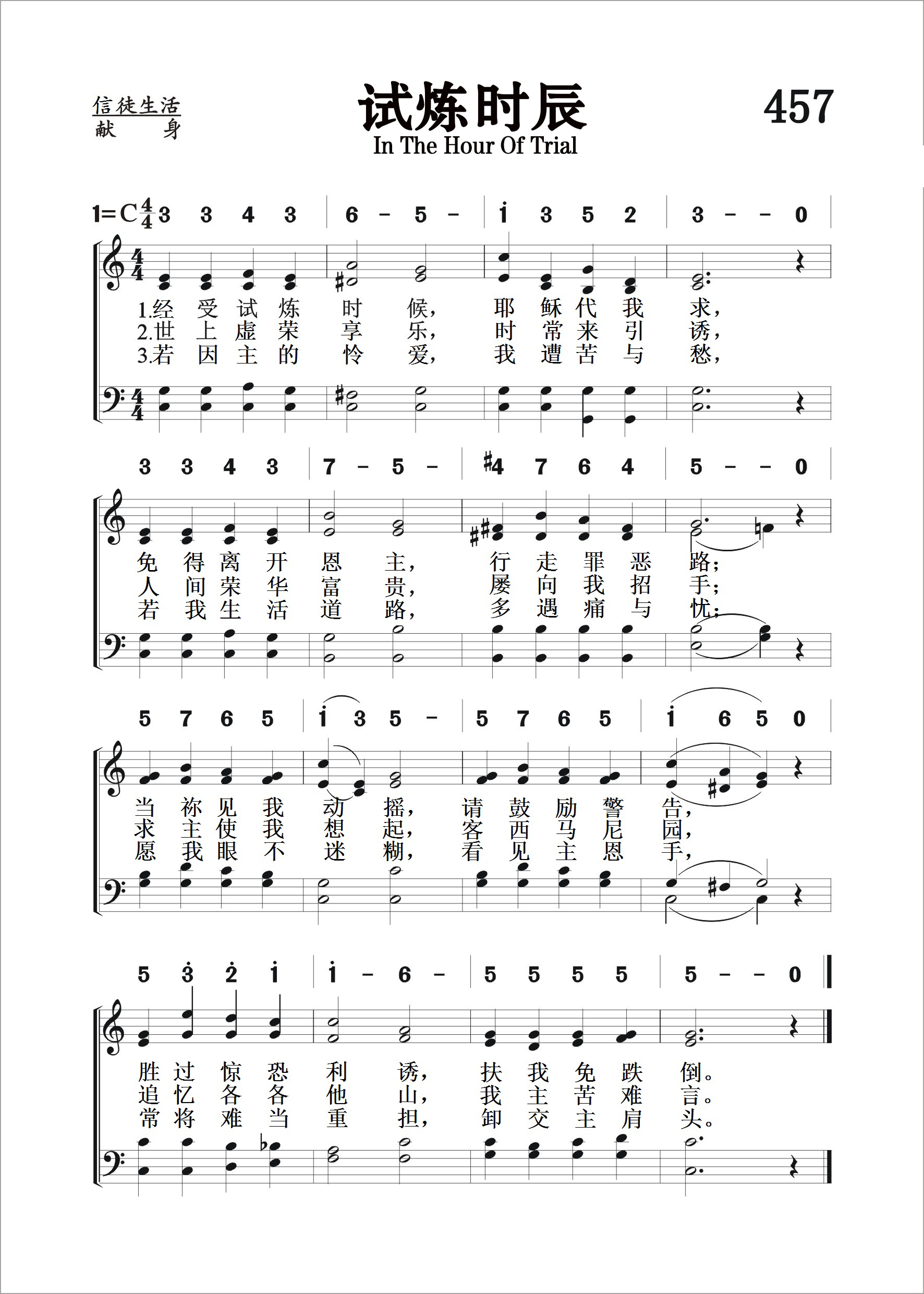 第457首 试炼时辰In the Hour of Trial J.蒙哥马利 作词(1834年) S.莱恩 作曲(1879年) 经受试炼时候,耶稣代我求, 免得离开恩主,行走罪恶路; 胜过惊恐利诱,扶我免跌倒。 世上虚荣享乐,时常来引诱, 人间荣华富贵,屡向我招手; 求主使我想起客西马尼园, 追忆各各他山,我主苦难言。 若因主的怜爱,我遭苦与愁, 若我生活道路,多遇痛与忧; 愿我眼不迷糊,看见主恩手, 常将难当重担,卸交主肩头。 词作家J.蒙哥马利1771年11月4日出生于英国苏格兰。他的父亲是摩拉维亚兄弟会的牧师。夫妻二人被派往西印度群岛开展圣工,先后在传道的岗位上英年早逝。蒙哥马利在贫寒的环境中长大,12岁就失学到面包房当学徒。但他酷爱文学,勤奋自学,终于成为《谢菲尔德记事报》的主编。他在这个岗位上工作了三十一年,主持正义,刚直不阿,敢于如实报导真情,旗帜鲜明地抨击贩卖黑人等社会弊端,成为社会改革的旗手。他虽然遭到各方权贵的反对,仍坚持真理。他热心支持圣书公会和国外布道的工作,深受广大群众的爱戴。 蒙哥马利发表过十几册诗集和三本赞美诗集,共四百多首。538首《上主是我牧者》,《赞美诗》港版78首《请往客西马尼》和237首《诚心所愿》也是他作词的。他还潜心研究圣诗。1825年出版的《圣诗概论》被认为是第一部同类的重要著作。1854年4月30日,他在睡眠中平安去世。 《试炼时辰》作于1834年10月13日,是他阅读圣书中彼得三次不认主的故事,联系自己曾经有过的失败经历,有感而作。曲作者莱恩(1843,4,7-1903,8,10)内战时曾当过两年兵,在波士顿新英格兰音乐学校学过音乐。当过声乐和弦乐教师,后迁居罗得岛开琴行,长期担任教堂司琴和圣诗班指挥,是一位出色的宗教音乐家。