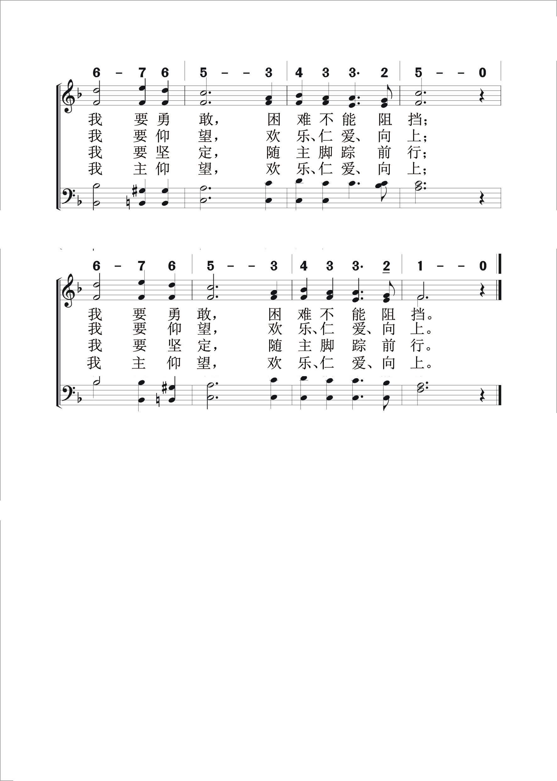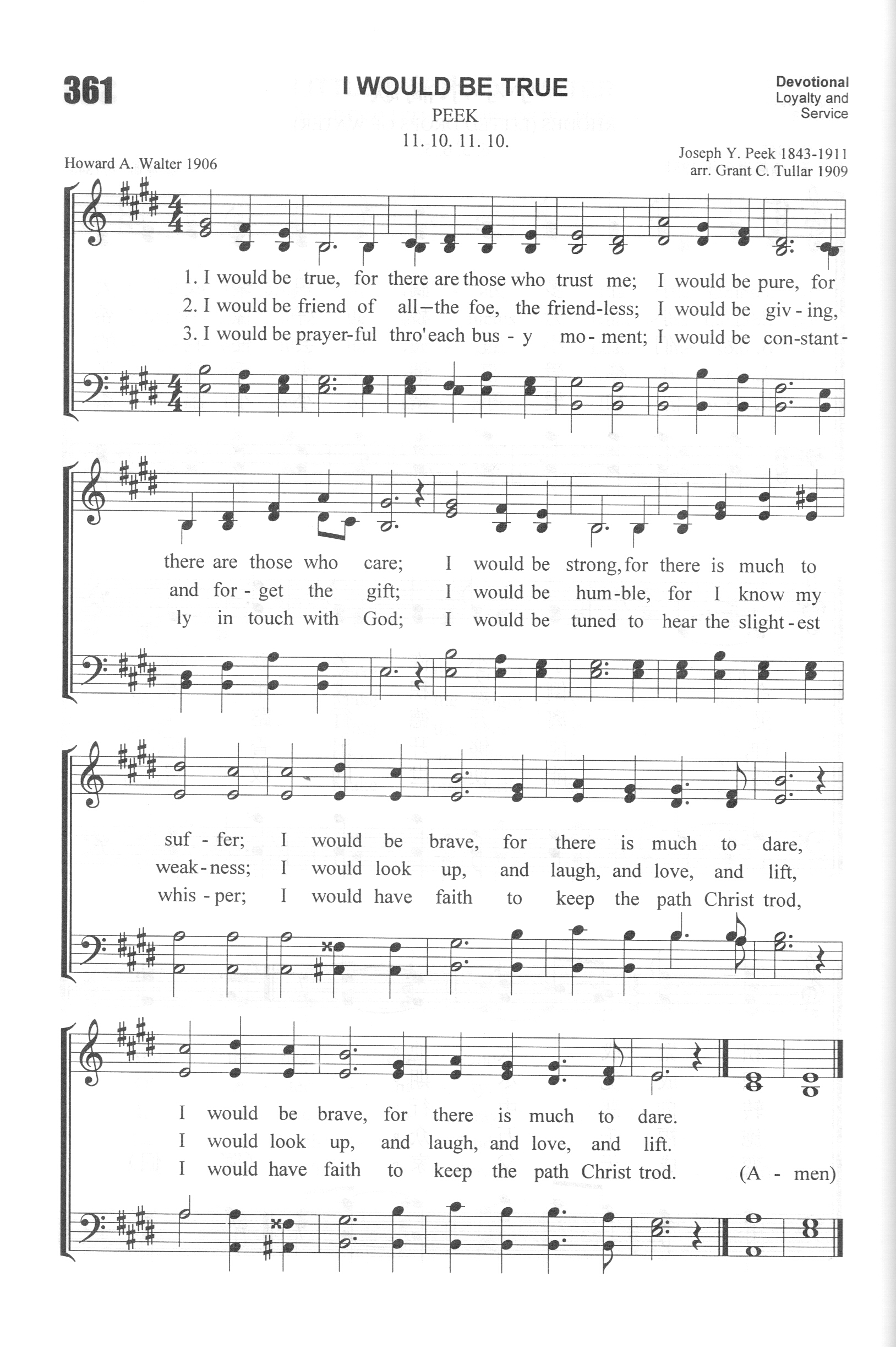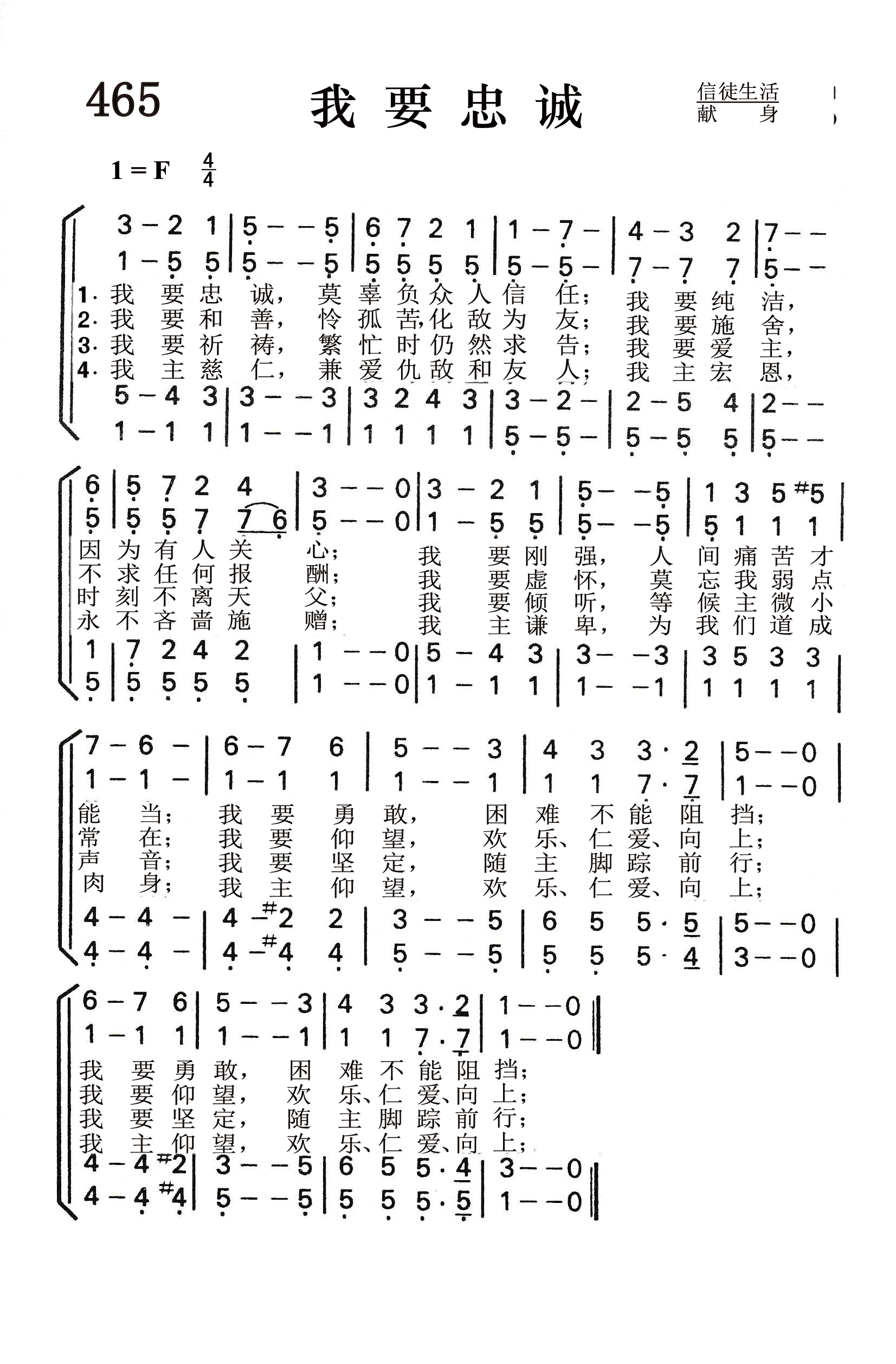 第465首 我要忠诚I Would Be True 沃尔特(H.A.Walter,1883-1918)作词,皮克(J.Y.Peek,1843-1911)作曲 我要忠诚,莫辜负众人信任; 我要纯洁,因为有人关心; 我要刚强,人间痛苦才能当; 我要勇敢,困难不能阻挡。 我 要和善,怜孤 苦, 化敌为友; 我要施舍,不求任何报酬; 我要虚怀,莫忘我弱点常在; 我要仰望,欢乐 仁 爱向上。 我要祈祷,繁忙时仍然求告; 我要爱主,时刻不离 天父; 我要倾听,等候主微 小声音; 我要坚定,随主脚踪前行。 我主慈仁,兼爱仇敌和友人; 我主宏恩,永不吝啬施赠; 我主谦卑,为我们道成肉身; 我主仰望,欢乐 仁爱 向上。 《我要忠诚》表达了青少年勇敢追求,积极向上的心志,是他们所爱唱的诗歌。 词作者沃尔特出生于美国,读大学时就显示出非凡的文学才华,几乎每天都要写一首诗。后去日本韦斯利大学学习一年,继而到美国哈得富德神学院进修,并担任世界青年会干事。他还从事国外布道工作,先后去过日本,中国和印度。1818年病逝。 本诗原来附于沃尔特在日本时写给母亲的信中,题为《我的信念》。当时他才23岁,正处朝气蓬勃,充满理想的年华。母亲读了这首语言质朴而富有生气的诗做以后,甚感欣慰,觉得应该让其它青年人也能分享这样的信念和志向,就把这首诗寄给一家杂志发表了,深受青少年所欢迎,不久以后,就被编入圣诗专集之中。 真诚是本诗的主题。对上帝要真诚,对同胞也要真诚。因为我们的主,曾以最大的诚意对待我们,把我们从万丈深渊里拯救出来。全诗反映了有价值的人生所体现的各个要素,那就是:真诚,洁净,刚强,壮胆,友爱,施赠,虚怀,仰望,祈祷,爱主,静听和坚定。 曲作者皮克出生于美国纽约,从未受过正规的音乐教育,但自幼喜爱小提琴和钢琴。南北战争时曾参军。1881年起对园艺产生兴趣,遂成为一名成功的花匠。他还是美以美会的义工,到处传道。1911年被正式按立为牧师。两个月后去世。 在1909年的一次布道行程中沃尔特与皮克相遇,就送给他这首《我须忠实》。皮克十分喜欢,不知不觉就哼出这个旋律来,由一位元音乐家把它记录下来,并配上和声,取调名为《皮克》。这就是《我要忠诚》曲调的来历。
