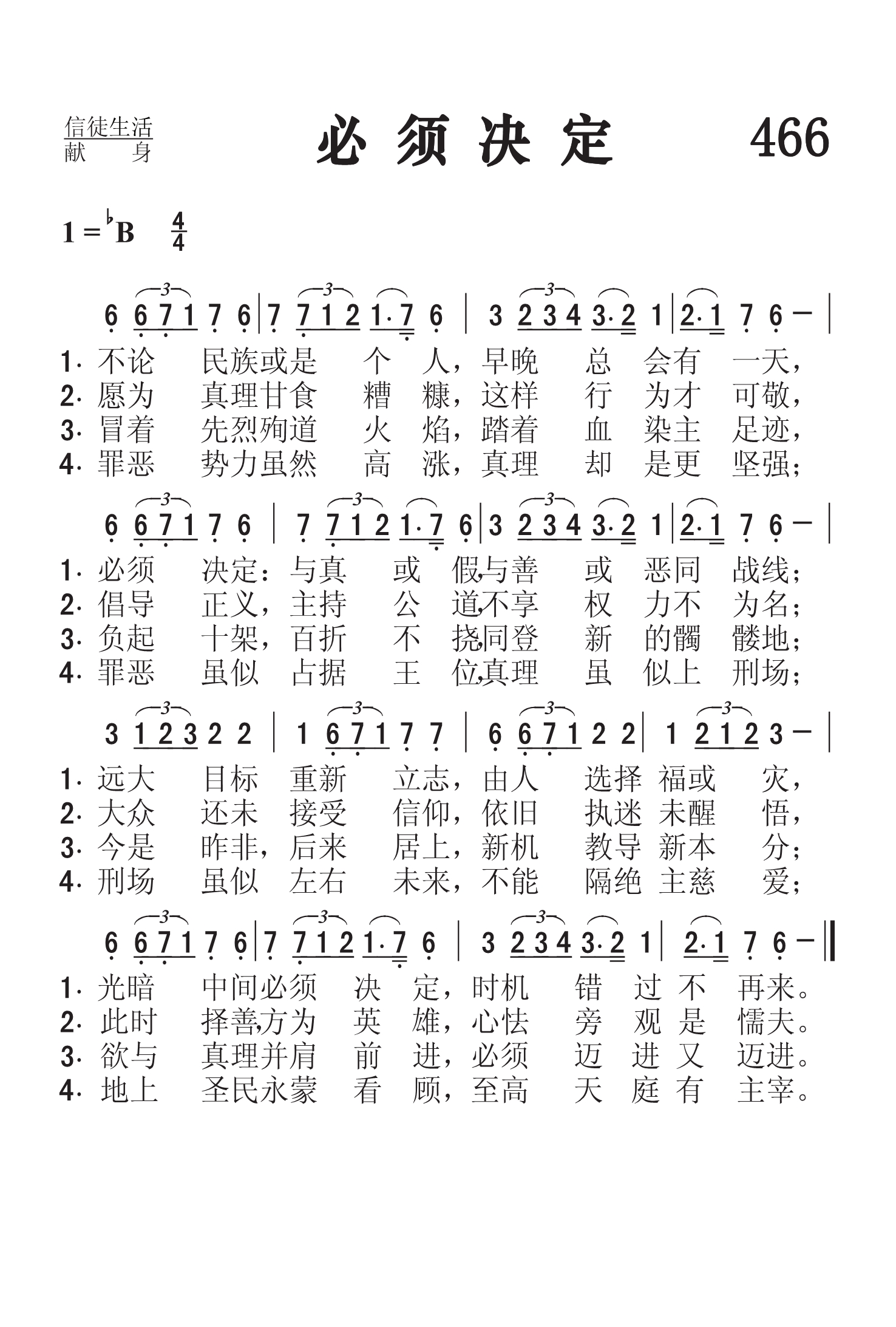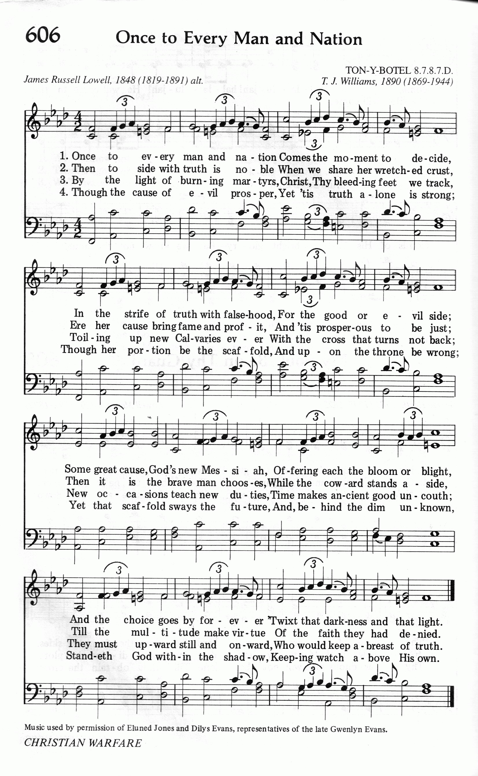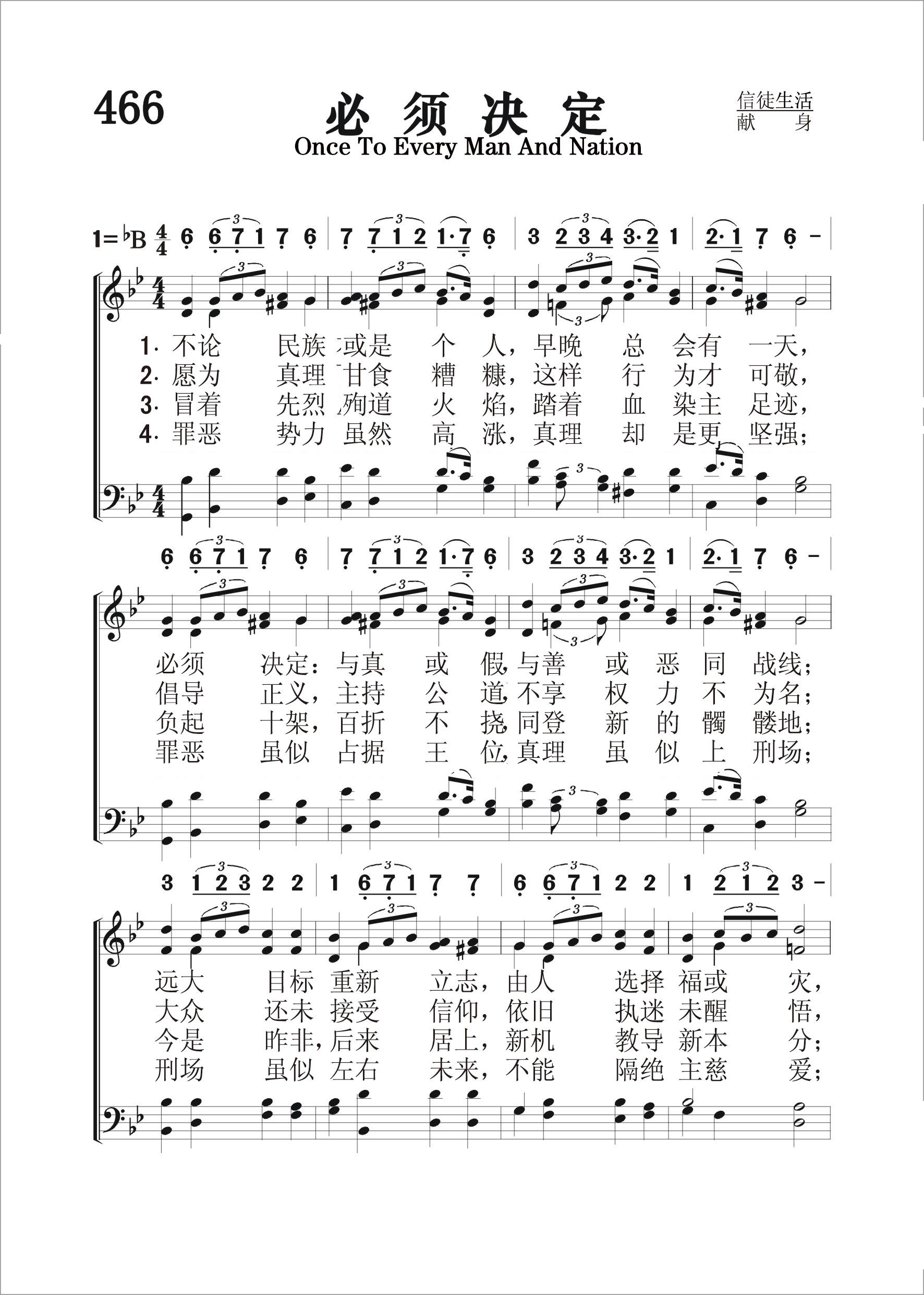 第466首必须决定Once to Every Man and Nation 根据罗威尔(James Russell.Lowell,1819,2,22-1891,8,12)原词(1845年12月)改编,威廉斯(T.J.Williams,1869-1944)作曲(1890年) 不论民族或是男女,早晚总会有一天. 必须决定:或真或假或善或恶皆显现。 远大目标重新立志,由人选择福或灾, 光暗中间必须决定,时机错过不再来。 愿为真理甘食糟糠,这样行为才可敬, 倡导正义;主持公道,不享权力不为名; 大众还未接受信仰,依旧执迷未醒悟, 此时选择正是英雄,心怯旁观是懦夫。 冒着先烈殉道火焰,踏着血染主足迹, 负起十架;百折不回,同登新的髑髅地。 今是昨非,后来居上,新机教导新本分; 欲与真理并肩前进,必须迈进又迈进。 罪恶势力虽然高涨,真理却是更坚强;
