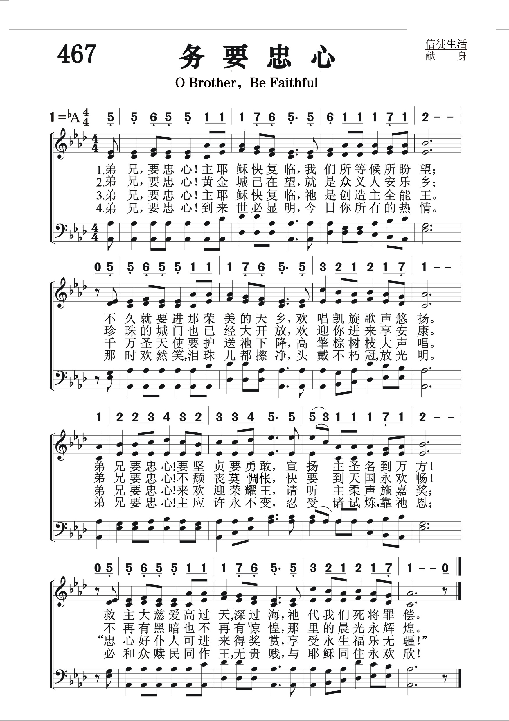 罪恶虽似占据王位,真理虽似上刑场; 刑场虽似左右未来,不能隔绝主慈爱; 地上圣民永蒙看顾,至高天庭有主宰。 词作者罗威尔是美国著名诗人,作家和教授,出生麻萨诸塞州剑桥市,1838年毕业于哈佛大学法律专业。1855年起任纯文学和现代语言学教授。1857-1862年任《大西洋月刊》主编。1863-1872年与人合办《北美通讯》。1877-1880年任美国驻西班牙公使。1880-1885年任驻英国大使。他富有文学才华和爱国热情,强烈反对奴隶制和墨西哥战争。他的若干诗作被改编成圣诗。 《必须决定》原是罗威尔为抗议墨西哥战争而写的一首诗,十八节各五行,每行15个音节,标题为《现代危机》。后经英国公理会圣诗学者霍德改编成赞美诗。 曲作者威廉斯出生于英国威尔士,跟从名师伊文思学习音乐,生前当然教堂司琴和唱诗班指挥。