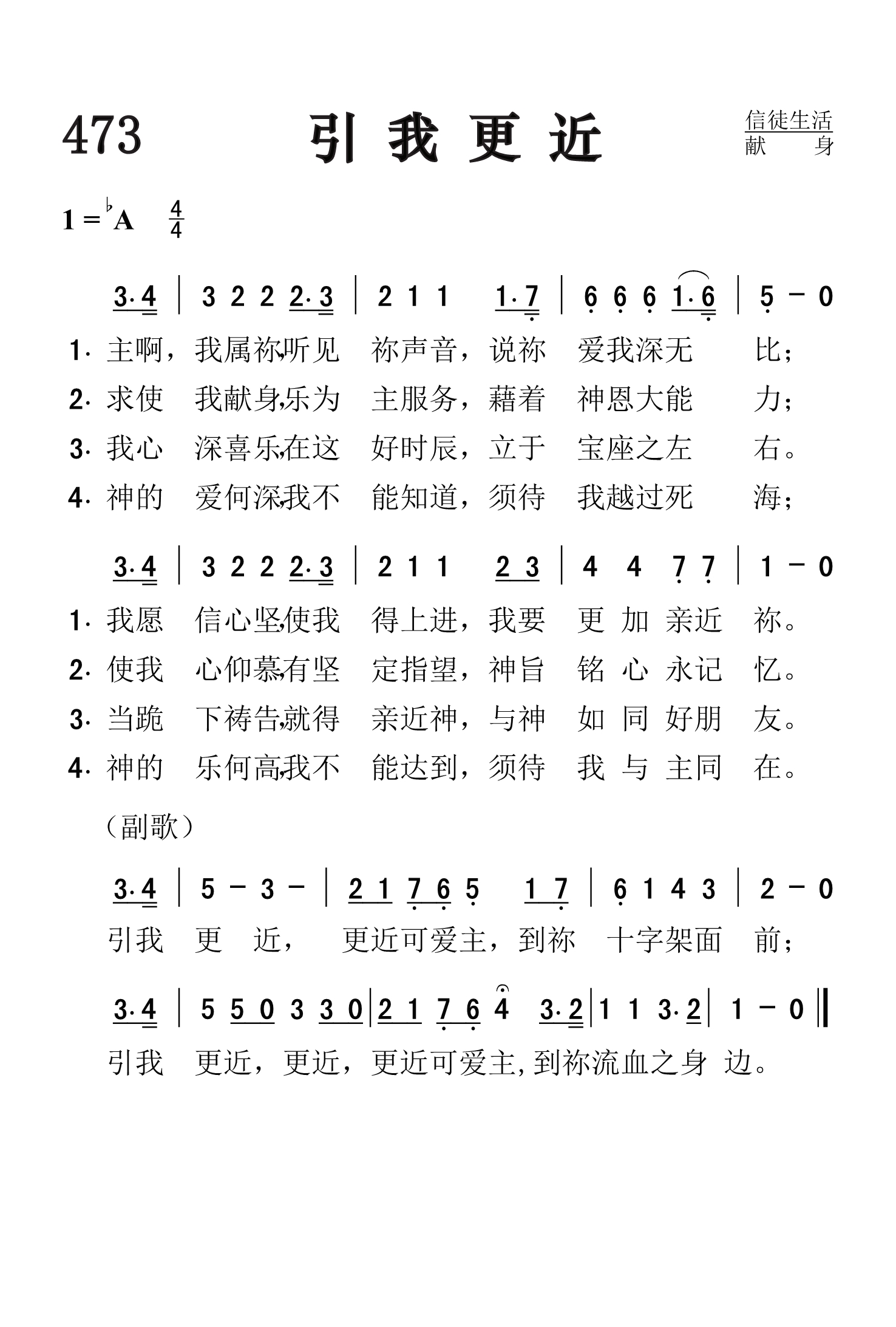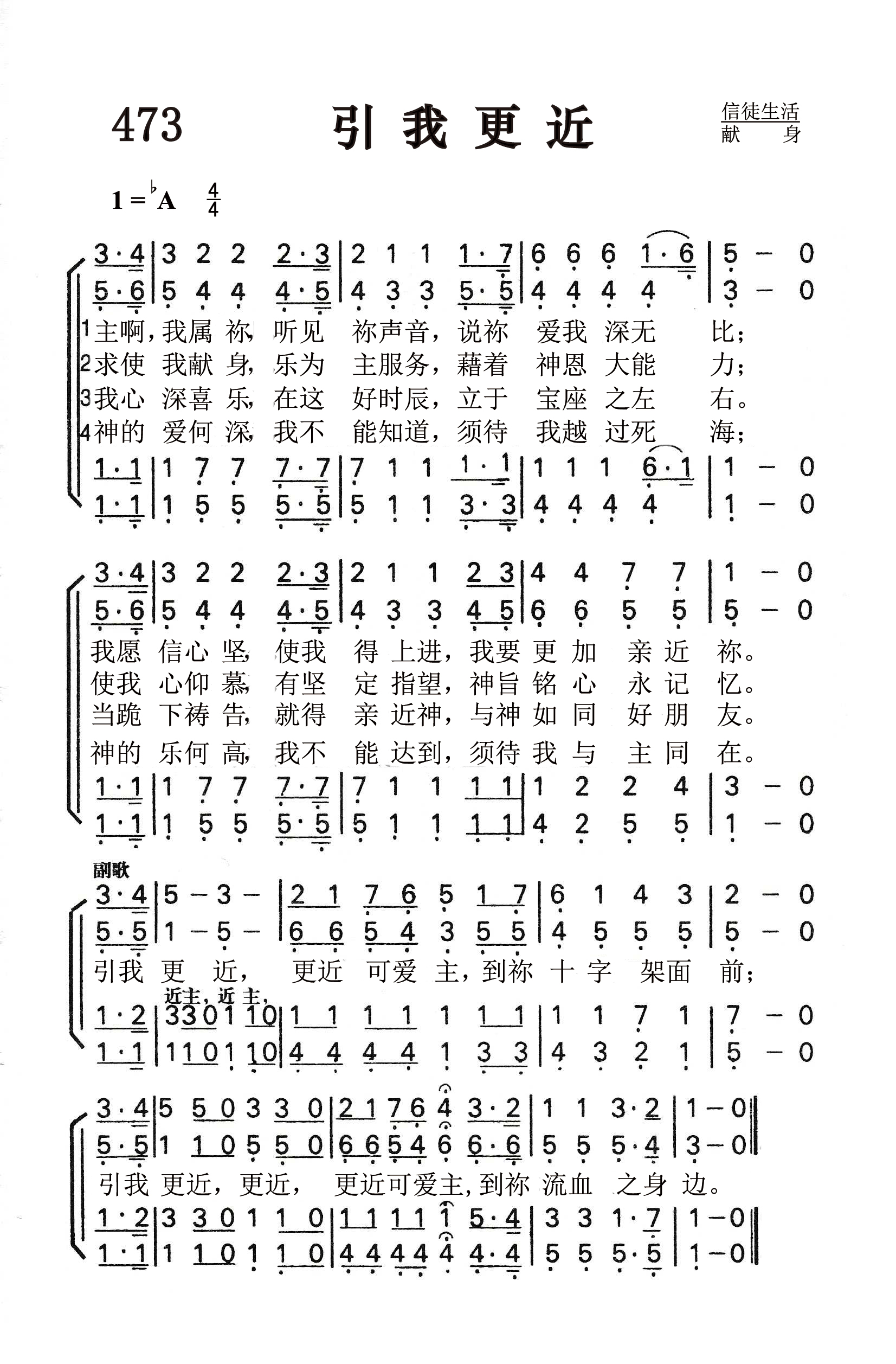 第473首引我更近Draw Me Nearer 克罗斯比(1820-1915)作词,多恩(William H.Doane,1832,2,3-1915,12,23)作曲 主啊我属祢听见祢声音,说祢爱我深无比。 我愿信心坚,使我得上进,我要更加亲近祢。 求使我献身,乐为主服务,藉着主恩大能力。 使我心仰慕,有坚定指望,神旨铭心永记忆。 我心深喜乐,在这好时辰,立于宝座之左右。 当跪下祷告,就得亲近神,与神如同好朋友。 神的爱何深,我不能知道,须待我越过死海; 神的乐何高,我不能达到,须待我与主同在。 引我更近,更近可爱主.到祢十字架面前。 引我更近,更近,更近可爱主,到祢流血之身边。 “良人属我,我也属他”(歌2:16)。 有一次,盲诗人克罗斯比来到多恩家作客。他们一起讨论了“信徒应当怎样与上帝亲近”的问题。当天晚上克罗斯比心蒙恩感,就根据来10:22“我们心中天良的亏欠已经洒去,身体用清水洗净了,就当存着诚心和充足的信心来到上帝面前”,写成了这首《引我更近》。 这首诗歌的第一节明确了我们是属于主的,可经常与主亲近。第二节说到我们当归主为圣,专为主用。第三节讲到属主的人应当时常祷告,以及与主相交的甘甜与喜乐。最后一节则阐述主爱深广,难以测透和述说,直到安息主怀时才能明白。这是信徒追求属灵生长的进程。 多恩特为本诗谱写了题为《我属于主》的曲调。1895年发表在他与劳里牧师合编的《主日学圣诗集》中,然后传唱了开来。 词作者克罗斯比是美国才华出众,负有盛名的福音女诗人。她出生六个月时因庸医,误诊而双目失明。15岁时她就读于纽约最早的一所盲童学校。1847-1858年,她留在该校教授英语语法,修辞学,罗马史和美国历史。她少年时代就开始写诗,24岁时出版了《盲女与她的诗》,引起美国文坛的注意。1850年灵性奋兴的经验,使她集中全力专写圣诗,后在福音圣诗作曲家和编辑布雷得伯里的鼓励下,立志以创作福音圣诗作为自己的终生事业,于是与纽约一家出版社签订合同,每周写圣诗三首,结果写了5929首。此外,她还为布利斯写525首,为桑基写237首,为劳里写219首,为多恩写1500首。她一生共写了8440首圣诗,堪称为最多产的圣诗作家。 曲作者霍华德多恩是富有才华的音乐家,克罗斯比的多年合作者。他出生于美国康涅狄格州普理斯顿市,14岁就带领唱诗班,青年时代与他父亲经营布店,以后转任机器厂厂商。因他服务态度很好,受到市民的欢迎,曾被选为市政委员。他业余为福音圣诗谱曲达二千多首。其中有不少经典之作。