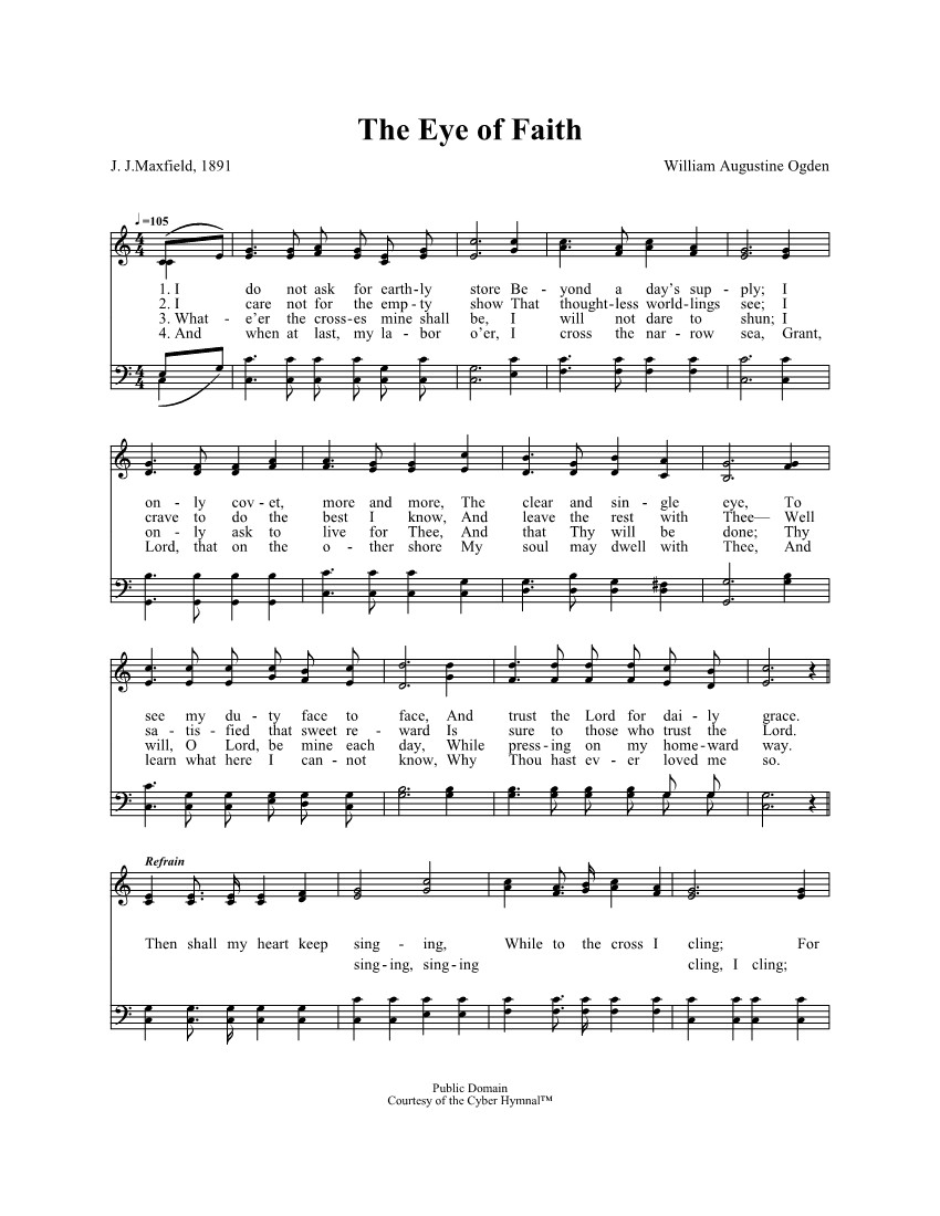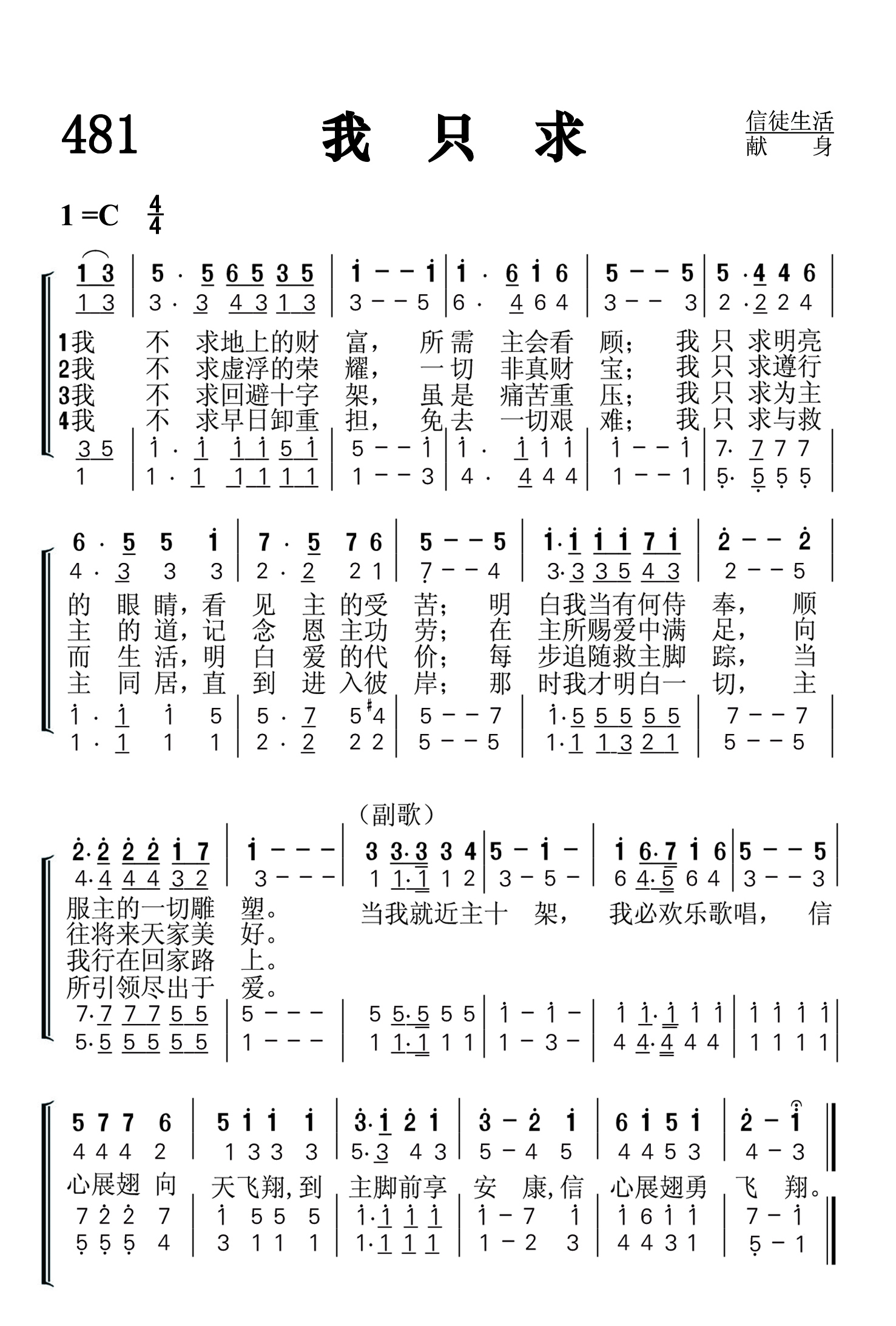 第481首 我只求Then shall My Heart Keep Sing! (桑基《圣诗与独唱》新编44首) 马克斯菲尔德(J.J.Maxfield,1801-1900年)作词,奥格登(Willam A.Ogden,1841,10,10-1897,10,14)作曲,赵典仁、吴涤申合译 我不求地上的财富,所需主会看顾; 我只求明亮的眼睛,看见主的受苦; 明白我当有何侍奉,顺服主的一切雕塑。 我不求虚浮的荣耀,一切非真财宝; 我只求遵行主的道,记念恩主功劳; 在主所赐爱中满足,向往将来天家美好。 我不求回避十字架,虽是痛苦重压; 我只求为主而生活,明白爱的代价; 每步追随救主脚踪,让我行在天家路上。 我不求早日卸重担,免去一切艰难; 我只求与救主同居,直到进入彼岸; 那时我才明白一切,主所引领尽出于爱。 当我就近主十架,我必欢乐歌唱, 信心展翅向天飞翔,到主脚前享安康, 信心展翅勇飞翔。 词作者马克斯菲尔德生平不详。我们只知道他发表过赞美诗28首。 曲作者奥格登出生于美国俄亥俄州富兰克林县,6岁时随家迁往印地安纳州,8岁进当地音乐学校学习,10岁就熟悉教会音乐,具有惊人的记谱能力。18岁时,他参加了圣诗班。内战爆发后,他投笔从戎,在部队里组织了一个男声合唱团,遐迩闻名。战后他回家继续学习音乐,并开始创作歌曲。1870年,他出版了第一部诗集,很受欢迎,销量达五十万册。除了作曲以外,他还在多家学校任教,并曾担任俄亥俄州多拉多市公立学校的音乐主管。他所创作的许多圣诗歌词和曲谱至今仍被人传唱。