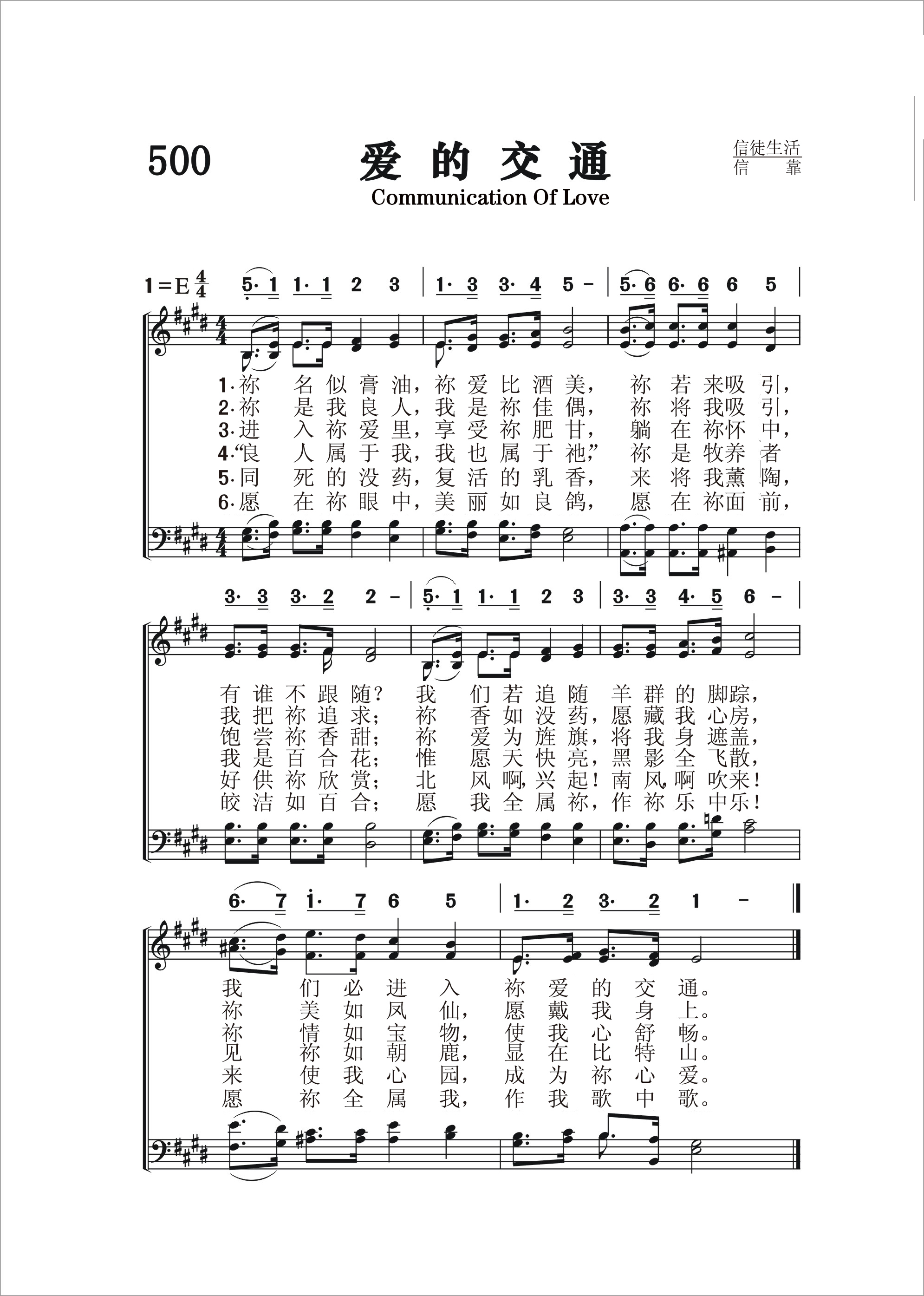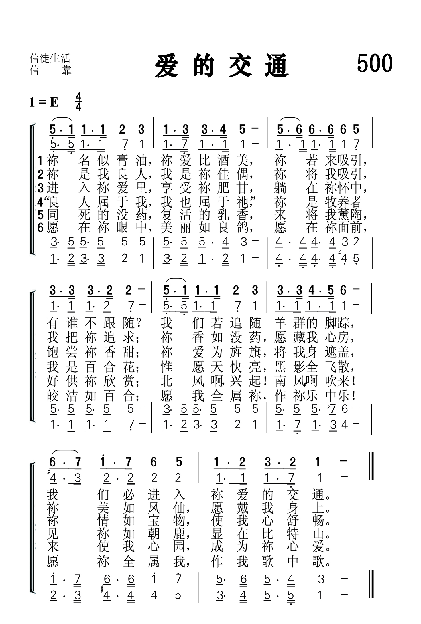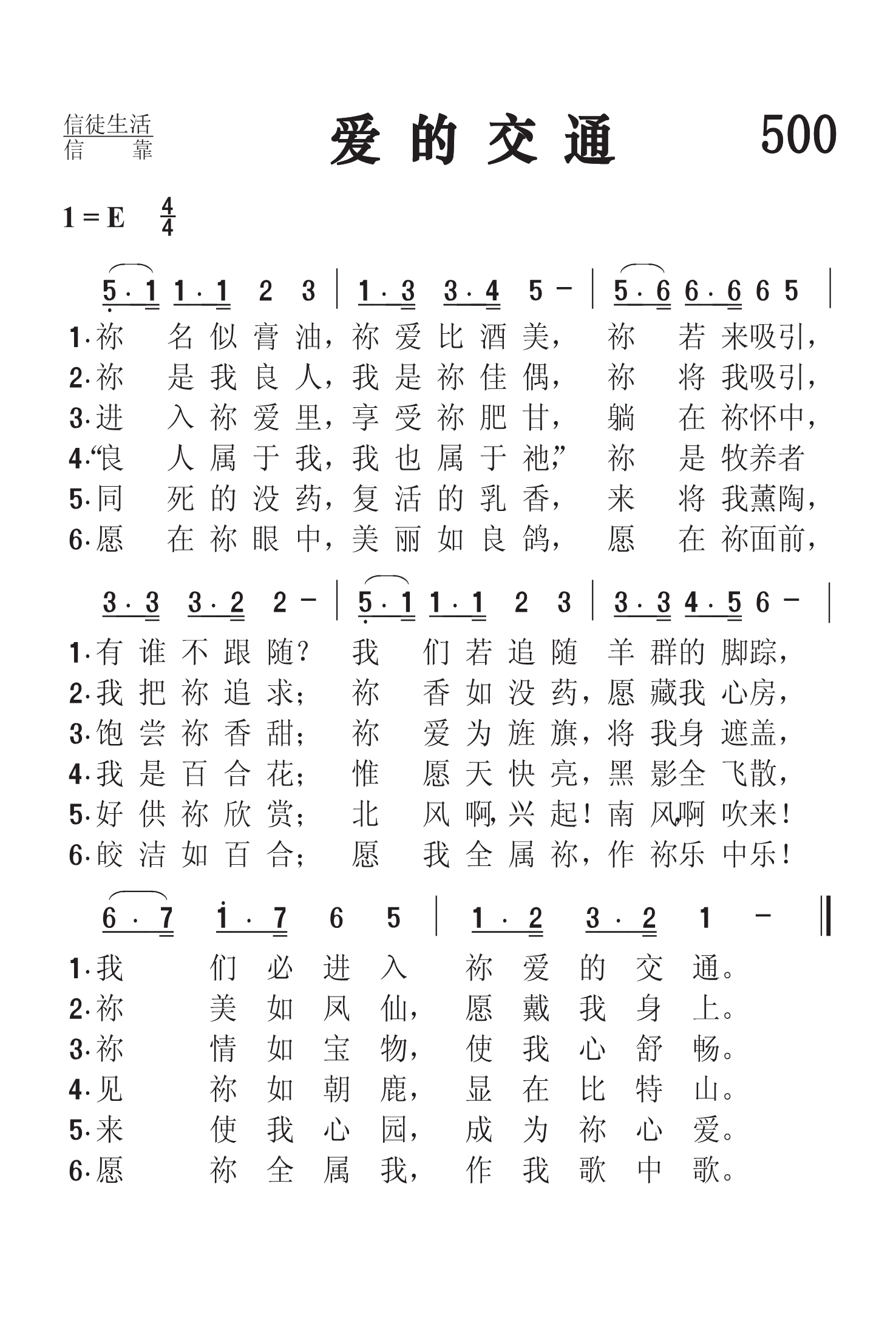 第500首 爱的交通Communication of Love (《颂赞圣诗》第242首,《选本》408首词) 祢名似膏油,祢爱比酒美,祢若来吸引,有谁不跟随 我们若追随羊群的脚踪,我们必进入祢爱的交通。 祢是我良人,我是祢佳偶,祢将我吸引,我把祢追求; 祢香如没药愿藏我心房,祢美如风仙愿戴我身上。 进入祢爱里,享受祢甘美,躺在祢怀中.饱尝祢香甜; 祢爱为旌旗将我身遮盖,祢情如宝物使我心舒畅。 “良人属于我,我也属于祂,”祢是牧养者.我是百合花: 惟愿天快亮黑影全飞散,见祢如朝鹿显在比特山。 安葬的没药,复活的乳香,来将我薰陶, 好供祢欣赏;北风啊兴起南风啊吹来! 来使我园林成为祢心爱。 愿在祢眼中,美丽如良鸽.愿在祢面前.皎洁如百合: 愿我全属祢,作祢乐中乐! 愿祢全属我,作我歌中歌。 这首优美的诗歌用《雅歌》的语言歌颂了信徒与主之间的甜蜜交通。当我们把基督接到内心时,祂就成了我们最好的朋友。在祂的爱里,我们可以享受无比的喜乐与甘甜。这种滋味,只有身临其境,才能深有体会。爱的交通,实在是令人羡慕的。