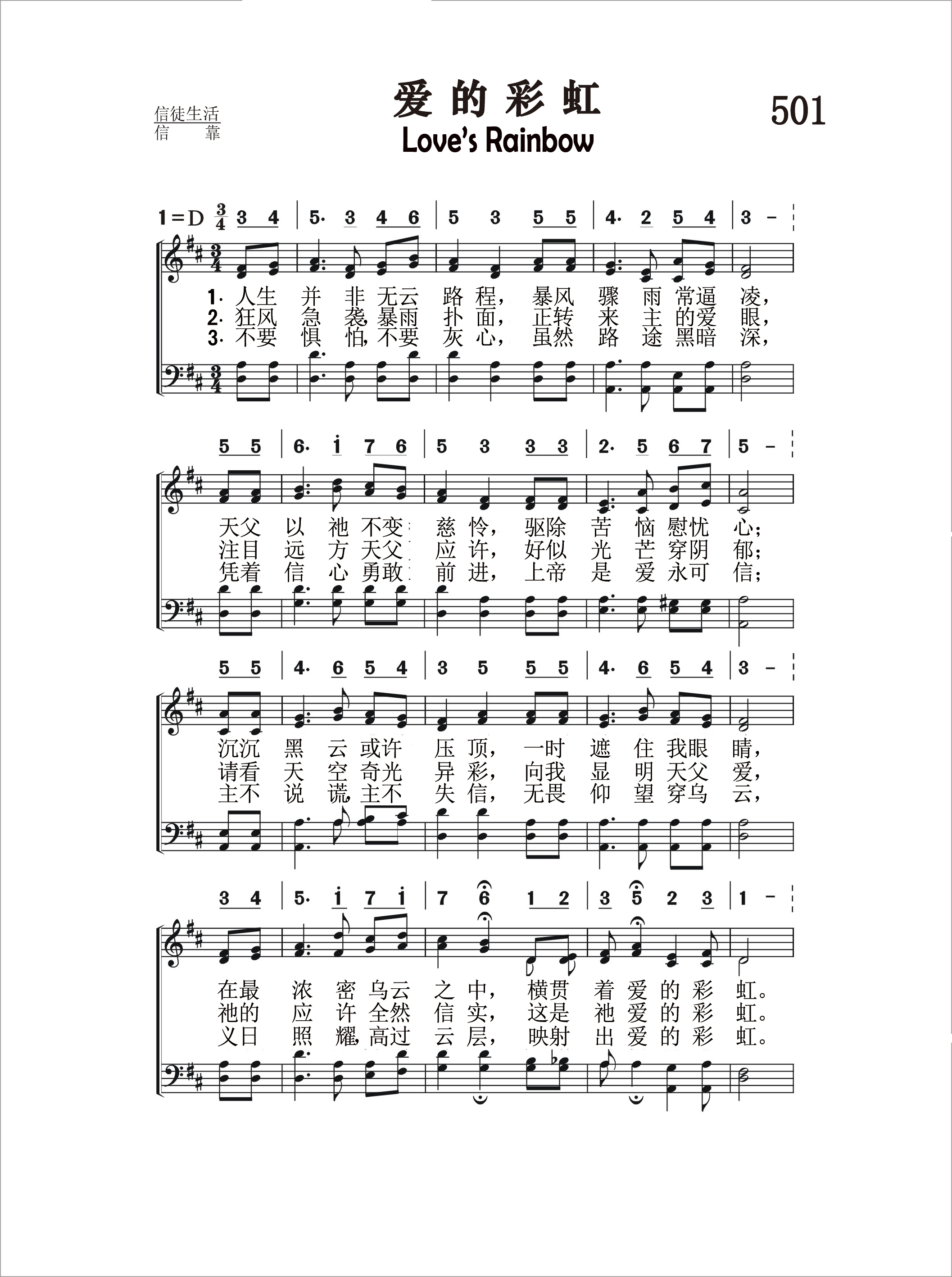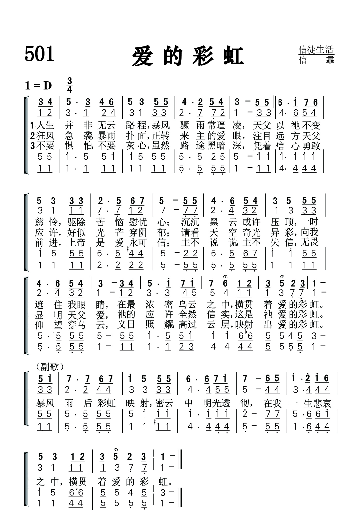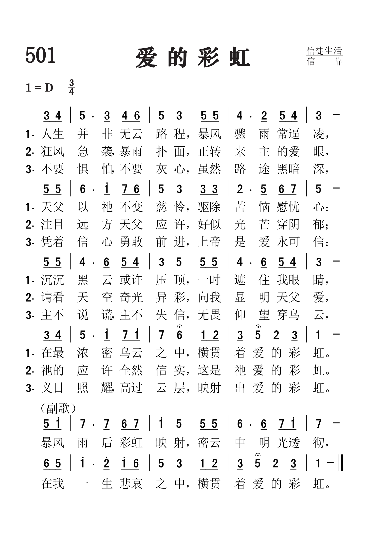 第501首 爱的彩虹 Love’s Rainbow 柯克兰(Flora Kirkland)作词,梅雷迪思(Isaac Hickman Meredith,1872,3,21-1962,11,2)作曲,赵典仁、吴涤申合译 人生并非无云路程,暴风骤雨常逼近, 天父以祂不变慈怜.驱除苦恼慰忧心; 沉沉黑云或许压顶,一时遮住我眼睛, 在最浓密乌云当中,横贯着爱的彩虹。 狂风猛袭暴雨扑面,正传主爱的爱眼, 注目远方天父应许,好似光芒穿阴郁; 请看天空奇光异彩,向我显明天父爱, 祂的应许全然信实,这是祂爱的彩虹。 不要惧怕不要灰心,虽然路途黑暗深, 凭着信心勇敢前进,上帝是爱永可信; 主不说谎主不失信,无畏仰望穿乌云, 公义烈日凌驾乌云,映射出爱的彩虹。 暴风雨后彩虹映射.密云中明光透彻, 在我一生悲哀当中,横贯着爱的彩虹。 曲作者梅雷迪思出生于美国佛罗里达州的奥兰多。他的父亲是小提琴首,母亲是唱诗班成员。他10岁上风琴课,12岁在唱诗班唱女中音声部,13岁接受兄弟的邀请悔改信主。他多年在每周日上午为县监狱的囚犯唱赞美诗。 1891年夏天,梅雷迪思在新泽西州的欧欣格罗夫度假的时候,曼豪尔博士邀请他在布道会上唱诗。不久以后,他自己就开始从事传道工作,并创作福音诗歌。1893年,他与图勒创建了图勒. 梅雷迪思音乐出版社。梅雷迪思共写了一千多首诗歌。第一次世界大战期间,他随基督教青年会在法国服务。战后除了继续音乐出版工作之外,还兼任多家教堂的音乐指导。1962年,他在佛罗里达的奥兰多逝世。