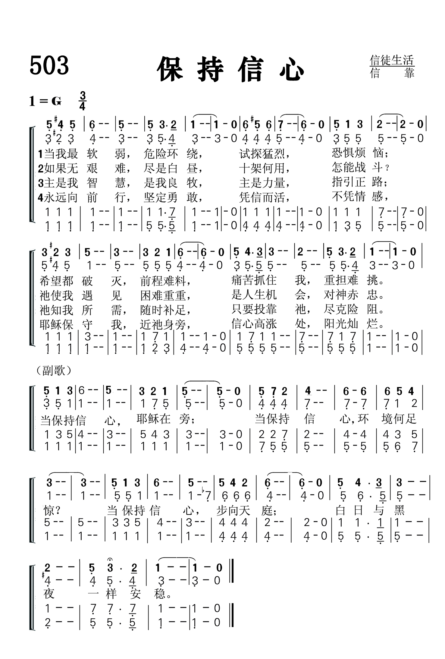 第503首 保持信心 KeepingFaith 《颂赞圣诗》第340首 当我最软弱,危险环绕,试探猛烈,恐惧烦恼; 希望都破灭,前程难料,痛苦抓住我,重担难挑。 如果无艰难,尽是白昼,十架何用,怎能战斗 祂使我遇见,困难重重,是人生机会,对神赤忠。 主是我智慧,是我良牧,主是力量.指引正路; 祂知我所需,随时补足,只要投靠祂,尽克险阻。 永远向前行,坚定勇敢.凭信而活.不凭情感, 耶稣保守我,近祂身旁,信心高涨处,阳光灿烂。 当保持信心,耶稣在旁;当保持信心环境何足惊; 当保持信心,步向天庭;白日与黑夜一样安稳。 这首诗歌教导我们保持信心的必要性和重要性。主所赐的信心在险象环生的境遇中有移山倒海,逆转乾坤的功能。我们需要像孩童依恋父母那样时刻保持对爱我们之主的赤诚信心。这样,不论顺境逆境,不论阳光荫翳,我们都能有内心的平安,稳步迈向荣耀的天庭。