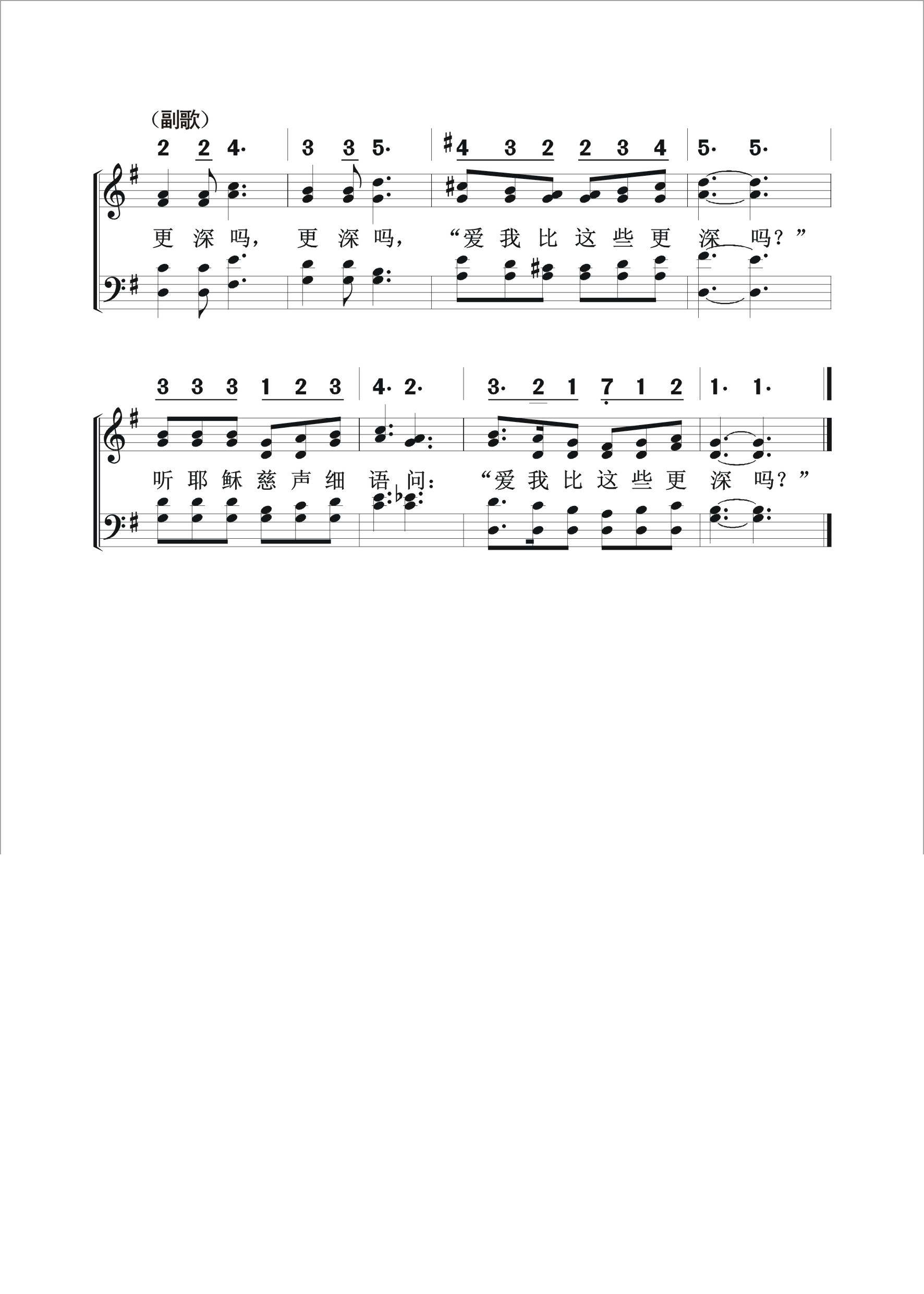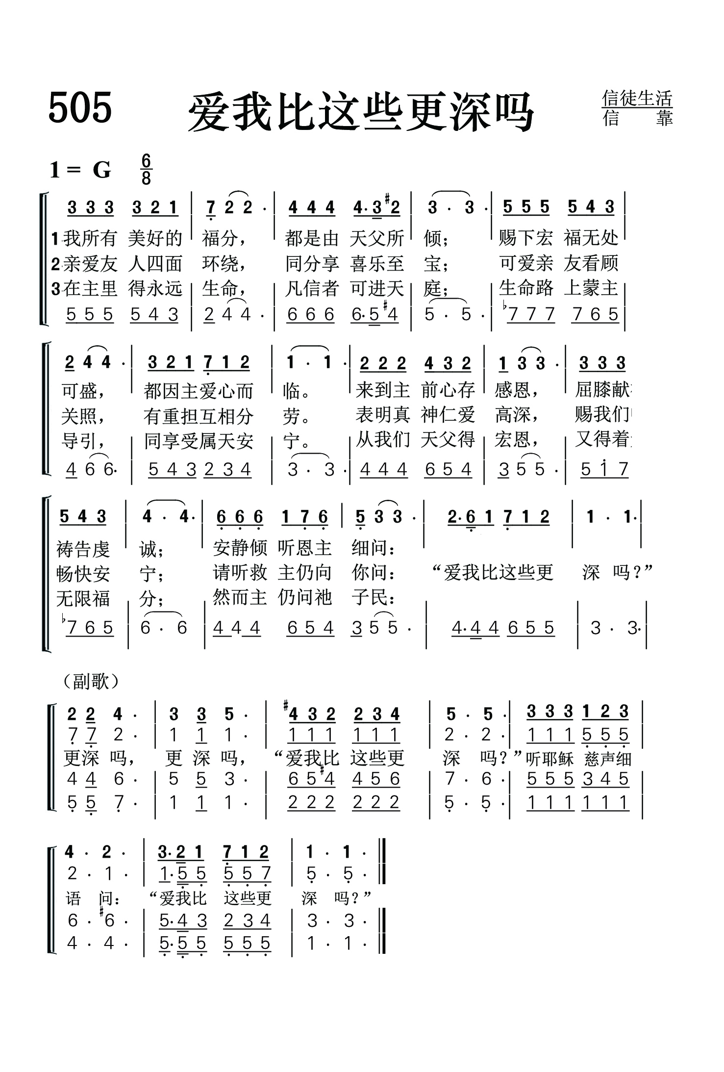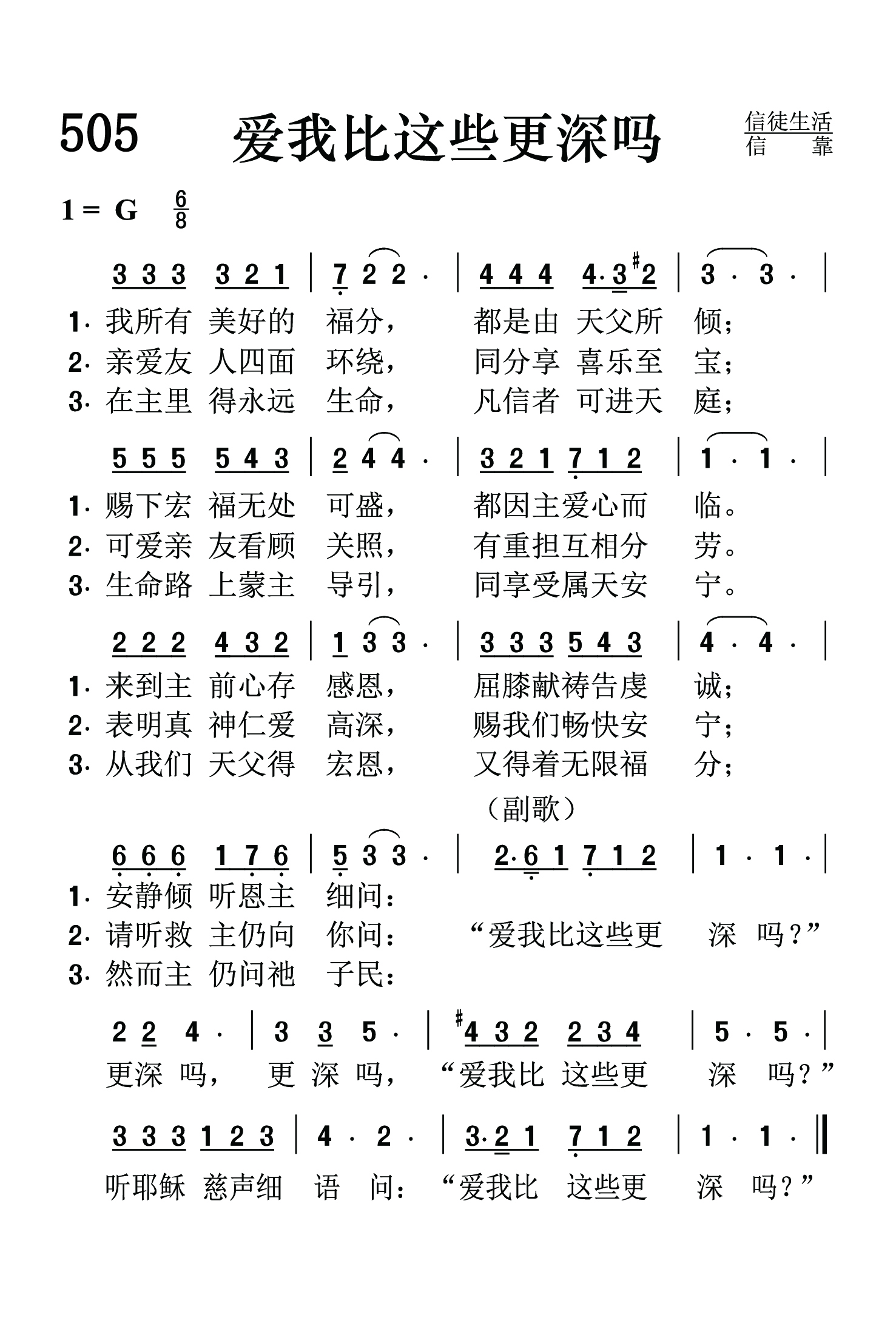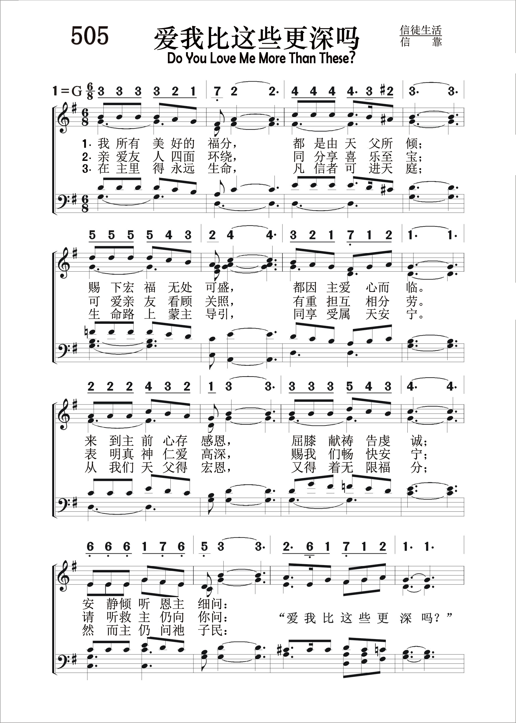 第505首 爱我比这些更深吗?Do You Love Me More Than These? 我们所有美好事物,都是由天父所赐; 倾下福气无处可容,都由主爱心而来。 存感恩心来到主前,虔诚地屈膝祷告: 安静听恩主细语问:“爱我比这些更深吗” 亲爱友人四面环绕,同分享宝贵喜乐; 可爱亲友关怀我们,有重担互相分担。 表明真神仁爱慈悲.赐我们安舒畅快; 请听救主仍向你问:“爱我比这些更深吗” 在主里得永远生命,凡信主者进天庭: 生命路上蒙主引导,享受属天的安宁。 从我们天父得恩赐,又得着无限福气: 然而主仍问祂子民:“爱我比这些更深吗” ”更深吗?更深吗?“爱我比这些更深吗? ”听耶稣慈声细语问:“爱我比这些更深吗” 耶稣在即将辞别门徒,离世归父的时候,曾对西门彼得提出一个发人深省的问题:“你爱我比这些更深吗?”(约21:15)这个问题如今同样也对我们发出。我们每天都在领受主莫大的福气和慈爱的眷顾。我们所缺乏的,是对主更深的爱。这首诗歌将主的话语再三提醒我们,使用我们不要忘记在人生的道路上什么才是最重要的。