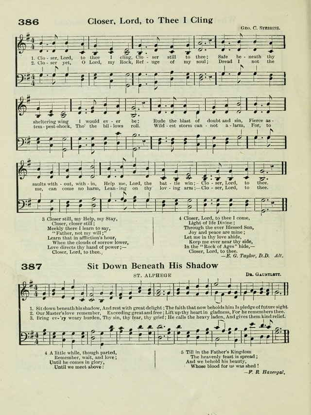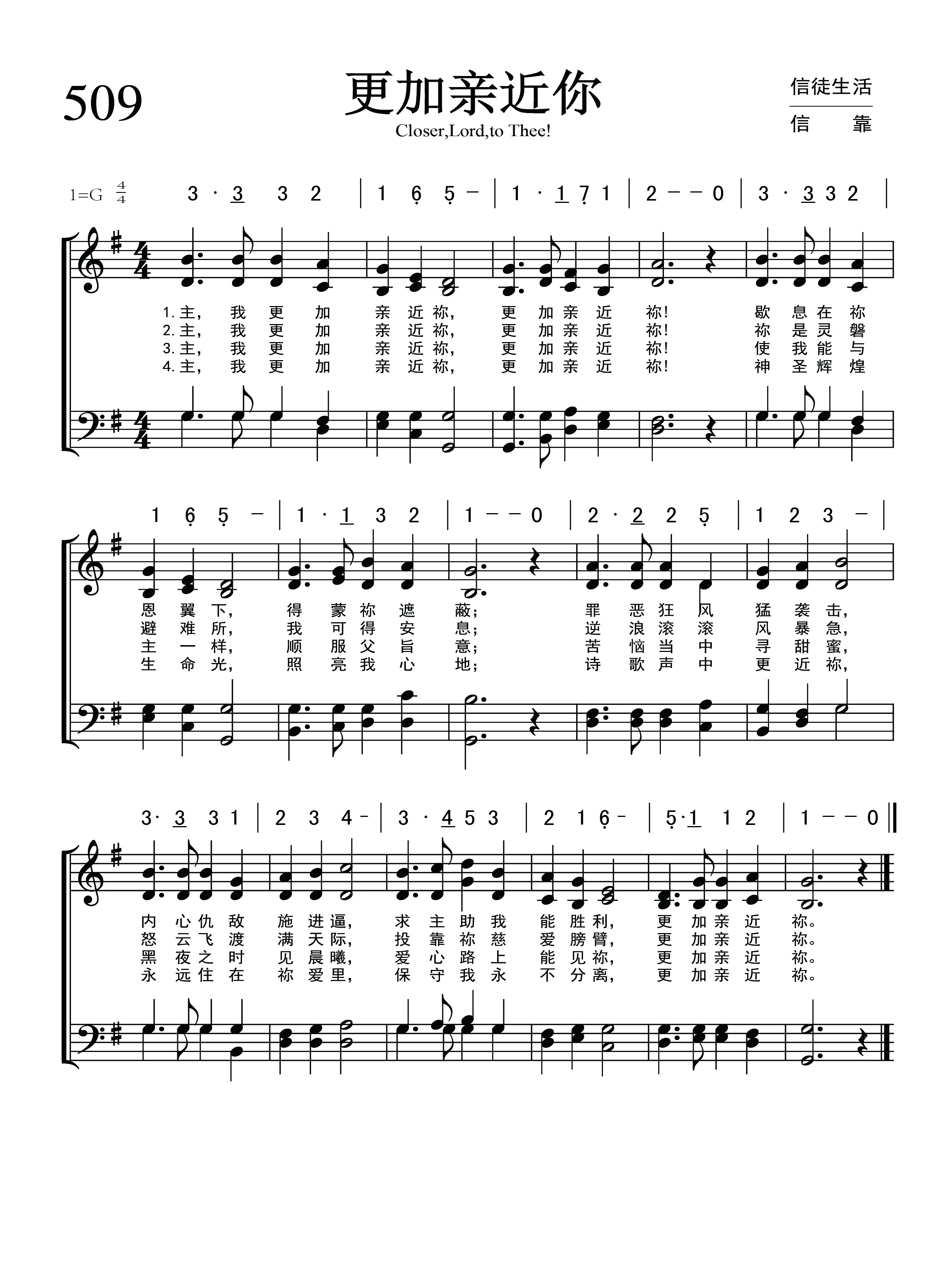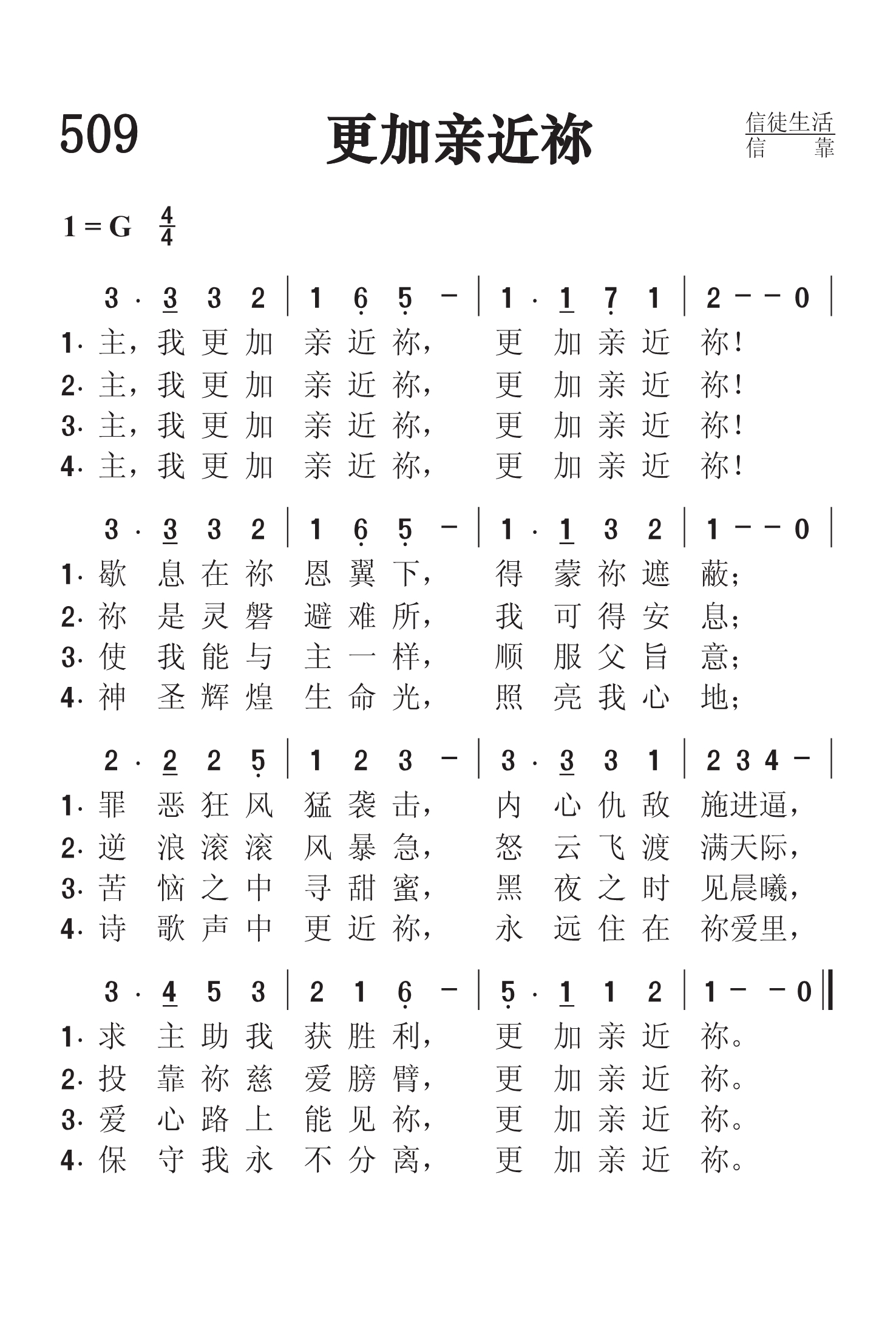 第509首 更加亲近你 Closer,Lord,to Thee! (桑基《圣诗与独唱》558首) 泰勒(E.G.Taylor,1830.11.23-1887.4.10)作词;斯特宾斯(George C.Stebbins,1846,2,26-1945,10,6 )作曲,赵典仁、吴涤申合译 主,我更加亲近祢,更加亲近祢! 歇息在祢恩翼下,得蒙祢遮蔽; 罪恶狂风猛袭击,内心仇敌施进逼, 求主助我能胜利,更加亲近祢。 主,我更加亲近祢,更加亲近祢! 祢是灵磐避难所,我可得安息; 逆浪滚滚风暴急,怒云飞渡满天际, 投靠祢慈爱膀臂,更加亲近祢。 主,我更加亲近祢,更加亲近祢! 使我能与主一样,顺服父旨意; 苦恼当中寻甜蜜,黑夜之时见晨曦, 爱心路上能见祢,更加亲近祢。 主,我更加亲近祢,更加亲近祢! 神圣辉煌生命光,照亮我心地; 诗歌声中更近祢,永远住在祢爱里, 保守我永不分离,更加亲近祢。 词作者泰勒出生于美国费城,1854年毕业于刘易斯堡大学,1856年毕业于罗切斯特神学院,1857至1887年在辛辛那提,芝加哥,新奥尔良,普罗文斯登, 纽瓦克,布法罗等市担任牧师。他为主日学写过大量赞美诗。他的大部分诗歌是他自己谱曲的。 曲作者斯特宾斯出生于美国纽约州的一个乡村,自幼喜爱音乐,13岁即进音乐学校学习,后到布法罗和纽约市继续深造。他23岁到芝加哥一个音乐商店工作,业余担任一个教堂唱诗班的指挥。1876年他随墓迪和桑基的布道团到过英国、印度、巴勒斯坦、埃及等地,以他的歌声为主作见证,并且多半是他自编自唱,收到了良好的效果。后来他将所谱的曲调和诗歌出版发行,使福音诗歌流传各地,备受欢迎。有人称他是福音诗歌的泰斗。他晚年所著《回忆录与福音圣诗的故事》,一方面作自传式的叙述,一方面收集其他福音诗歌作家的生平和故事,成为一部美好的见证。该书至今仍为研究圣诗的重要参考资料。