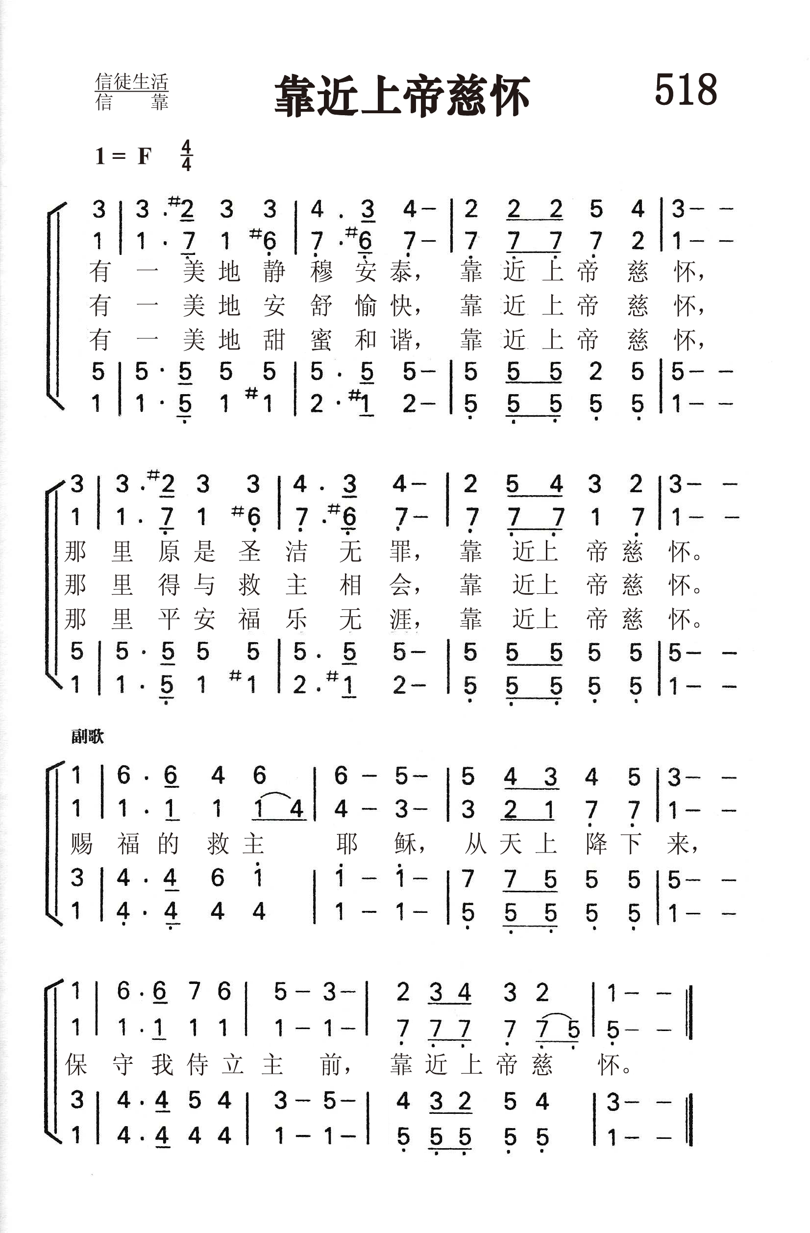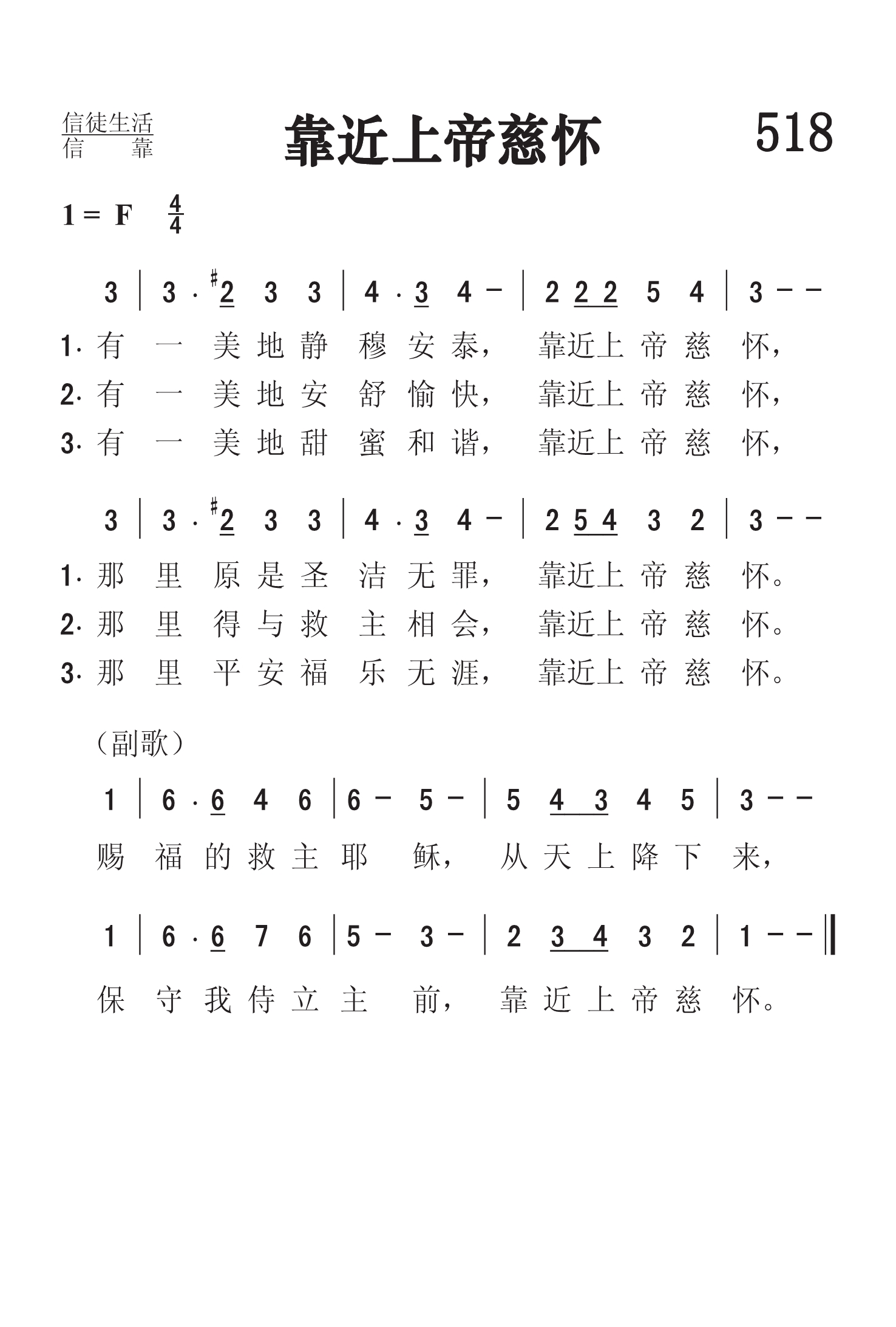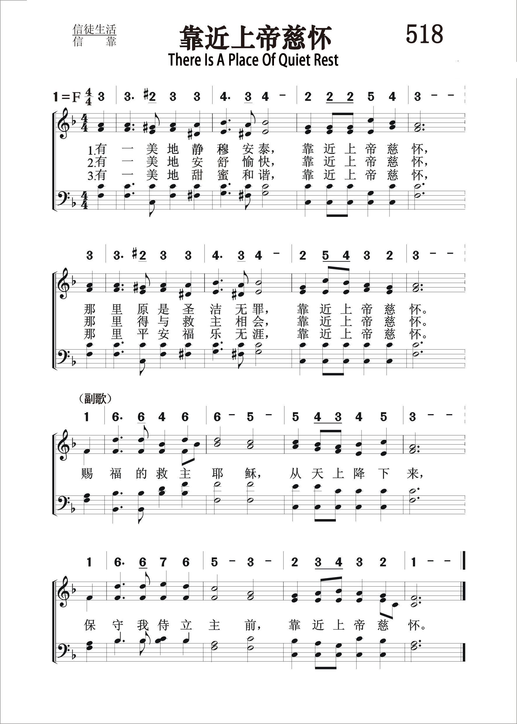 第518首 靠近上帝慈怀 There Is a Place of Quiet Rest 麦卡菲(C.B.McAfee,1866-1944)作词作曲(1901年) 有一美地恬静安泰,靠近上帝慈怀, 原是圣洁无罪,靠近上帝慈怀。 有一美地安舒愉快,靠近上帝慈怀, 那里得与救主相会,靠近上帝慈怀, 有一美地甜蜜和谐,靠近上帝慈怀, 那里平安福乐无涯,靠近上帝慈怀。 赐福的救主耶稣,从天上降下来, 保守我侍立主前,靠近上帝慈怀。 这首诗歌的词曲作者麦卡菲是美国长老会的牧师。他出生于密苏里州的阿什里,毕业于该州威利帕克学院,后进协和神学院学习。学习结束后回威利帕克学院担任教师兼圣诗班指挥。后任芝加哥和布鲁克林长老会牧师,兼任神学院教授和长老会海外传道干事。 麦卡菲牧师有一个习惯。每逢圣餐礼,他总要写一首新的圣诗。本诗写于1901年。当时他的两个侄女因患白喉病逝于传染病院,令他悲痛不已。《靠近上帝慈怀》就是在这样的背景之下创作出来的。星期六晚上圣诗班在芝加哥传染病院墙外献唱了一次。第二天早晨在芝加哥第一长老会教堂又唱了一次,给亲友们带来莫大的安慰。上帝的慈怀是一切信靠祂之人的安息之所。在那里我们可以摆脱所有的忧患和罪孽,安静地侍立在主的面前。1903年这首诗被刊登在《诗班领导者》杂志上,自此流传各地。 在繁忙的尘世俗务中,我们不时为今天的琐事奔波、为明日的事务挂虑,心中没有空位给主,耳中听不到圣灵的声音。让我们靠近上帝的怀中安静片刻,使自己能从祂那里得智慧、安慰和活力。“母亲怎样安慰儿子,我就照样安慰你们”(赛66:13)。