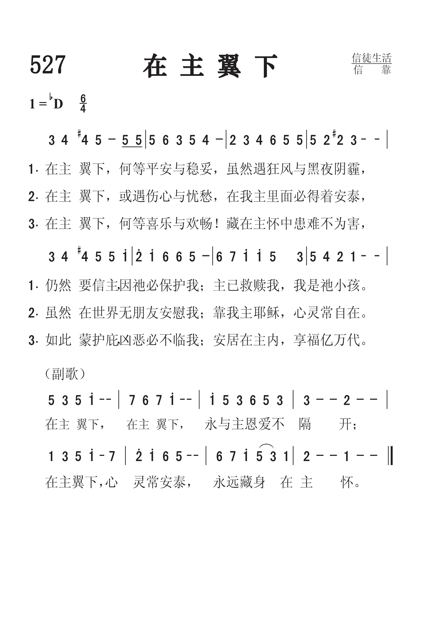 第527首在主翼下Under His Wings 库欣(WOCushing, 1823-1902)作词,桑基(Ira D.Sankey,1840-1908)作曲 在主翼下,何等平安与稳妥,虽然遇狂风与黑夜阴霾, 仍然要信主, 因祂必保护我;主已救赎我,我是祂小孩。 在主翼下,或遇伤心与忧愁,在我主里面必得着安泰, 虽然在世界无朋友安慰我;靠我主耶稣,心灵常自在。 在主翼下,何等喜乐与欢畅!藏在主怀中患难不为害, 如此蒙护庇, 凶恶必不临我;安居在主内,享福亿万代。 在主翼下,在主翼下,永与主恩爱不隔开; 在主翼下,心灵常安泰,永远藏身在主怀。 这首诗是库欣七十三岁时所作。 “我说:但愿我有翅膀像鸽子,我就飞去,得享安息”(诗55:6)。“他们必如鹰展翅上腾”(赛40:31)。库欣固然熟悉这些经文,但主耶稣的话,更让他牢记在心:“我多次愿意聚集你的儿女,好象母鸡把小鸡聚集在翅膀底下,只是你们不愿意”(太23:37)。其它如“求你……将我隐藏在你翅膀的荫下”(诗61:4),“我要投靠在你翅膀的隐密处”(诗91:4)等经文也一定是这为上帝的老仆人写这首诗的主要依据。本诗所表达的属灵经历,是每一位信徒都能够分享的。 “求祢保护我,如同保护眼中的瞳人,将我隐藏在祢翅膀的荫下;使我脱离那欺压我的恶人,就是围困我要害我命的仇敌”(诗17:8-9)。 词作者库欣出生于美国新英格兰,自幼信主;青年时代受奋兴布道的影响,献身事奉主,担任牧师圣职。1870年他47岁时,不幸患病,健康恶化。后来疾病虽愈,但口以不能说话,无法再宣传主道,于是求主赐下写作圣诗的才能。此后,他以惊人的毅力写了圣诗三百余首,感动了许多人。他以坚强的信心,在世上又生活了三十三年,去世时80岁。他的圣诗多由鲁特、桑基、劳里等福音派圣诗作曲家为他配曲。 曲作者桑基生于美国宾夕法尼亚州,自幼参加教会活动。17岁时,他的父亲说:“我看这孩子将来除了每天在腋下夹着一本赞美诗到处歌唱之外,不会找别的工作。”的确,他经常在教会的主日学中教唱赞美诗,后来果然成为一位世界著名的福音圣诗歌唱家。他曾担任宾夕法尼亚州青年会的总干事。为建造青年会会址,他募集了4万美元。后来他与慕迪(Moody)同工,在布道会上教唱福音诗歌,也曾编辑并创作过许多首赞美诗。他曾经将他的作品编辑好,准备出版,但一次失火将他的原稿烧毁。1906年他眼睛失明后,还出版了一本《我的生平及福音赞美诗的故事》。在书中说:“我不是一个音乐家,也不是一个歌唱家,我从来没有学过声乐,也没有受过艺术教育,但我对所唱诗歌的每一句和每一字都深有体验。我每唱一首诗都必须把它唱到每一个听众的心里。。我常感到好的旋律易找,但好的歌词却不易找。” 桑基一生创作了几十首福音赞美诗,其中三十首至今仍在教会的聚会中传唱。