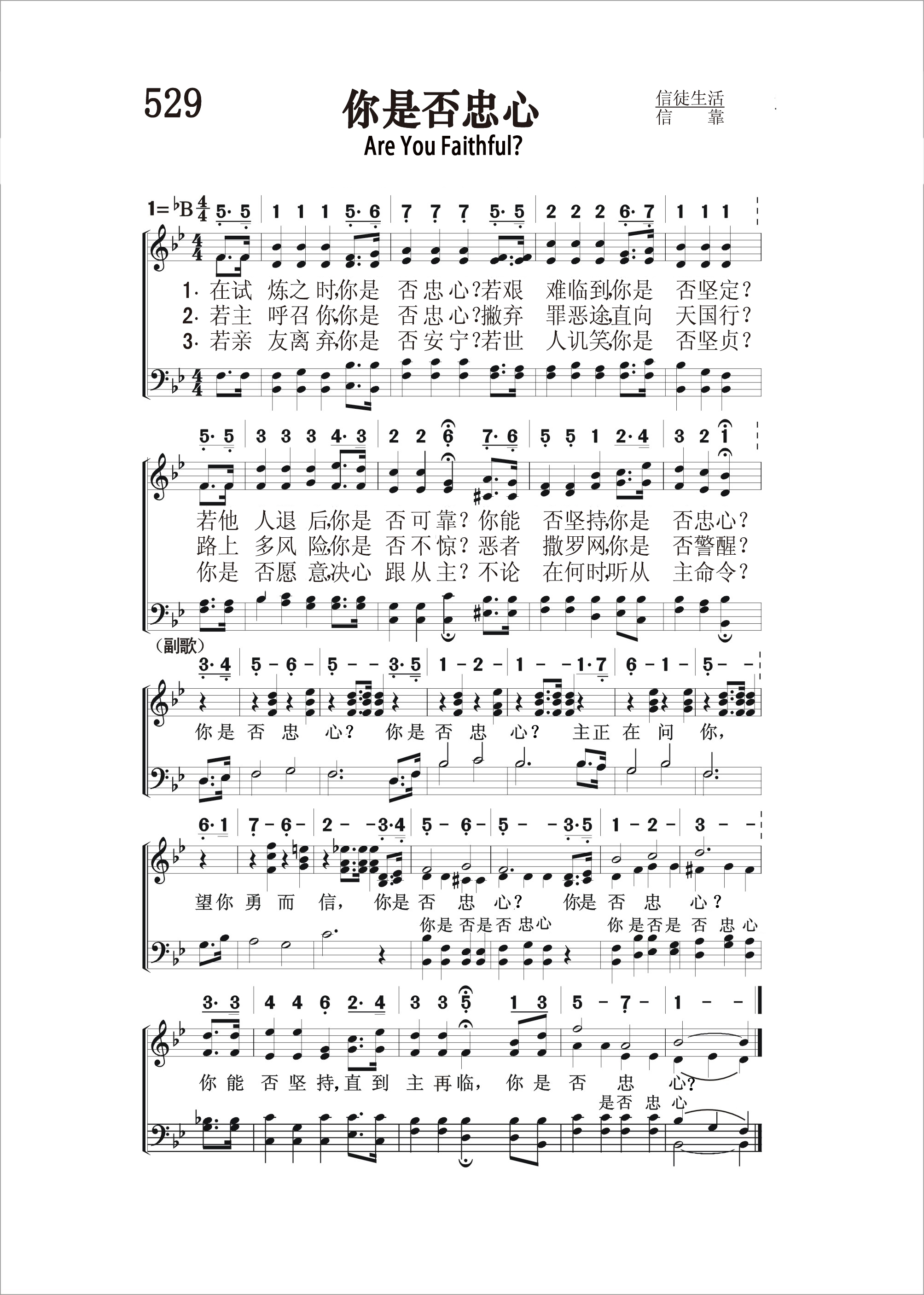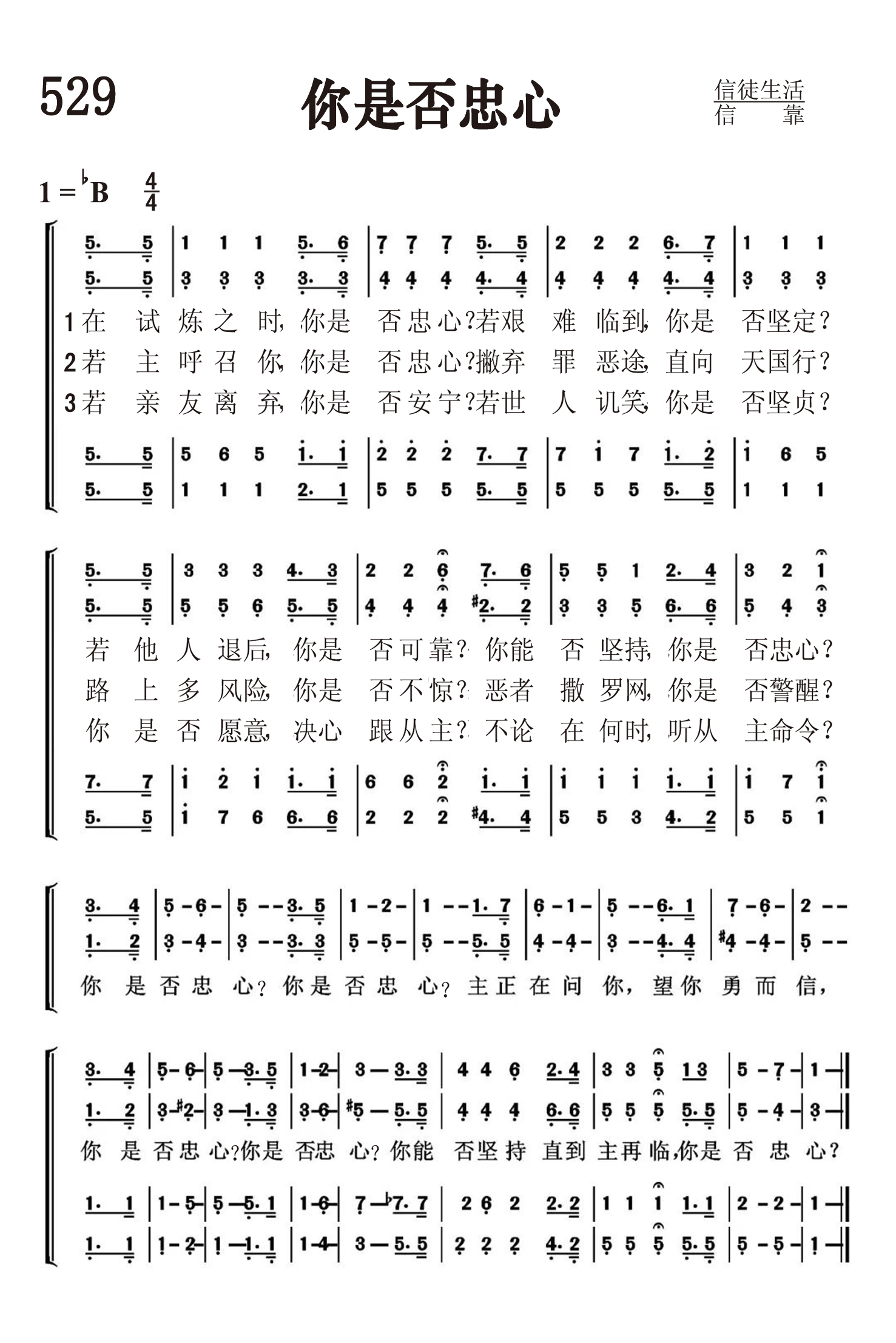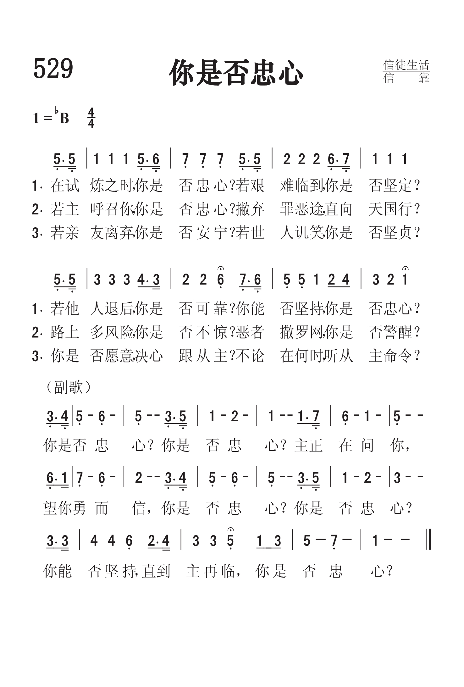 第529首 你是否忠心Are You Faithful? 在试炼之时你是否忠心,若艰难临到你是否坚定, 若他人退后你是否可靠,你能否坚持你是否忠心? 若主呼召你你是否忠心,撇弃罪恶途直向天国行, 路上多风险你是否不顾,恶者撒罗网你是否警醒? 若亲友离弃你是否安宁,若世人讥笑你是否坚贞, 你是否愿意决心跟从主,不论在何时听从主命令? 你是否忠心?你是否忠心?主正在问你,望你勇而信, 你是否忠心?你是否忠心?你能否坚持,直到主再临,你是否忠心。 我们伟大的救主为了拯救我们这些死在罪恶过犯中的人曾经牺牲了自己的一切。祂所成就的救赎大功值得我们终生赞美和歌颂。作为一个出死入生的基督徒,我们对主保持忠诚是我们应有的态度和当尽的本分。这首以“忠心”为主题很值得我们思考和体会。