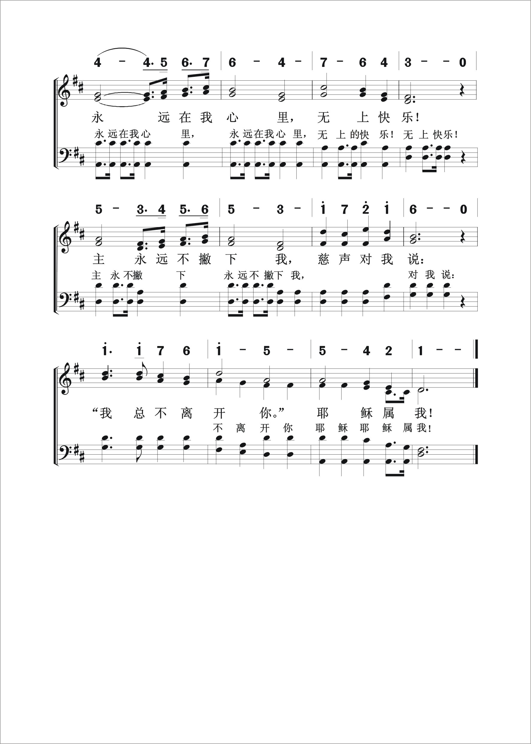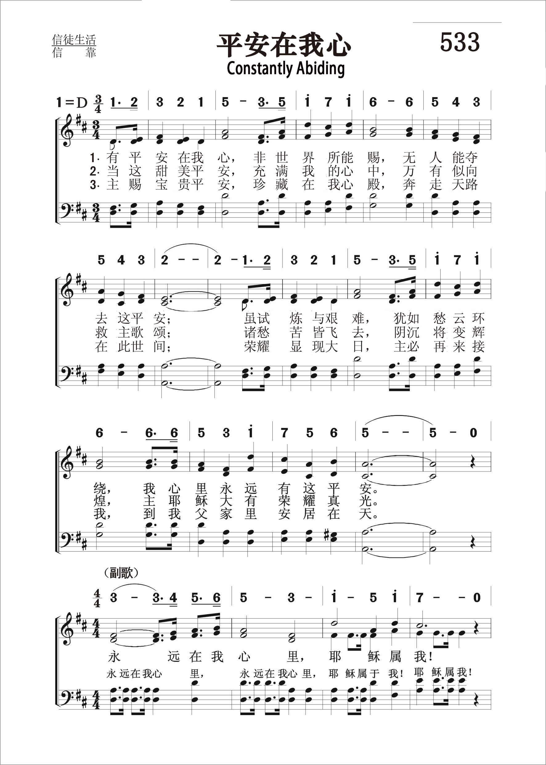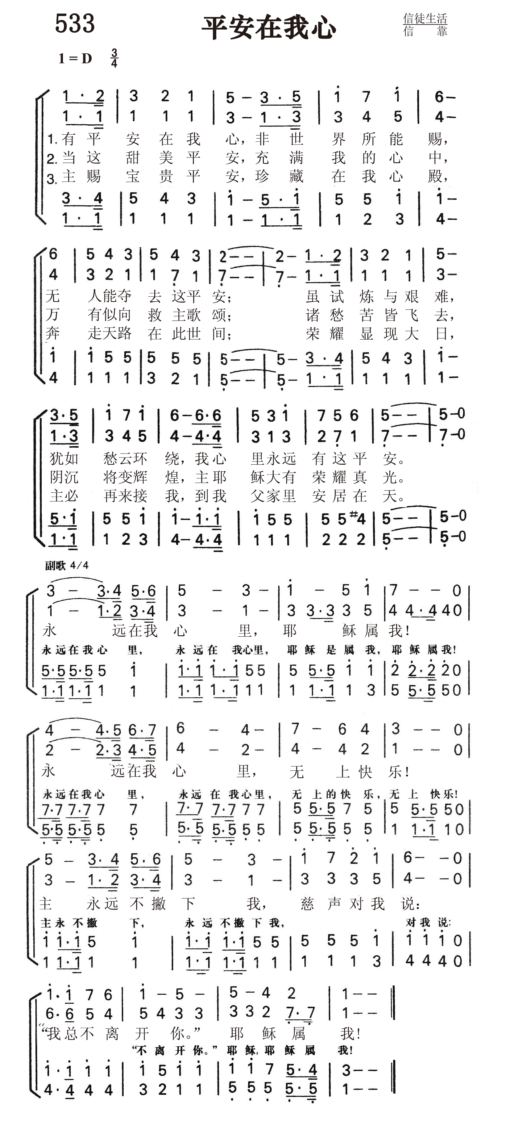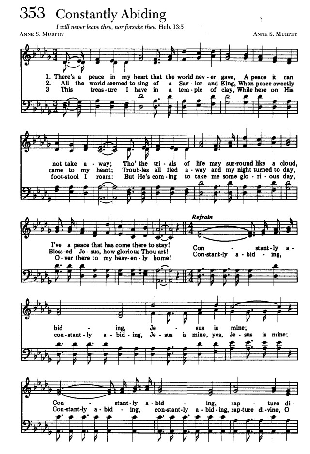 第533首 平安在我心Constantly Abiding 安妮.墨菲(Anne S. Murphy, 18?? –1942)作词作曲(1908年) 有平安在我心,非世界所能赐,无人能夺去这平安; 虽试炼与艰难,犹如愁云环绕,我心里永远有这平安。 当这甜美平安,充满我的心中,万有似向我救主歌唱; 诸愁苦皆飞去,阴沉将变辉煌,主耶稣大有荣耀真光。 主赐宝贵平安,珍藏在我心殿,奔走天路在此世间; 荣耀显现大日,主必再来接我,到我父家里安居在天。 永远在我心里,耶稣属我!永远在我心里,无上快乐! 主永远不撇下我,慈声对我说:“总不离开你。“耶稣属我! 安妮.墨菲的丈夫威尔. 墨菲,是俄亥俄州富裕的陶瓷商人。他们夫妇同心合意用他们自己的钱财和才华服事上帝,帮助教会。 安妮.墨菲具有音乐的天赋和美妙的歌喉,又是一名出色的演说家。她写这首圣诗是根据《约翰福音》14:27“我留下平安给你们,我将我的平安赐给你们。我所赐的,不像世人所赐的。你们心里不要忧愁,也不要胆怯。” 1928年美国经济不景气,百业凋零。他们的陶瓷业也因而关闭。不久安妮.墨菲失去了地上的财富和丈夫,但她仍从上帝那里得到平安。上帝的应许安慰了她寂寞孤单的心灵,因为主曾说,“我总不撇下你,也不丢弃你”(来13:5)。 平安和喜乐就像是孪生子。有了平安就有喜乐。上帝赐祂儿女一张平安喜乐的无限额信用卡,任我们取用。但愿让我们能经常使用它。