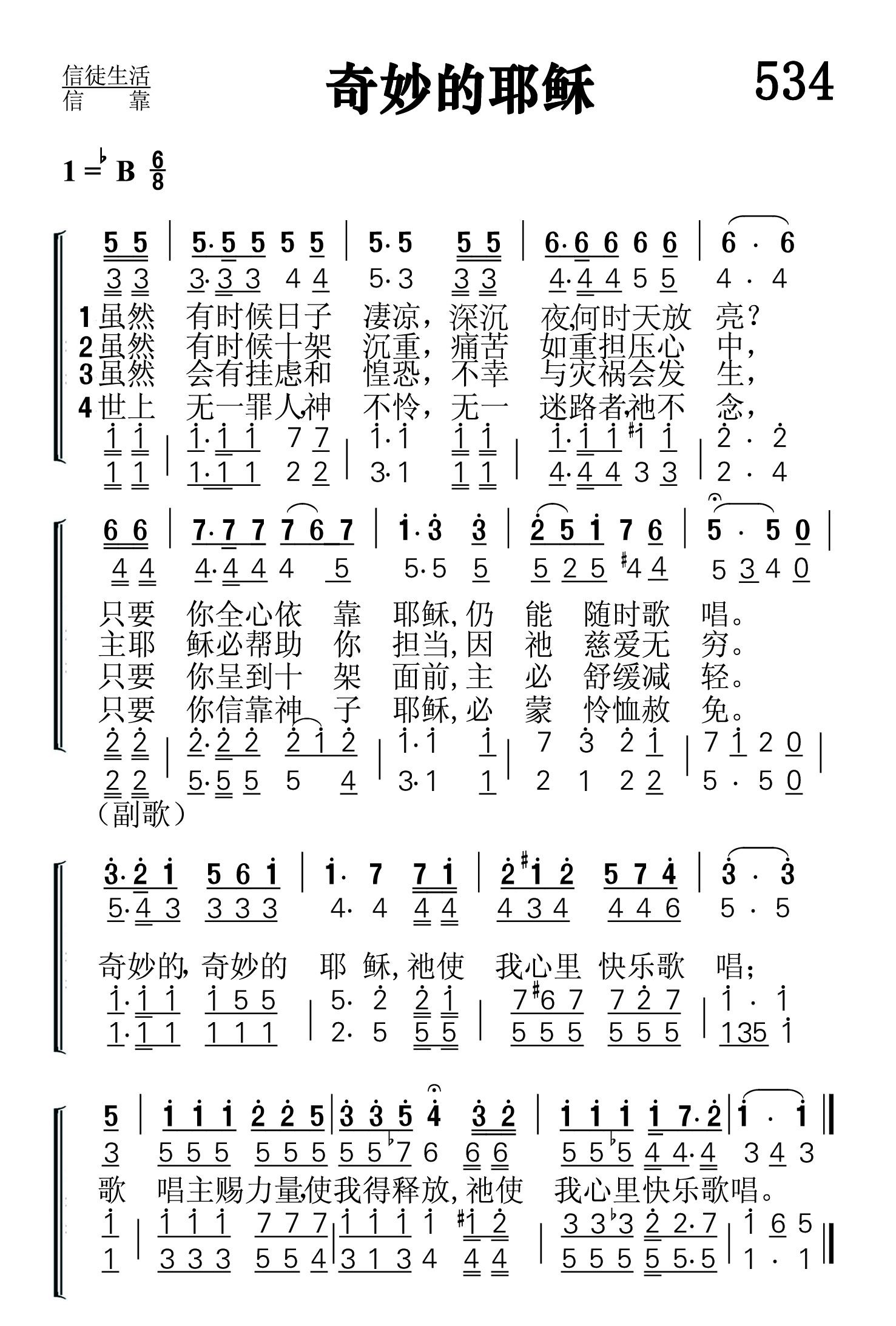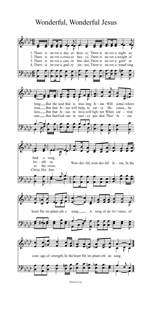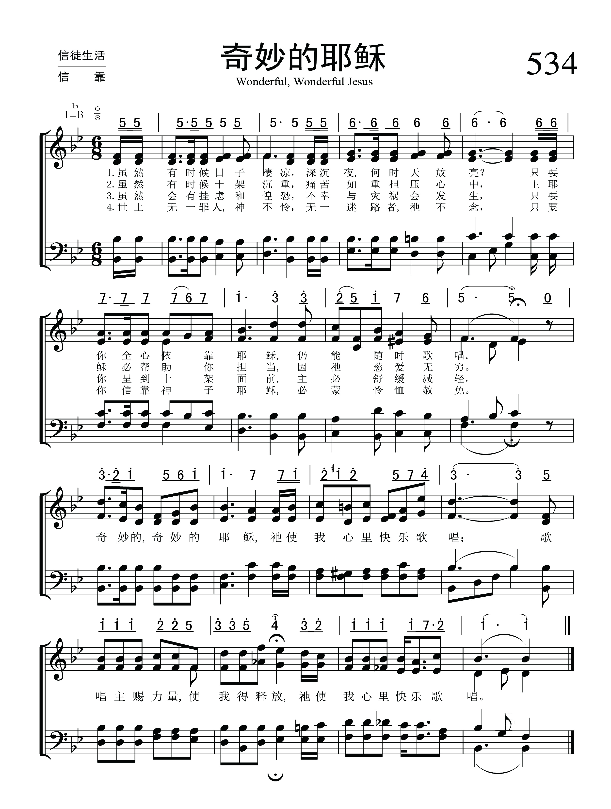 第534首 奇妙的耶稣Wonderful, Wonderful Jesus 安娜.拉赛尔(Anna Belle Russell,1862,4,21-1954,10,29)作词,赛勒斯(Ernest Orlando Sellers,1869,19,29-1952,10,19)作曲 虽然有时候日子凄凉.黑夜漫长何时天亮, 只要你全心依靠耶稣.仍能随时歌唱。 虽然有时候十架沉重,痛苦如重担压心中, 主耶稣必帮助你担当.因祂慈爱无穷。 虽然会有挂虑和惶恐,悲哀与损失会发生, 只要你带到十架面前.主能使它减轻。 世上无一罪人祂不爱,无一迷路者祂不念, 要你信靠圣子耶稣.必蒙怜恤赦免。 奇妙的,奇妙的耶稣,祂使我心里快乐歌唱; 歌唱主赐力量使我得释放,祂使我心里快乐歌唱。 词作者安娜.拉赛尔出生于美国纽约州的派因谷。她后来住在纽约的科宁,属第一卫理教会。她和她的姐妹科拉. 拉赛尔曾写下不少的赞美诗。 赛勒斯从密歇根州兰辛的中学毕业以后,曾见习市政工程和调查员的工作,后成为市政工程的工程师和主管。1895年,他入学芝加哥的慕迪圣书学院。毕业后他一直活跃在圣工的岗位上。第一次世界大战以后,他被任命为慕迪圣书学院音乐系主任和主日学教学法教授。1926年,他参加编写《浸信会赞美诗新编》
