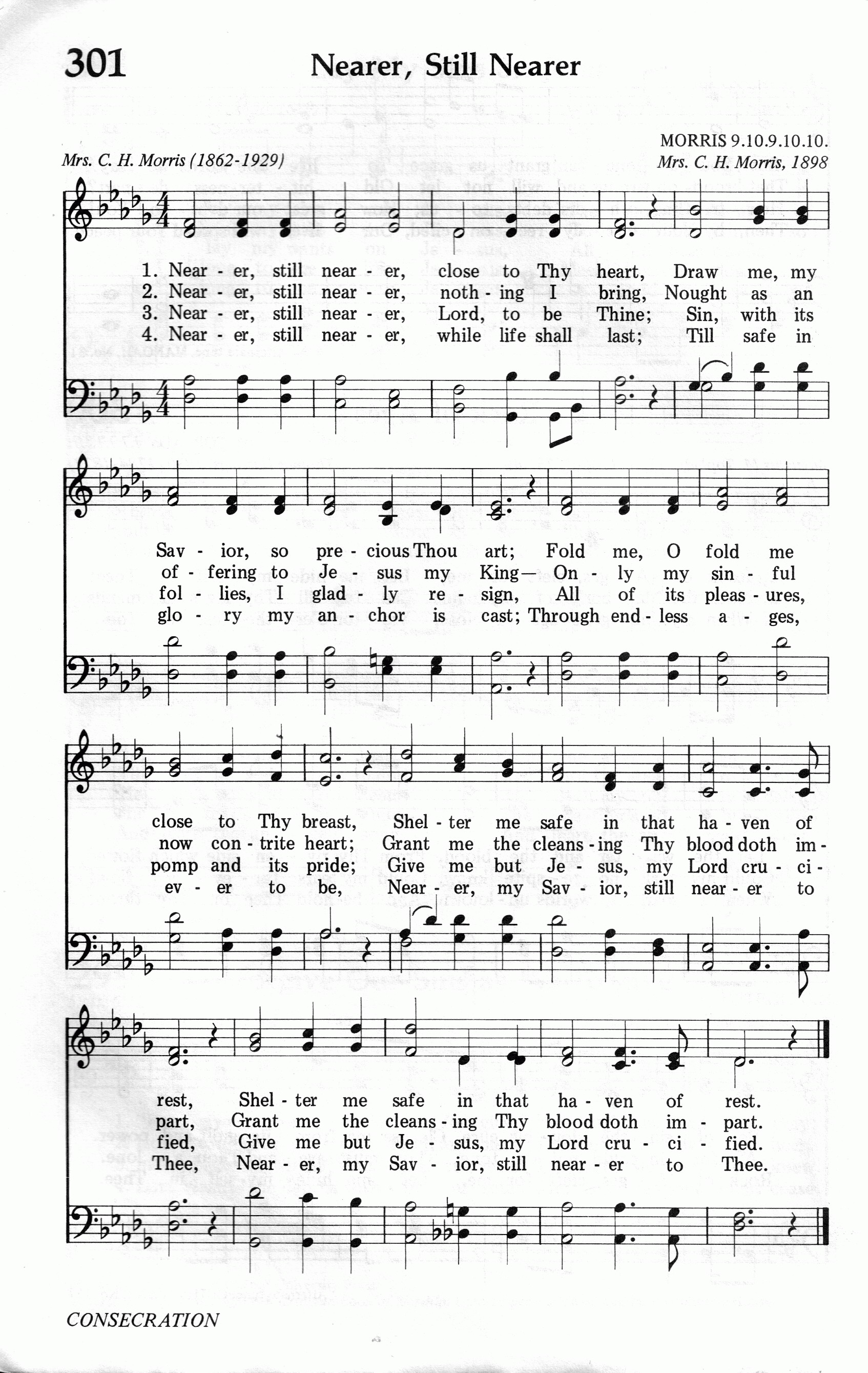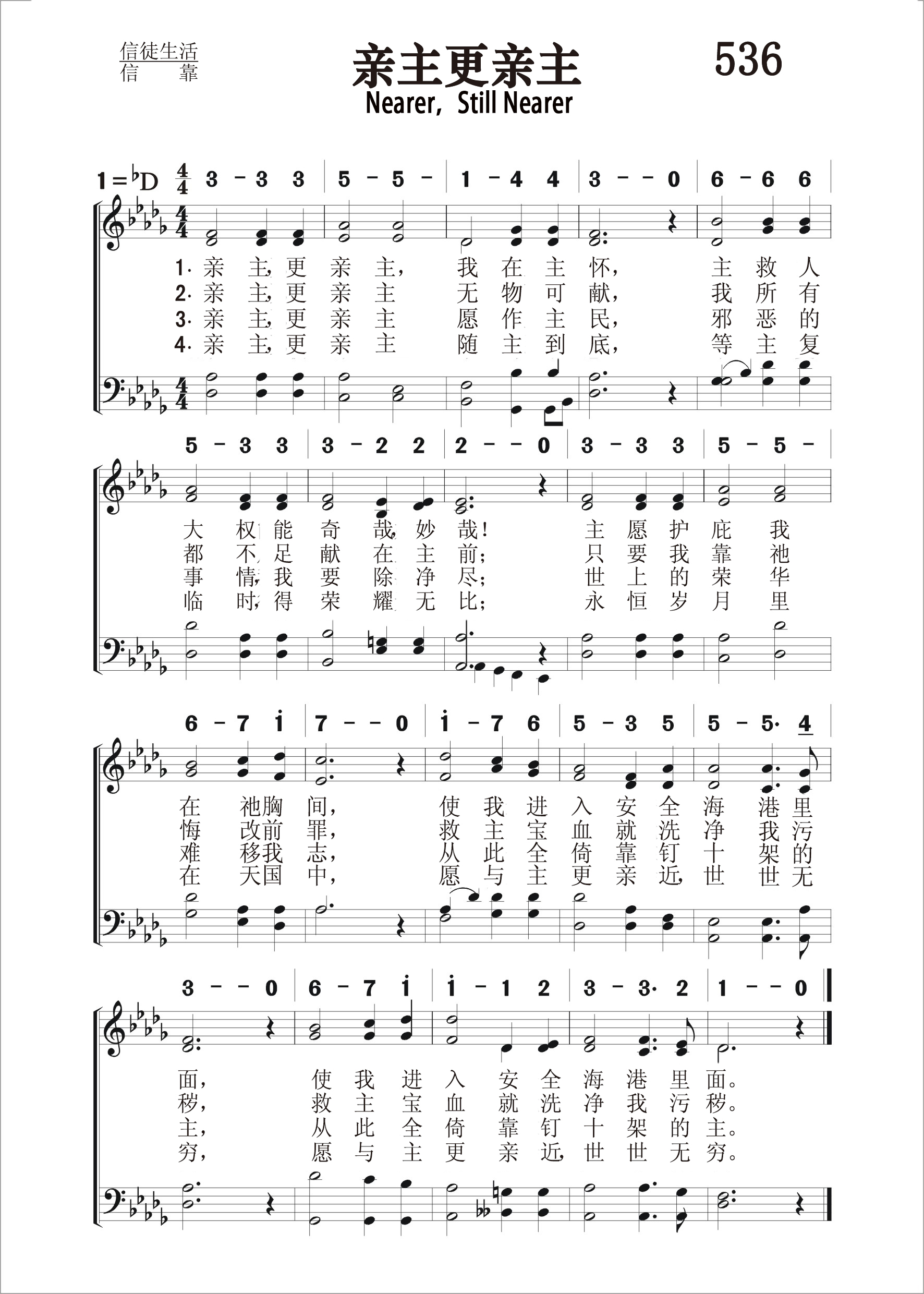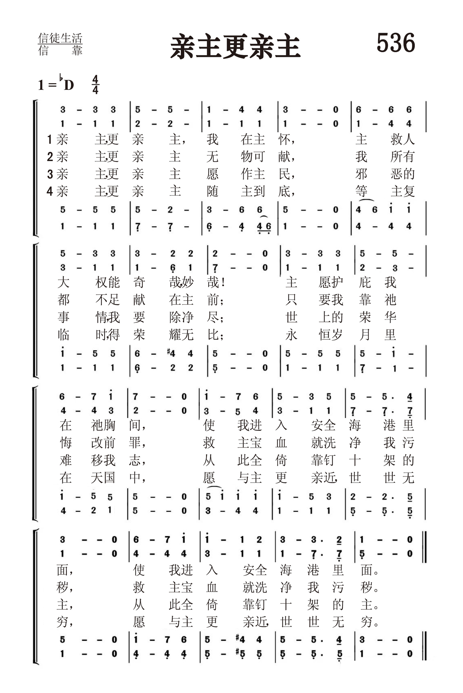 第536首亲主更亲主Nearer,Still Nearer 莫里斯夫人(见第70首介绍)作词作曲(1898年) 亲主更亲主我在主怀,主救人大权能奇哉,妙哉! 主愿护庇我在祂胸间,使我进入安全海港里面。 亲主更亲主无物可献,我所有都不足献在主前, 只要我靠祂悔改前罪,救主宝血就洗净我污秽。 亲主更亲主愿作主民,邪恶的事情我要除净尽; 世上的荣华难移我志,从此全倚靠钉十架的主。 亲主更亲主随主到底,等主复临时,得荣耀无比, 永恒岁月里在天国中,愿与主更亲近,世世无穷。 莫里斯夫人出生在俄亥俄州的小镇马耳他。十岁经历了重生,十三岁在教会司琴,十九岁结婚。她不断清心追求主,蕴藏的圣诗恩赐也一并增长。1892年,她在参加夏令营后与母亲一起踩缝纫机时忽然心中涌出诗句和曲调,她就赶快写下,之后就开始了她的创作。她说:“一位作者不是工厂便是管道,我不是工厂,而是管道,我只是敞开我的心,让从上帝而来的灵歌经过。”这首诗歌可以与普伦蒂斯夫人的《更爱我主》(第445首)和帕尔默的《仰望救主》(第58首)相媲美。