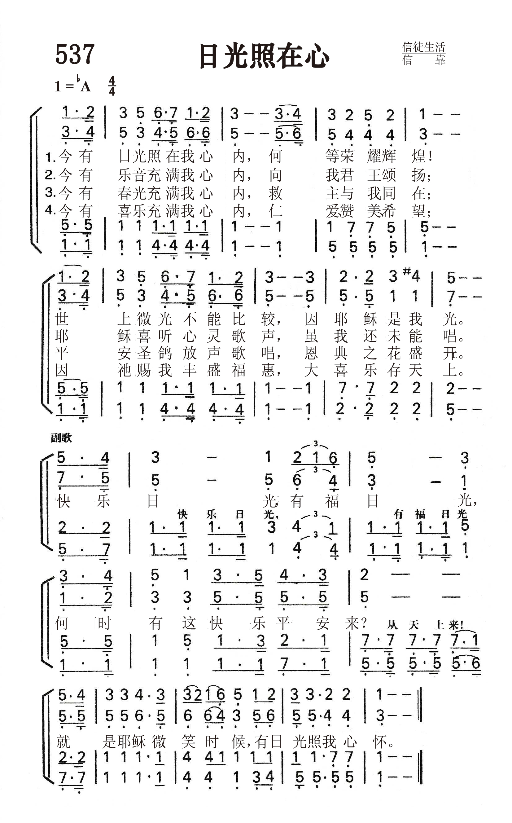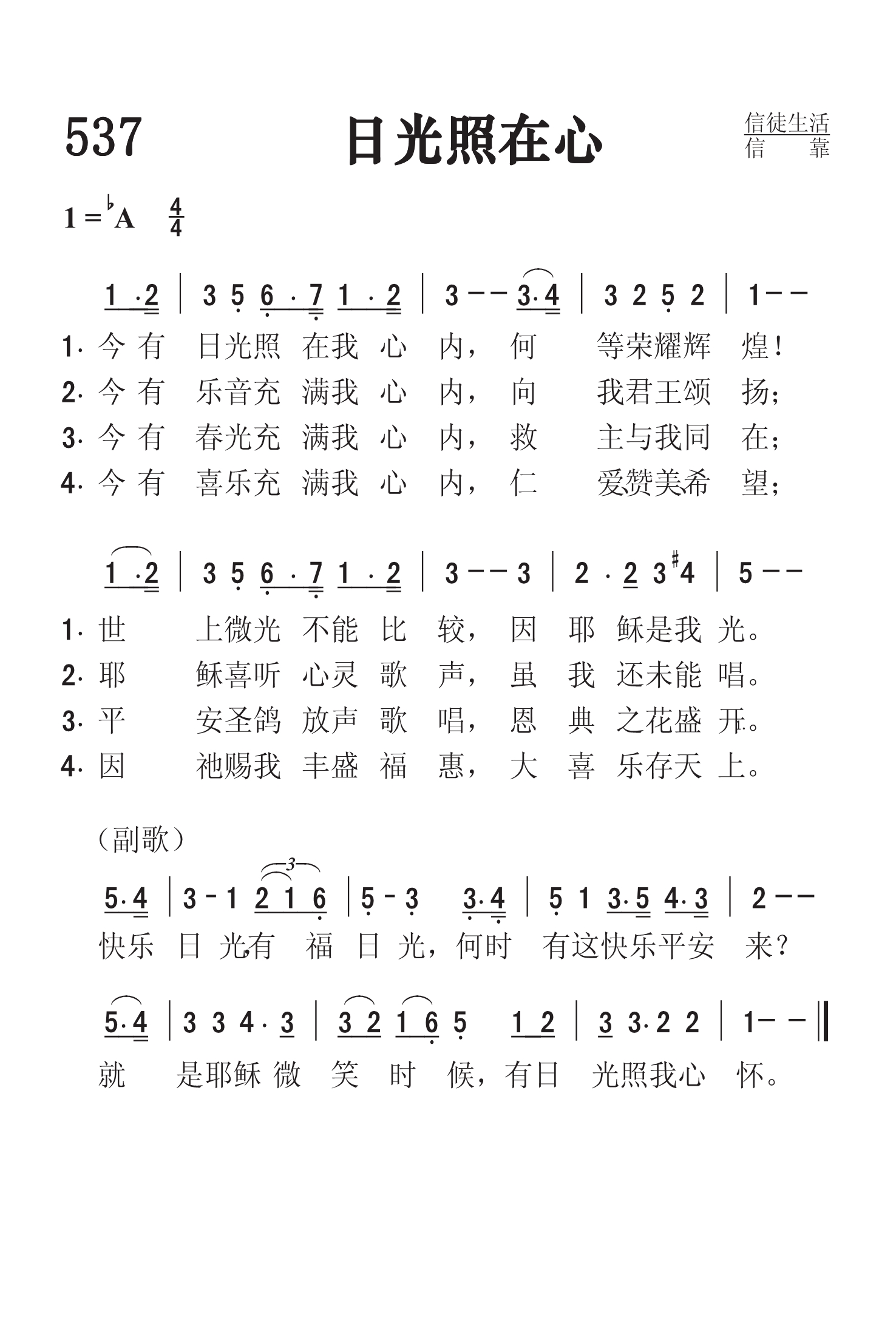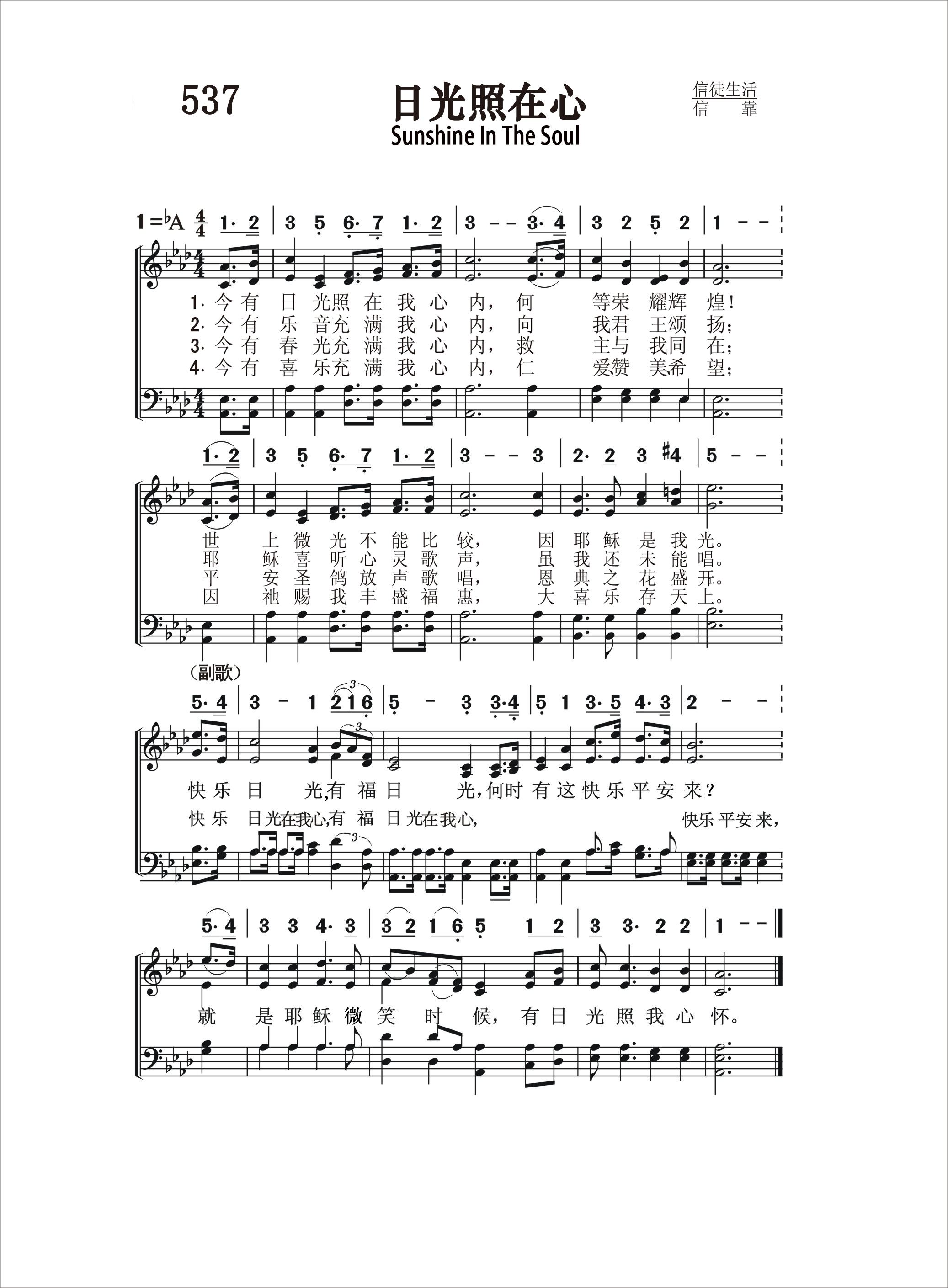 第537首 日光照在心 Sunshine in the Soul 休伊特(E.E.Hewitt,1851,6,28-1920,4,24)作词,斯威尼(J.R.Sweney,1837,12,31-1899,4,10)作曲。 今有日光照在我心内,何等荣耀辉煌! 世上微光不能比较,因耶稣是我光。 今有乐音充满我心内,向我君王颂扬; 耶稣喜听所有歌声,虽我还未能唱。 今有春光充满我心内,救主与我同在; 平安圣鸽放声歌唱,恩典之花盛开。 今有喜乐充满我心内,仁爱\赞美\希望; 因祂赐我丰盛福惠,大喜乐存天上。 快乐日光,有福日光,何时有这快乐平安来? 就是耶稣欢]微笑时候,有日光照我心怀。 休伊特是美国卫理公会一位牧师的妻子。早年她以优异的成绩毕业于美国费城女子师范学校,曾作为毕业生的代表在毕业典礼上致辞。后担任中学教师多年,热心教会主日学和社会的福利事业。她在任教期间,课堂上有一个淘气的学生挥起石版打在她的背上,使她在一段时间里卧床不起。有一天,她在医生的许可下终于可以在明媚的阳光下散步了。她心情十分愉快,提笔就写下了这首《日光照在心》: 休伊特夫人写过许多赞美诗,均由福音派作曲家为之谱曲。本诗的曲调是最早为她谱曲的斯威尼所写,调名《阳光》。 作曲家斯威尼从小就表现出超人的音乐天赋。22岁起担任音乐教师。在南北战争期间,任乐队指挥。后任音乐教授25年。他曾担任费城伯特利长老会音乐指导。一生谱有圣诗一千多首。