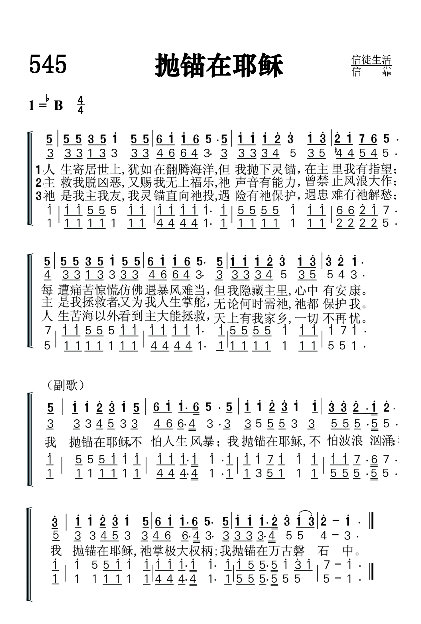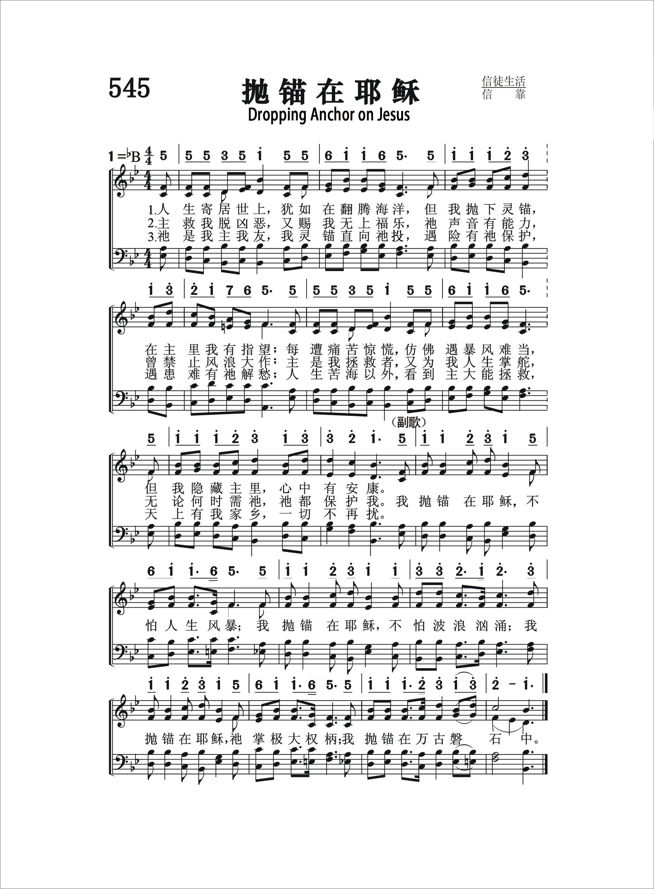 第545首 抛锚在耶稣 Dropping Anchor on Jesus 《颂赞圣诗》第325首 人生寄居世上,犹如在翻腾海洋,但我抛下灵锚,在主里我有指望; 每遭痛苦惊慌仿佛遇暴风难当,但我隐藏主里,心中有安康。 主救我脱凶恶,又赐我无上福乐,祂声音有能力,曾禁止风浪大作; 主是我拯救者,又为我人生掌舵,无论何时需祂,祂都保护我。 祂是我主我友,我灵锚直向祂抛,遇险有祂保护,遇患难有袍解愁; 人生苦海以外看,到主大能拯救,天上有我家乡,一切不再忧。 我抛锚在耶稣,不怕人生风暴;我抛锚在耶稣,不怕波浪汹涌; 我抛锚在耶稣,祂掌极大权柄;我抛锚在万古磐石中。 在风暴狂澜之中,人生之舟随时有可能倾覆。我们惟有将属灵的锚抛在那万古磐石耶稣基督身上,才能得到安全和保障。祂有能力和权柄抵御仇敌的一切攻击。祂时刻保护着我们免受灾殃祸害。所以我们应当举起信心的手,放心跟随主走永生的道路。