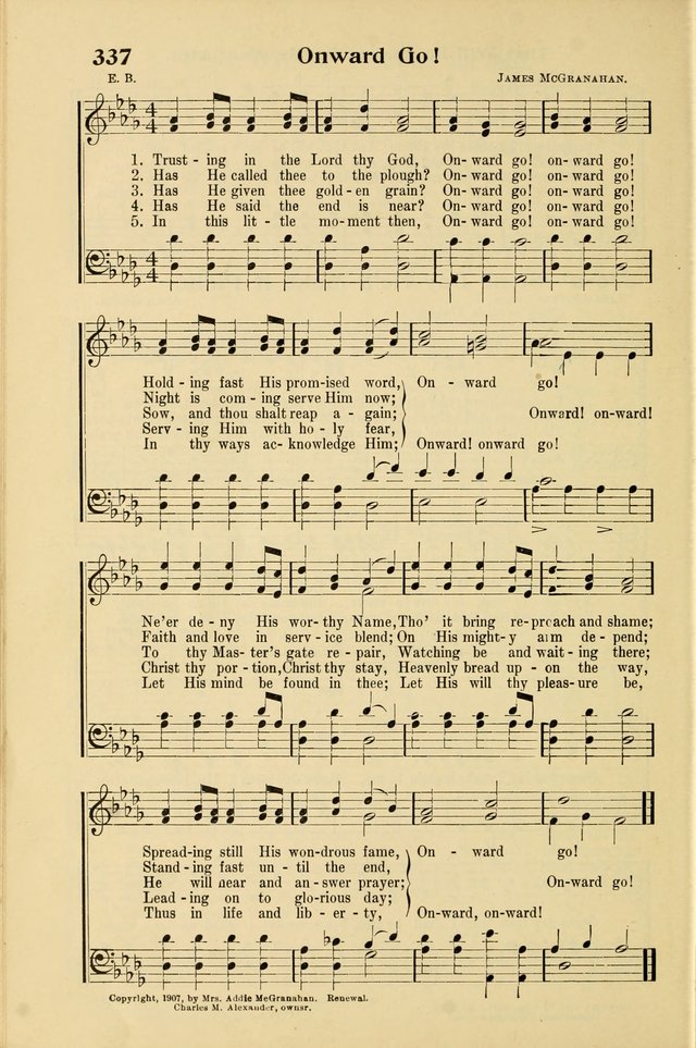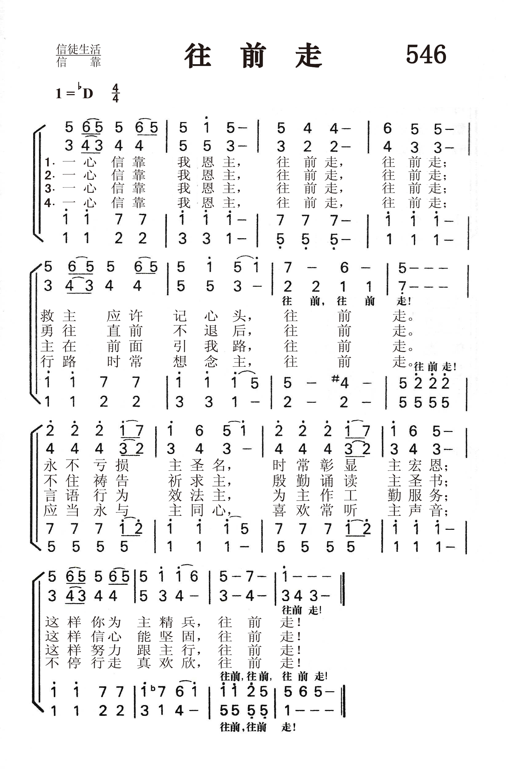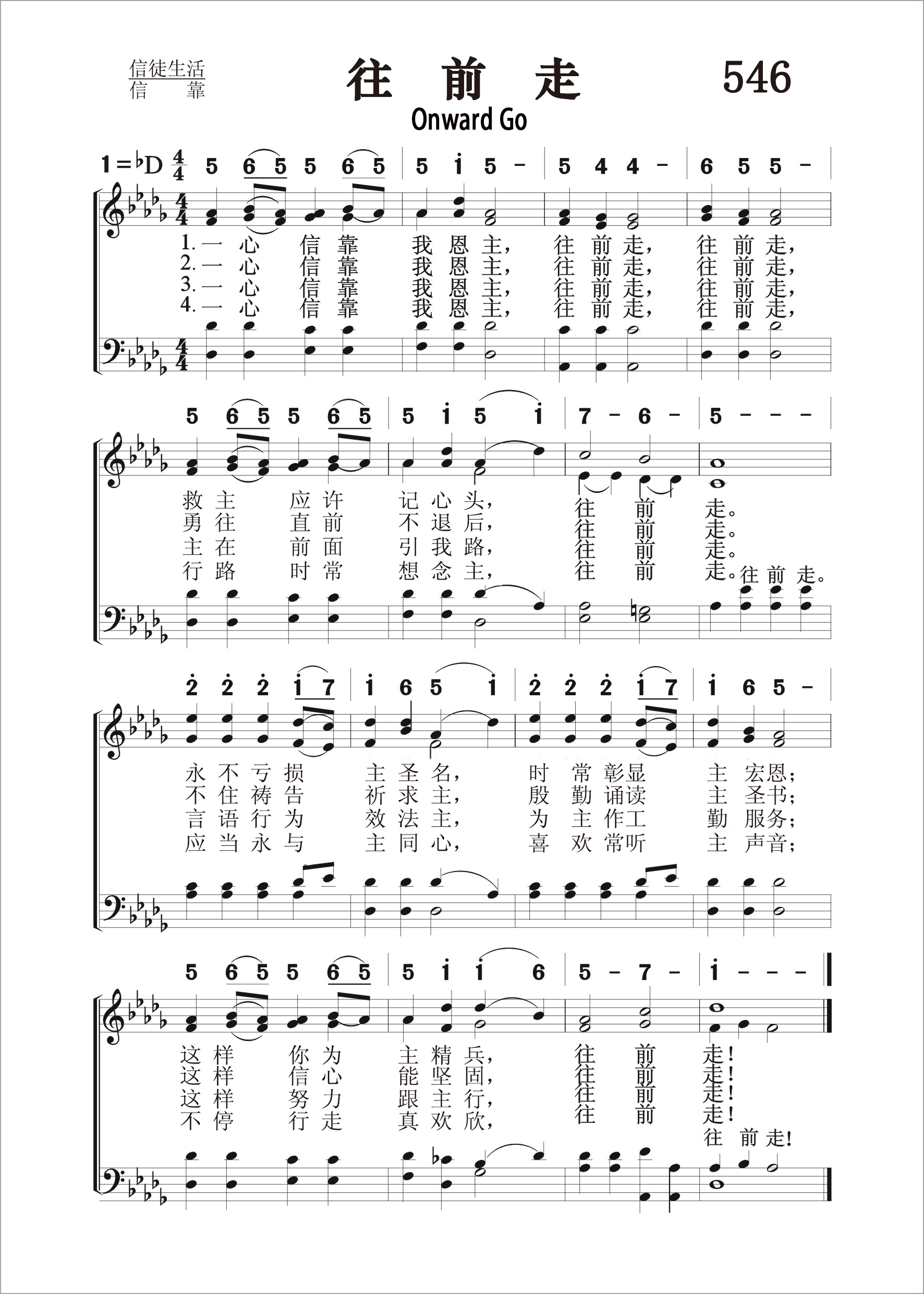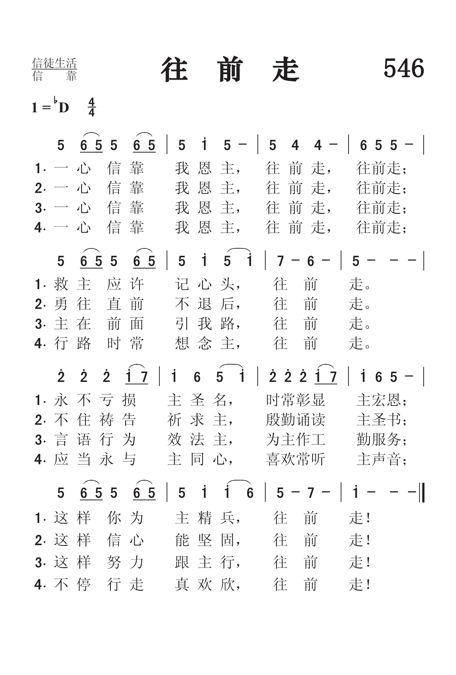 第546首 往前走Onward Go 麦格雷纳汉(JMc Granahan,1840-1907 )作曲 一心信靠我恩主,往前走,往前走;救主应许记心头,往前走。 永不亏损主圣名,时常彰显主奇恩;这样你为主精兵,往前走! 一心信靠我恩主,往前走,往前走;勇往直前不退后,往前走。 不住祷告祈求主,殷勤诵读主圣书,这样信心能坚固,往前走! 一心信靠我恩主,往前走,往前走,主在前边引我路,往前走! 言语行为效法主,作工勤服务;这样努力跟主行往前走! —心信靠我恩主,往前走,往前走;行路时常想念主,往前走! 应当永与主同心,喜欢常听主声音;不停行走真欢欣,往前走! “忘记背后,努力面前,向着标竿直跑。”(腓3:13-14) 这首诗歌每一节都以“一心信靠我恩主,往前走,往前走”开始,然后分别叙述应当怎样向前走:即“不住祷告祈求,殷勤诵读主圣书”,“言语行为效法主,为主做工勤服务”,“应当永与主同心,欢喜常听主声音”,才能“不停行走真欢欣,向前走”。写得非常通俗、简练,很顺口。 词作者佚名。曲作者麦格雷纳汉虽然所受的正式教育很有限,却靠自己的努力和爱好,使他在19岁时就出任音乐教师。以后他到纽约州布雷德伯里所办的音乐学校短期学习,接着便参加福音布道团以歌声宣扬主名。1877年,福音歌唱家、作曲者布利斯突然去世,他便与诗人惠特尔合作,组织布道团,旅行美国各地并前往英国,担任唱诗班领唱,以他优美动听的男高音和亲切感人的魅力大获成功。他还首先组织完全是男声的唱诗班,曾与桑基,鲁特斯特宾斯等人合编出版多本福音诗歌集,其中较有名的有《男声福音圣诗》二卷,《福音圣诗》等。他自己也写诗,如吉林版30首《信主得生命》。