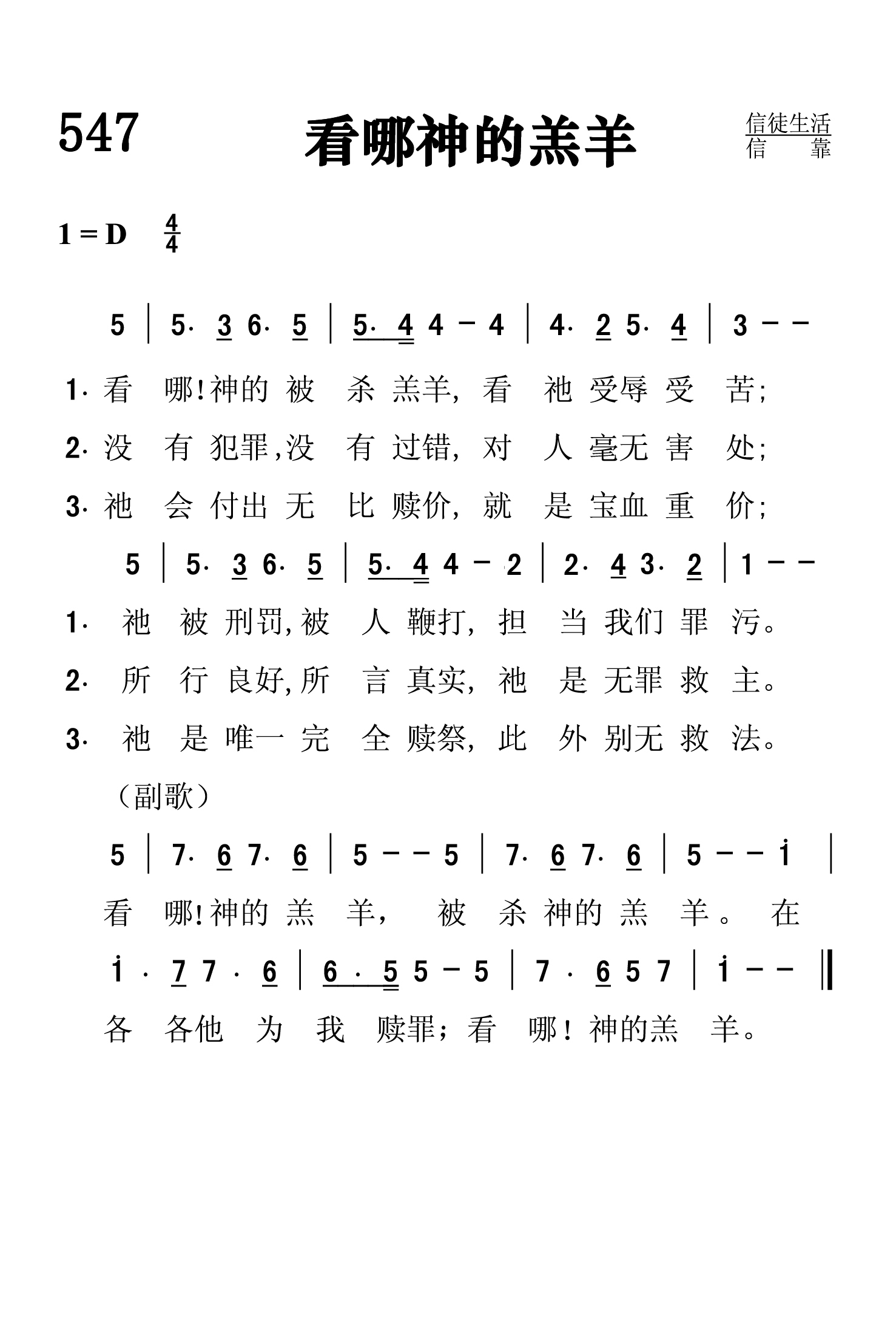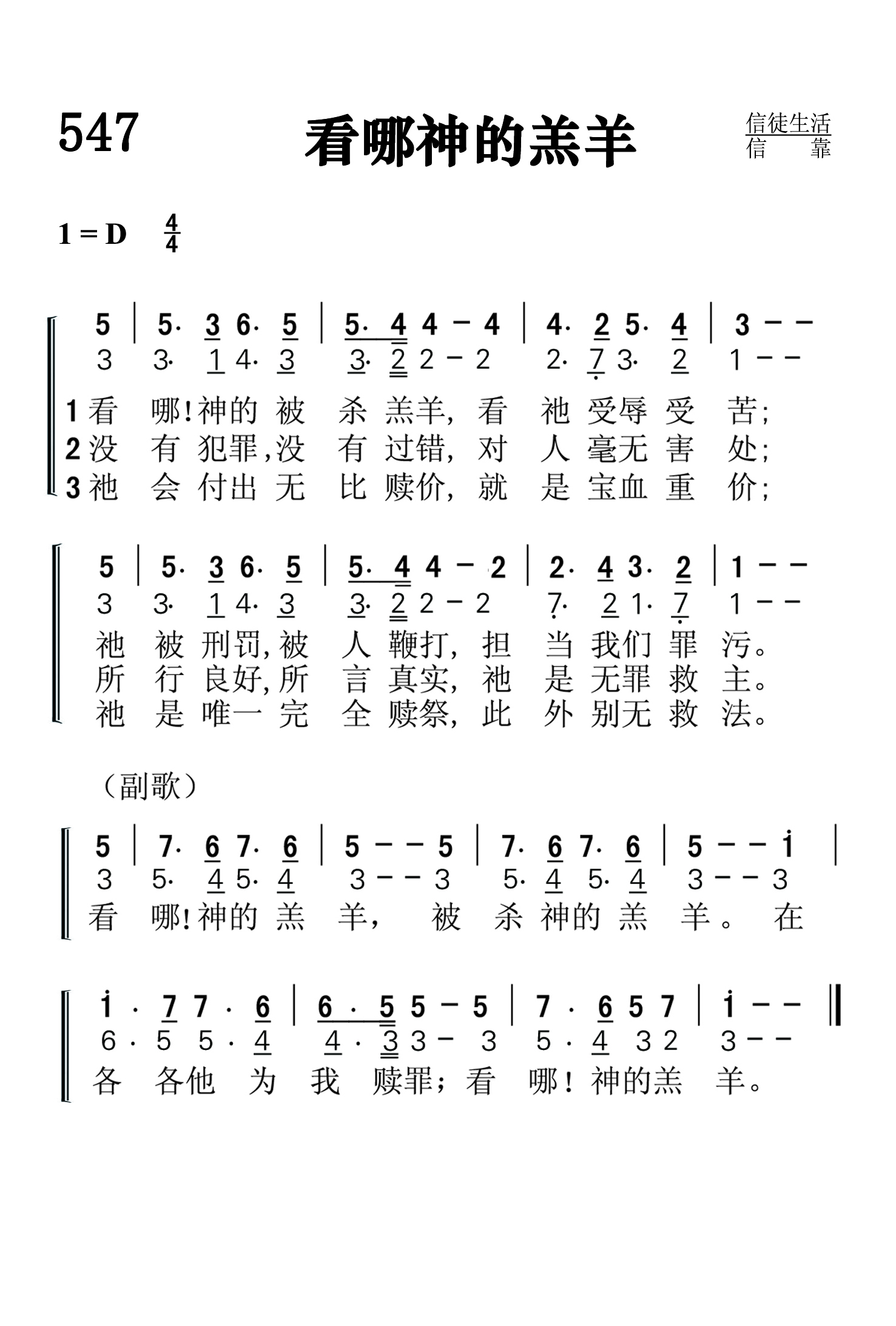 第547首 看哪神的羔羊 Behold the Lamb of God (《赞美诗》506版第198首) 约翰.彼得森(John W. Peterson ,1921-2006.9.21)作词作曲 看哪!神的被杀羔羊,看祂受辱受苦; 祂被刑罚,被人鞭打, 担当世人罪污。 没有犯罪, 没有过错,对人毫无害处; 所行良好,所言真实, 祂是无罪救主。 祂会付出无比赎价, 就是宝血重价; 祂是唯一完全赎祭, 此外别无救法。 看哪!神的羔羊,被杀神的羔羊。 在各各他为我赎罪;看哪!神的羔羊。 约翰.W.彼得森是一位天才的基督教福音音乐作者,曾创作过一千多首诗歌和35部康塔塔。他出生于美国堪萨斯州的林德伯格,第二次世界大仗期间,他曾作为飞行员前往中国执行艰难的任务。仗后他进入慕迪圣书学院,从事福音广播工作。1953年他毕业于芝加哥美国音乐学院,在宾夕法尼亚州继续进行诗歌创作。然后他在密歇根州的大急流域市担任一家圣乐出版公司的总裁和总编辑达十年之久。1961年,他编辑出版了赞美诗集《伟大的信心赞歌》。 《赞美诗》506版72首《大能神迹》和205首《天上荣耀充满我的心灵》也是约翰.W.彼得森作词作曲的。