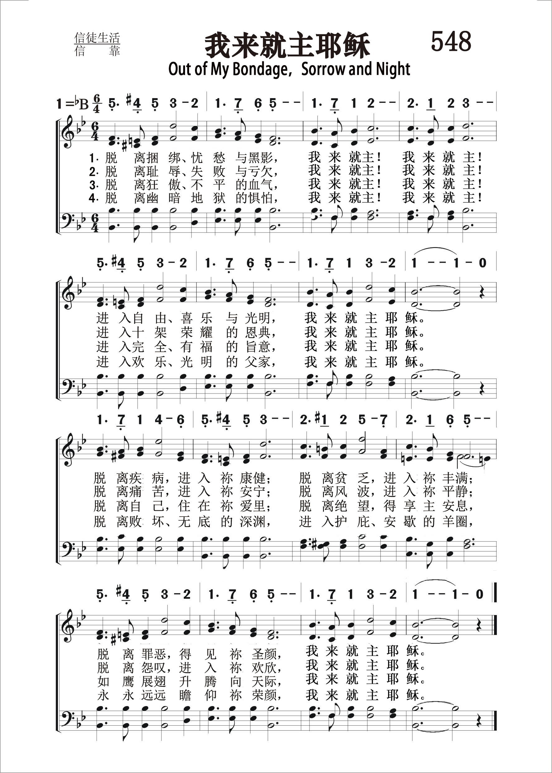 第548首 我来就主耶稣Out of My Bondage,Sorrow and Night 斯利珀( W.T.Sleeper,1819,2,9-1904,9,24)作词,斯特宾斯(George C.Stebbins,1846,2,26-1945,10,6)作曲 脱离捆绑、忧愁与黑影,我来就主!我来就主! 进入自由、喜乐与光明,我来就主耶稣。 脱离疾病,进入祢康健;脱离贫乏,进入祢丰满; 脱离罪恶,得见祢圣颜,我来就主耶稣。 脱离耻辱、失败与亏欠,我来就主!我来就主! 进入十架荣耀的恩典,我来就主耶稣。 脱离痛苦,进入祢安宁;脱离风波,进入祢平静; 脱离怨叹,进入祢欢欣,我来就主耶稣。 脱离狂傲、不平的血气,我来就主!我来就主! 进入完全、有福的旨意,我来就主耶稣。 脱离自己,住在祢爱里;脱离绝望,得享主安息, 如鹰展翅升腾向天际,我来就主耶稣。 脱离幽暗地狱的惧怕,我来就主!我来就主! 进入欢乐、光明的父家,我来就主耶稣。 脱离败坏、无底的深渊,进入护庇、安歇的羊圈, 永永远远瞻仰祢荣颜,我来就主耶稣。 “凡劳苦担重担的人,可以到我这里来,我就使你们的安息”(太11:28)。 这是最受欢迎的福音诗歌之一,共有四节,采用了十三个“脱离”,九个“进入”和十六个“耶稣我来”,呼吁信徒脱离缠绕我们的捆绑,忧愁,黑暗,疾病,贫乏,罪恶,谦卑地来到主的面前,进入自由,光明,喜乐和丰满之中,永远瞻仰主的荣颜 词作者斯利珀出生于美国新罕布什尔州,在佛蒙特大学毕业以后即进入安多弗神学院学习,后在美国公理会的好几个教会担任牧师,热心传扬福音,积极协助开辟新的堂点。1883年他出版了第一个诗集。第414首 《 必须要重生》也是斯利珀作词,斯特宾斯作曲的。 该诗的调名是《耶稣我来》。最早发表在1887年出版的第五期《福音圣诗》上,以《我的上帝啊,求你救我》(诗71:4)为题。曲作者斯特宾斯曾说过:“这是一首少有的佳作。如果词作者在生前知道它如此风靡各地,一定会非常高兴的。” 曲作者斯特宾斯出生于美国纽约州的一个乡村,自幼喜爱音乐,13岁即进音乐学校学习,后到布法罗和纽约市继续深造。他23岁到芝加哥一个音乐商店工作,业余担任一个教堂唱诗班的指挥。1876年他随墓迪和桑基的布道团到过英国、印度、巴勒斯坦、埃及等地,以他的歌声为主作见证,并且多半是他自编自唱,收到了良好的效果。后来他将所谱的曲调和诗歌出版发行,使福音诗歌流传各地,备受欢迎。有人称他是福音诗歌的泰斗。他晚年所著《回忆录与福音圣诗的故事》,一方面作自传式的叙述,一方面收集其他福音诗歌作家的生平和故事,成为一部美好的见证。该书至今仍为研究圣诗的重要参考资料。