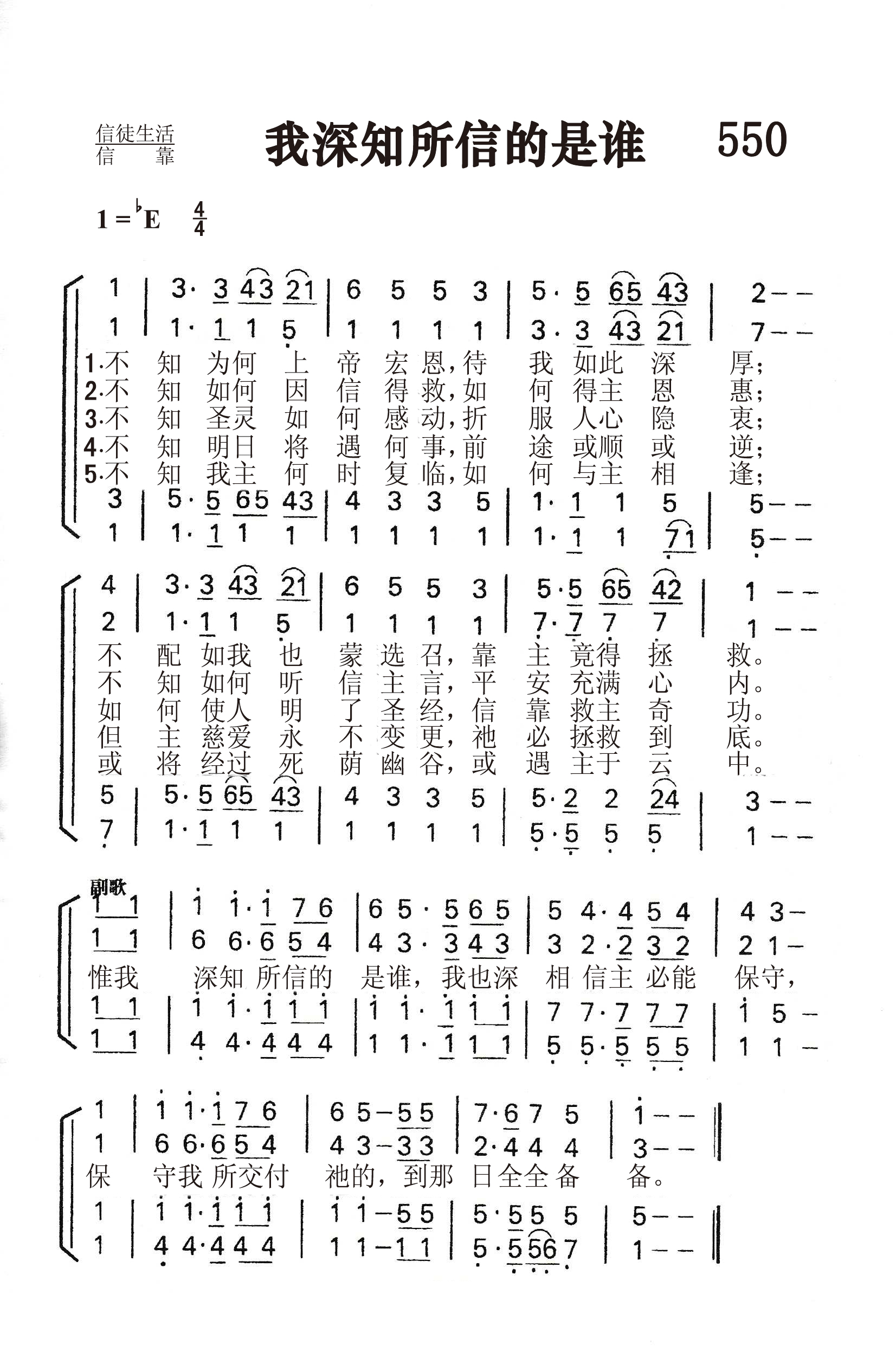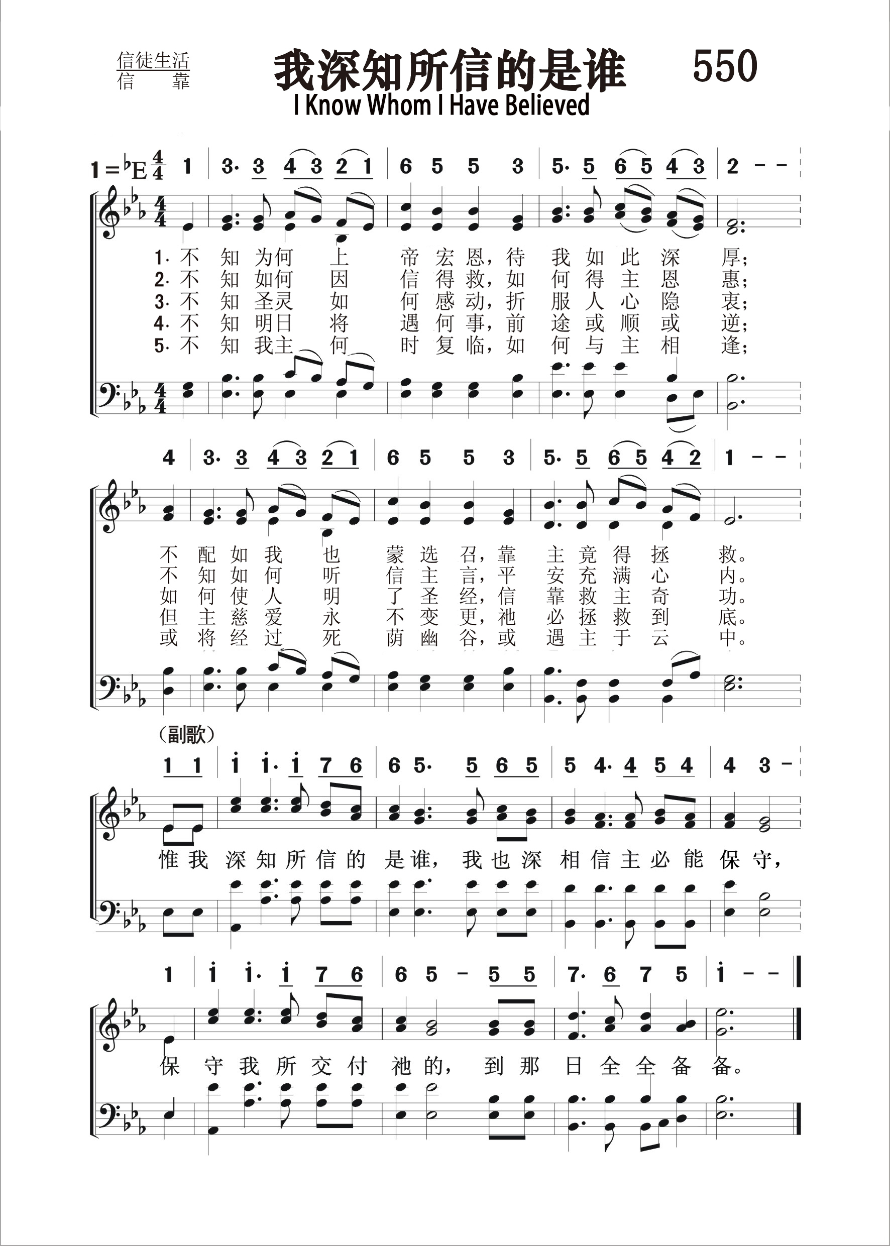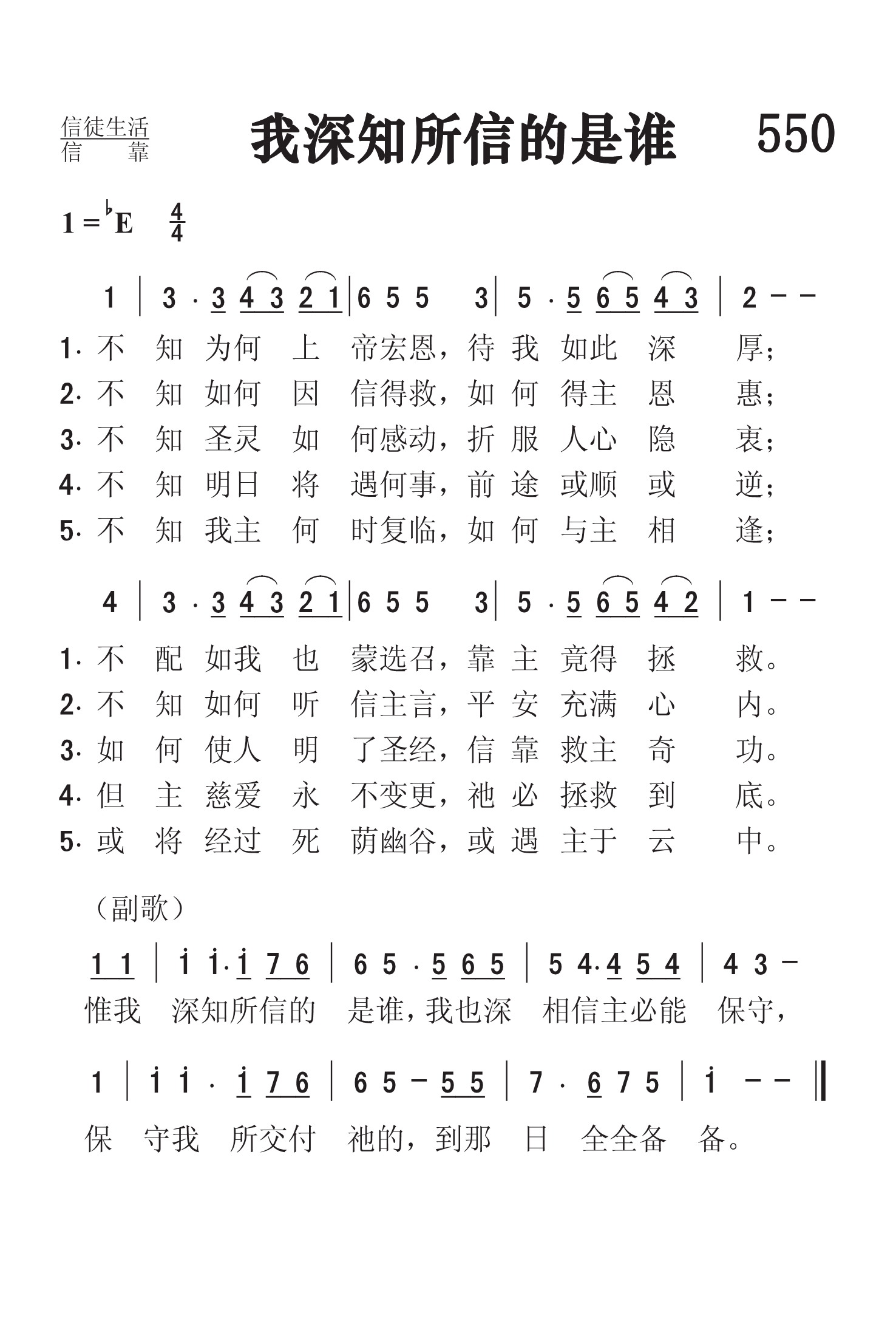 第550首 我深知所信的是谁I Know Whom I Have Believed 惠特尔(D.W.Whittle,1840,11,22-1901,3,4)作词,麦格雷纳汉(James McGranahan,1840,7,4-1907,7,9)作曲。 不知为何上帝洪恩,待我如此深厚; 不配如我亦蒙选召,靠主竟得拯救。 不知为何因信得救,如何得主恩惠; 不知如何听信主言,平安充满心内。 不知圣灵如何感动,折服人心隐衷; 如何使人明了圣书,信靠救主奇功。 不知我主何时复临,如何与主相逢; 或将经过死荫幽谷,或遇主于云中。 惟我深知所信的是谁,我也深相信主必保守, 保守我所交付祂的,到那日全全备备。 上帝通过奇妙的方式让祂的救恩临到世人。我们可能说不出自己蒙恩重生的确切时间和地点,但我们确实能感受到基督的恩典在我们身上的运作。自从接受耶稣作为个人救主的那一刻起,我们人生的方向就发生了根本的转变。我们不再追求罪中之乐,而是羡慕圣洁的美,以基督在心中作为有荣耀的盼望。我们愿意从此接受圣灵的引导,一生一世以寻求公义,荣神益人为目标,直到有一天,主圣洁的形象完全表现在我们的生命中,使我们与亲爱的主融为一体。 这首诗歌是基督徒属灵经验的再现。第一节阐述个人蒙恩得救的经历。第二节指出因信称义,平安充满内心的福惠。第三节说明圣灵感动人心悔改,圣书显明耶稣,引人归向救主。最后一节表达了对于前途,对于救主不变之爱坚定不移的信心。本诗的副歌引录了提后1:12 的经句作为全诗主题的归纳:“因为知道我所信的是谁,也深信祂能保全我所交付祂的,直到那日”。 惠特尔写好这首诗以后,是用El Nathan的笔名发表的,因此《El Nathan》就成了本诗的调名。 丹尼尔. 惠特尔是美国奋兴布道家和歌唱家,出生在美国马萨诸塞州。他在少年时代随家迁往芝加哥,因家庭贫苦很早就参加工作,担任银行职员。在南北战争期间他投笔从戎,在战斗中负伤,失去右手而被俘。在监狱中他想到母亲在他参军前送给他的一本圣书,就拿出来阅读,因圣灵的感动,他接受了十字架的救恩。战争结束以后,他被晋升为少校。复员后仍回芝加哥,任钟表厂会计,业余从事布道工作。后与慕迪,桑基,斯宾斯特等一同周游各大城市布道。晚年他自己也动手写诗,深受同道的欢迎。 惠特尔在圣诗创作上有较高的造诣。他说:“我不希望创作一首不包含信息的圣诗。所写的诗要以上帝的话为基础,传递上帝爱的信息”。他认为福音诗歌创作的严肃性值得人们付出最高的代价。他写诗除了注重实质内容以外,还在结构上严格遵守音步和韵律的规则。他共创作了二百来首圣诗。慕迪曾说:“我认为惠特尔少校创作了本世纪一些最优秀的圣诗”。 曲作者麦格雷纳汉出生于美国的一个农民家庭,所受的正式教育很有限,却靠自己的努力和爱好,使他在19岁时就出任音乐教师。以后他到纽约州布雷德伯里所办的音乐学校短期学习,接着便参加福音布道团以歌声宣扬主名。1877年,福音歌唱家、作曲者布利斯突然去世,他便与诗人惠特尔合作,组织布道团,旅行美国各地并前往英国,担任唱诗班领唱,以他优美动听的男高音和亲切感人的魅力大获成功。他还首先组织完全是男声的唱诗班,曾与桑基,鲁特,斯特宾斯等人合编出版多本福音诗歌集,其中较有名的有《男声福音圣诗》二卷,《福音圣诗》等。他自己也写诗,如《颂赞诗歌》317首《信主得生命》。
