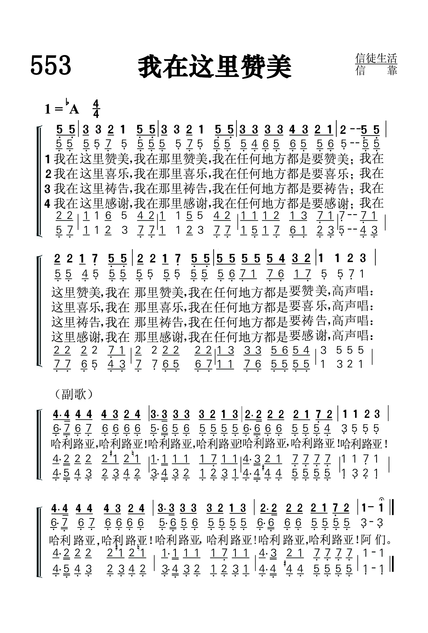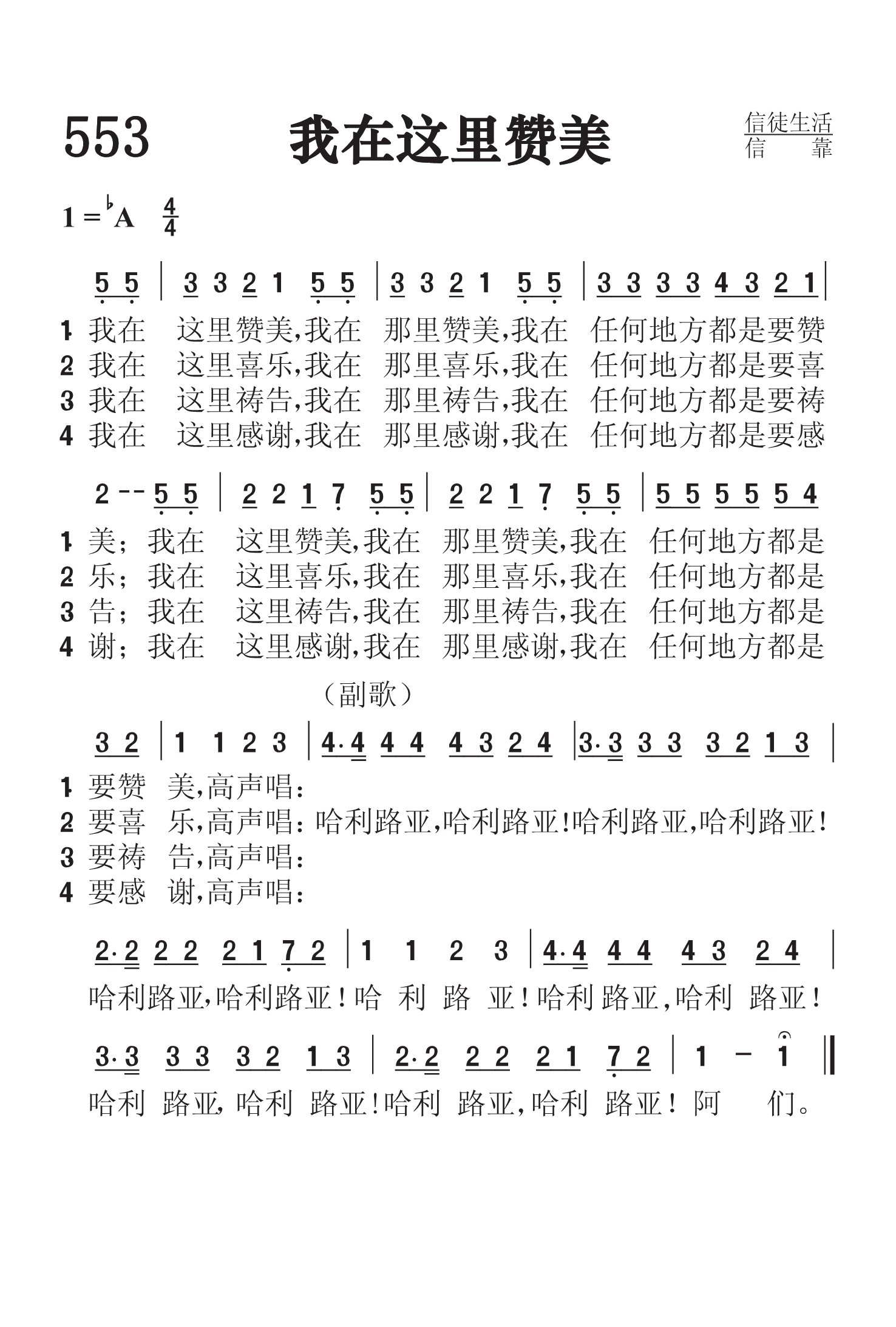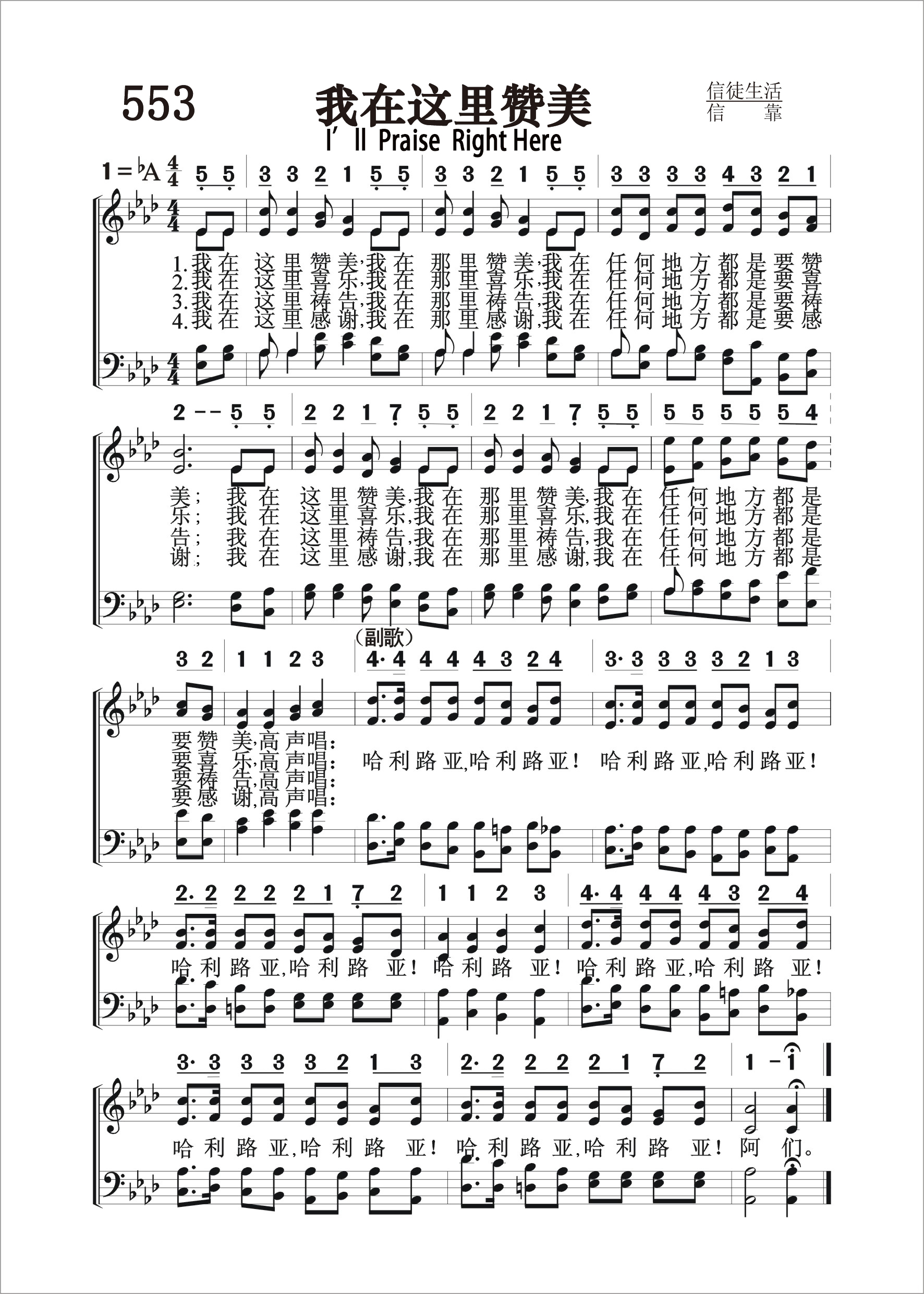 第553首 我在这里赞美I’llPraiseRight Here 我在这里赞美,我在那里赞美,我在任何地方都是要赞美, 我在这里赞美,我在那里赞美,我在任何地方,都是要赞美高声唱: 我在这里喜乐,我在那里喜乐,我在任何地方都是要喜乐, 我在这里喜乐,我在那里喜乐,我在任何地方都是要喜乐高声唱: 我在这里祷告,我在那里祷告,我在任何地方都是要祷告, 我在这里祷告,我在那里祷告,我在任何地方都是要祷告高声唱: 我在这里感谢,我在那里感谢,我在任何地方都是要感谢, 我在这里感谢,我在那里感谢,我在任何地力都是要感谢高声唱: 哈利路亚!哈利路亚!哈利路亚!哈利路亚!哈利路亚!哈利路亚!哈利路亚! 哈利路亚!哈利路亚!哈利路亚!哈利路亚!哈利路亚!哈利路亚!阿们。 这是一首信徒喜爱歌唱的通俗赞美诗。诗歌用朴素的语言,明快的旋律,表达了蒙恩的信徒随时随地赞美、喜乐,祷告、感谢的迫切愿望。