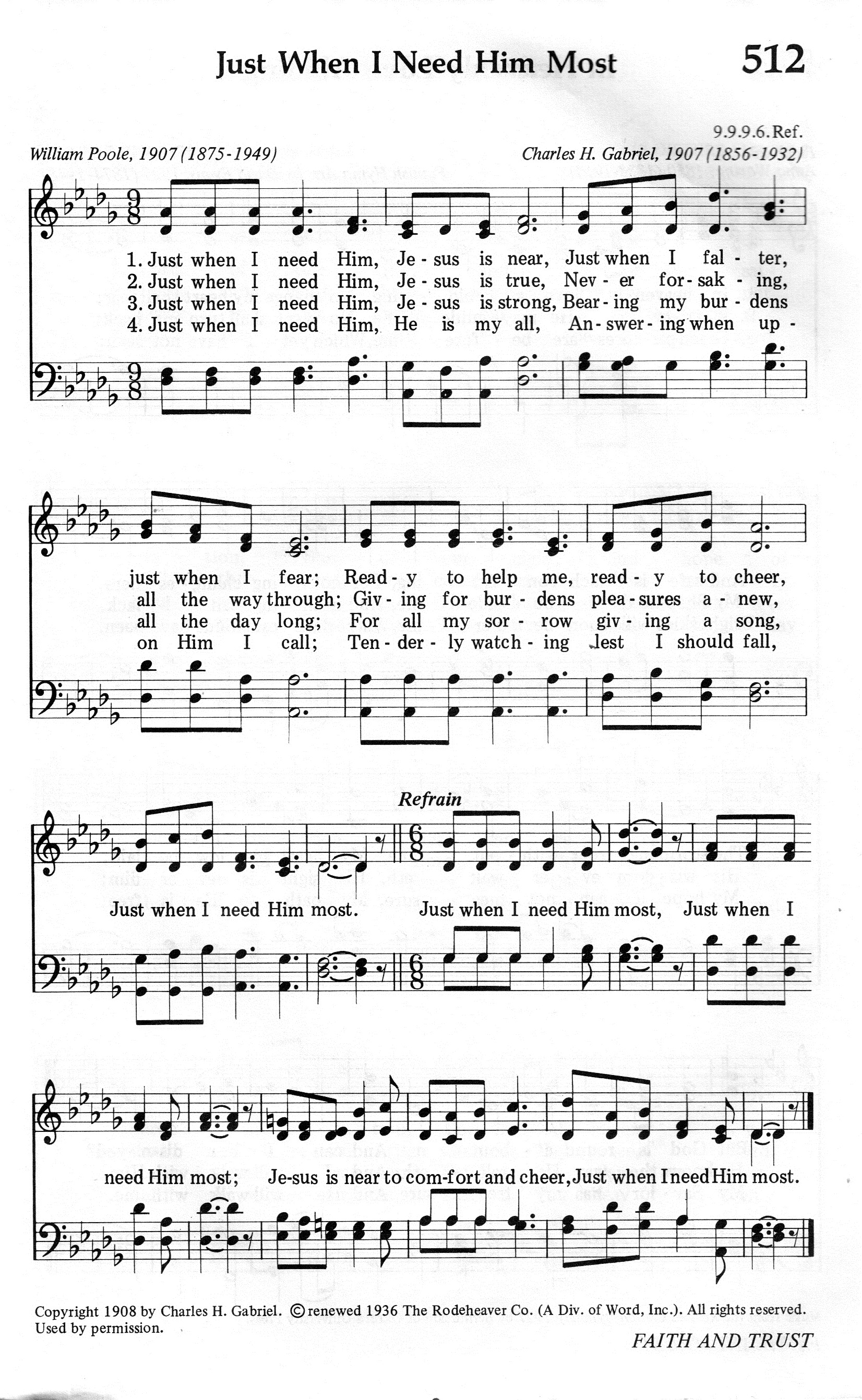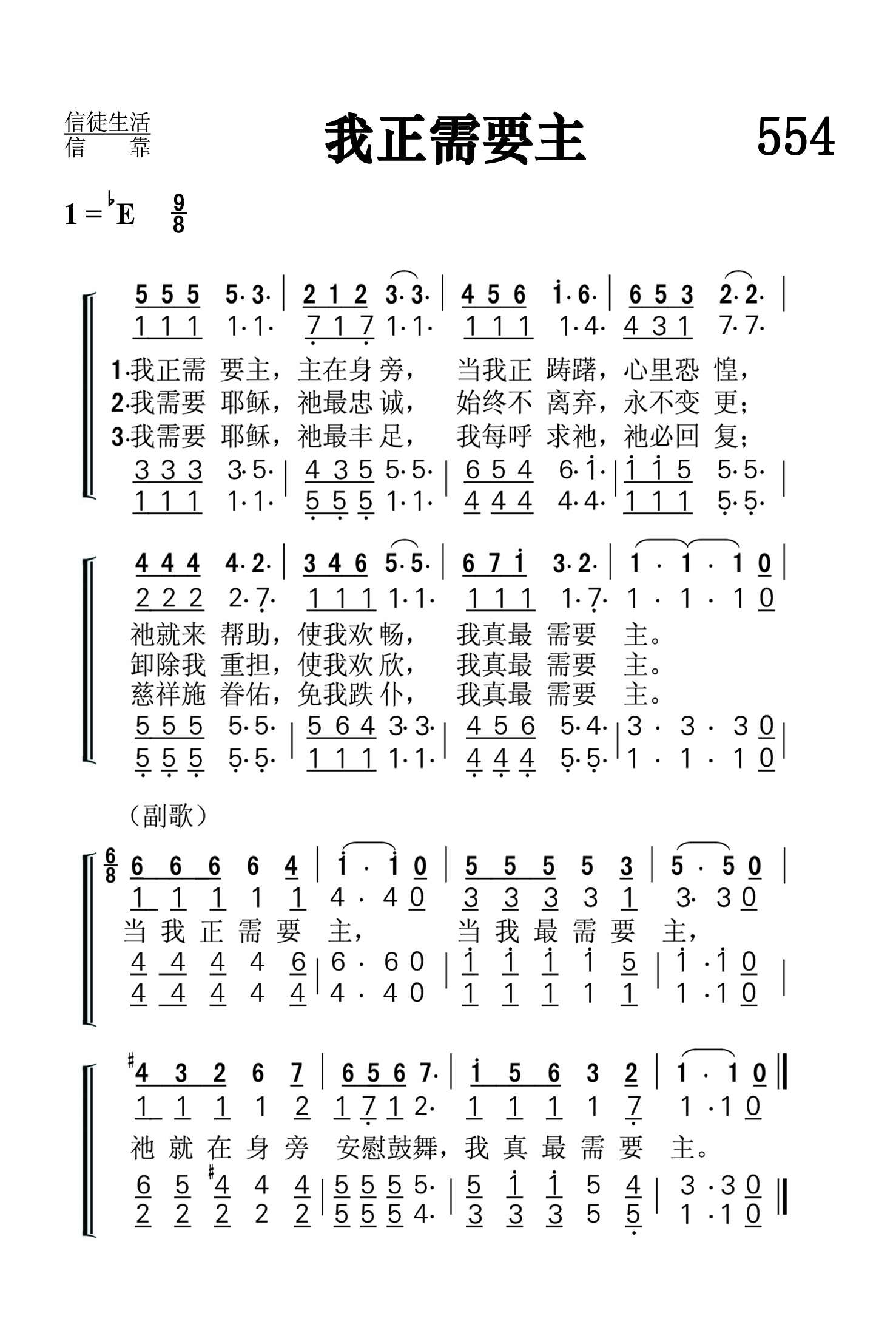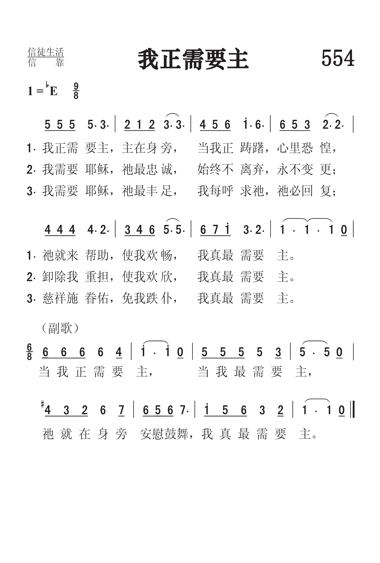 第554首 我正需要主Just When I Need Him 普尔(William Poole,1875,4,14-1949,12,24)作词(1907年),加布里埃尔(C.H.Gabriel,1856,8,18-1932,9,15)作曲(1908年) 我正需要主,主在身旁,当我正踌躇,心里恐惶, 祂就来帮助,使我欢畅,我真最需要主。 我需要耶稣,祂最忠诚.始终不离弃,永不变更; 卸除我重担,使我欢欣,我真最需要主。 我需要耶稣,祂最丰足,我每呼求祂,祂必回复; 慈样施眷佑,免我跌仆,我真最需要主。 当我正需要主,当我最需要主, 祂就在身旁安慰鼓舞,我真最需要主。 词作者威廉. 普尔出生于美国马里兰州伊斯顿市,1900年被按立为卫理公会牧师,在威明顿教会任职达35年之久。他还创作了不少赞美诗的歌词。《我正需要主》是他的代表作品之一。 曲作者加布里埃尔是20世纪20年代美国布道团中最受欢迎的自学成才歌唱家和作曲家。他在美国南方衣阿华州农场中长大,平生爱音乐,好唱歌,自己在家里学习,在一架破旧的小风琴上弹奏。16岁时就自告奋勇到附近音乐学校教唱,成绩显著,不久被正式聘为教员。从此,他更努力学习,精益求精,终于成为一个有名的作曲家,业余时间还兼任旧金山一个卫理公会礼拜堂的音乐指导。1895年迁居芝加哥,继续写作、编曲,曾编印出版过好几本乐谱。