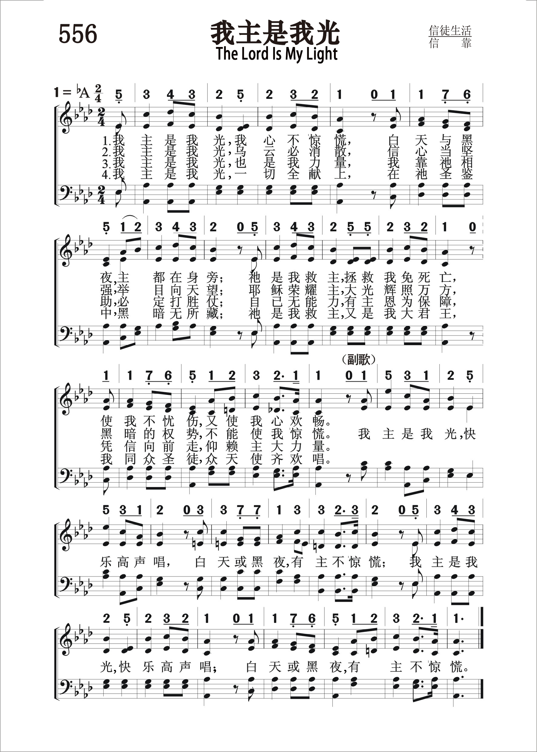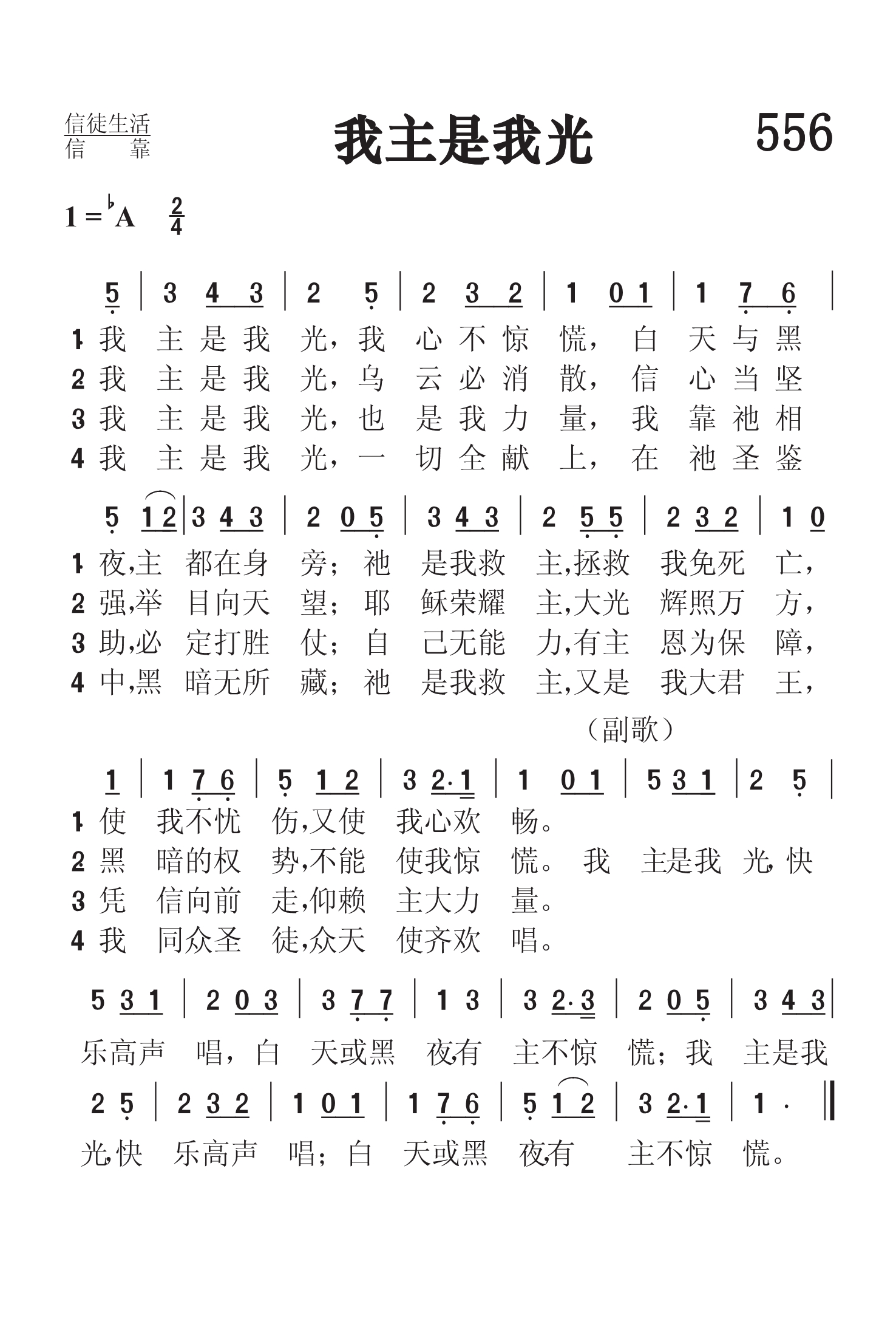 第556首我主是我光The Lord Is My Light 尼科尔森(James Nicholson,1828-1876,11,6)作词,比肖夫(Dr.J.W.Bischoff,1850-1909)作曲 我主是我光我心不惊慌,白天与黑夜主都在身旁; 祂是我救主拯救我免死亡,使我不忧伤又使我心欢畅。 我主是我光乌云必消散,信心当坚强举目向天望; 耶稣荣耀主大光辉照万方,黑暗的权势不能使我惊慌。 我主是我光也是我力量,我靠祂相助必定打胜仗; 自己无能力有主恩为保障,凭信向前走仰赖主大力量。 我主是我光一切全献上,在祂圣鉴中黑暗无所藏: 祂是我救主又是我大君王,我同众圣徒众天使齐欢唱。 我主是我光快乐高声唱,白天或黑夜有主不惊慌; 我主是我光快乐高声唱;白天或黑夜有主不惊慌。 词作者尼科尔森出生在爱尔兰,1850年移居美国,先后在费城和华盛顿市任邮局职员,热心布道和教会主日学工作,业余组织唱诗班并担任领唱,是美以美会的热心信徒。这首诗最初发表在《快乐之歌》1872年第四期上。 本诗的曲作者约翰. 比肖夫出生于美国芝加哥。他二岁起就双目失明,可是他自强不息,刻苦学习,在音乐上达到了很高的造诣。从1874年起到他去世,他一直担任首都华盛顿第一公理会教堂的司琴。他还创作了包括这首《我主是我光》在内的许多优美的赞美诗曲谱。