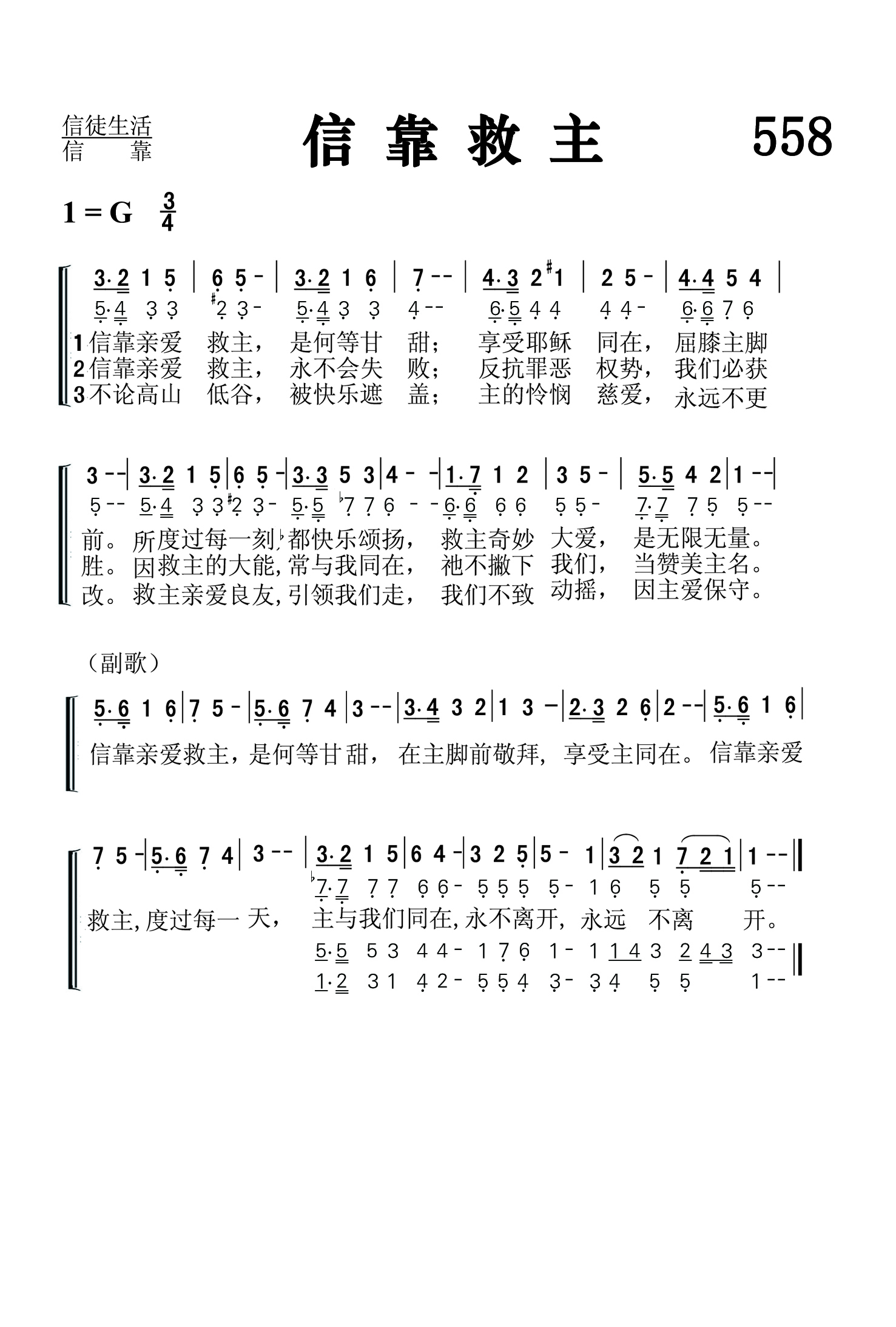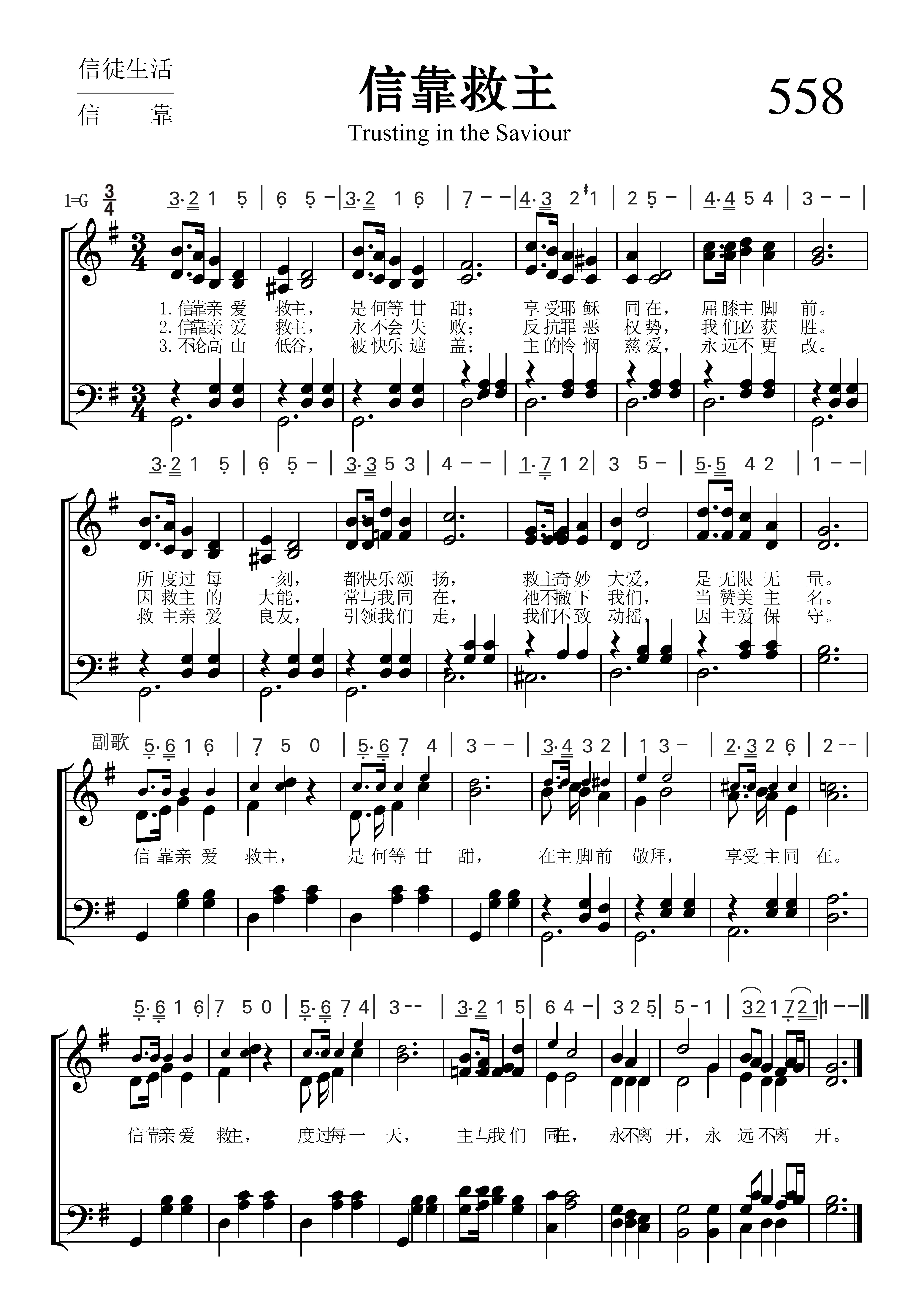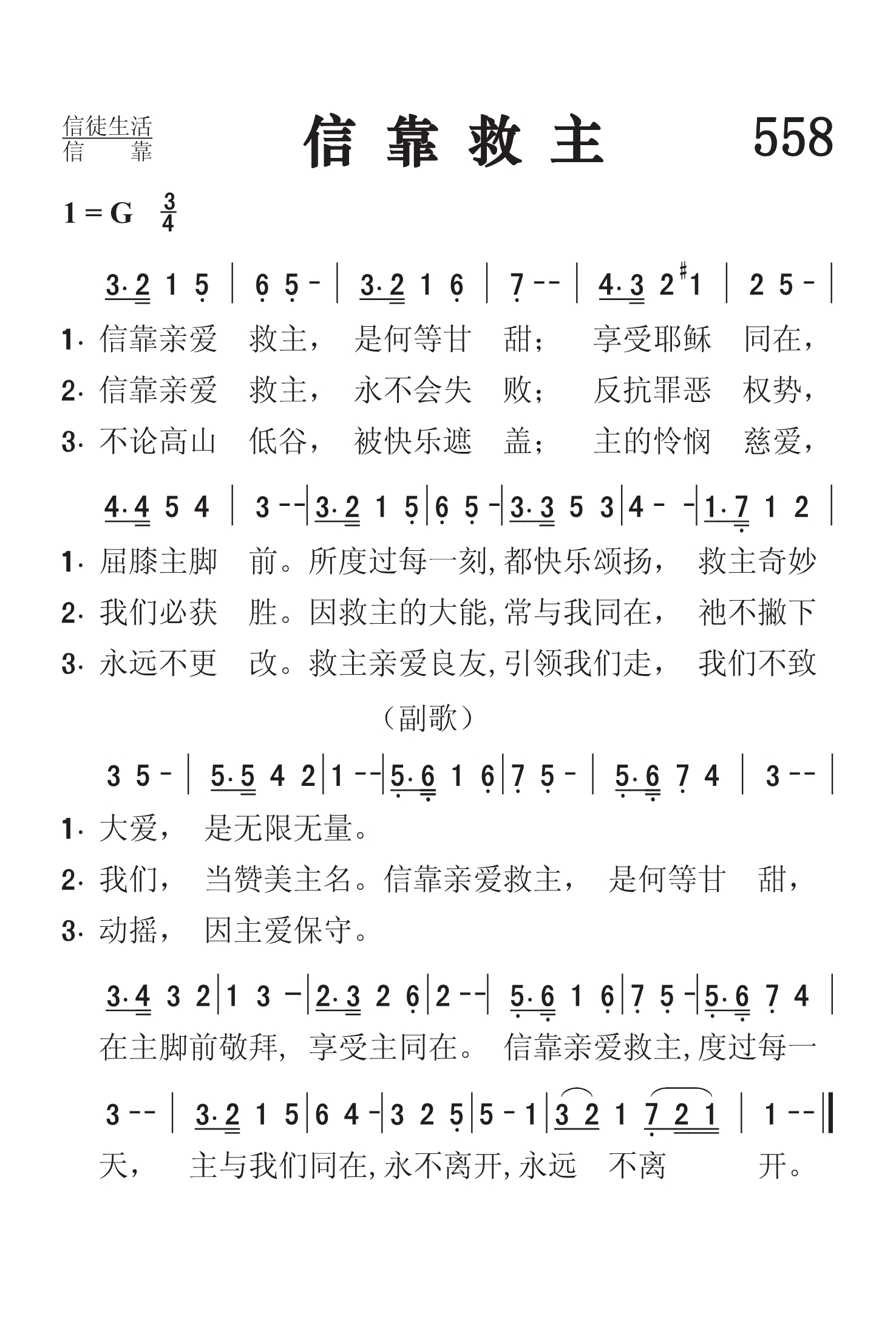 第558首 信靠救主Trusting Dear Saviour (《颂赞圣诗》第356首) 信靠亲爱救主,是何等甘甜;享受耶稣同在,屈膝在主脚。 所度过每一刻,都快乐颂扬,救主奇妙人爱,是无限无量。 信靠亲爱救主,永不会失败;反抗罪恶权势,我们必获胜。 因救主的大能,永远是一样,祂不撇下我们,当赞美主名。 不论高山低谷,被快乐遮盖;主的怜悯慈爱,永远不更改。 救主亲爱良友,引领我们走,我们不致动摇,因主爱保守。 信靠亲爱救主,是何等甘甜,在主脚前敬拜,享受主同在。 信靠亲爱救主,度过每一天,主与我们同在,永不离开,永远不离开。 这首诗歌表达了信靠主耶稣所带来的快乐、平安、保障、胜利和恩眷。在信靠之中所度过的每一天,每一刻,都是甘甜美满的。我们要留在主身旁,接受主的带领,蒙祂保守,永不离开。