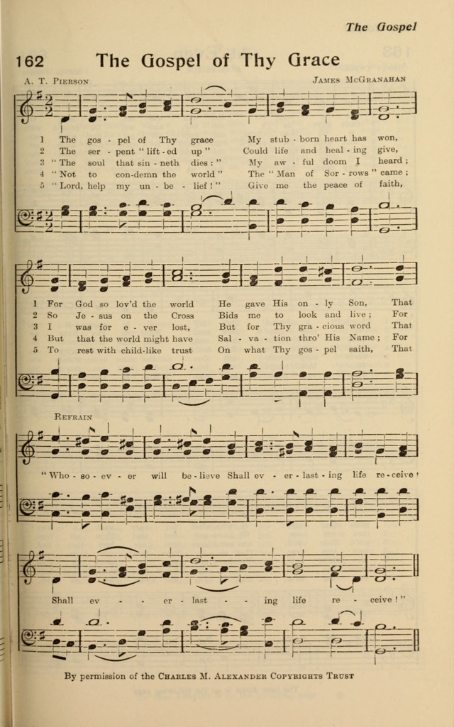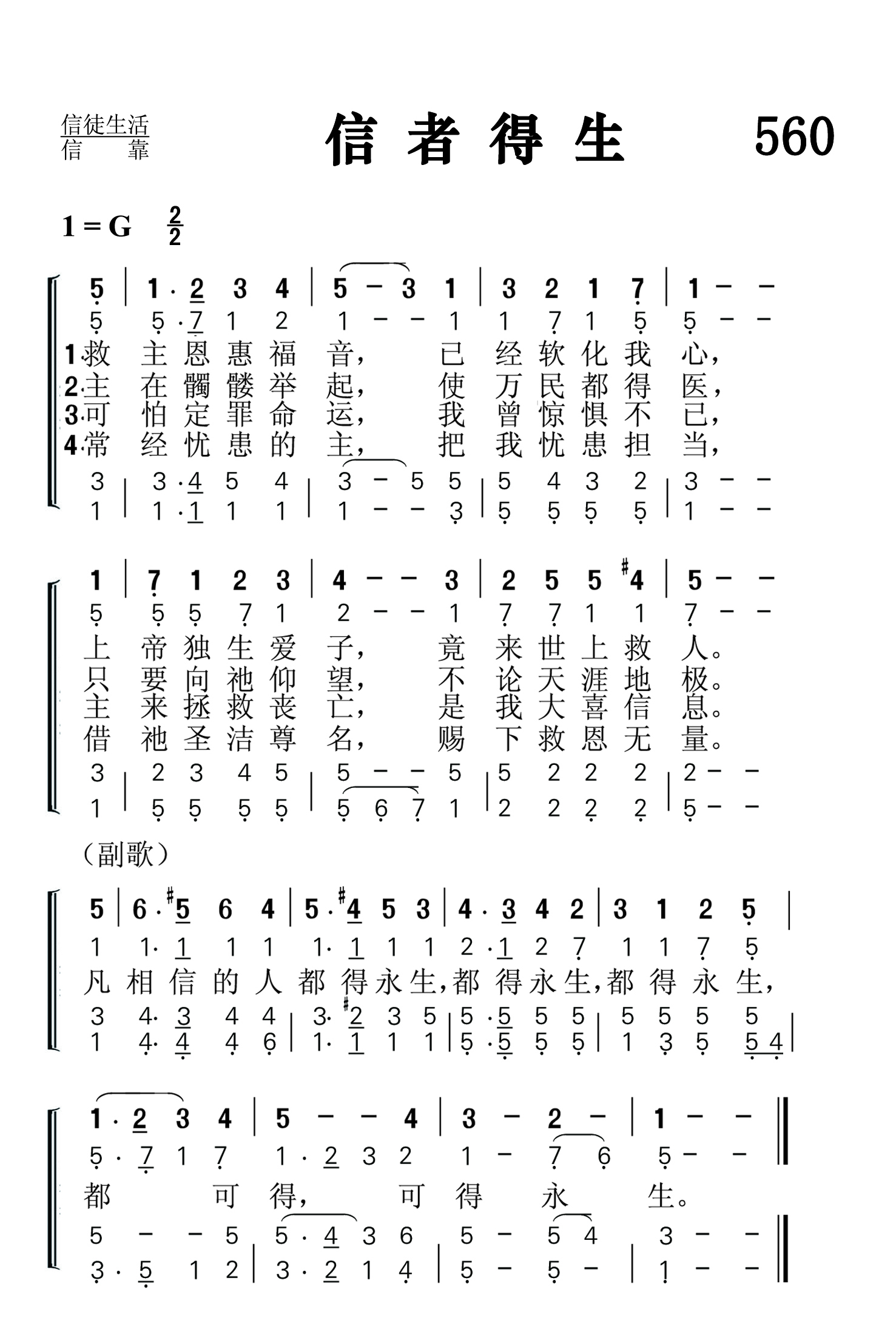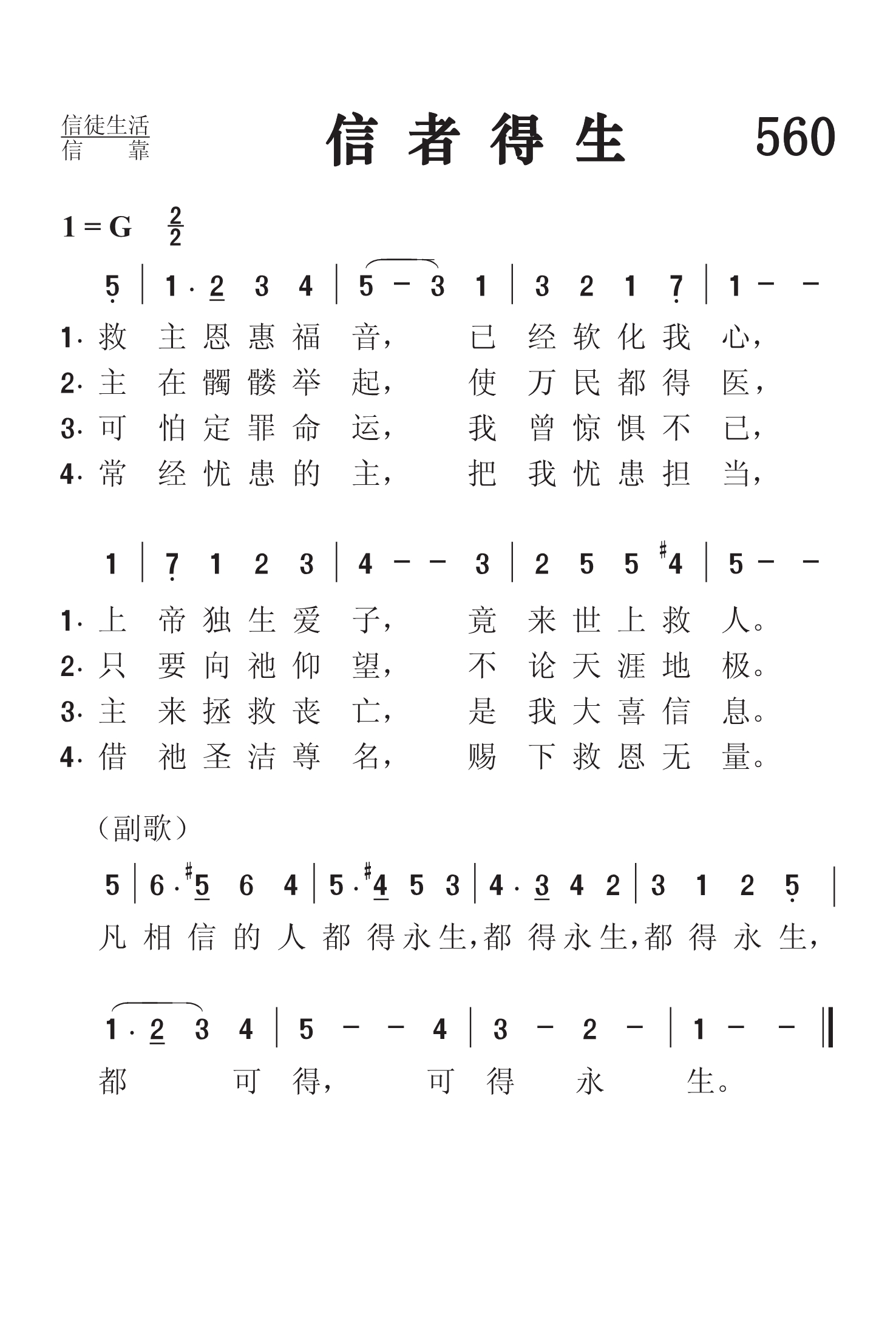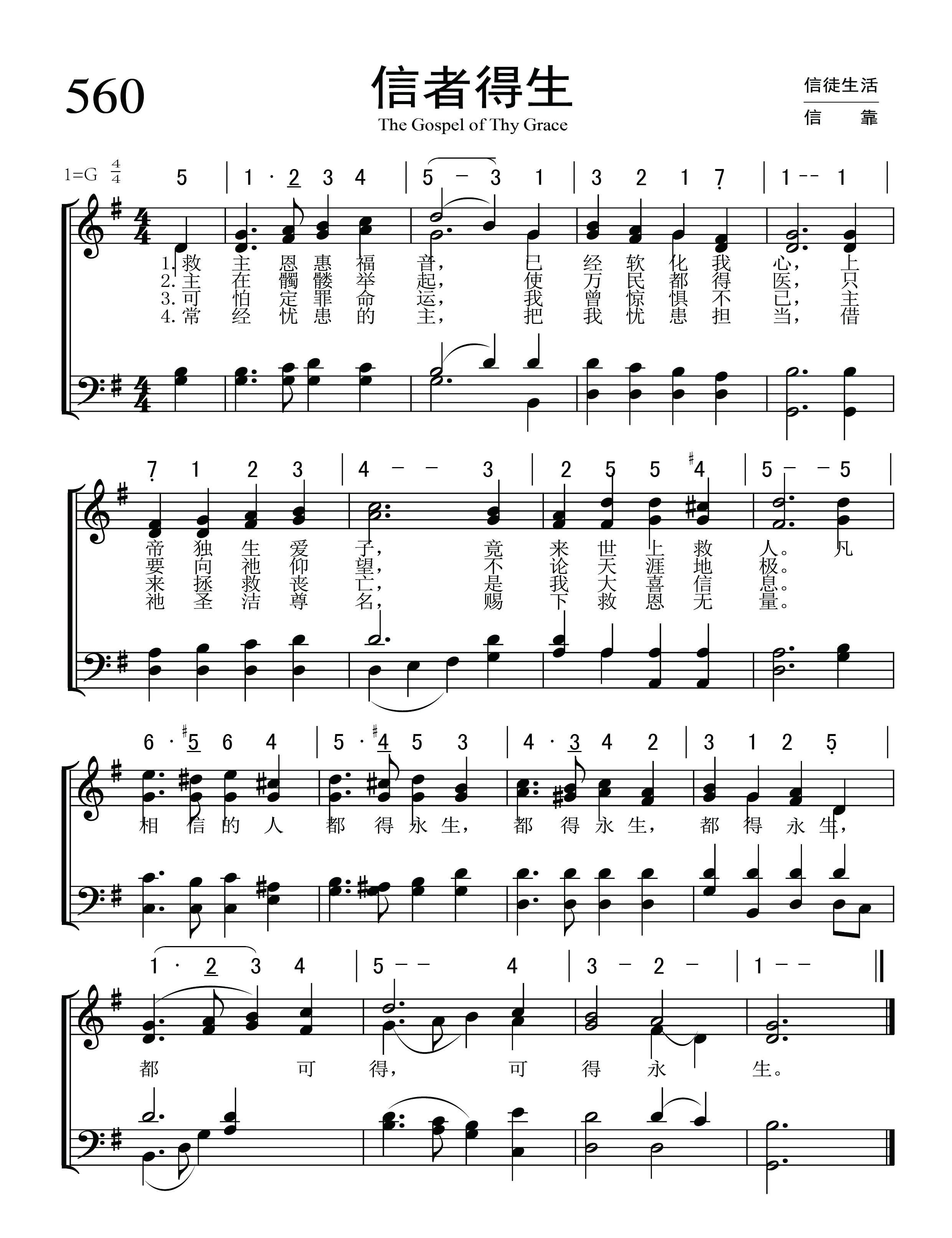 第560首 信者得生The Gospel of Thy Grace (桑基《圣诗与独唱》426首) 皮尔逊(Arthur Tappan Pierson,1837.3.6-1911)作词,麦格拉纳汉(James McGranahan,1840,7,4-1907,7,9)作曲,赵典仁、吴涤申汉译 救主恩惠福音,已经软化我心, 上帝独生爱子,竟来世上救人。 主在十架举起,使万民得医治, 只要向祂仰望,不论天涯地极。 可怕定罪命运,我曾惊惧不已, 主来拯救丧亡,是我大喜信息。 常经忧患的主,把我忧患担当, 借祂圣洁尊名,赐下救恩无量。 凡相信的人都得永生,都得永生, 都得永生,都可得,可得永生。 词作者皮尔逊出生于美国纽约,就读于汉密尔顿学院,1930年参加长老会的传道工作。先后在纽约州的宾厄姆顿和沃特福特,底特律的福特街担任牧师。 他最后所负责的是费城贝瑟尼长老会。他共发表过26首赞美诗的歌词,2首歌谱。 曲作者麦格雷纳汉出生于美国的一个农民家庭,所受的正式教育很有限,却靠自己的努力和爱好,使他在19岁时就出任音乐教师。以后他到纽约州布雷德伯里所办的音乐学校短期学习,接着便参加福音布道团以歌声宣扬主名。1877年,福音歌唱家、作曲者布利斯突然去世,他便与诗人惠特尔合作,组织布道团,旅行美国各地并前往英国,担任唱诗班领唱,以他优美动听的男高音和亲切感人的魅力大获成功。他还首先组织完全是男声的唱诗班,曾与桑基,鲁特,斯特宾斯等人合编出版多本福音诗歌集,其中较有名的有《男声福音圣诗》二卷,《福音圣诗》等。他自己也写诗,如《颂赞诗歌》317首《信主得生命》。
