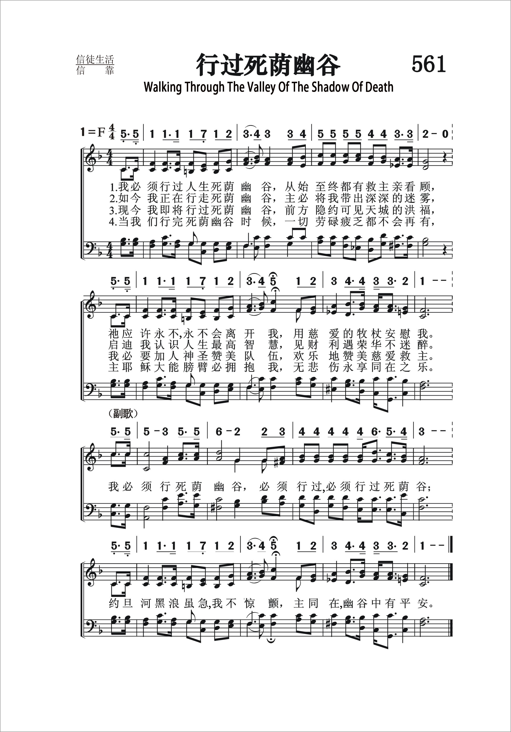 第561首 行过死荫幽谷Walking Through the Valley of the Shadow of Death (《颂赞圣诗》355首) 赵典仁、吴涤申汉译自桑基《圣诗和独唱》 我必须行过人生死荫幽谷,从始至终都有救主亲看顾, 祂应许永不永不会离开我,用慈爱的牧杖安慰我。 如今我正在行走死荫幽谷,主必将我带出深深的迷雾, 启迪我认识人生最高智慧,见财利遇荣华不迷醉。 现今我即将行过死荫幽谷,前方隐约可见天城的洪福, 我必要加入神圣赞美队伍,欢乐地赞美慈爱救主。 当我们行完死荫幽谷时候,一切劳碌疲乏都不会再有, 主耶稣大能膀臂必拥抱我,无悲伤永享同在之乐。 我必须行死荫幽谷,必须行过必须行过死荫谷; 约旦河黑浪虽急我不惊颤,主同在幽谷中有平安。 在人生的道路上,我们必然会经过死荫的幽谷。那时万念俱灰,生活的勇气消失殆尽。四面受困,令人惊恐不已。但我们若能以主为我们的依靠,祂的杖和竿就会成为我们的安慰。祂必带领我们走出荫翳迷雾,进入祂圣道的光辉之中,直到咱们的歌声满了我们的口。喜乐和平安充满我们的心。