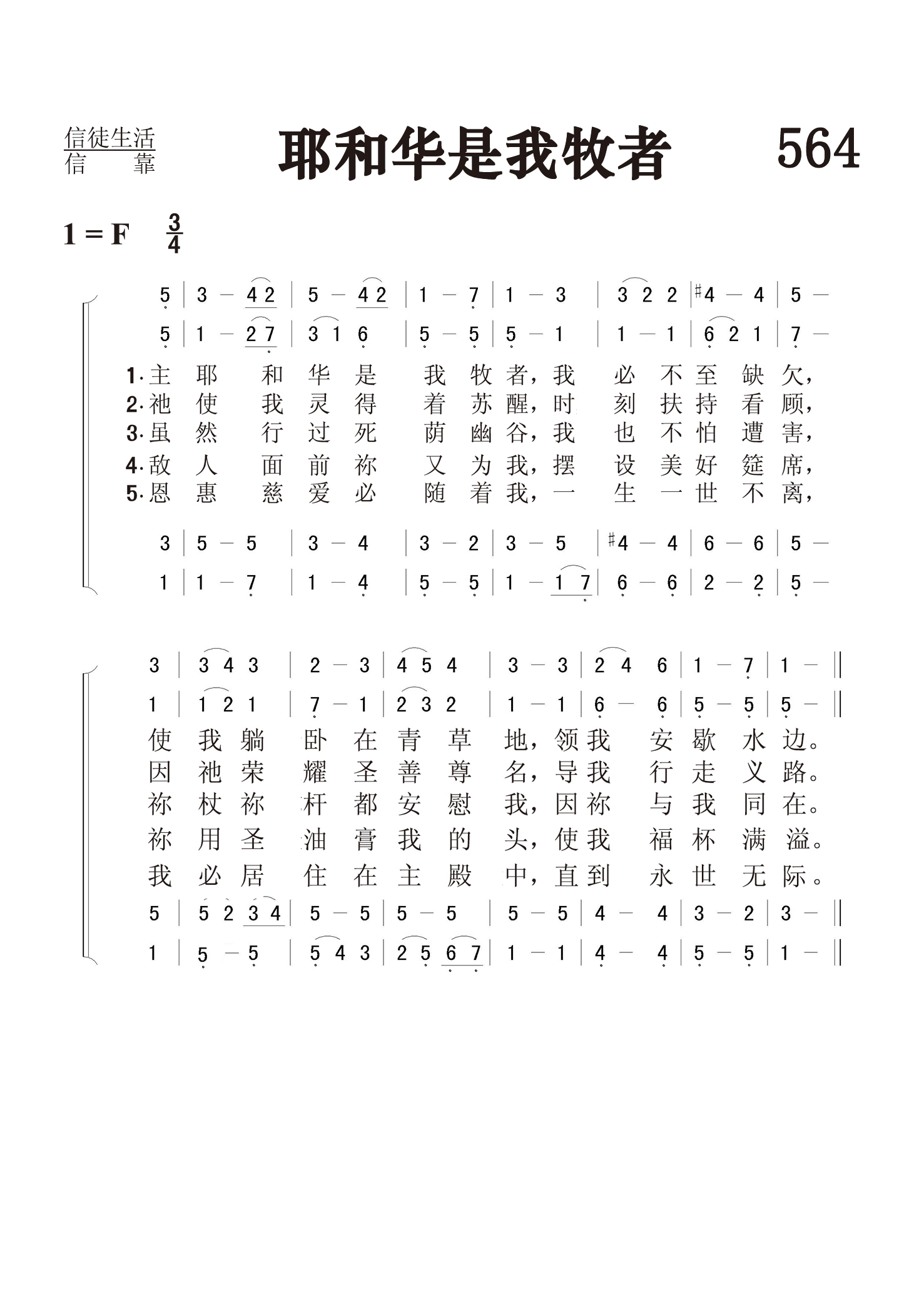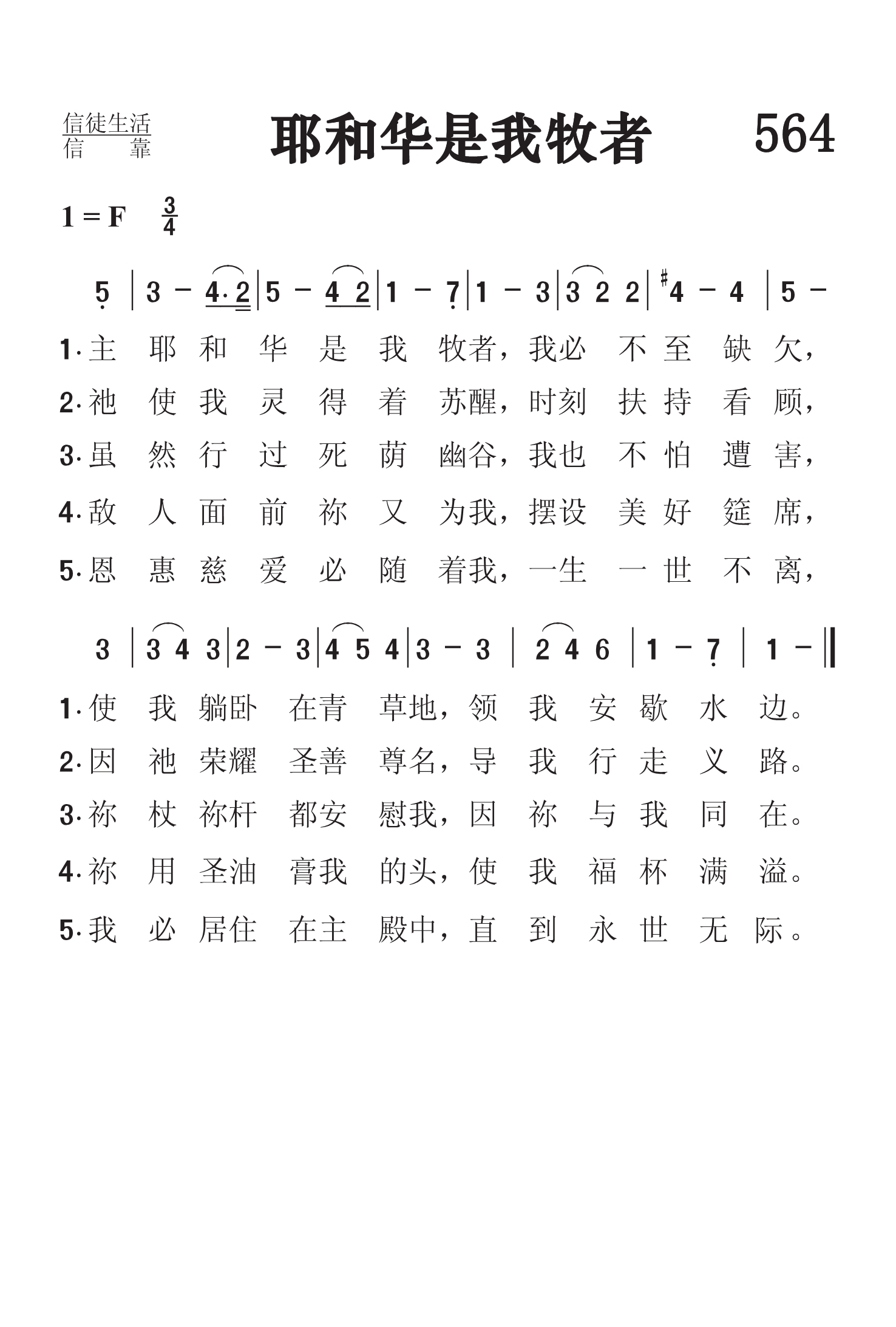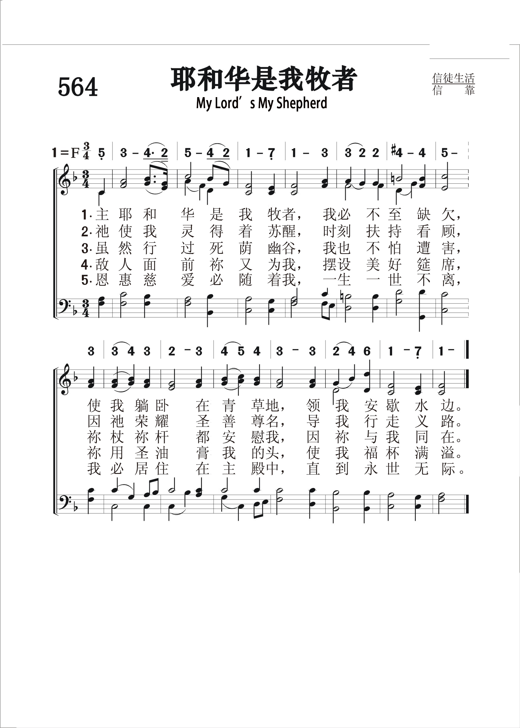 第564首 耶和华是我牧者My Lord’s My Shepherd 《赞美诗》506版434首) 歌词是刘福群、何统雄1967年译自《苏格兰诗篇》(1650年)第23篇,杰西.欧文(Jessie Seymour Irvine)作曲 主耶和华是我牧者,我必不至缺欠, 使我躺卧在青草地,领我安歇水边。 祂使我灵得着苏醒,为着自己的名, 祂引导我行走义路,引导我行义路。 虽然行过死荫幽谷,我也不怕遭害, 祢杖祢杆都安慰我,因祢与我同在。 在敌面前祢又为我,摆设美好筵席, 祢用膏油膏我的头,使我福杯满溢。 我主恩惠我主慈爱,一生一世不离, 我必居住在主殿中,直到永世无际。 曲作者杰西.欧文1836年7月26日出生于苏格兰的多诺塔。她的父亲是当地教区的牧师。她的家庭后来迁往彼得黑德和克里蒙特。1883年6月18日,她在苏格兰的阿伯丁逝世。