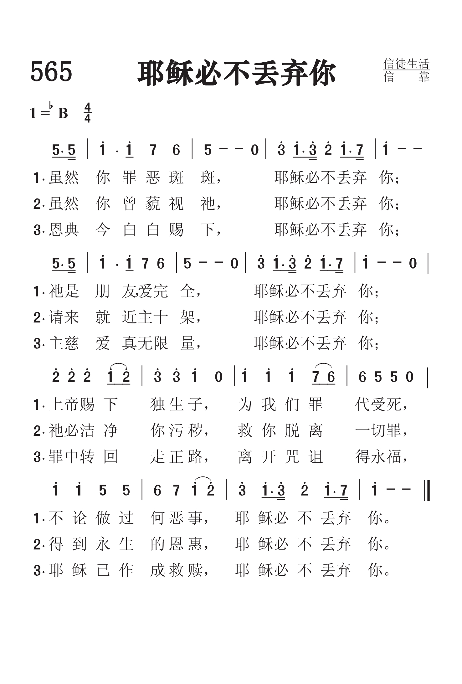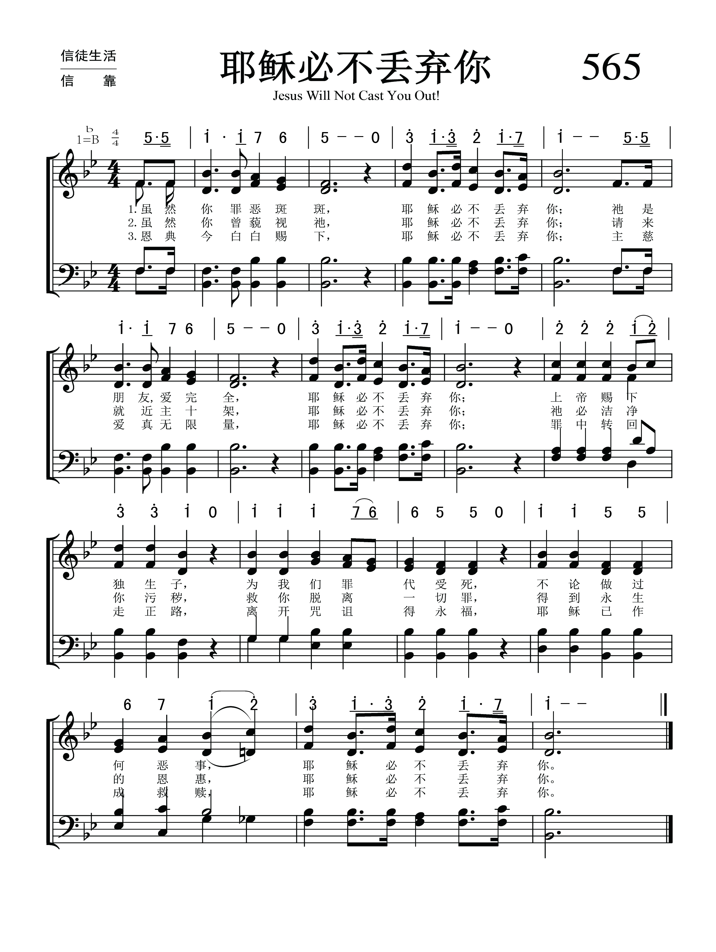 第565首 耶稣必不丢弃你 (桑基《圣诗与独唱》新编108首) Jesus Will not Cast You Out! 乔治.库珀(George Cooper,1840.5.14-1927)作词,米勒德(Harrison Millard,1829.11.27-1895.9.10)作曲,赵典仁、吴涤申汉合译 虽然你罪恶斑斑,耶稣必不丢弃你; 祂是朋友爱完全,耶稣必不丢弁你; 上帝赐下独生子,为我们罪代受死, 不论做过何恶事,耶稣必不丢弃你。 虽然你曾藐视祂,耶稣必不丢弃你; 请来就近主十架,耶稣必不丢弃你; 祂必洁净你污秽,救你脱离一切罪, 得到永生的恩惠,耶稣必不丢弃你。 恩典今白白赐下,耶稣必不丢弃你; 主慈爱真无限量,耶稣必不丢弃你; 罪中转回走正路,离开咒诅得永福, 耶稣已作成救赎,耶稣必不丢弃你。 “到我这里来的,我总不丢弃他”(约6:37)。 诗人乔治.库珀出生于美国纽约。先是在本地公立学校上学,后师从切斯特.亚瑟学习法律。在短时间的从事法律工作之后,他放弃了自己的职业,改而从事他所擅长和爱好的工作。他很早就喜欢写作,十六岁以前就给几家主要的杂志写过诗。早年的成功激发他不断地创作,于是他定期给一些期刊投稿。他的诗作引起了广泛的兴趣。他最优美的诗是为孩子们写的。他写过许多赞美诗,还为华莱士、阿布特、托玛斯、米勒德等作曲家写过歌词。 曲作者米勒德出生于美国波士顿,八岁就参加该市一个合唱团,10岁在亨德尔海顿合唱团唱中音。后来变声为男高音。15岁时因主要男高音缺席,他就在清唱剧《参孙》里唱男高音。 1851年,米勒德前往欧洲,在意大利大师门下学习,担任男高音,随凯瑟琳.海斯在爱尔兰和苏格兰巡回演出。在欧洲期间,他还写了许多音乐作品,经常给一些美国音乐期刊投稿。 1851年,米勒德回到美国,定居在波士顿,上声乐课并在音乐会上演唱。二年以后,他迁居纽约。南北战争前夕,他参了军,四年服役后音伤退役,在海关任职至1881年。 米勒德共创作过300首歌曲,改编了400首法国、德国和意大利作品;许多圣歌;四部礼拜乐曲;两部感恩赞美诗;一部庄严弥撒曲;一首晚祷曲;一部四幕的意大利歌剧《黛博拉》;还出过两本赞美诗集。