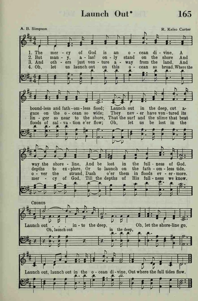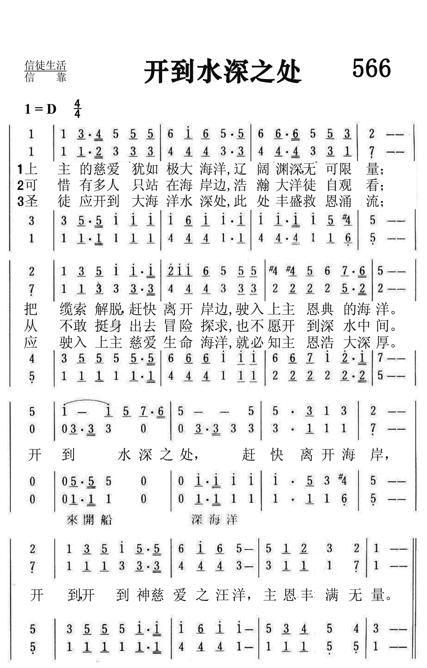第566首 开到水深之处Launch Out 辛普逊(Albert B.Simpson,1843-1919)作词,卡特(Russell Kelso Carter,1849,11,18-1928,8,23)作曲 上主的慈爱犹如极大海洋,辽阔渊深无可限量; 把缆索解脱赶快离开岸边,驶入上主恩典的海洋。 可惜有多人只站在海岸边,浩瀚大洋徒自观看; 从不敢挺身出去冒险探求,也不愿开到深水中间。 圣徒应开到大海洋水深处,此处丰盛救恩涌流; 应驶入上主慈爱生命海洋,就必知主恩浩大深厚。 开到水深之处,赶快离开岸边, 开到,开到神慈爱之汪洋,主恩丰满无量。 词作者辛普森是宣道会(Christian and Missionary Alliance)的发起人。1818年,他在美国,加拿大发起一个新的对外传教组织。该派强调重生,圣洁,灵性和再临四个基本教义,后来又发展成为远东宣教会。 曲作者卡特出生于美国的巴尔的摩市。他曾就读于宾夕法尼亚州军事学院,是学校的体育明星。毕业后留校教化学,自然科学,工程和数学。1873年迁往加利福尼亚州,住了三年。1887年,他被按立为卫理公会的牧师。1891年,他协助辛普逊编写《基督徒生命诗歌》。后来他从传道改行医学,在巴尔的摩担任医生。
