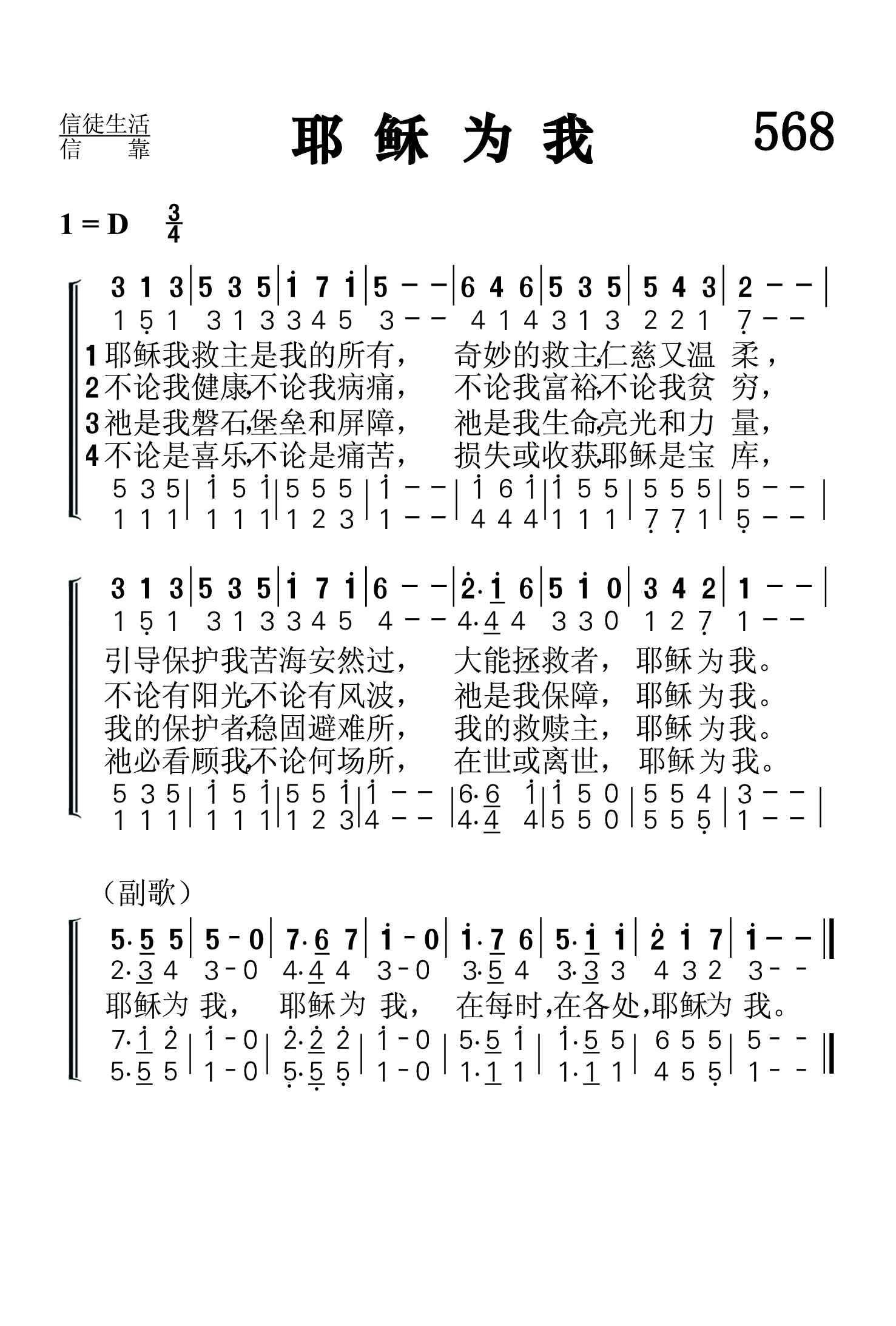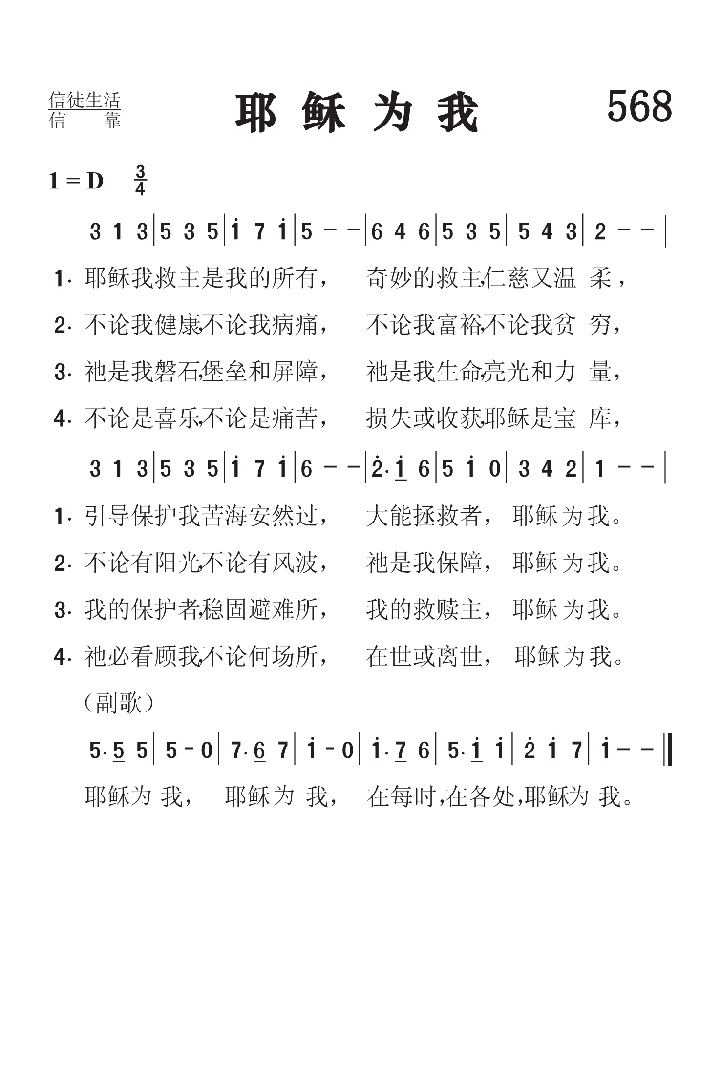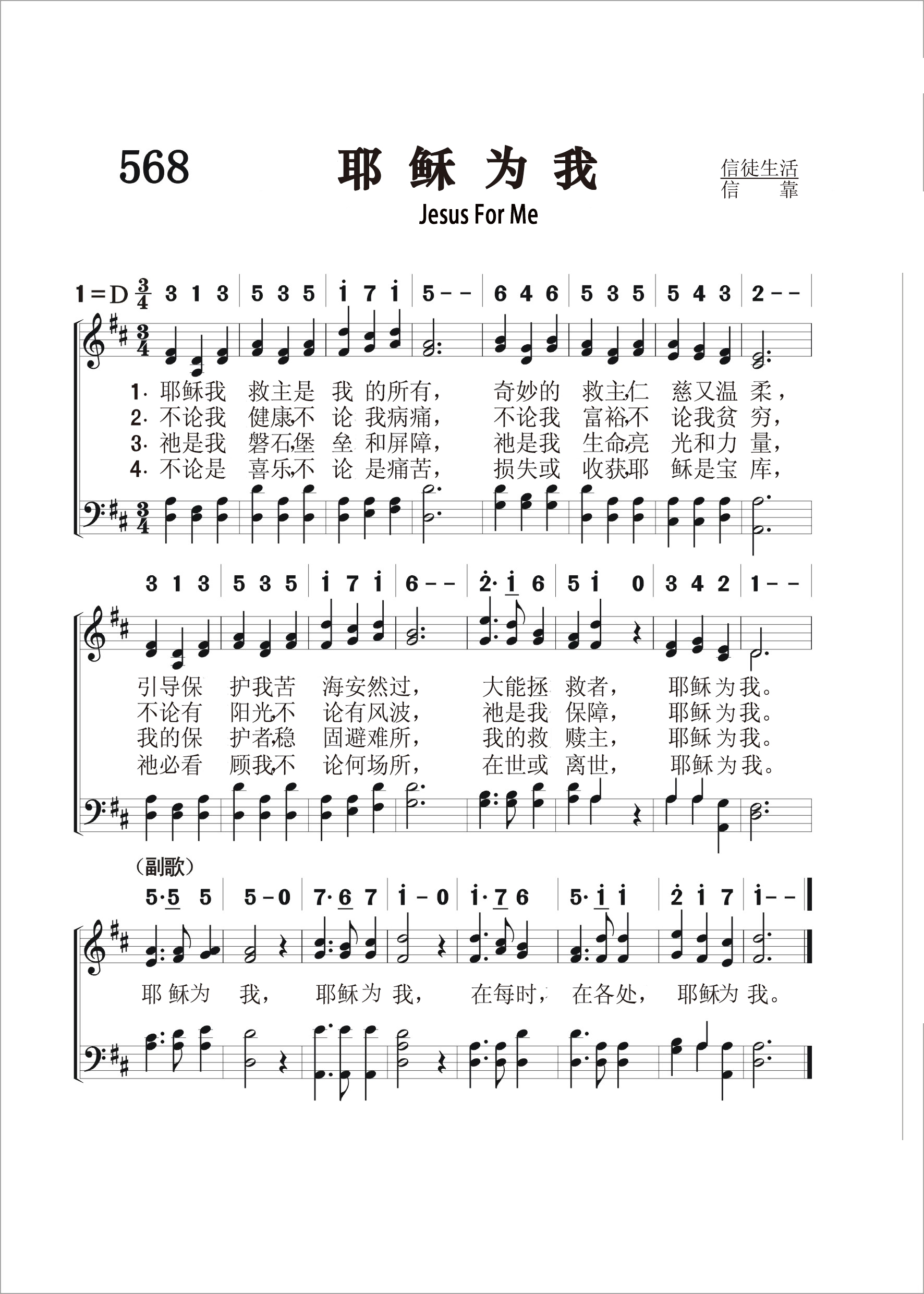 第568首 耶稣为我Jesus for Me 柯克帕特里克(W.J.Kirkpatrick,1838,2,27-1921,9,20)作词作曲 耶稣我救主是我的所有,奇妙的救主,仁慈又温柔, 引导保护我苦海安然过,大能拯救者,耶稣为我。 不论我健康,不论我软弱,不论我富裕,不论我贫穷, 不论有阳光,不论有风波,祂是我保障,耶稣为我。 祂是我磐石,堡垒和屏障,祂是我生命,亮光和力量, 我的保护者,稳固避难所,我的救赎主,耶稣为我。 不论是喜乐,不论是痛苦,损失或收获,耶稣是宝库, 祂必看顾我,不论何场所,在世或离世,耶稣为 我。 耶稣为我,耶稣为我,在每时,在各处,耶稣为我。 柯克帕特里克是美国音乐出版家,宗教音乐作曲家。他出生于爱尔兰,自幼跟他父亲学音乐,以后受教于几个名师,青年时移居美国。南北战争时他参军,任军乐队吹笛手。1862年至1872年在美国费城做家具商,并在美以美会担任义工,曾任美国费城美以美会唱诗班指挥。同时他还作曲。他在1859年21岁时即开始编辑出版赞美诗工作,以后与斯托克顿.斯威尼合编出版约一百多部宗教音乐集和书刊。他谱写了不少信徒所喜爱的福音歌曲。